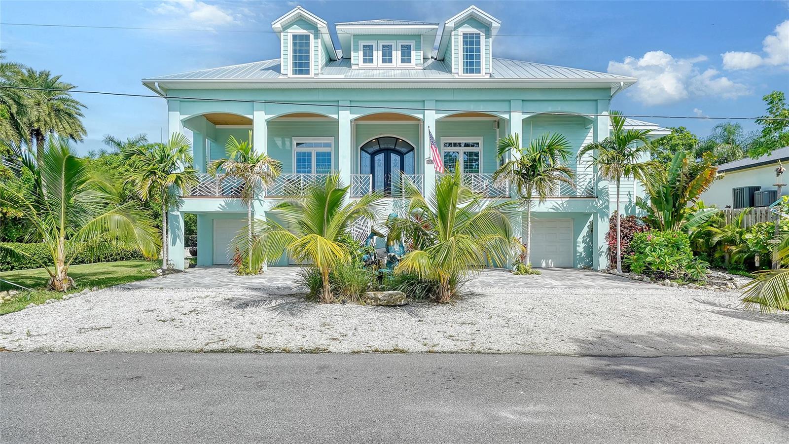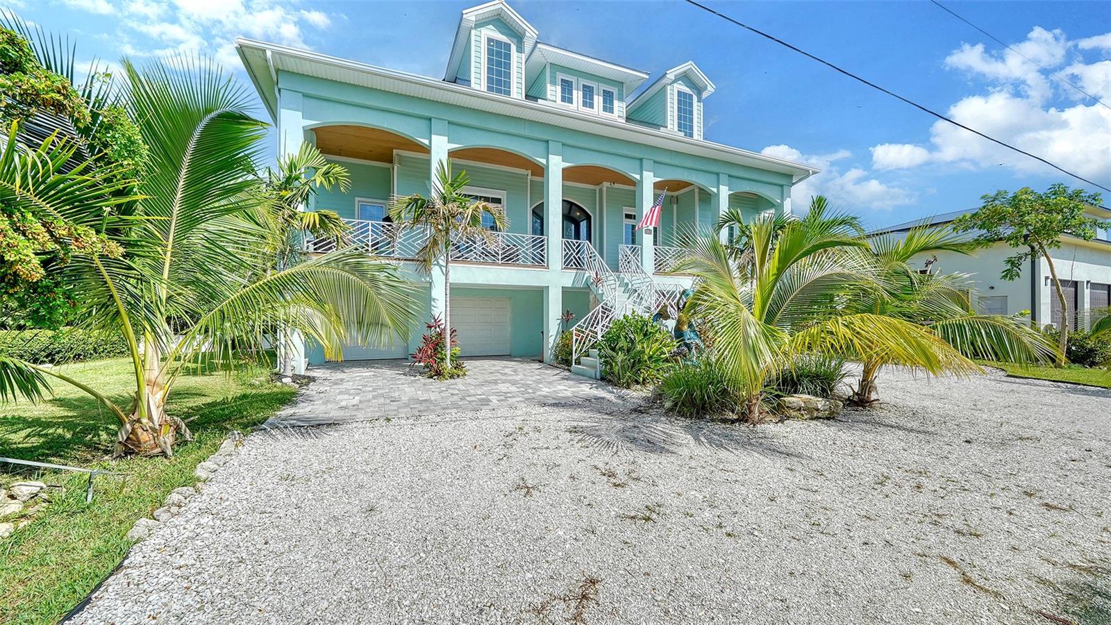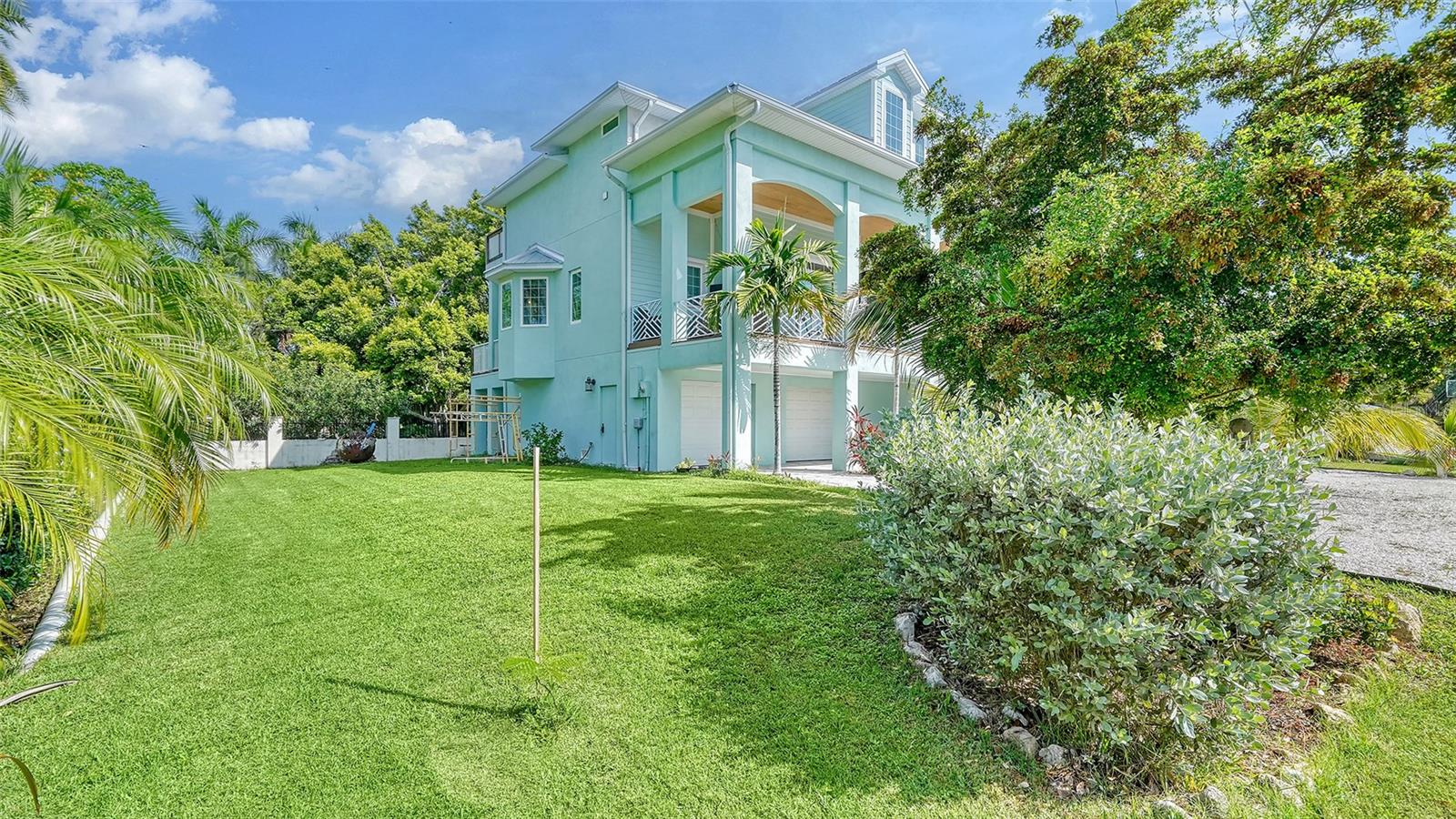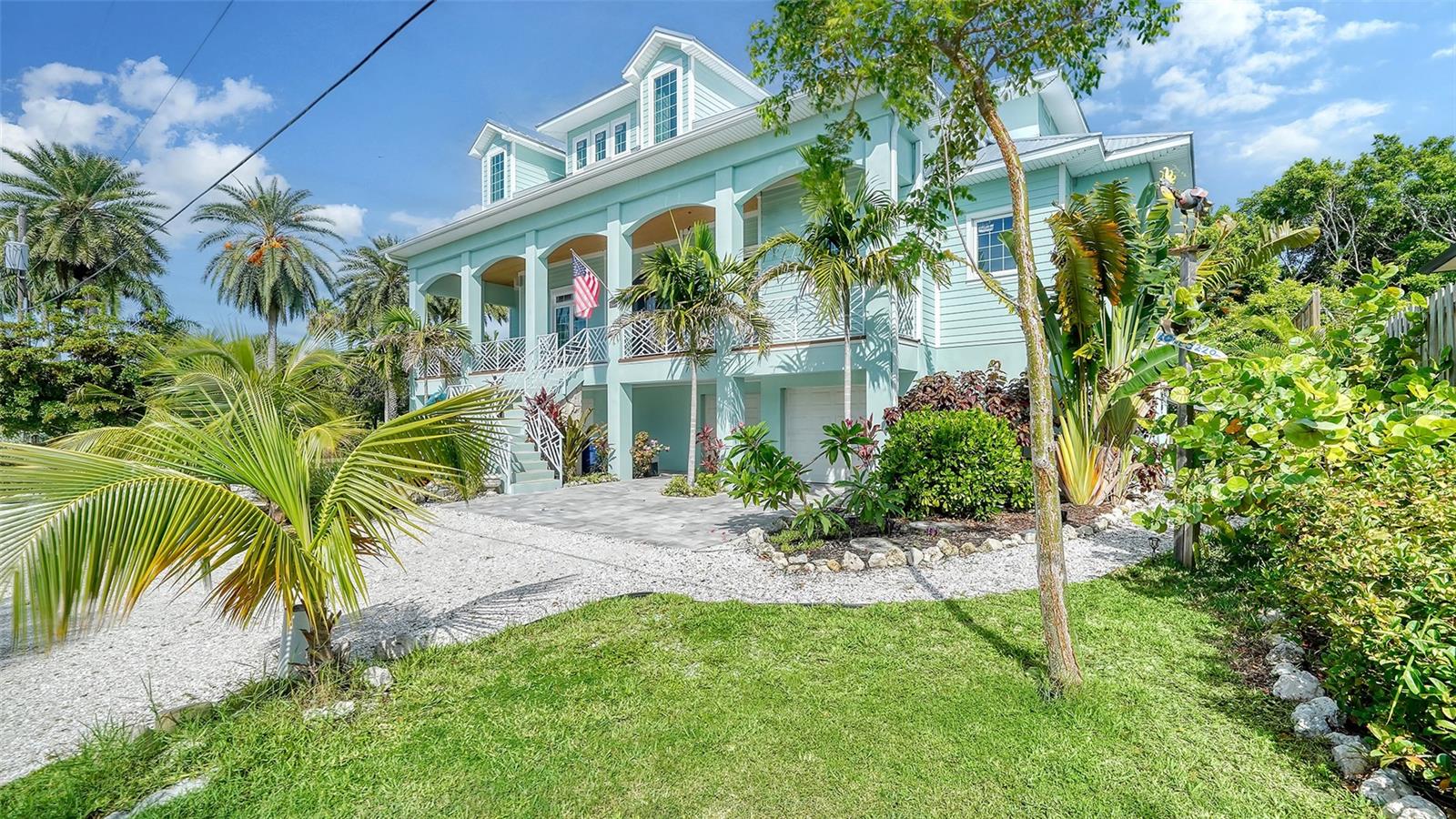 Nestled in the coveted West of the Trail area, just half a mile from the beautiful Siesta Key, you'll discover this exquisite custom-built home from 2020, located on a very private dead-end street. This Key West-style residence spans 3,407 square feet and features 3 bedrooms, 3.5 baths, an office/den, and a 4-car garage. Additionally, a bonus room with a private entrance is situated on the ground floor. This stunning three-story home is constructed with solid concrete block and poured concrete, meeting hurricane codes of 2020. It boasts a durable metal roof, impact windows and many more features add to the home's exceptional quality and appeal. The front of the house boasts a 500-square-foot covered porch finished with hardy board siding and Trex decking. In the back, there's a 500-square-foot terrace, accessible from both the kitchen and living room, ideal for entertaining or dining. Upon entering, you’ll be welcomed by a stunning living room with a soaring 28-foot ceiling, offering breathtaking views of the natural landscape. The kitchen, featuring high-end appliances and a gas cooktop, opens to a spacious back deck, perfect for entertaining. The primary suite and office are conveniently located on the main floor. The third floor, open to the living room below, houses two additional en-suite bedrooms, a wet bar, a small office space, and a back terrace surrounded by nature. This unique layout seamlessly blends luxury and comfort, making it an ideal retreat.