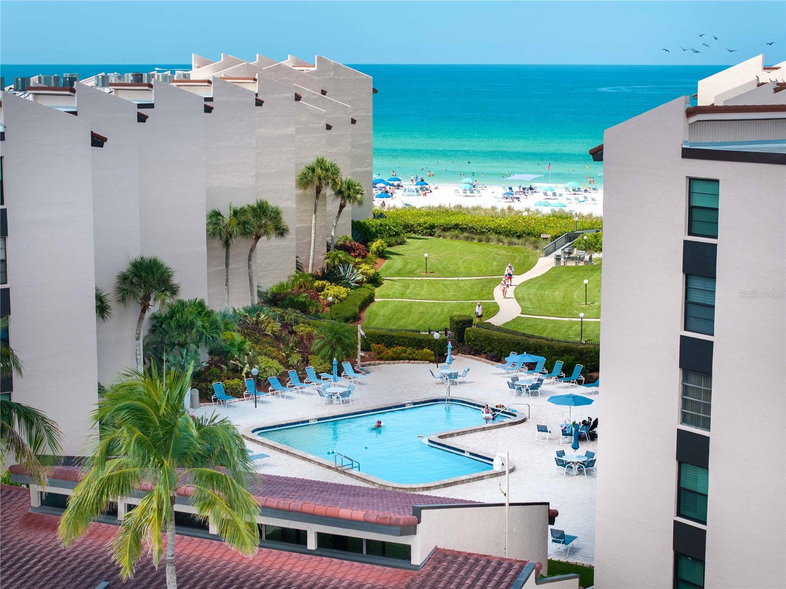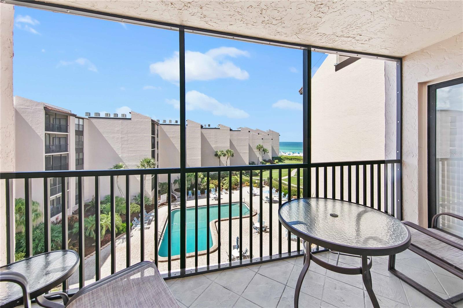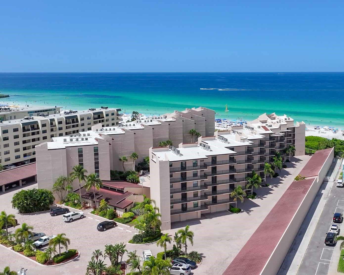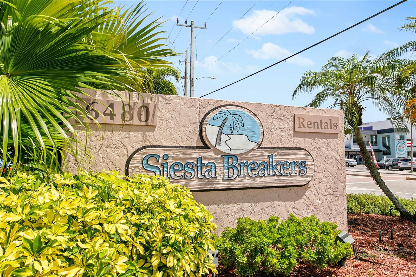 Welcome to your island getaway that offers all the comforts of home. Nestled in the north building of Siesta Breakers, this cozy two bedroom two bathroom beachside abode is bright and cheerful. As you approach the front door with a convenient screen door to allow a gentle breeze, drink in the impressive view of the Gulf of Mexico from the 5th floor perch. Like a breath of fresh air, the inviting kitchen draws you in as your eyes travel the length of the open floor plan to the lanai with equally impressive views of the gorgeous grounds and the gulf. A generous kitchen is the perfect place to create your coastal cuisine and features convenient counter height seating, updated recessed lighting and a closet with your advantageous in-unit laundry. A neutral tile floor grants low maintenance living and easy clean up from your sandy Siesta adventures and is the foundation of the generous living area, the perfect place to prop your feet up and relax. Open the doors to the spacious lanai and create a cool cross breeze while enjoying the sound of the waves lapping along Crescent Beach. Retire to the ample owners en-suite where you are surrounded by upgrades from the attractive plantation shutters to the nicely appointed bathroom featuring dual closets and handsome finishes. Siesta Breakers boasts a prime location along Crescent Beach just a short stroll to dining and shopping at Captain Curt’s plaza and a short Siesta Breeze Trolley ride away from the lively Siesta Village. Spend your days lounging on the beach, soaking in the heated swimming pool, playing a spirited game of tennis on the lighted courts or socializing in the welcoming club house. Venture off the island and enjoy Sarasota’s engaging recreational activities, vibrant cultural scene and exciting shopping and eateries. All 2024 special assessments have been paid by owners and an excellent onsite rental management office makes this an enticing opportunity for the owner/investor!
