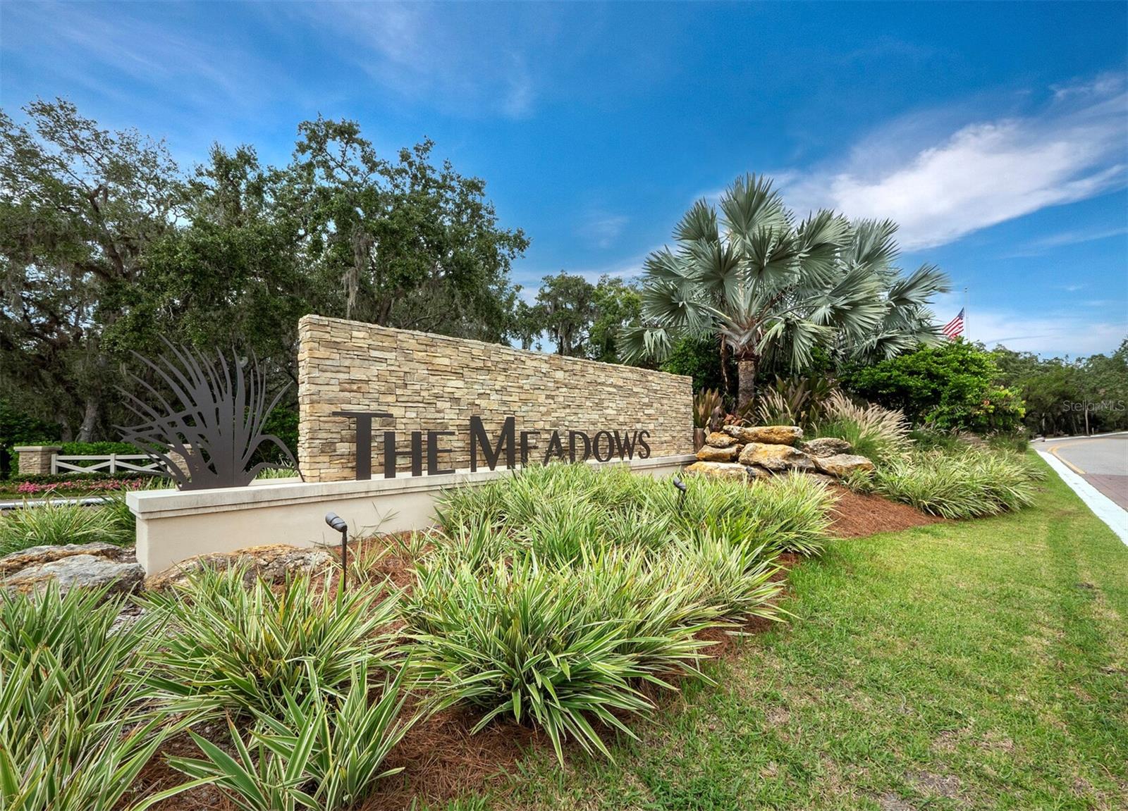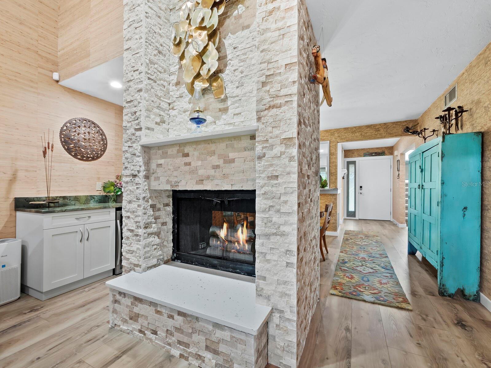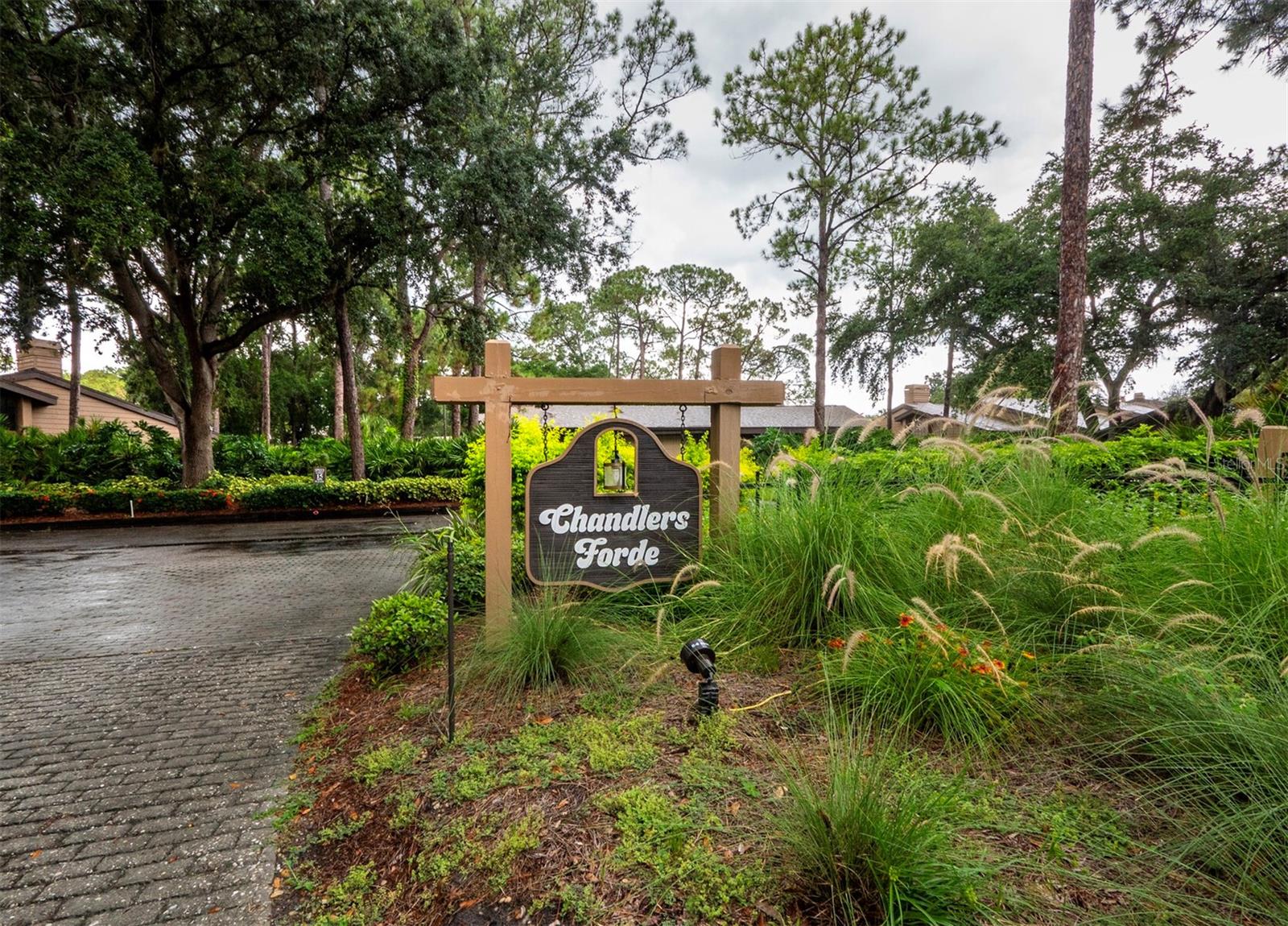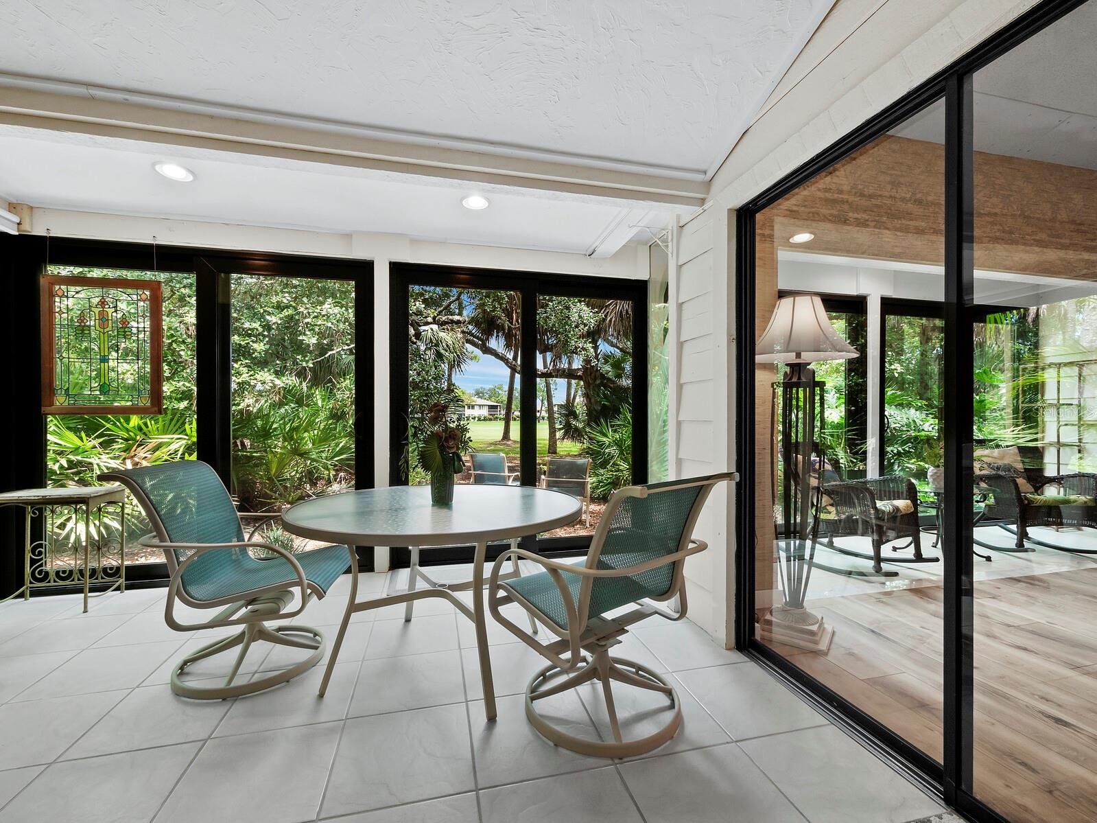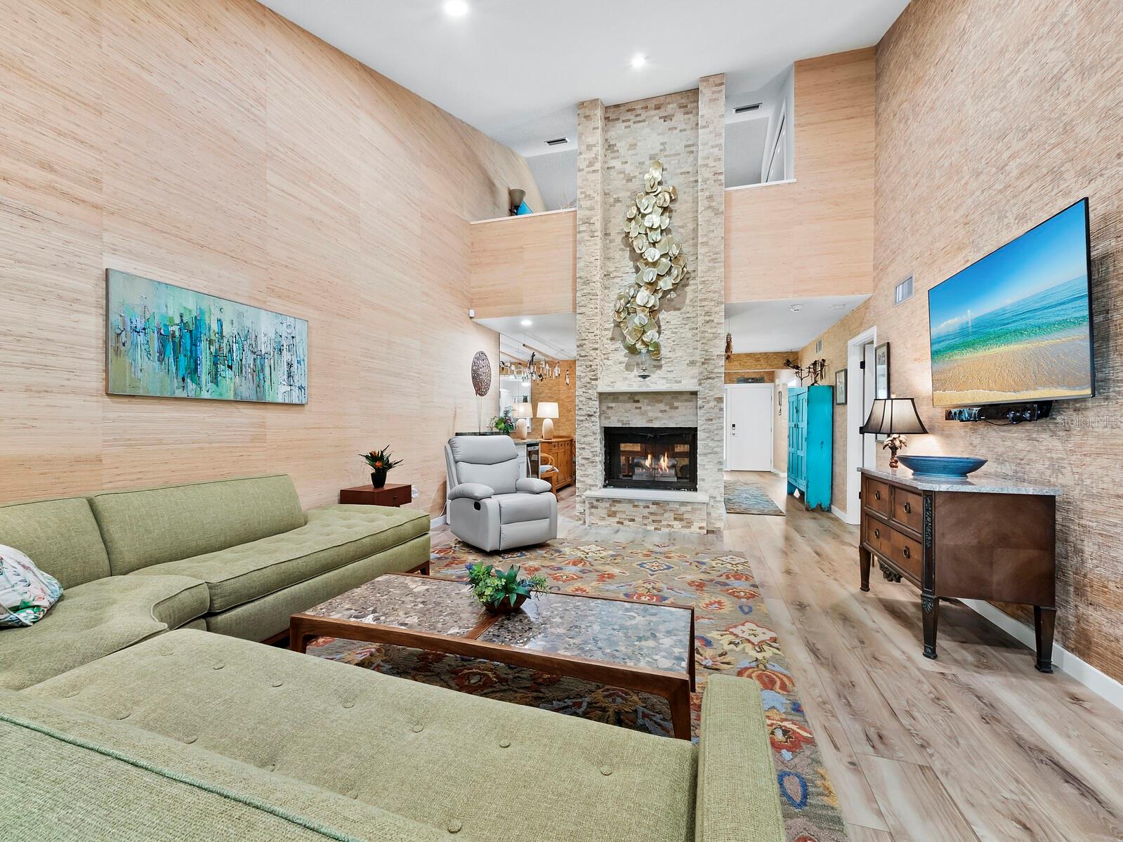 Welcome to a serene retreat in The Meadows, nestled in the forested enclave of Chandlers Forde. This 2-bedroom + den villa offers over 2,000 sq. ft. of stylish, comfortable living space. Upon entry, you're immediately enveloped by a harmonious blend of wood, stone, and intricate tilework, all illuminated by carefully crafted lighting. The faux wood tile floors lead you into the heart of the home, where the formal dining room and living room share a magnificent two-sided fireplace, stretching up to the vaulted ceiling and creating an open, airy ambiance. The beautifully updated kitchen features top-quality stainless steel appliances, stone countertops, a breakfast bar, and all-white cabinetry accented with glass panels and a chic tile backsplash. Adjacent to the kitchen, the dining area and living room flow seamlessly into the expansive Florida room. The primary suite on the main floor offers a private escape, with a sliding door opening to the Florida room. Upstairs, an additional bedroom and a dedicated office space provide ample room for family or guests. Additional features include two A/C units replaced in 2018 and a new roof installed in 2022. Located in The Meadows, a friendly community with 14 miles of meandering walking/biking trails and resort-style amenities, including three 18-hole golf courses, excellent tennis facilities, a fitness and community center, multiple pools, and more for active, social living.