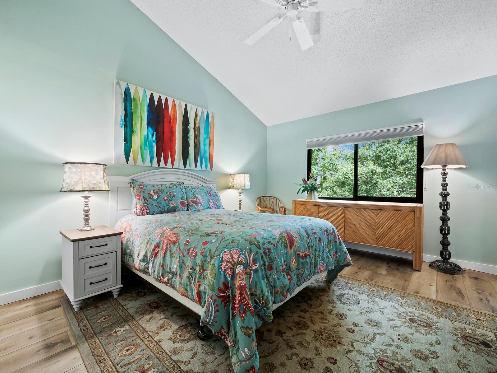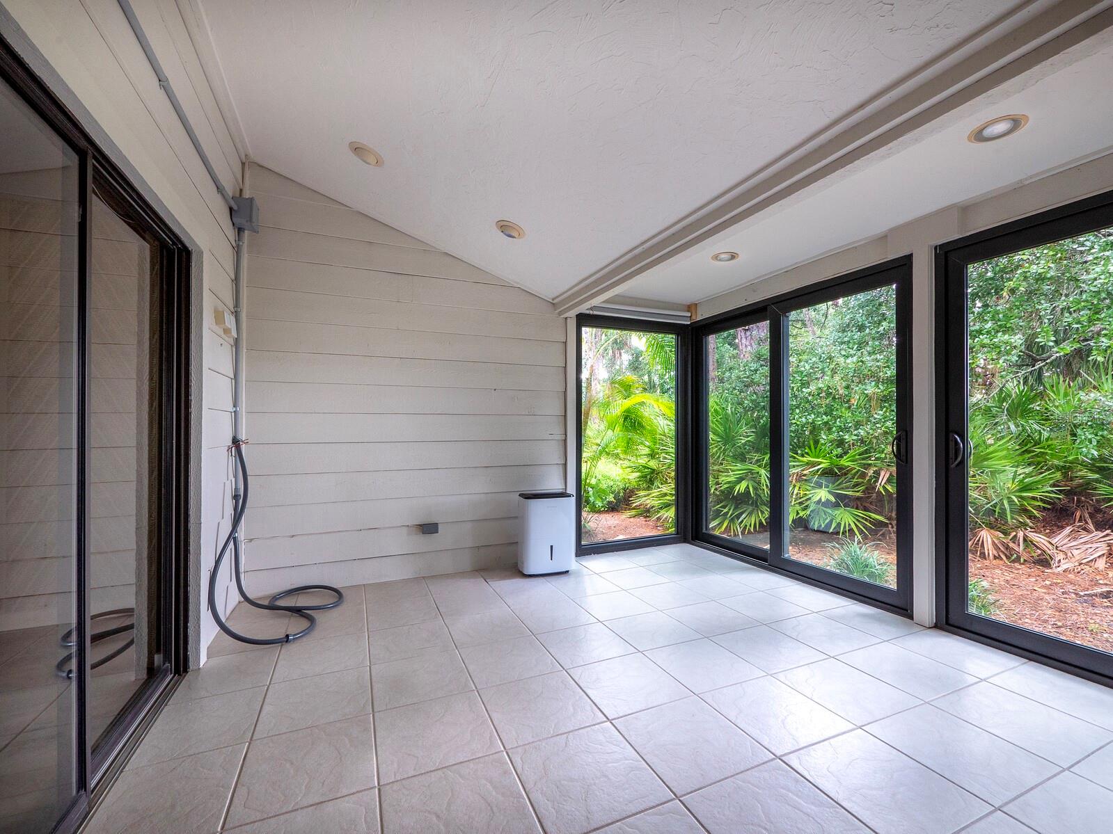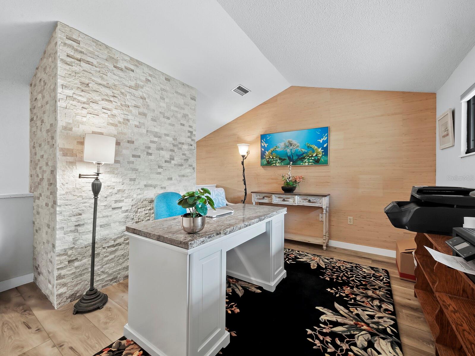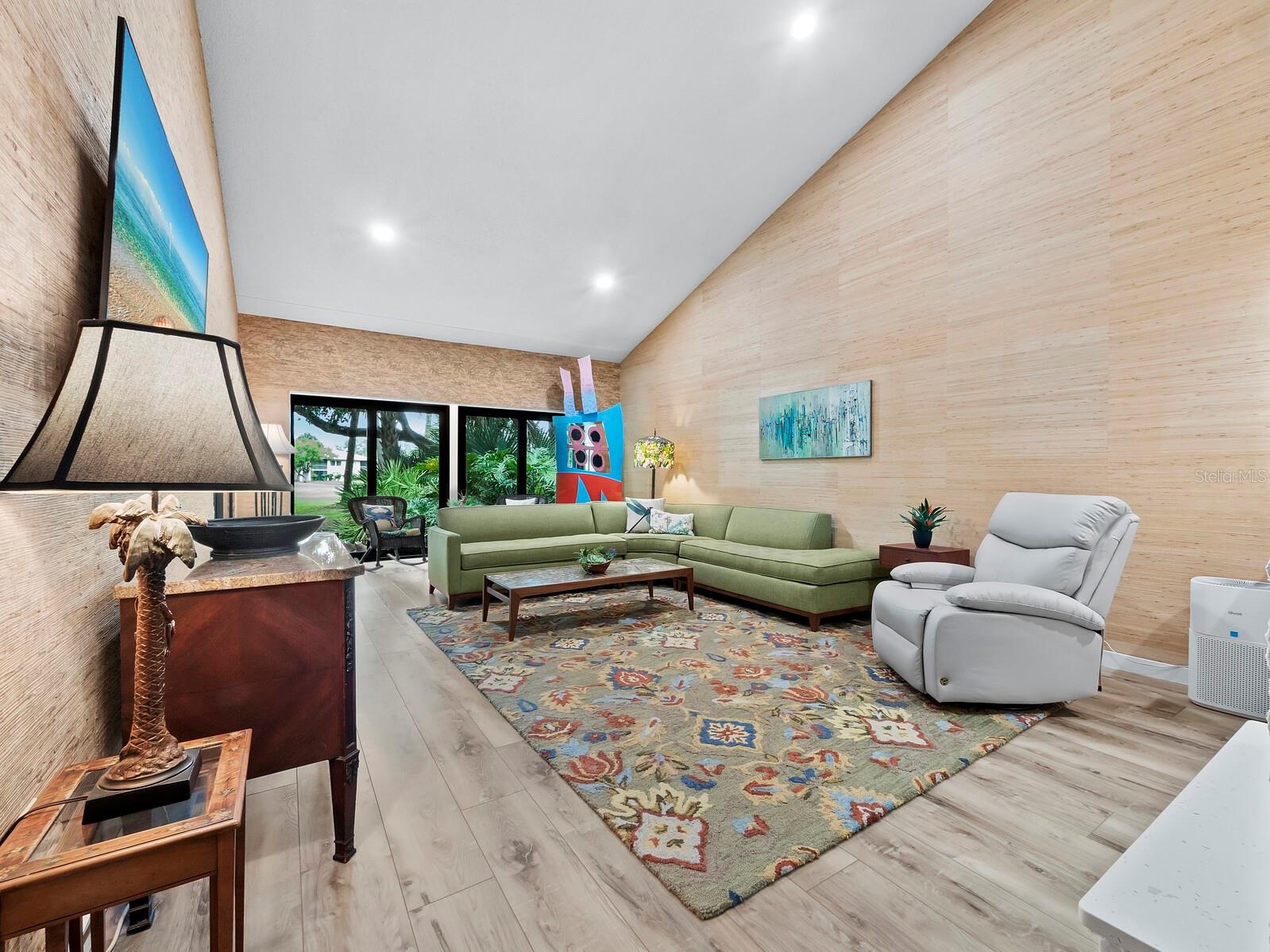 Welcome to a serene retreat in The Meadows, nestled in the forested enclave of Chandlers Forde. This 2-bedroom + den villa offers over 2,000 sq. ft. of stylish, comfortable living space. Upon entry, you're immediately enveloped by a harmonious blend of wood, stone, and intricate tilework, all illuminated by carefully crafted lighting. The faux wood tile floors lead you into the heart of the home, where the formal dining room and living room share a magnificent two-sided fireplace, stretching up to the vaulted ceiling and creating an open, airy ambiance. The beautifully updated kitchen features top-quality stainless steel appliances, stone countertops, a breakfast bar, and all-white cabinetry accented with glass panels and a chic tile backsplash. Adjacent to the kitchen, the dining area and living room flow seamlessly into the expansive Florida room. The primary suite on the main floor offers a private escape, with a sliding door opening to the Florida room. Upstairs, an additional bedroom and a dedicated office space provide ample room for family or guests. Additional features include two A/C units replaced in 2018 and a new roof installed in 2022. Located in The Meadows, a friendly community with 14 miles of meandering walking/biking trails and resort-style amenities, including three 18-hole golf courses, excellent tennis facilities, a fitness and community center, multiple pools, and more for active, social living.