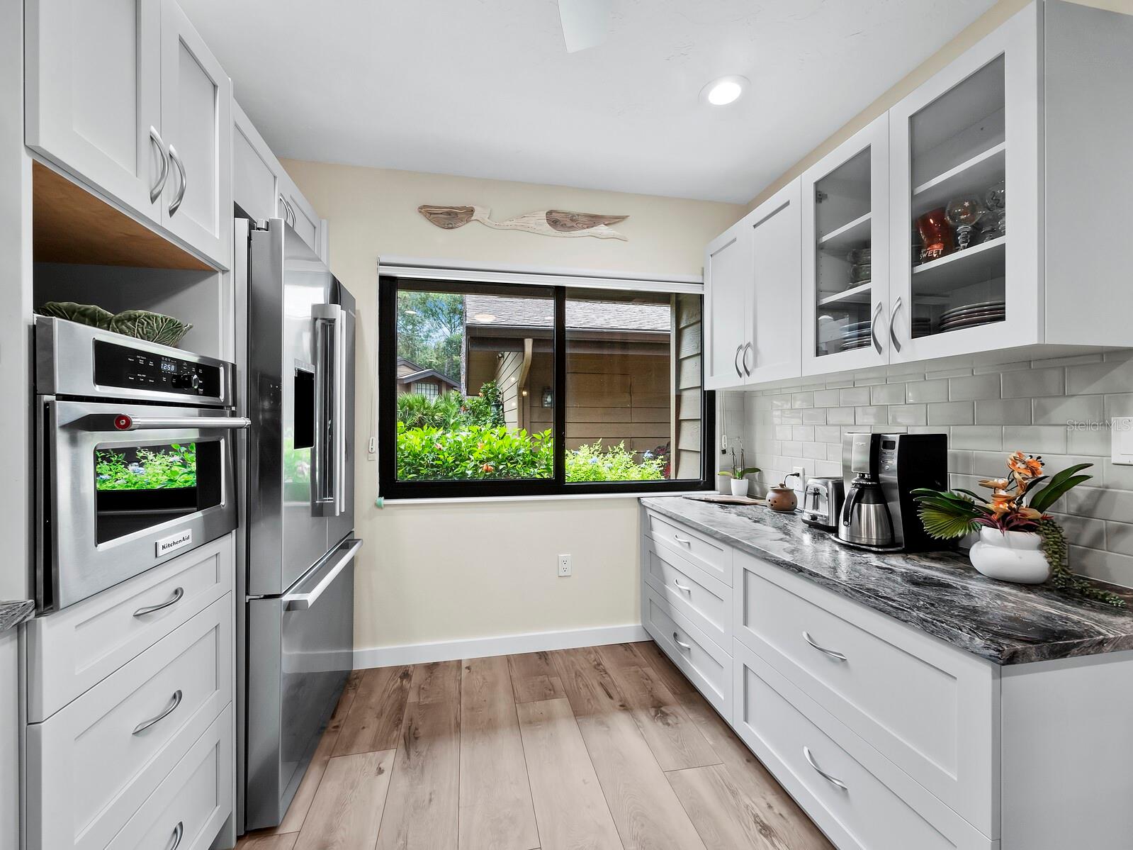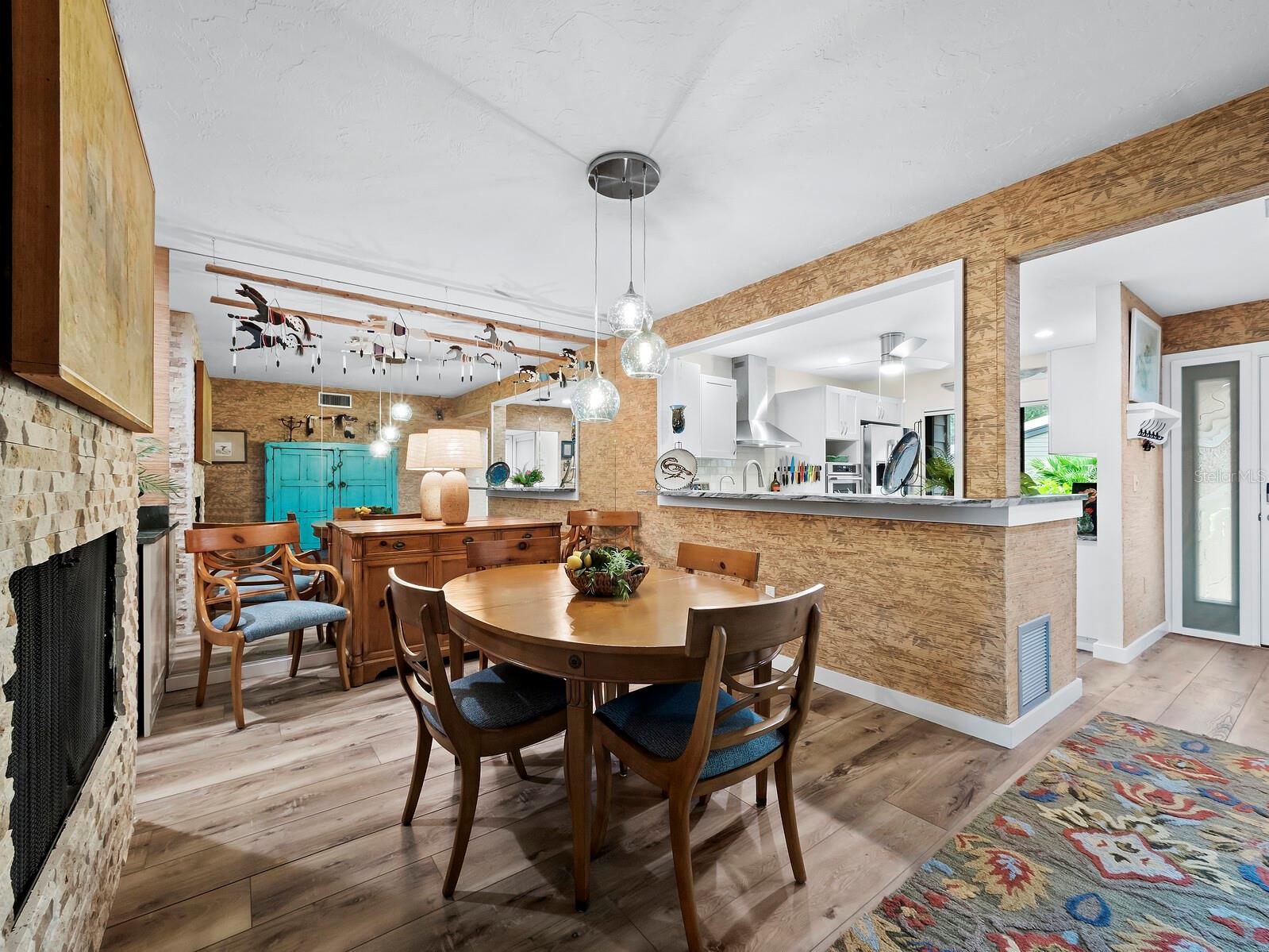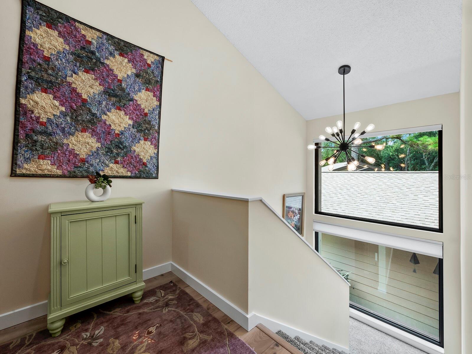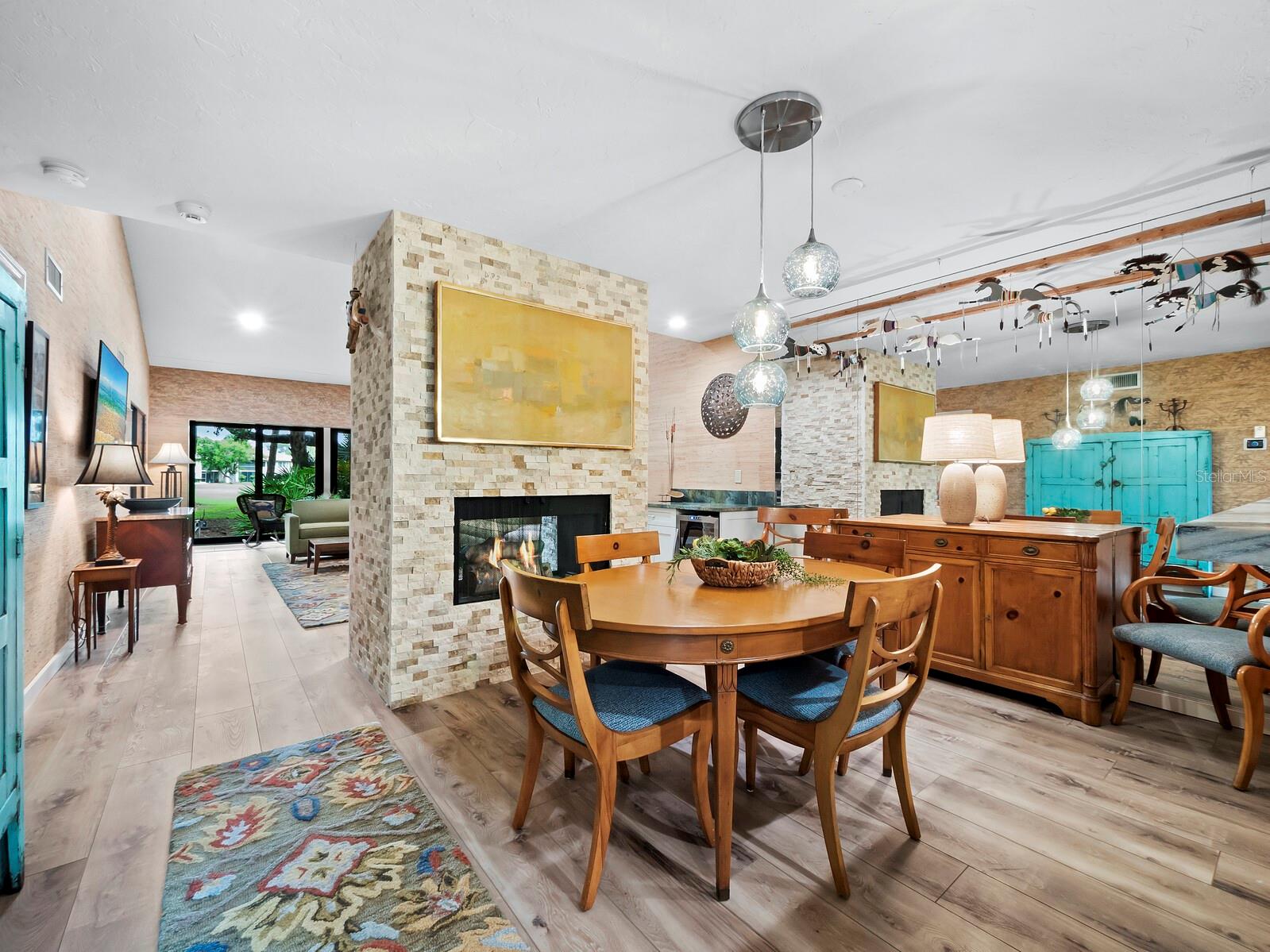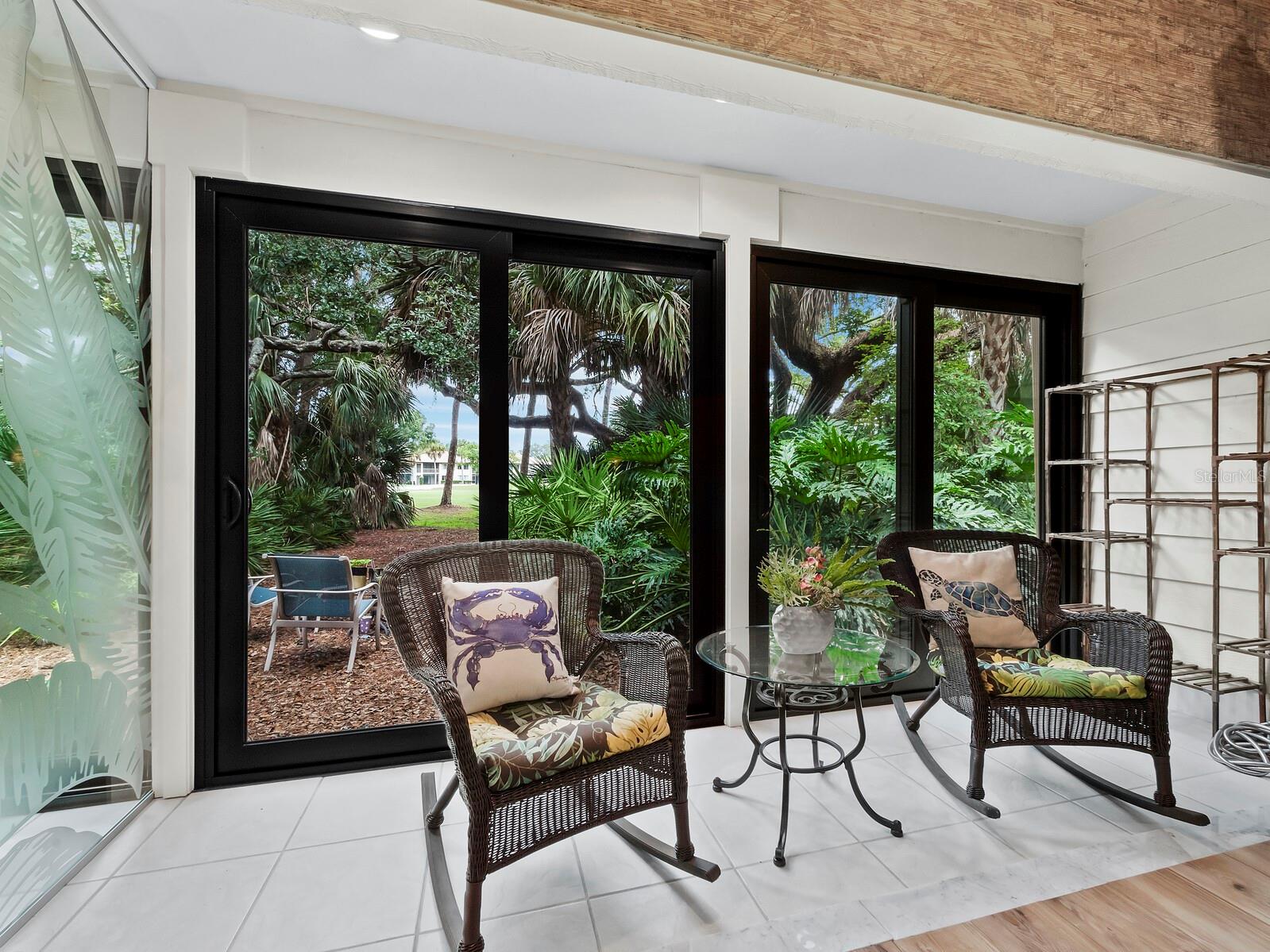 Welcome to a serene retreat in The Meadows, nestled in the forested enclave of Chandlers Forde. This 2-bedroom + den villa offers over 2,000 sq. ft. of stylish, comfortable living space. Upon entry, you're immediately enveloped by a harmonious blend of wood, stone, and intricate tilework, all illuminated by carefully crafted lighting. The faux wood tile floors lead you into the heart of the home, where the formal dining room and living room share a magnificent two-sided fireplace, stretching up to the vaulted ceiling and creating an open, airy ambiance. The beautifully updated kitchen features top-quality stainless steel appliances, stone countertops, a breakfast bar, and all-white cabinetry accented with glass panels and a chic tile backsplash. Adjacent to the kitchen, the dining area and living room flow seamlessly into the expansive Florida room. The primary suite on the main floor offers a private escape, with a sliding door opening to the Florida room. Upstairs, an additional bedroom and a dedicated office space provide ample room for family or guests. Additional features include two A/C units replaced in 2018 and a new roof installed in 2022. Located in The Meadows, a friendly community with 14 miles of meandering walking/biking trails and resort-style amenities, including three 18-hole golf courses, excellent tennis facilities, a fitness and community center, multiple pools, and more for active, social living.