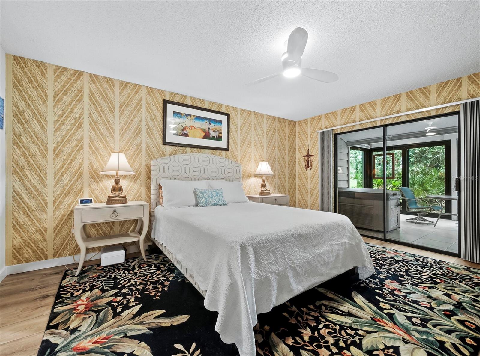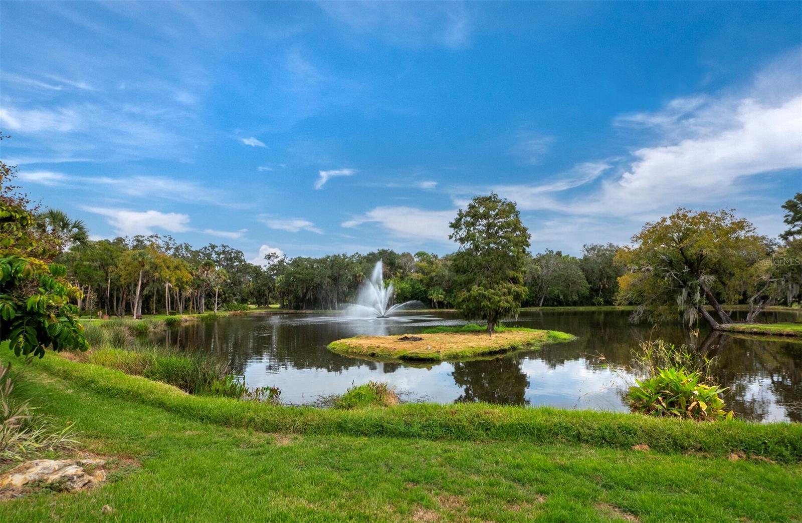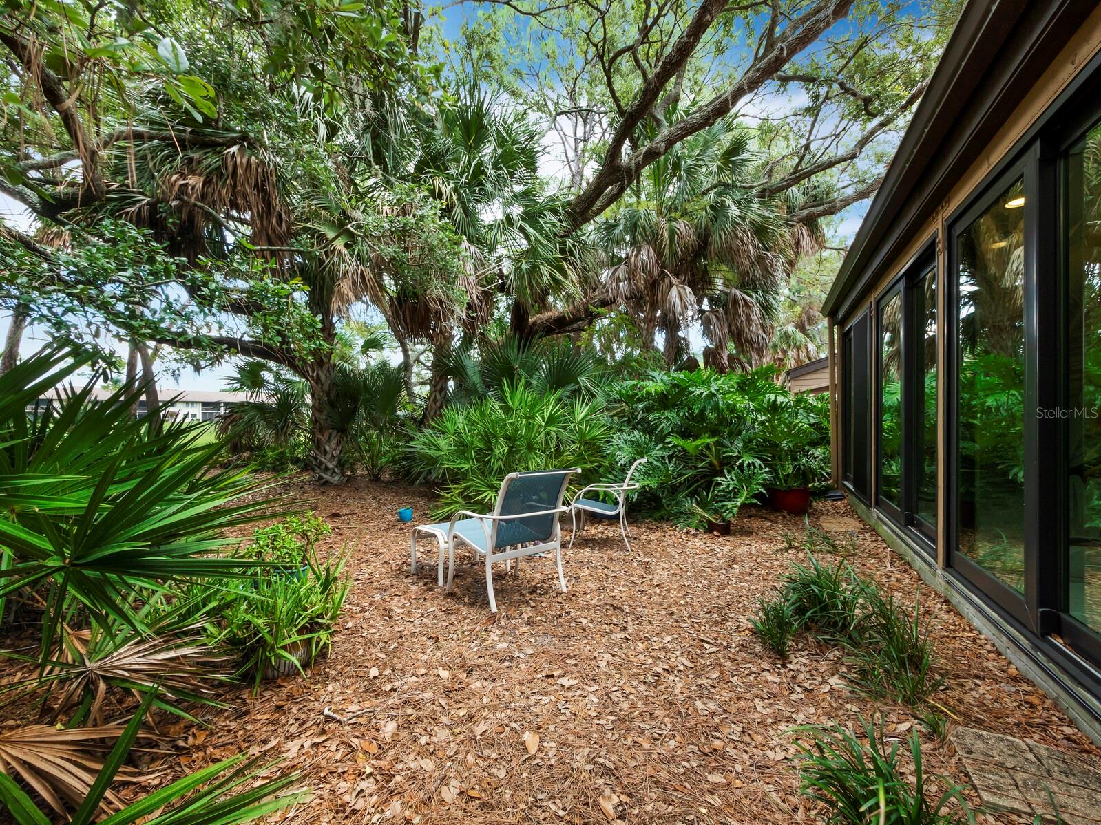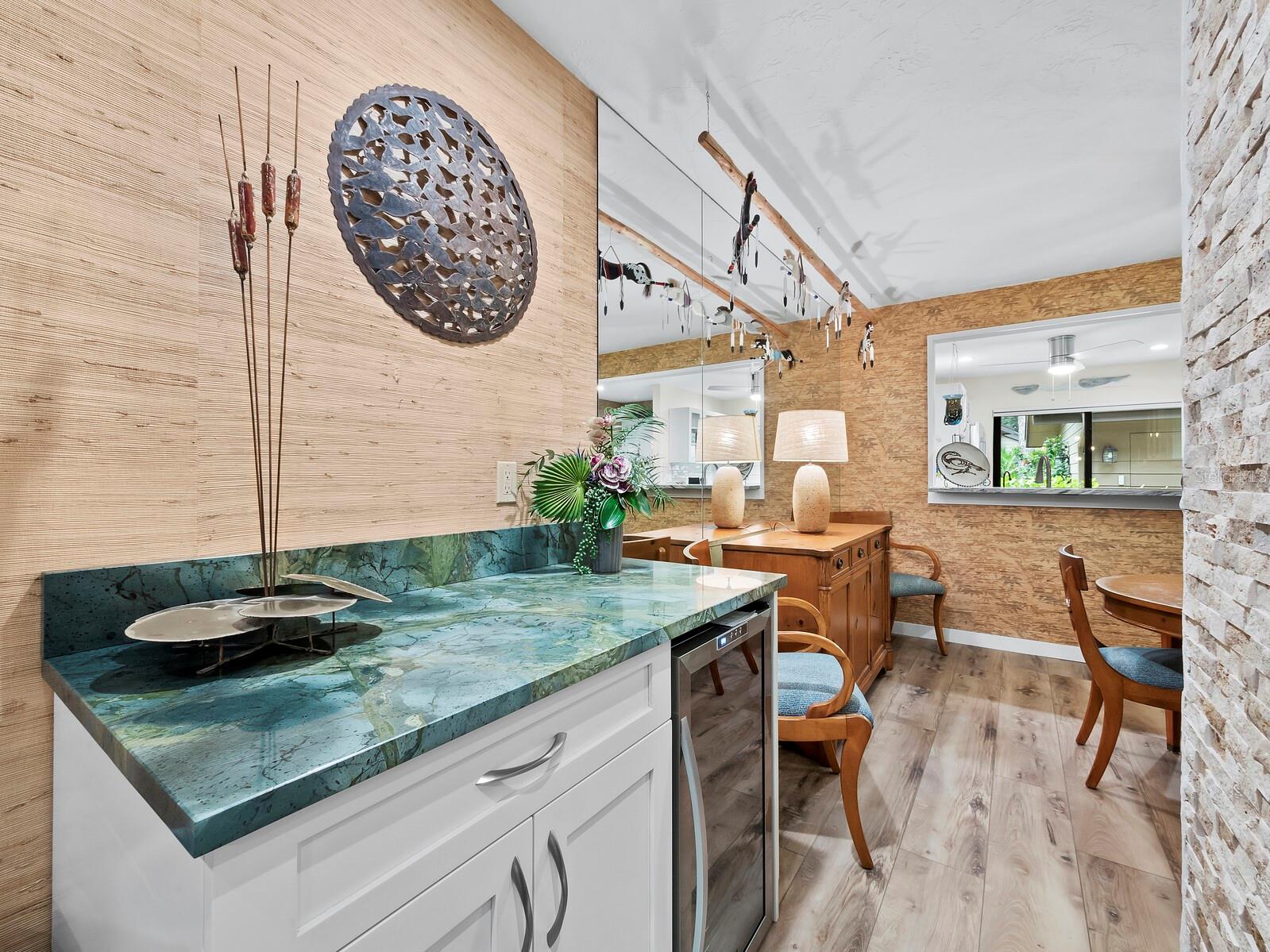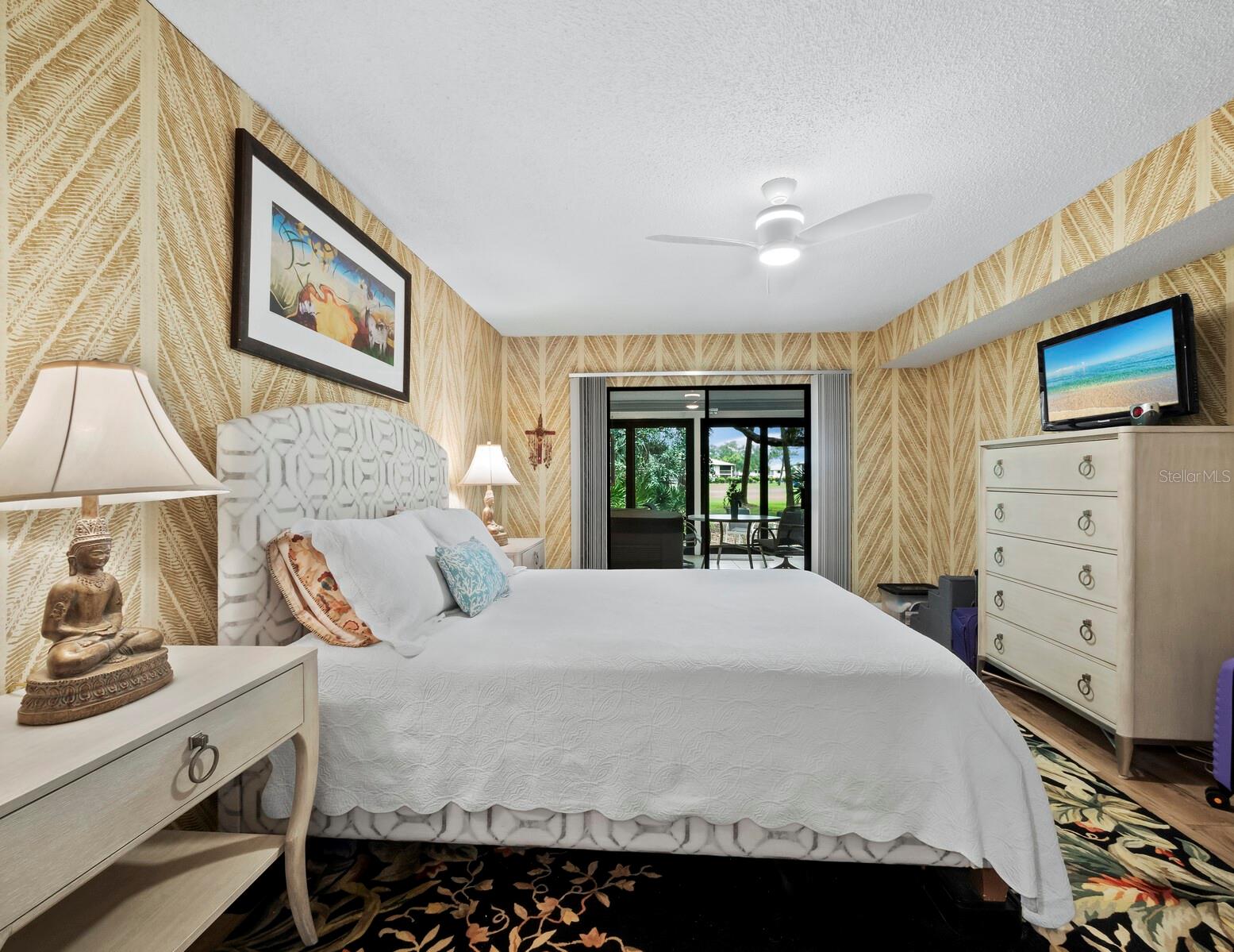 Welcome to a serene retreat in The Meadows, nestled in the forested enclave of Chandlers Forde. This 2-bedroom + den villa offers over 2,000 sq. ft. of stylish, comfortable living space. Upon entry, you're immediately enveloped by a harmonious blend of wood, stone, and intricate tilework, all illuminated by carefully crafted lighting. The faux wood tile floors lead you into the heart of the home, where the formal dining room and living room share a magnificent two-sided fireplace, stretching up to the vaulted ceiling and creating an open, airy ambiance. The beautifully updated kitchen features top-quality stainless steel appliances, stone countertops, a breakfast bar, and all-white cabinetry accented with glass panels and a chic tile backsplash. Adjacent to the kitchen, the dining area and living room flow seamlessly into the expansive Florida room. The primary suite on the main floor offers a private escape, with a sliding door opening to the Florida room. Upstairs, an additional bedroom and a dedicated office space provide ample room for family or guests. Additional features include two A/C units replaced in 2018 and a new roof installed in 2022. Located in The Meadows, a friendly community with 14 miles of meandering walking/biking trails and resort-style amenities, including three 18-hole golf courses, excellent tennis facilities, a fitness and community center, multiple pools, and more for active, social living.