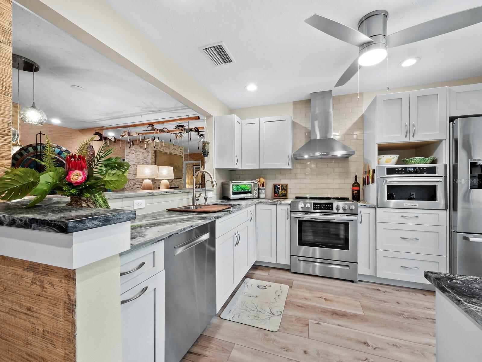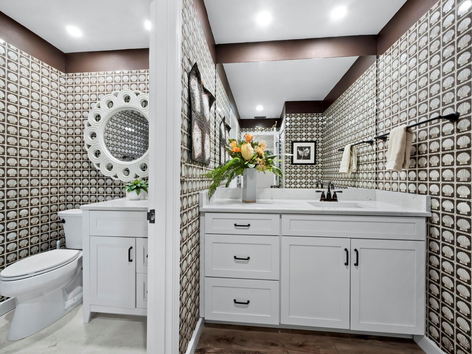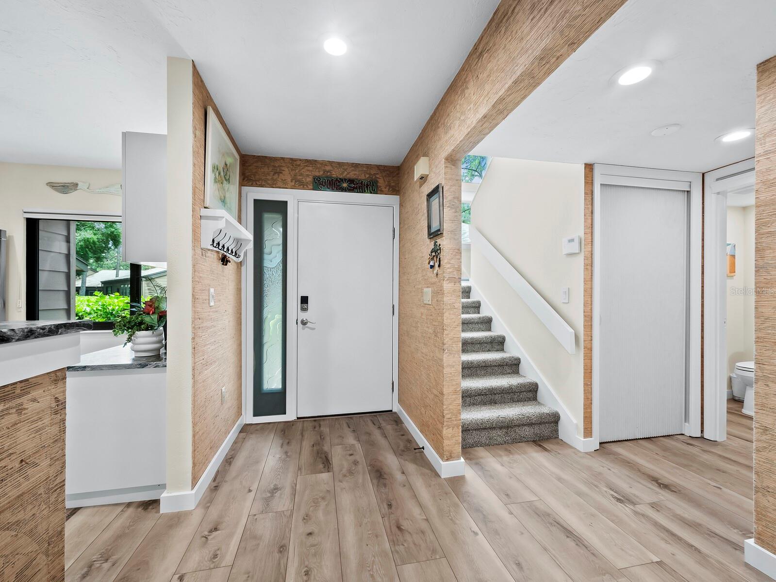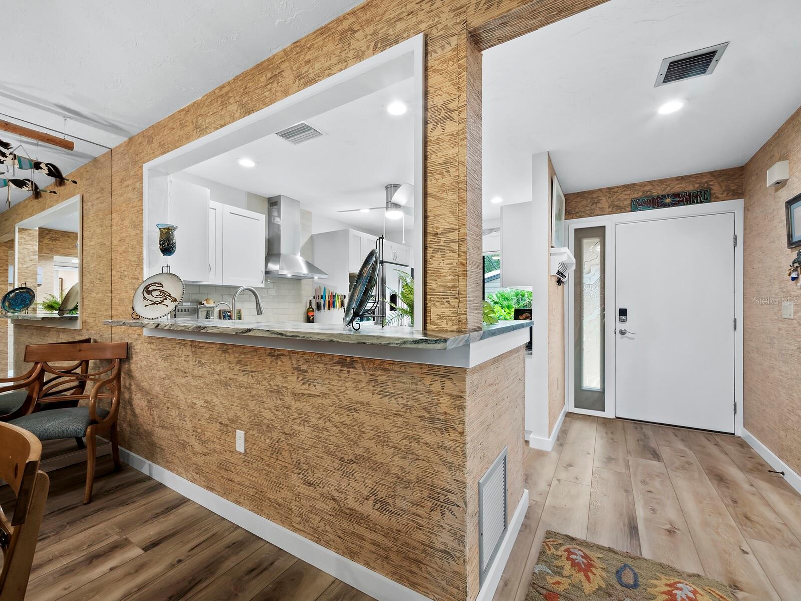 Welcome to a serene retreat in The Meadows, nestled in the forested enclave of Chandlers Forde. This 2-bedroom + den villa offers over 2,000 sq. ft. of stylish, comfortable living space. Upon entry, you're immediately enveloped by a harmonious blend of wood, stone, and intricate tilework, all illuminated by carefully crafted lighting. The faux wood tile floors lead you into the heart of the home, where the formal dining room and living room share a magnificent two-sided fireplace, stretching up to the vaulted ceiling and creating an open, airy ambiance. The beautifully updated kitchen features top-quality stainless steel appliances, stone countertops, a breakfast bar, and all-white cabinetry accented with glass panels and a chic tile backsplash. Adjacent to the kitchen, the dining area and living room flow seamlessly into the expansive Florida room. The primary suite on the main floor offers a private escape, with a sliding door opening to the Florida room. Upstairs, an additional bedroom and a dedicated office space provide ample room for family or guests. Additional features include two A/C units replaced in 2018 and a new roof installed in 2022. Located in The Meadows, a friendly community with 14 miles of meandering walking/biking trails and resort-style amenities, including three 18-hole golf courses, excellent tennis facilities, a fitness and community center, multiple pools, and more for active, social living.