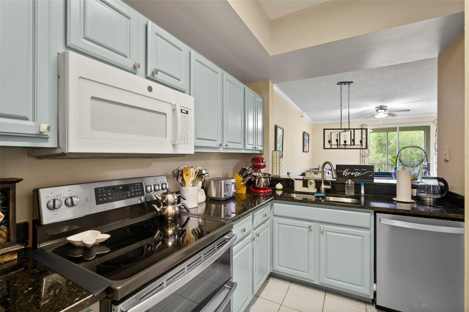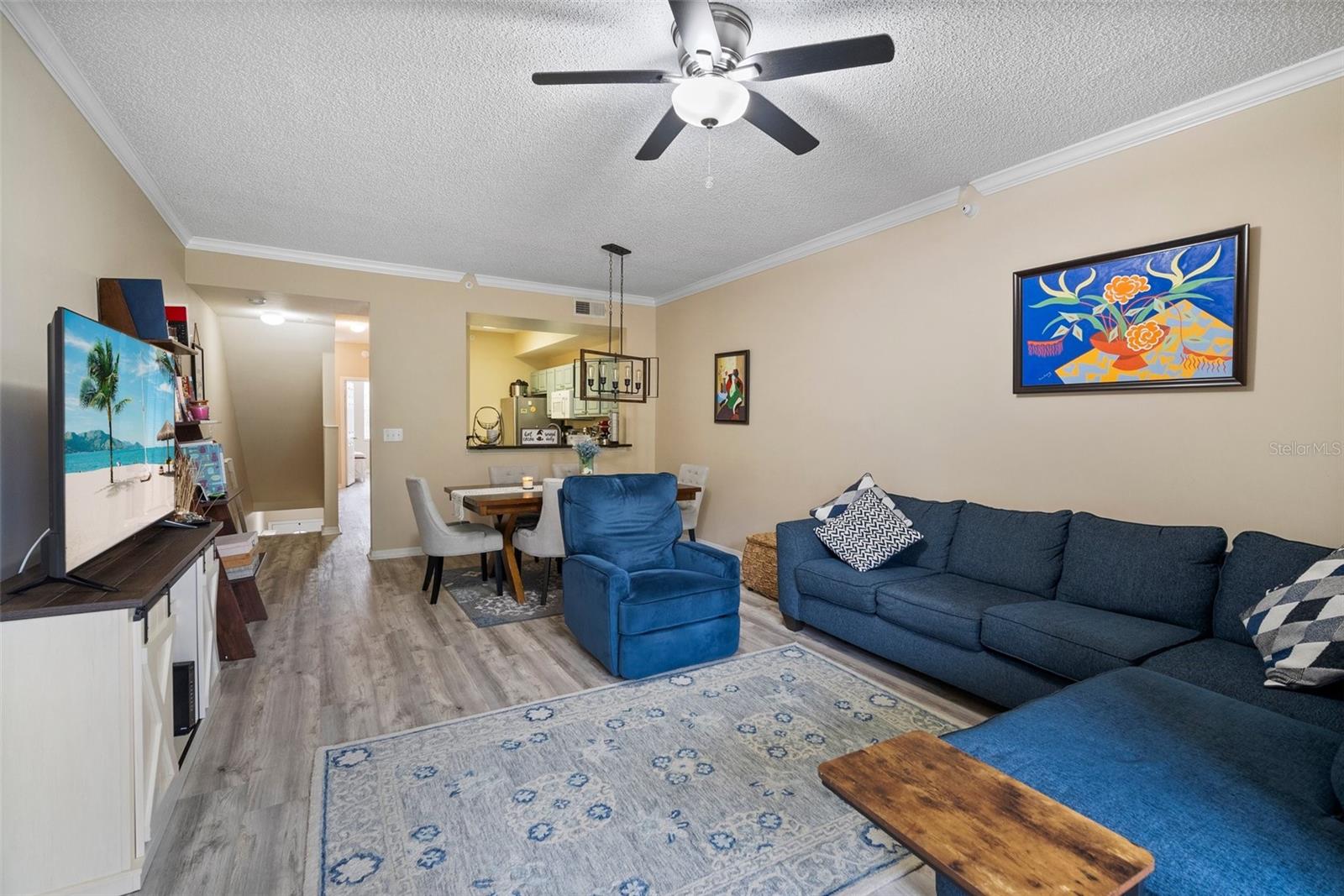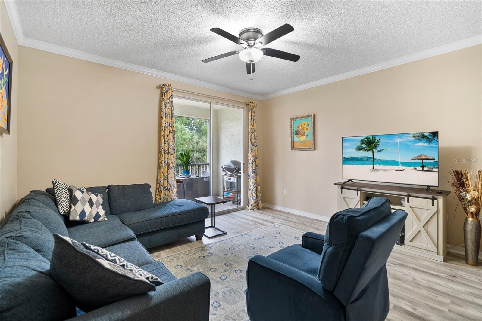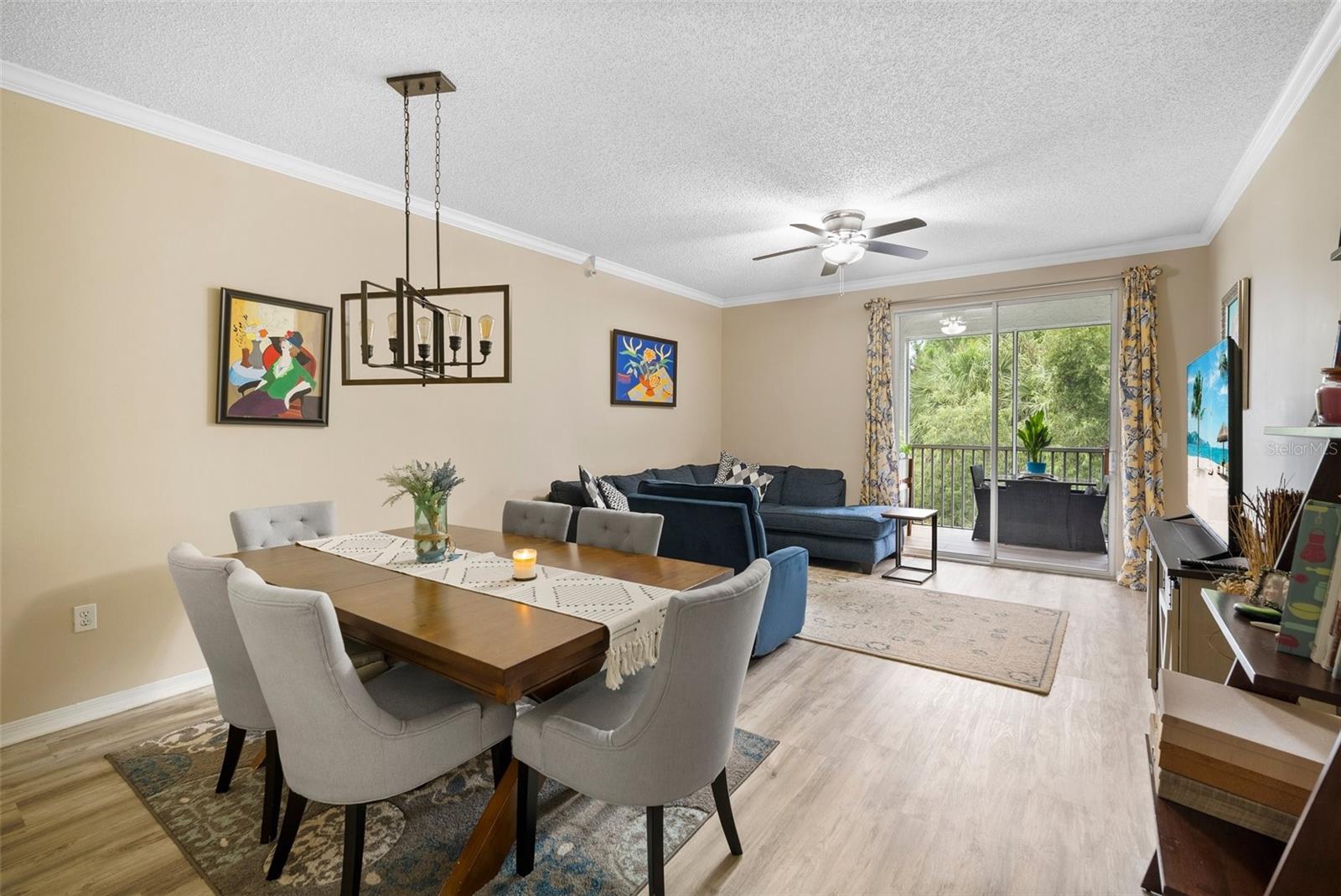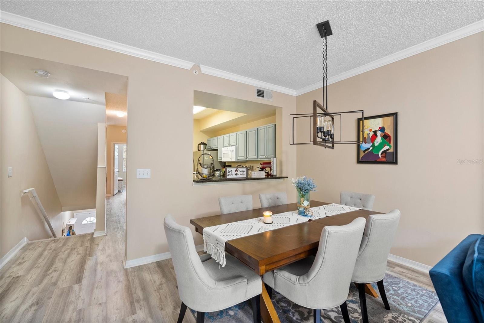Welcome to resort style living! This two bedroom, two bath home offers comfort and convenience. The entry vestibule features direct access from your own private one-car garage with extra storage space. Up one flight of stairs, a great room with crown molding and luxury vinyl plank opens to a screened veranda with a view of the pond, fountain, and tranquil nature preserve. Luxury vinyl plank extends throughout the home with ceramic tile in the kitchen and bathrooms. The kitchen bar counter opens to the dining room, a shared space with the living room, great for social gathering. The kitchen adorns granite countertops, freshly painted cabinets, stainless steel appliances including a double oven. Down the hall is the second bedroom, full guest bath with an updated vanity, and a computer niche. Up stairs is the primary bedroom, en-suite bath that has updated vanities, and walk-in closet. Roof was recently replaced. AC and water heater are 2022. Washer and dryer located on the third floor are also 2022. Located across the parking lot is one of the two clubhouses that feature resort style pool, spa, exercise rooms, and outdoor grill. Las Palmas extensive park like site is adjacent to the Olympic world rowing and recreation park (Benderson) and close to University Town Center. Numerous restaurants and two upscale grocery stores are close at hand.