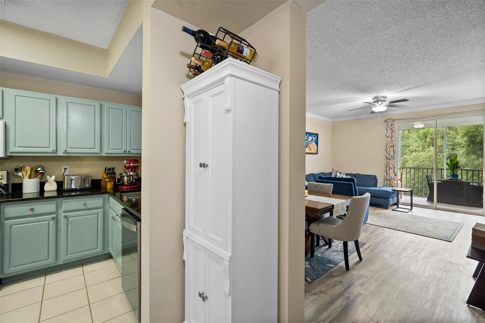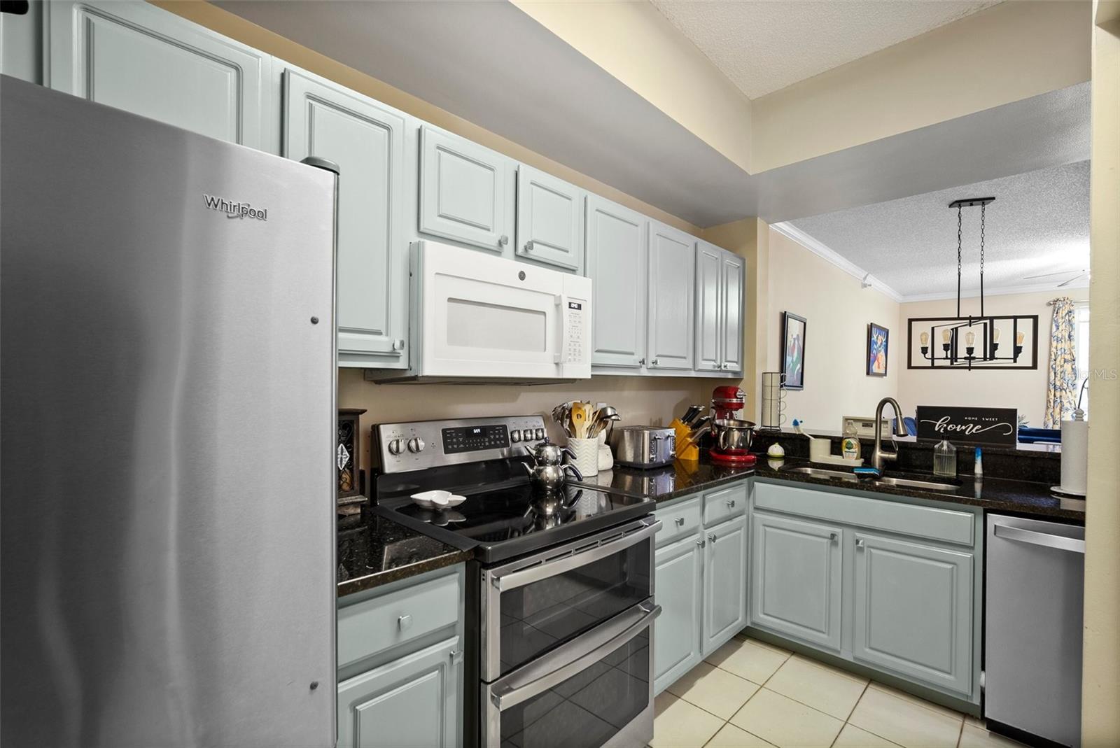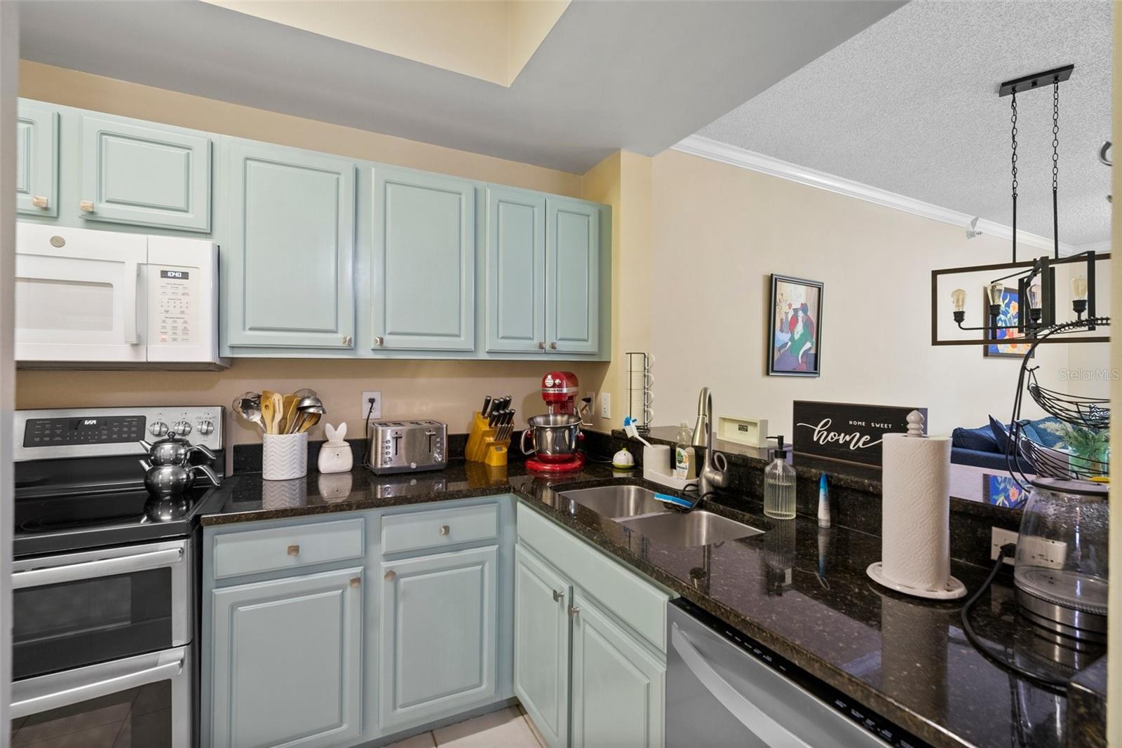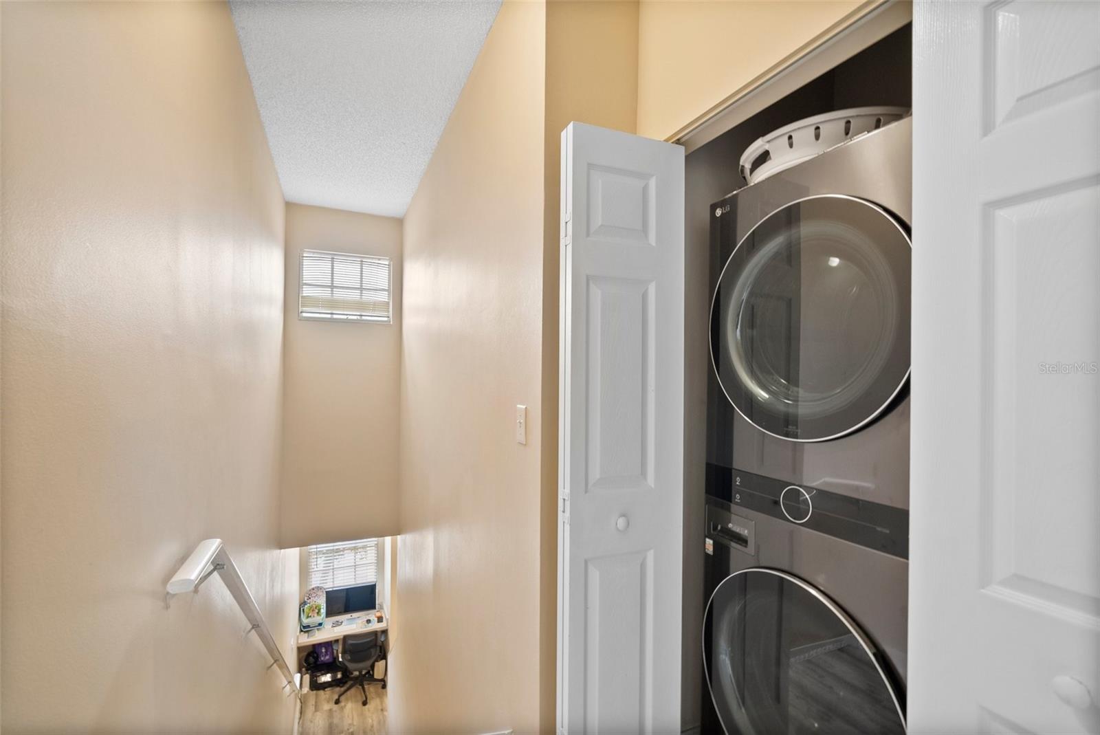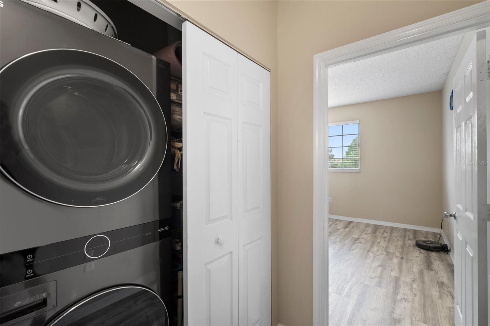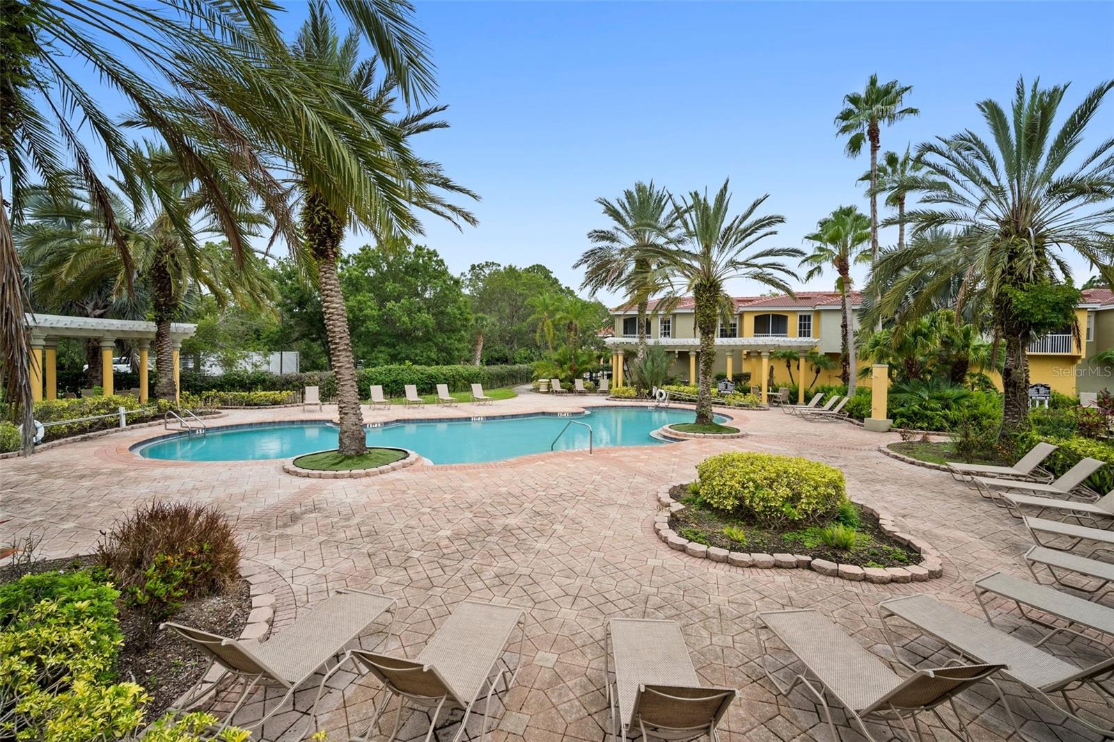 Welcome to resort style living! This two bedroom, two bath home offers comfort and convenience. The entry vestibule features direct access from your own private one-car garage with extra storage space. Up one flight of stairs, a great room with crown molding and luxury vinyl plank opens to a screened veranda with a view of the pond, fountain, and tranquil nature preserve. Luxury vinyl plank extends throughout the home with ceramic tile in the kitchen and bathrooms. The kitchen bar counter opens to the dining room, a shared space with the living room, great for social gathering. The kitchen adorns granite countertops, freshly painted cabinets, stainless steel appliances including a double oven. Down the hall is the second bedroom, full guest bath with an updated vanity, and a computer niche. Up stairs is the primary bedroom, en-suite bath that has updated vanities, and walk-in closet. Roof was recently replaced. AC and water heater are 2022. Washer and dryer located on the third floor are also 2022. Located across the parking lot is one of the two clubhouses that feature resort style pool, spa, exercise rooms, and outdoor grill. Las Palmas extensive park like site is adjacent to the Olympic world rowing and recreation park (Benderson) and close to University Town Center. Numerous restaurants and two upscale grocery stores are close at hand.