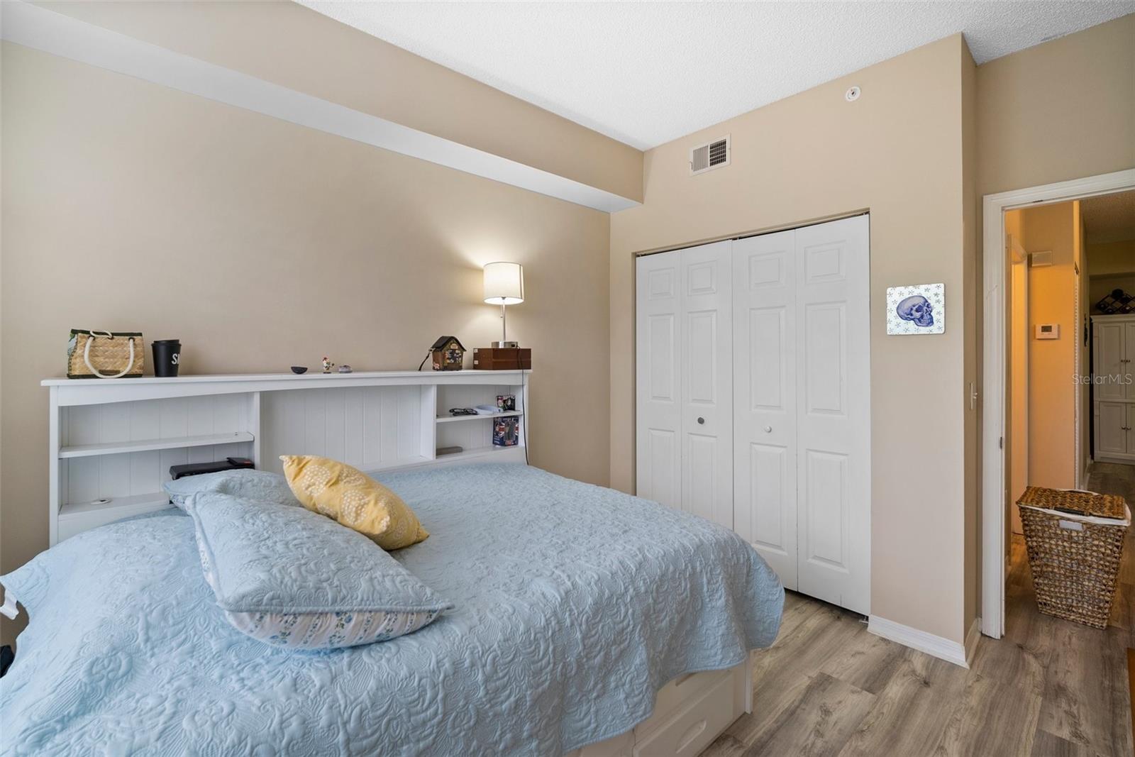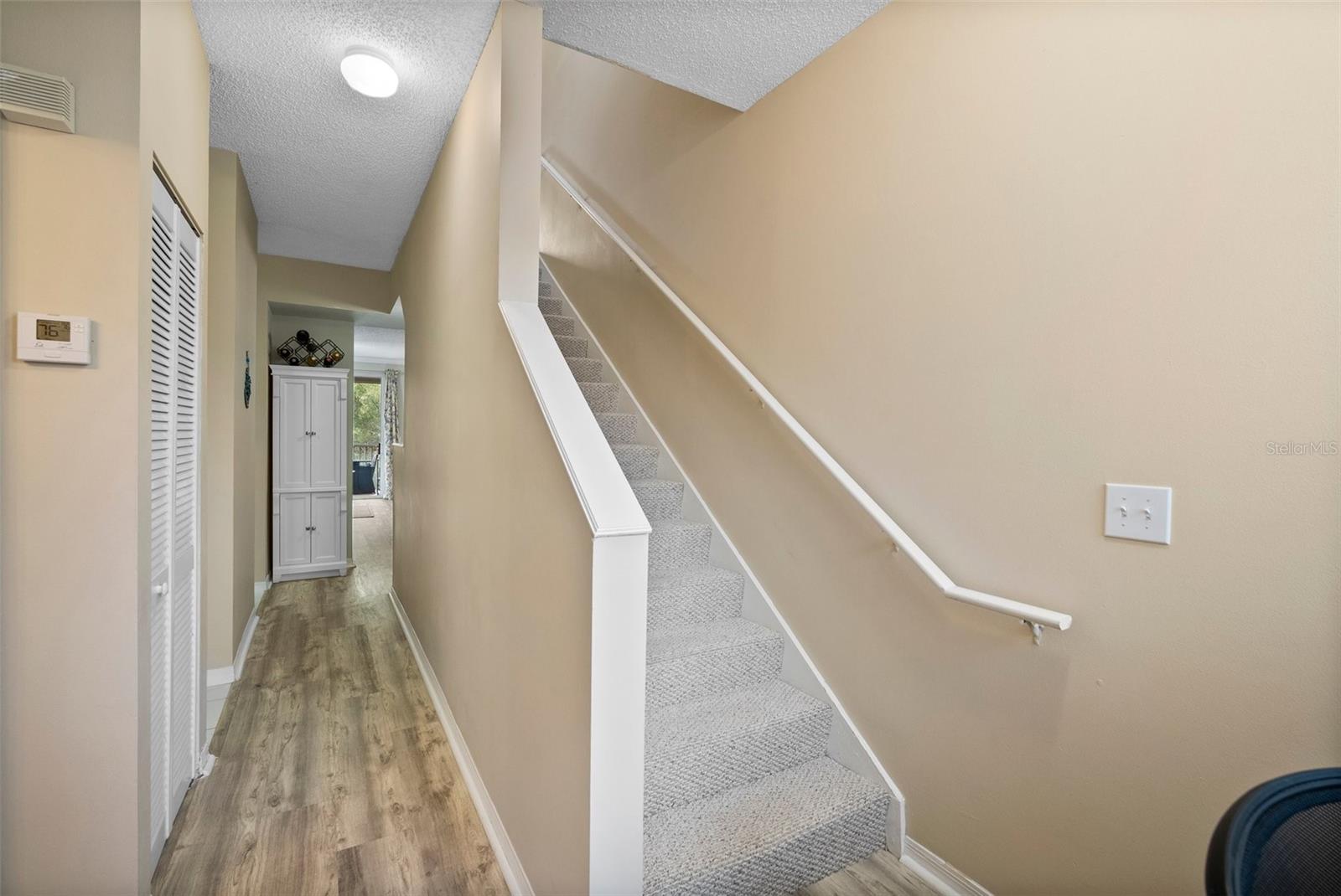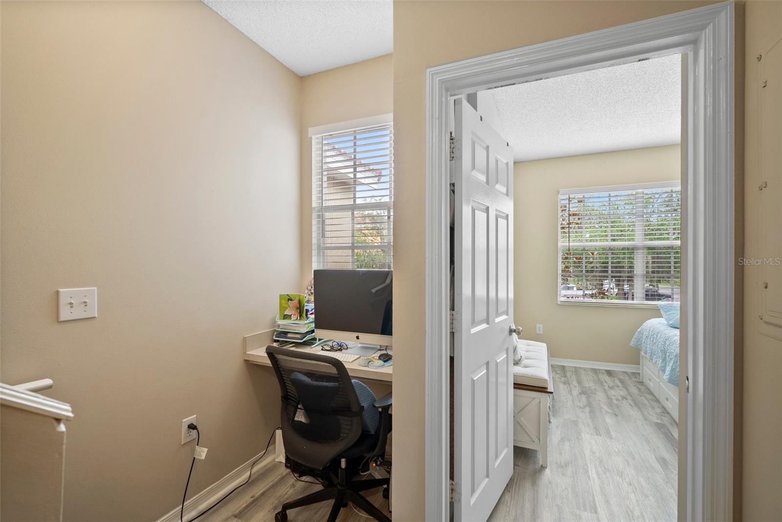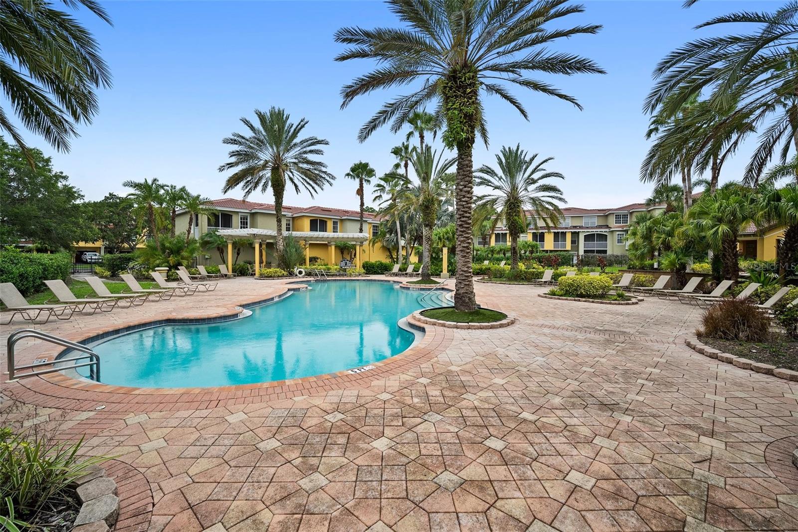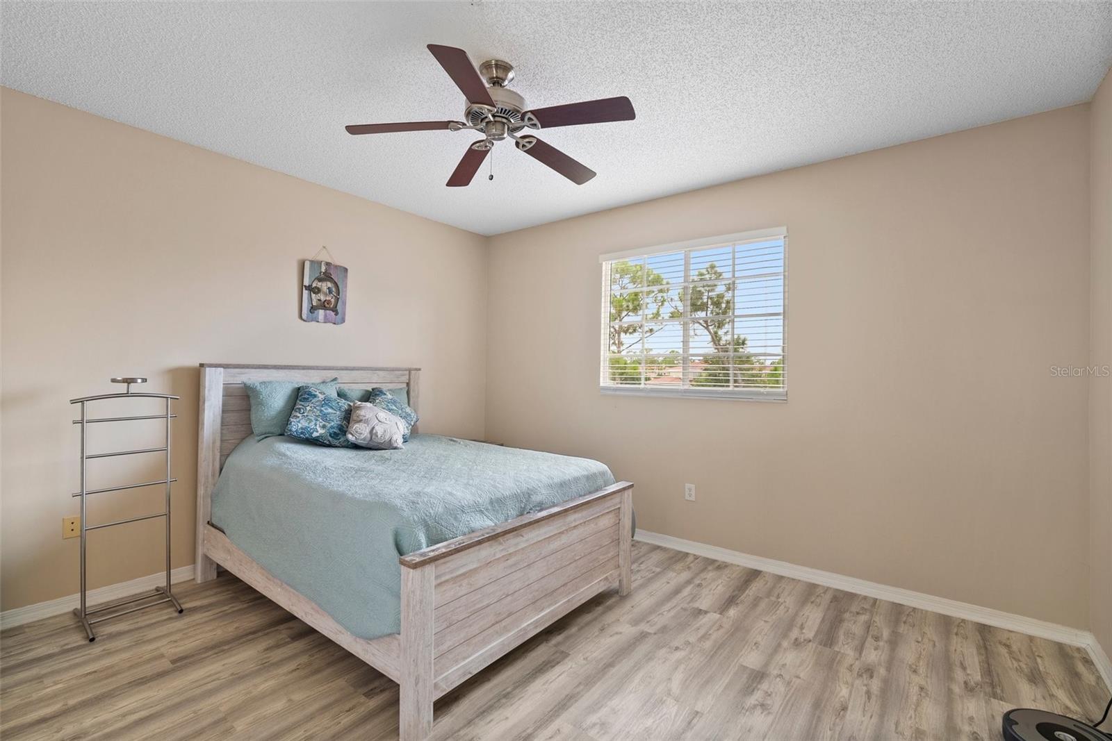 Welcome to resort style living! This two bedroom, two bath home offers comfort and convenience. The entry vestibule features direct access from your own private one-car garage with extra storage space. Up one flight of stairs, a great room with crown molding and luxury vinyl plank opens to a screened veranda with a view of the pond, fountain, and tranquil nature preserve. Luxury vinyl plank extends throughout the home with ceramic tile in the kitchen and bathrooms. The kitchen bar counter opens to the dining room, a shared space with the living room, great for social gathering. The kitchen adorns granite countertops, freshly painted cabinets, stainless steel appliances including a double oven. Down the hall is the second bedroom, full guest bath with an updated vanity, and a computer niche. Up stairs is the primary bedroom, en-suite bath that has updated vanities, and walk-in closet. Roof was recently replaced. AC and water heater are 2022. Washer and dryer located on the third floor are also 2022. Located across the parking lot is one of the two clubhouses that feature resort style pool, spa, exercise rooms, and outdoor grill. Las Palmas extensive park like site is adjacent to the Olympic world rowing and recreation park (Benderson) and close to University Town Center. Numerous restaurants and two upscale grocery stores are close at hand.
