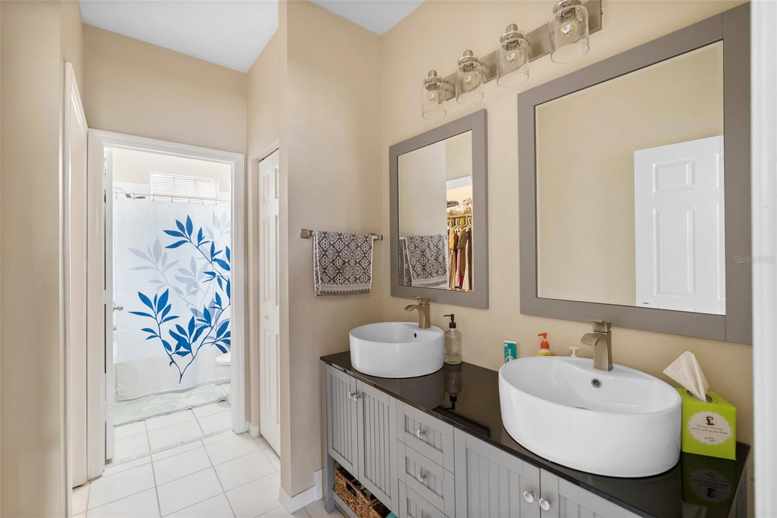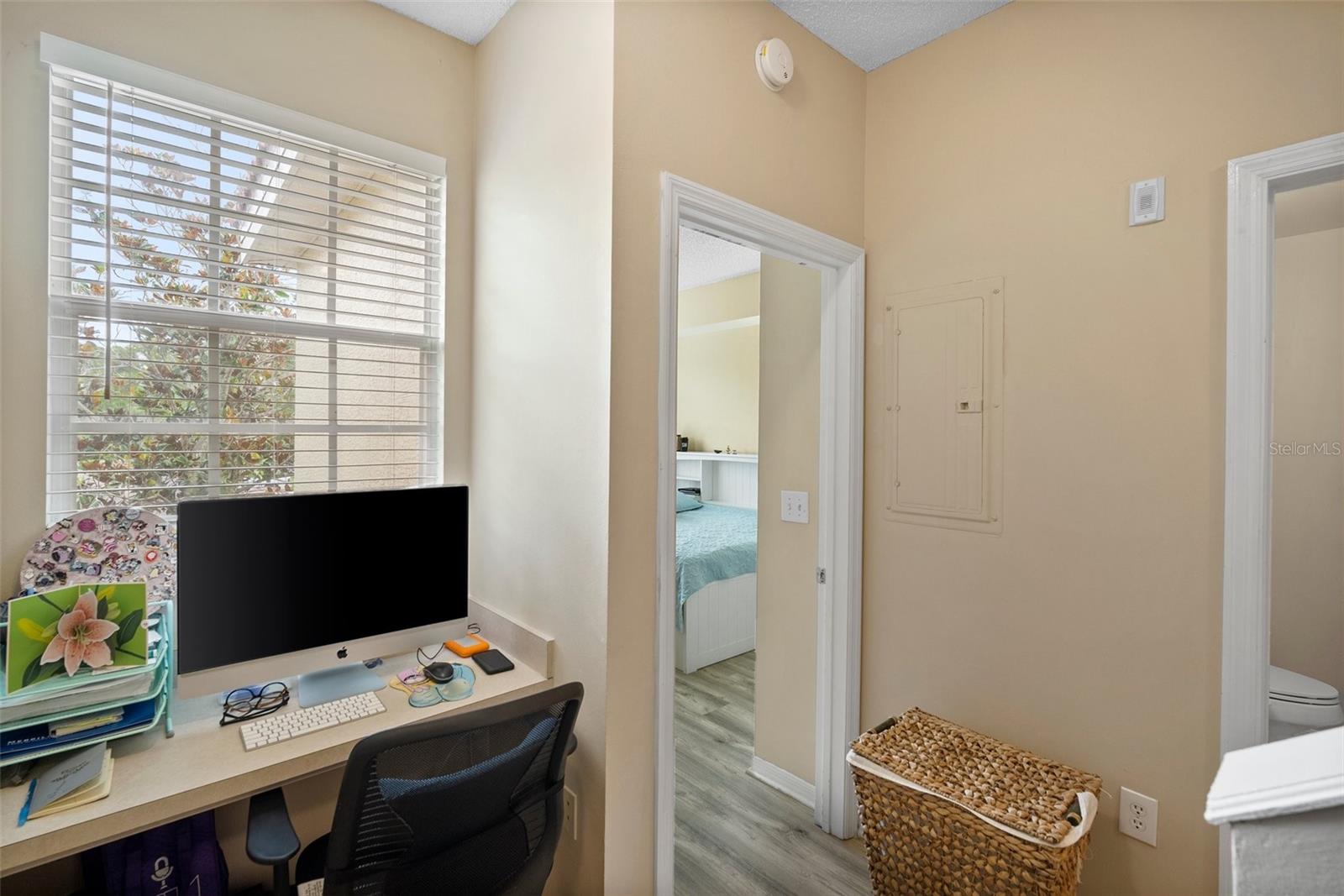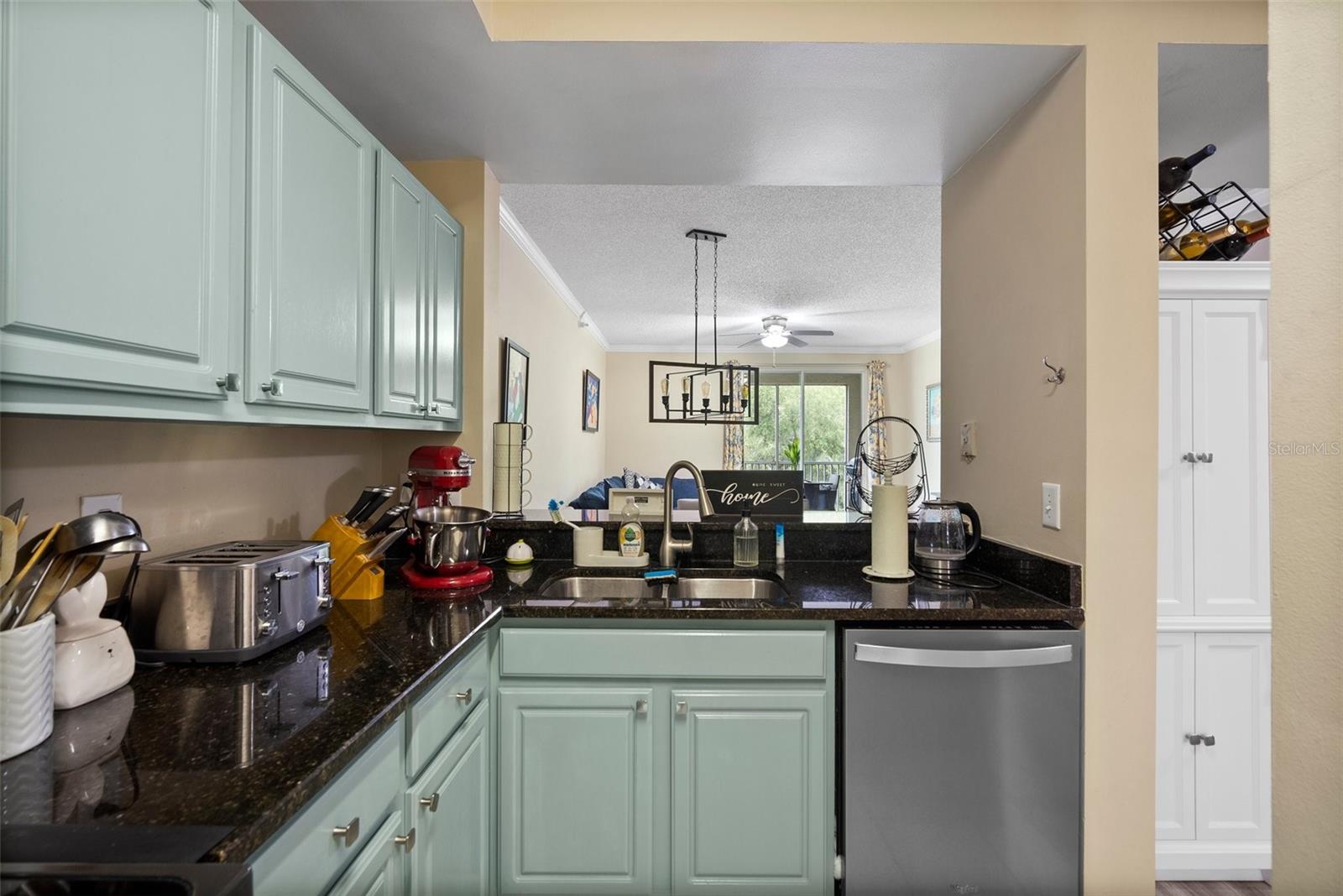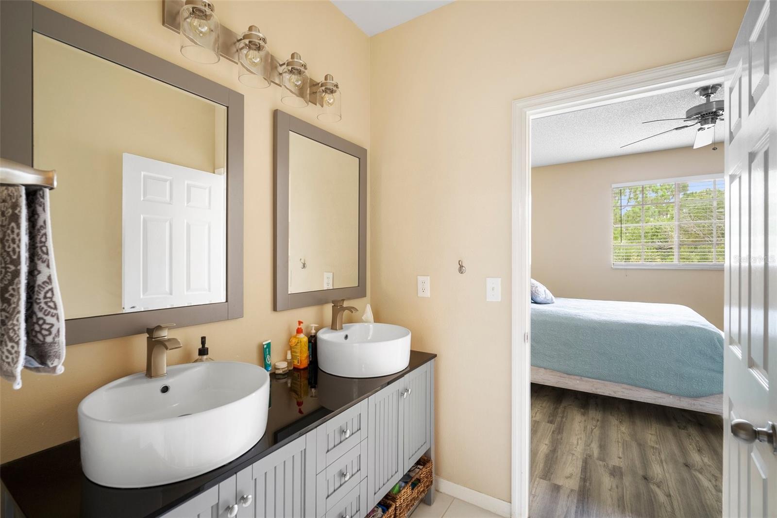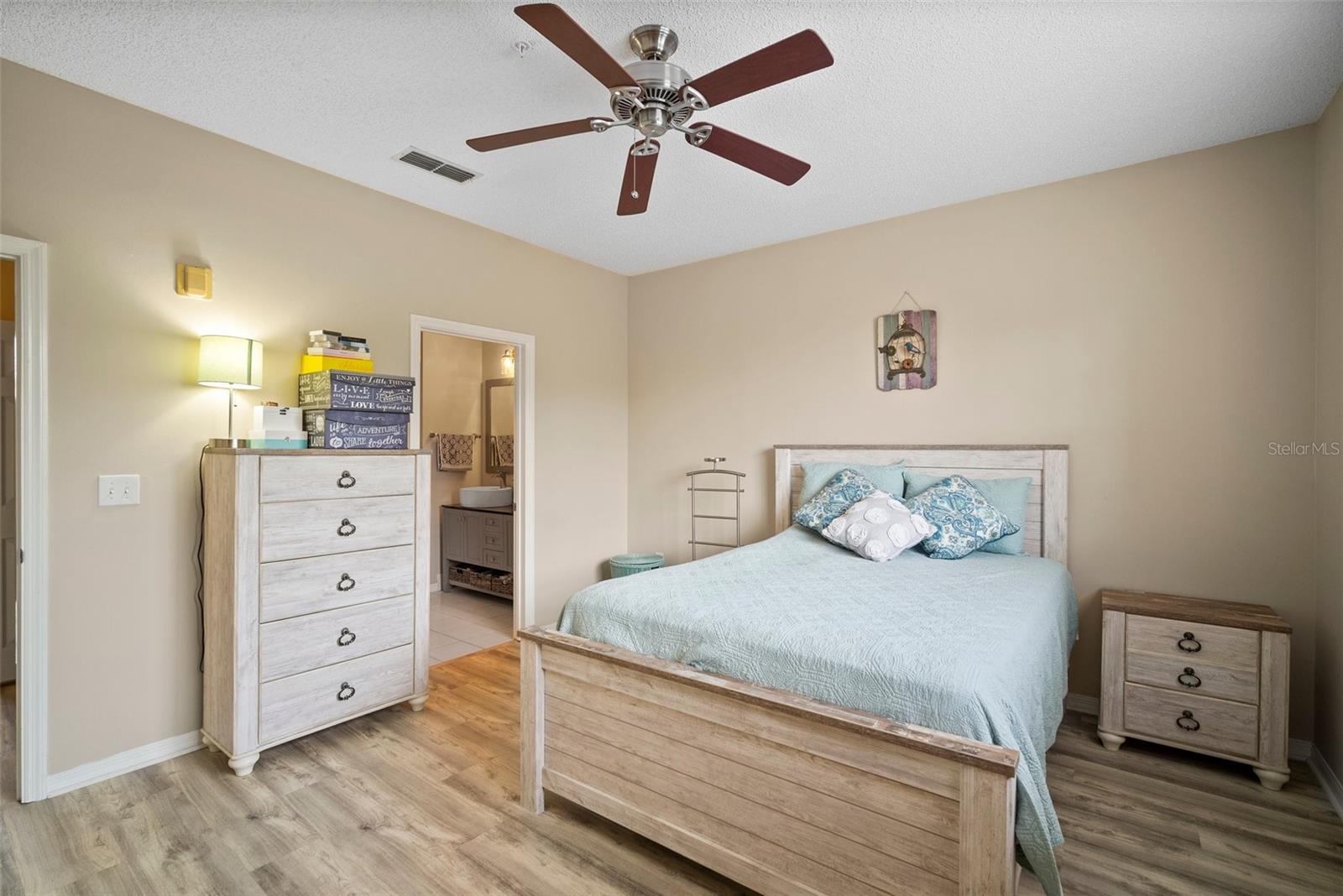 Welcome to resort style living! This two bedroom, two bath home offers comfort and convenience. The entry vestibule features direct access from your own private one-car garage with extra storage space. Up one flight of stairs, a great room with crown molding and luxury vinyl plank opens to a screened veranda with a view of the pond, fountain, and tranquil nature preserve. Luxury vinyl plank extends throughout the home with ceramic tile in the kitchen and bathrooms. The kitchen bar counter opens to the dining room, a shared space with the living room, great for social gathering. The kitchen adorns granite countertops, freshly painted cabinets, stainless steel appliances including a double oven. Down the hall is the second bedroom, full guest bath with an updated vanity, and a computer niche. Up stairs is the primary bedroom, en-suite bath that has updated vanities, and walk-in closet. Roof was recently replaced. AC and water heater are 2022. Washer and dryer located on the third floor are also 2022. Located across the parking lot is one of the two clubhouses that feature resort style pool, spa, exercise rooms, and outdoor grill. Las Palmas extensive park like site is adjacent to the Olympic world rowing and recreation park (Benderson) and close to University Town Center. Numerous restaurants and two upscale grocery stores are close at hand.