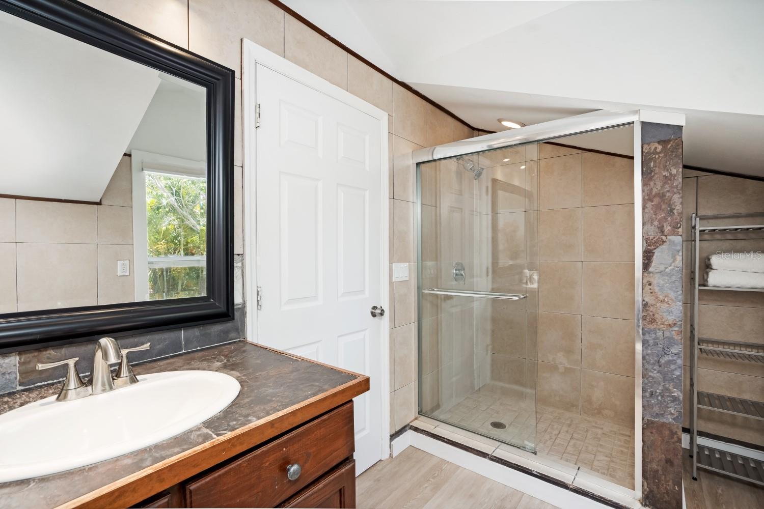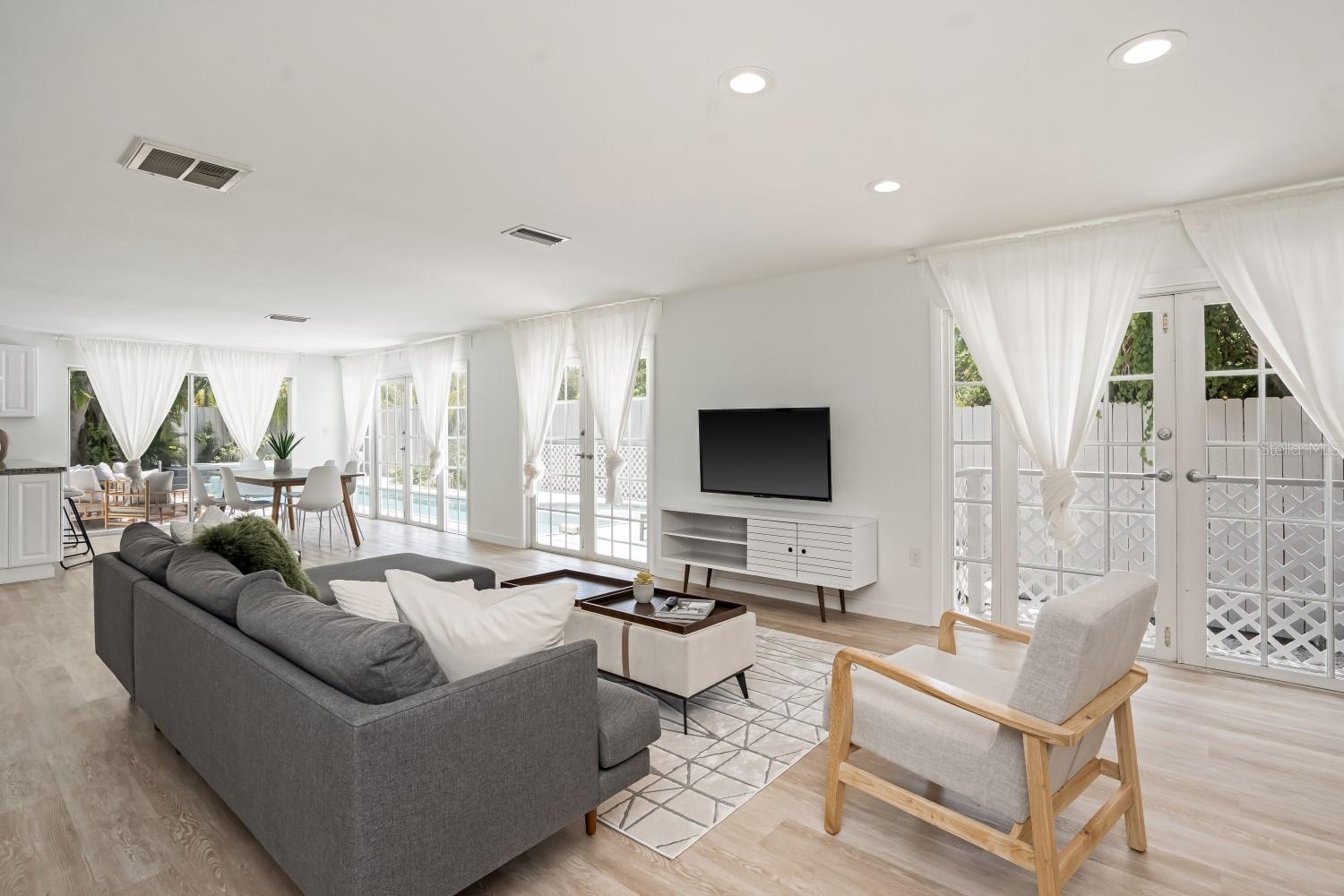 Expansive Coastal Modern Property in a Serene and Peaceful Setting, Seconds to Siesta Key Beach ** 4 Bedrooms, 4 Full Baths with Detached Studio/ADU above the 3 Car Garage (5 Total Bedrooms, 5 Bathrooms) ** Gorgeous Pool among Lush Native Landscape ** There is no better value on Siesta Key for your primary occupancy or 2nd home with opportunities to cash flow this investment. The entire property has been updated with wood-looking vinyl, interior/exterior paint, custom baseboard and trim, contemporary lighting fixtures, modern fans and fresh marcite in the refinished pool. The studio provides new vinyl windows and a mini-split AC unit for energy efficient climate controlling of this private space. You will love the floor plan of both the main house and studio! The main house provides a great room concept with an abundance of joyful natural light and multiple sets of French doors leading to the pool. Each bedroom receives a private bath with 2 primary suites enjoying idyllic views of the pool and tropical landscape. Simply stated, this estate property is meant for hosting large groups, comfortably. Located inside the charming Canopy Roads of Twin Oak, this beach property is private, serene and inspiring. Live by the beach, but away from the noise. The good life is found here