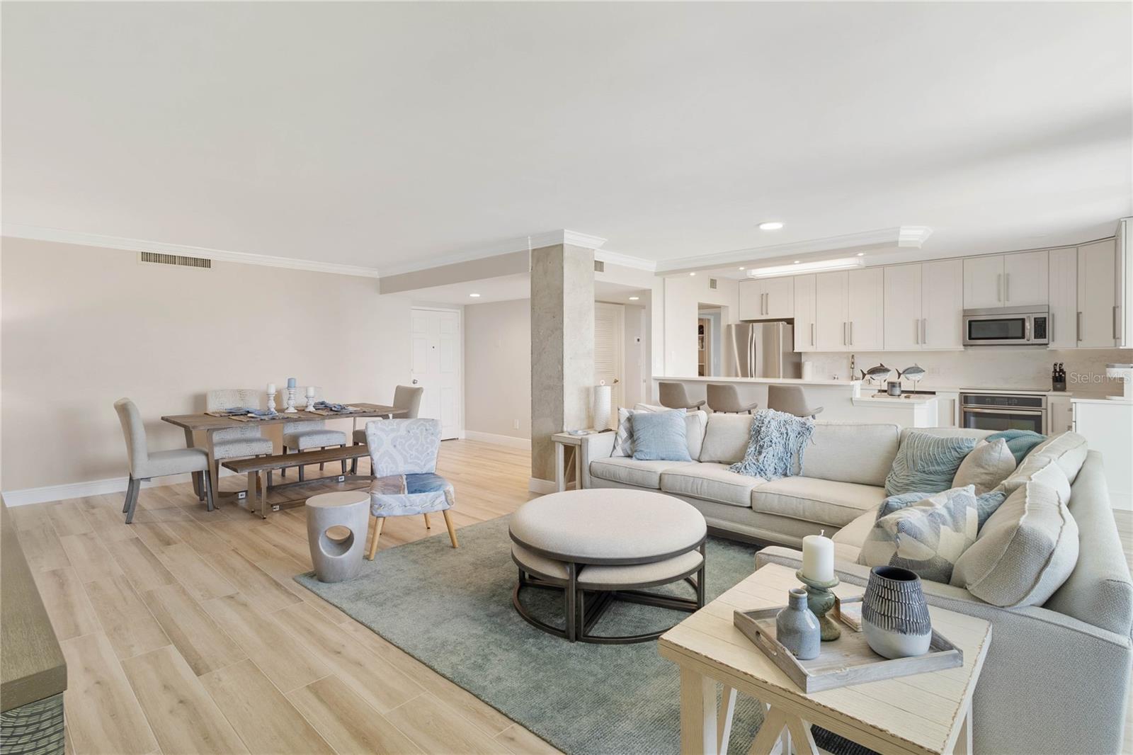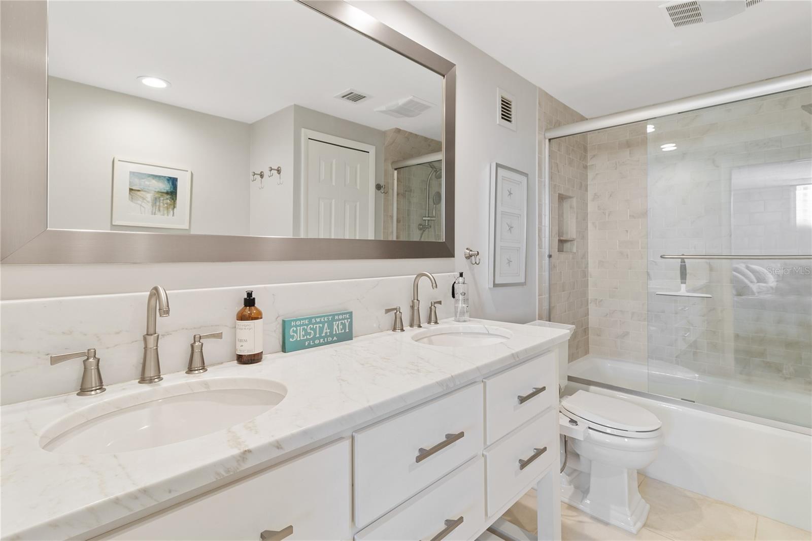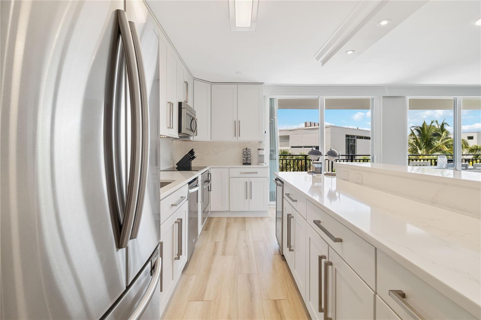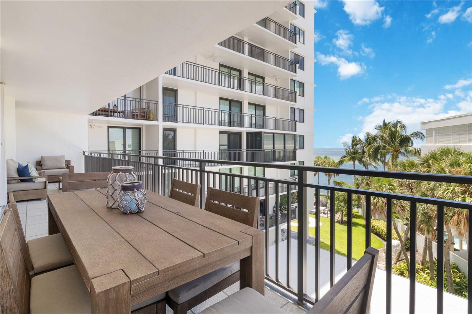 Welcome to your new home, a meticulously crafted TURNKEY 2 BED 2 BATH condo nestled in the newly renovated Siesta Towers. SELLER OVERING TO PAY 1ST 6 MONTHS OF CONDO FEES FOR AN ACCEPTED OFFER. Positioned along "THE BIG PASS," where the Gulf's azure waters meet the intercoastal, this residence offers a seamless blend of luxury and coastal living. Step inside to discover a light-filled open concept design that showcases breathtaking views from every room. Recently upgraded, this condo features stunning soundproof tile floors throughout, a spacious renovated balcony with outdoor furnishings, and a sleek modern kitchen boasting new countertops, soft-close custom cabinetry, stainless steel appliances, a wine cooler, and accent lighting. Both master bedrooms are adorned with automated blinds and boast upgraded ensuites complete with dual sinks, European toilets, and stylish finishes. The unit comes fully furnished with designer pieces, ensuring comfort and elegance at every turn. Residents will enjoy the convenience of a dedicated storage space in a secure community-shared area located off the main lobby. Siesta Towers offers upgraded amenities including a newly designed 9 ft main pool, bicycle storage room, community room for gatherings, and a state-of-the-art fitness center nearing completion. For outdoor enthusiasts, there's a tackle and fishing room available, along with access to a shared private dock perfect for fishing lovers. Property is also Miami Dade Compliant! A quick stroll through Siesta Village leads to Siesta Beach, renowned for its white sands, while nearby restaurants, shops, bars, and vibrant nightlife ensure endless entertainment options. Don't miss this rare opportunity to own at Siesta Towers. Unit 4D promises a lifetime of enjoyment, spectacular sunsets, and cherished memories in one of Siesta Key's most desirable locations.