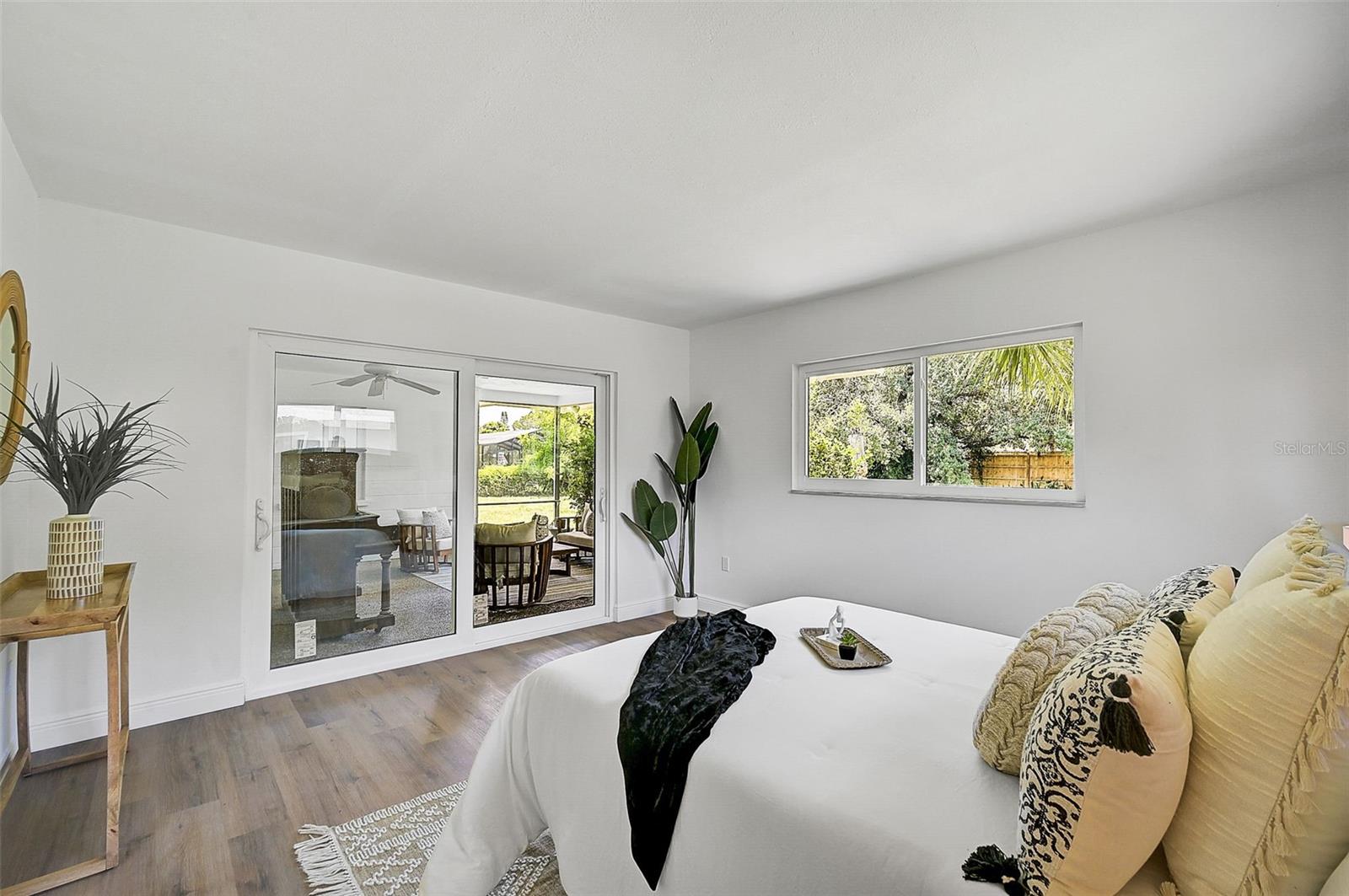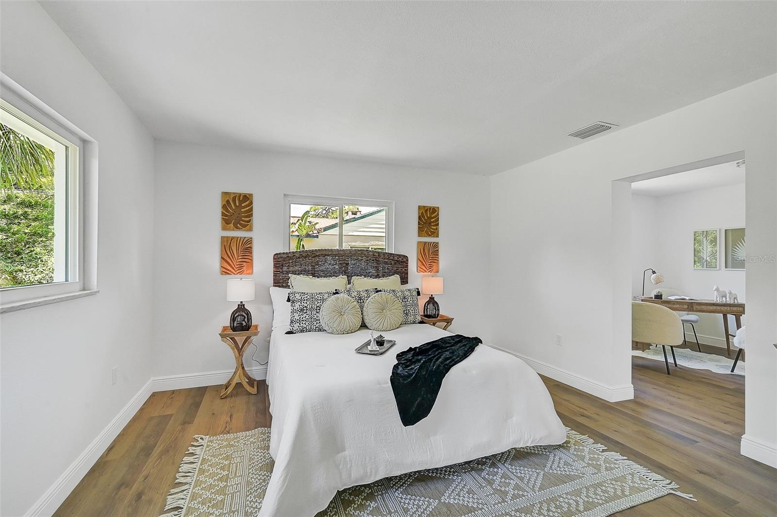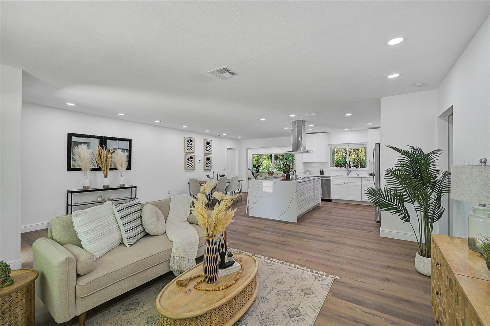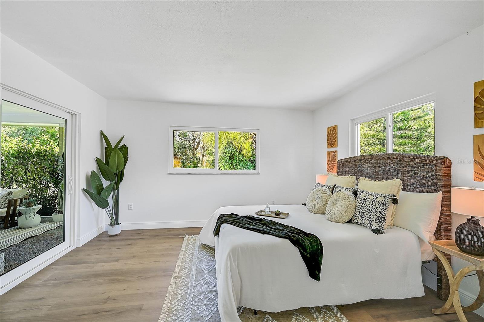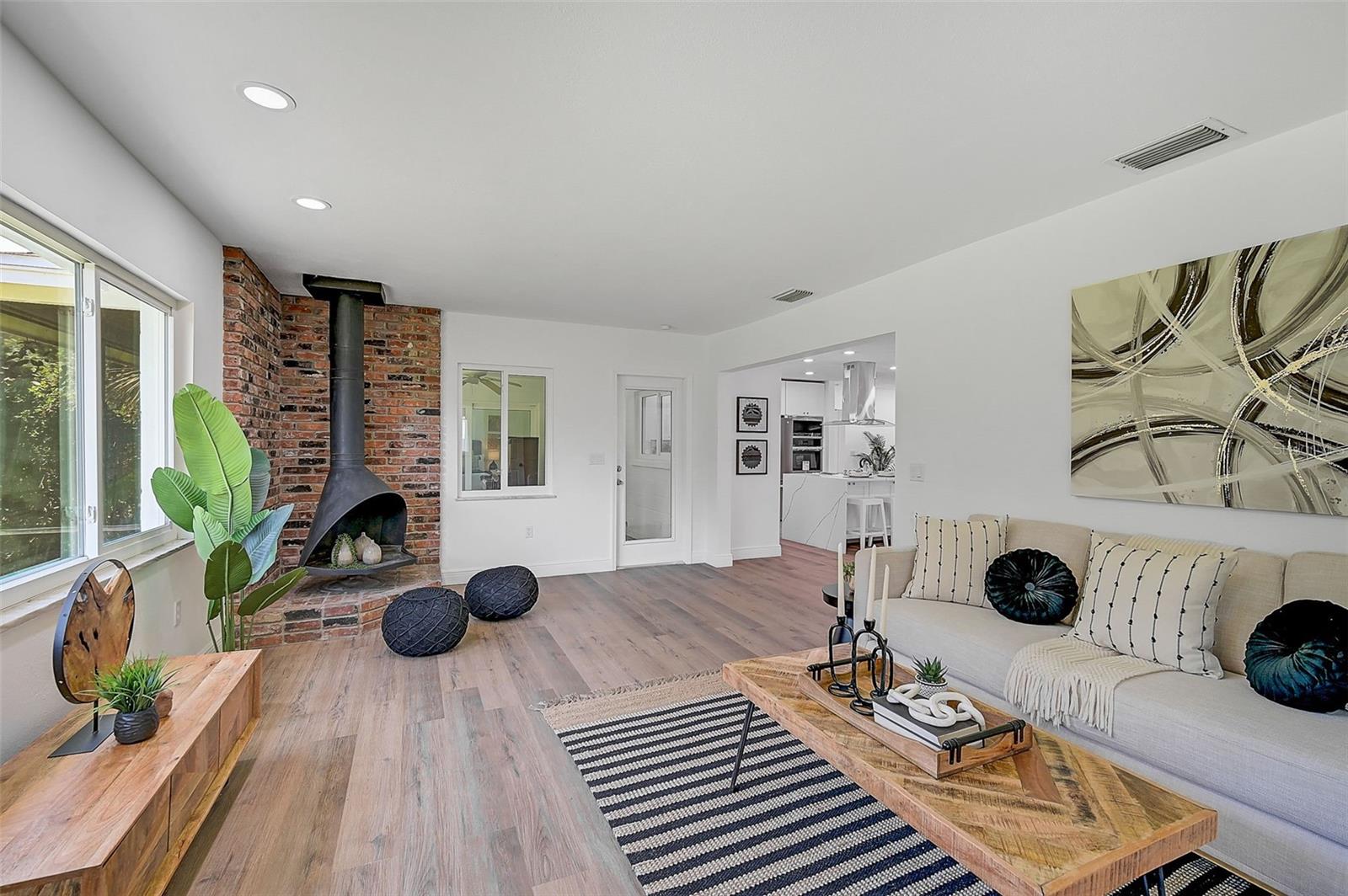 LOCATION, LOCATION, LOCATION! West of the Trail on a low-traffic street, this prime location offers beautiful water views from your own front yard! Just minutes to SRQ Airport, Ringling Museum, Bayfront, Downtown Sarasota, Beloved Beaches and more, you can enjoy all that Sarasota has to offer. Each bedroom features en-suite bathrooms with a powder bath as well off the kitchen. The Primary suite features an office/den/sitting area adjacent to as well as sliders going to the patio and oversized backyard. The second bedroom offers a nice layout with walk-in shower. Towards the back of the home there is the 3rd bedroom which could be a fantastic guest quarters or in-law suite as there is private entrance. This home has undergone a complete transformation with a newer roof (2021), a brand-new AC system, and a comprehensive renovation throughout the interior. Step inside to discover a bright, open layout that seamlessly unites the living spaces, illuminated by large hurricane impact windows and glass sliders that invite natural light at every turn. The heart of this home is undoubtedly the beautiful modern kitchen! The kitchen features a large center island with waterfall edge, built-in stovetop/vented hood, surrounded by brand new stainless steel appliances, a built-in oven, quartz countertops, tile backsplash, and an abundance of cabinet/counter space. Every detail, from the recessed lighting throughout to the luxury vinyl flooring has been meticulously selected for both style and durability. Inside there is a family room and generously sized living room, complete with a cozy brick surround fireplace. Great for relaxing evenings at home or hosting friends and family. Step outside to the covered lanai and enjoy the spacious yard, offering plenty of room for outdoor activities and entertaining. Plenty of room for a pool if one desires! A wonderful option as a primary home, vacation home or investment property as it is a Sarasota address but located in Manatee County where you can Airbnb. Don't miss the opportunity to see this beautiful property where luxury meets convenience in a location that's hard to beat. Reach out today to schedule a viewing!