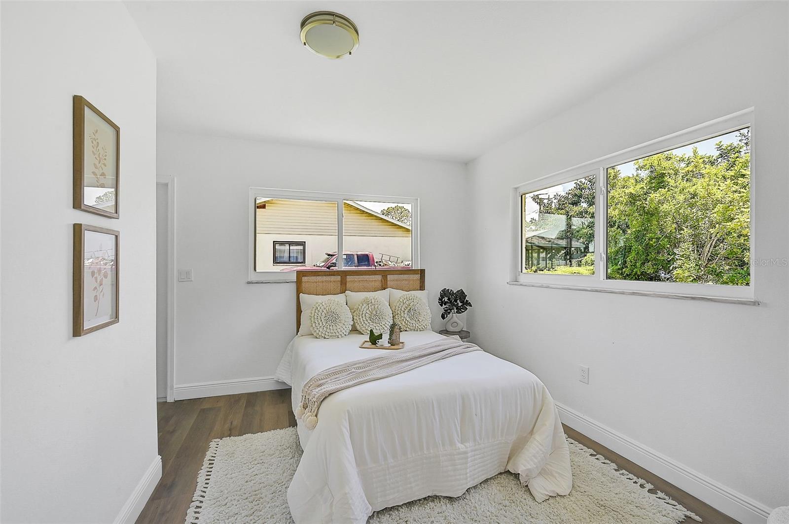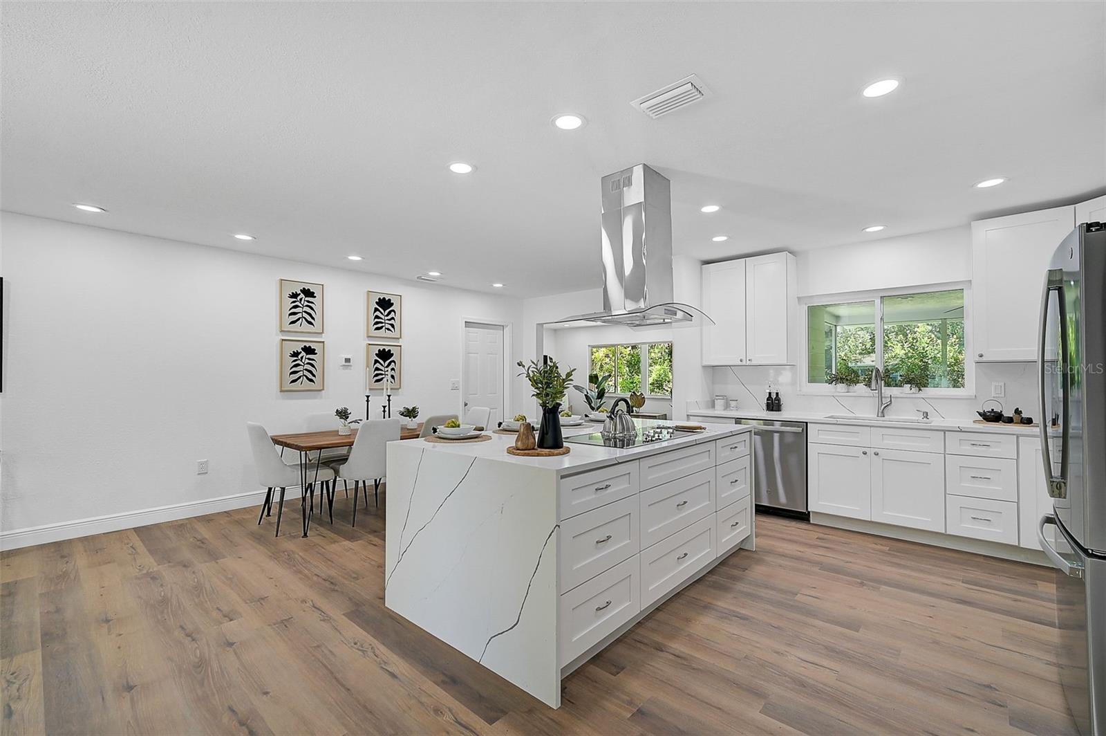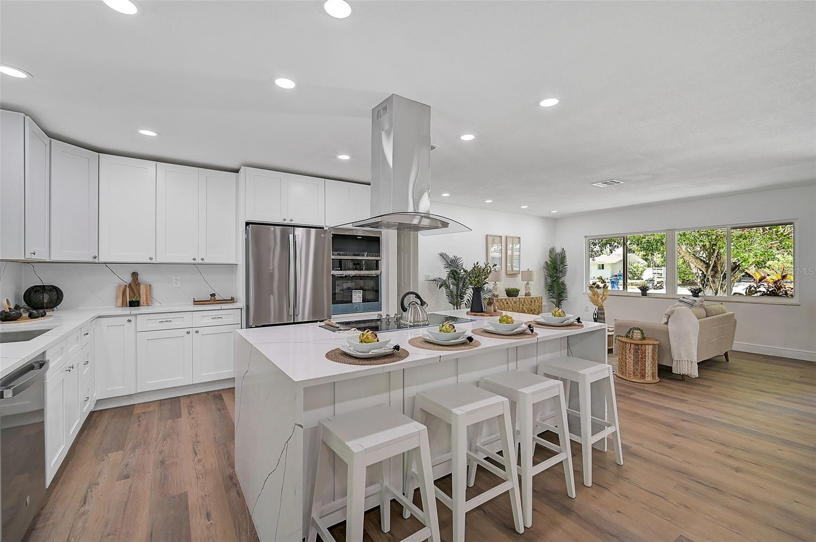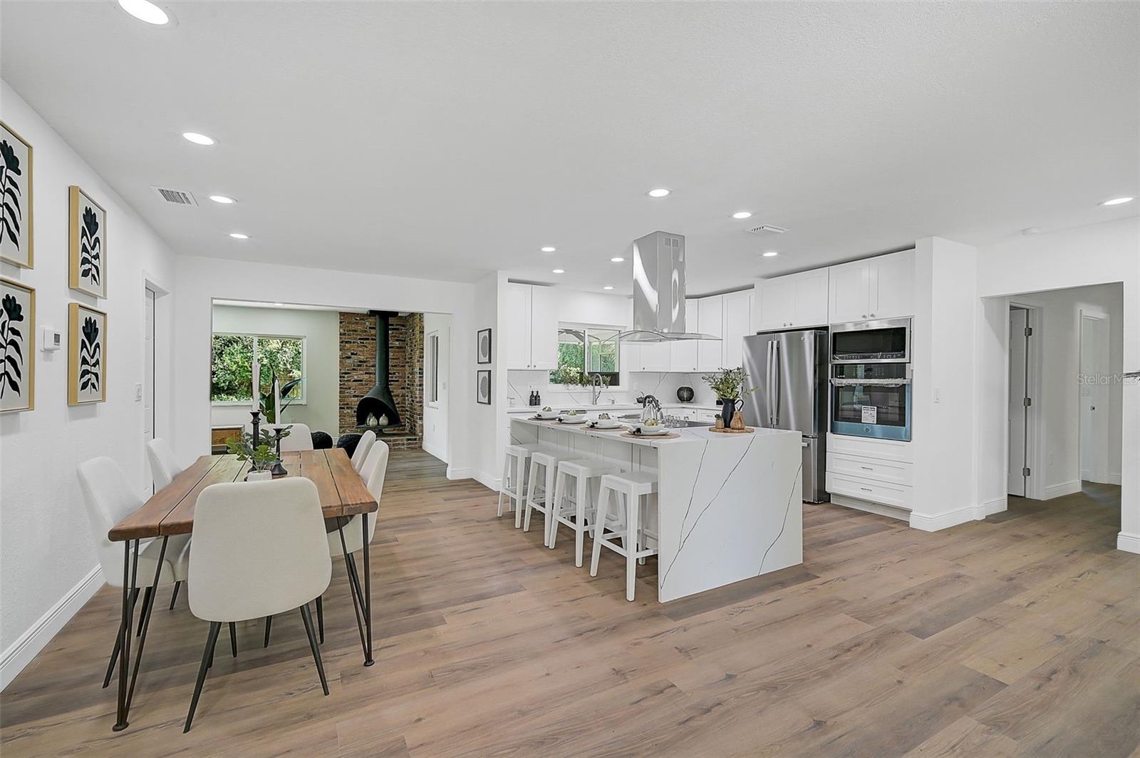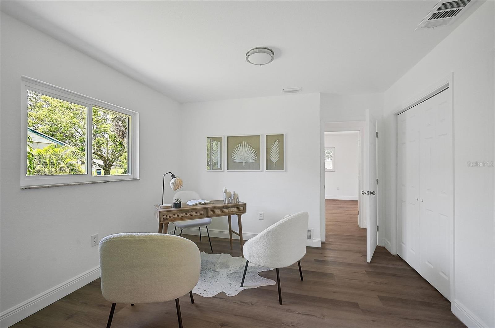 LOCATION, LOCATION, LOCATION! West of the Trail on a low-traffic street, this prime location offers beautiful water views from your own front yard! Just minutes to SRQ Airport, Ringling Museum, Bayfront, Downtown Sarasota, Beloved Beaches and more, you can enjoy all that Sarasota has to offer. Each bedroom features en-suite bathrooms with a powder bath as well off the kitchen. The Primary suite features an office/den/sitting area adjacent to as well as sliders going to the patio and oversized backyard. The second bedroom offers a nice layout with walk-in shower. Towards the back of the home there is the 3rd bedroom which could be a fantastic guest quarters or in-law suite as there is private entrance. This home has undergone a complete transformation with a newer roof (2021), a brand-new AC system, and a comprehensive renovation throughout the interior. Step inside to discover a bright, open layout that seamlessly unites the living spaces, illuminated by large hurricane impact windows and glass sliders that invite natural light at every turn. The heart of this home is undoubtedly the beautiful modern kitchen! The kitchen features a large center island with waterfall edge, built-in stovetop/vented hood, surrounded by brand new stainless steel appliances, a built-in oven, quartz countertops, tile backsplash, and an abundance of cabinet/counter space. Every detail, from the recessed lighting throughout to the luxury vinyl flooring has been meticulously selected for both style and durability. Inside there is a family room and generously sized living room, complete with a cozy brick surround fireplace. Great for relaxing evenings at home or hosting friends and family. Step outside to the covered lanai and enjoy the spacious yard, offering plenty of room for outdoor activities and entertaining. Plenty of room for a pool if one desires! A wonderful option as a primary home, vacation home or investment property as it is a Sarasota address but located in Manatee County where you can Airbnb. Don't miss the opportunity to see this beautiful property where luxury meets convenience in a location that's hard to beat. Reach out today to schedule a viewing!