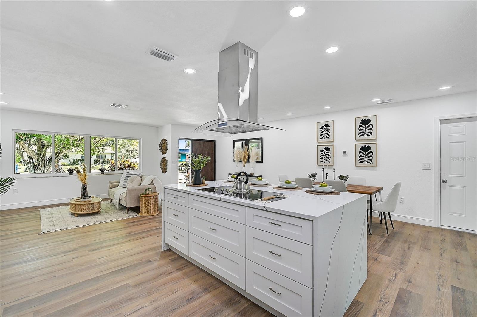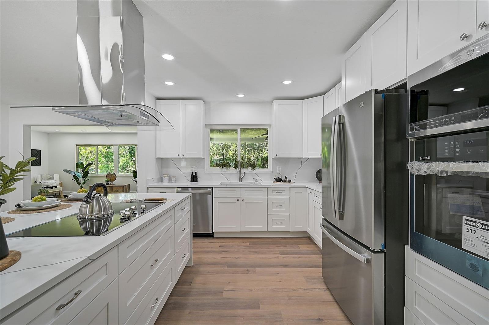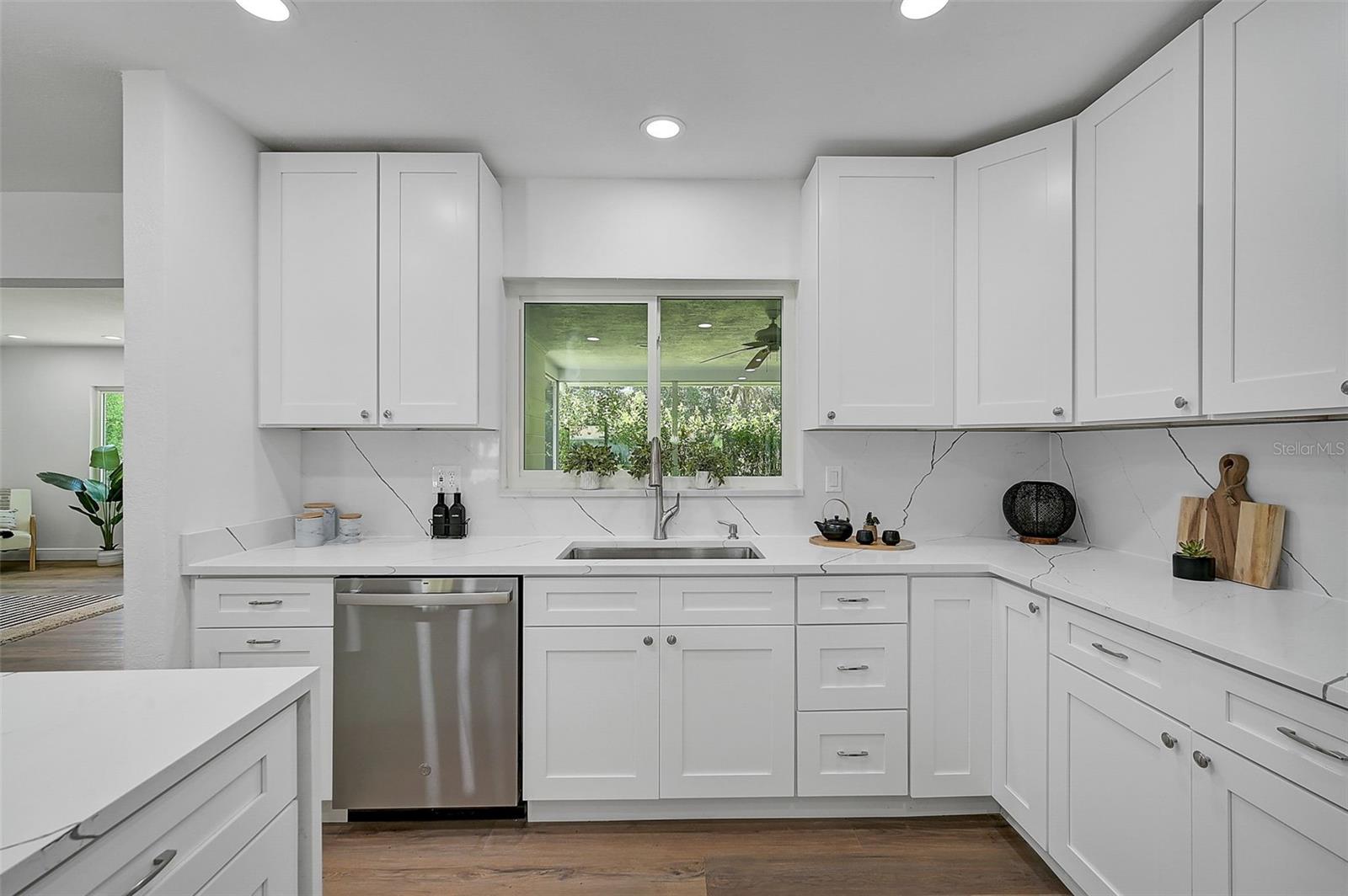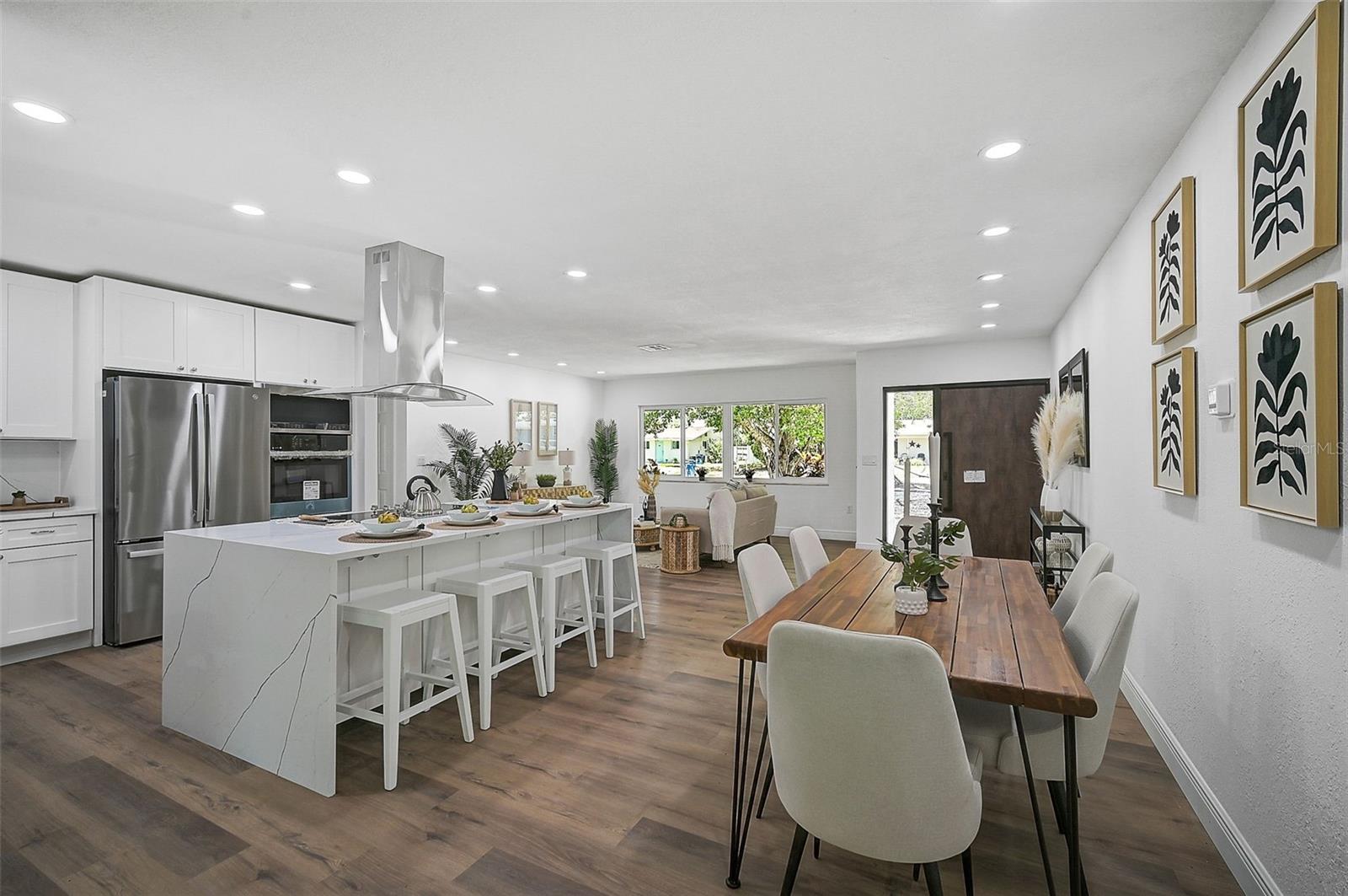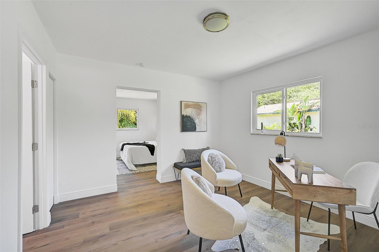 LOCATION, LOCATION, LOCATION! West of the Trail on a low-traffic street, this prime location offers beautiful water views from your own front yard! Just minutes to SRQ Airport, Ringling Museum, Bayfront, Downtown Sarasota, Beloved Beaches and more, you can enjoy all that Sarasota has to offer. Each bedroom features en-suite bathrooms with a powder bath as well off the kitchen. The Primary suite features an office/den/sitting area adjacent to as well as sliders going to the patio and oversized backyard. The second bedroom offers a nice layout with walk-in shower. Towards the back of the home there is the 3rd bedroom which could be a fantastic guest quarters or in-law suite as there is private entrance. This home has undergone a complete transformation with a newer roof (2021), a brand-new AC system, and a comprehensive renovation throughout the interior. Step inside to discover a bright, open layout that seamlessly unites the living spaces, illuminated by large hurricane impact windows and glass sliders that invite natural light at every turn. The heart of this home is undoubtedly the beautiful modern kitchen! The kitchen features a large center island with waterfall edge, built-in stovetop/vented hood, surrounded by brand new stainless steel appliances, a built-in oven, quartz countertops, tile backsplash, and an abundance of cabinet/counter space. Every detail, from the recessed lighting throughout to the luxury vinyl flooring has been meticulously selected for both style and durability. Inside there is a family room and generously sized living room, complete with a cozy brick surround fireplace. Great for relaxing evenings at home or hosting friends and family. Step outside to the covered lanai and enjoy the spacious yard, offering plenty of room for outdoor activities and entertaining. Plenty of room for a pool if one desires! A wonderful option as a primary home, vacation home or investment property as it is a Sarasota address but located in Manatee County where you can Airbnb. Don't miss the opportunity to see this beautiful property where luxury meets convenience in a location that's hard to beat. Reach out today to schedule a viewing!