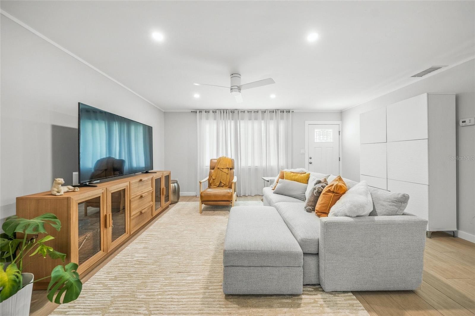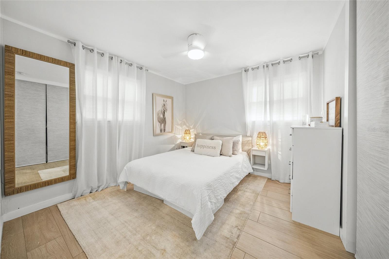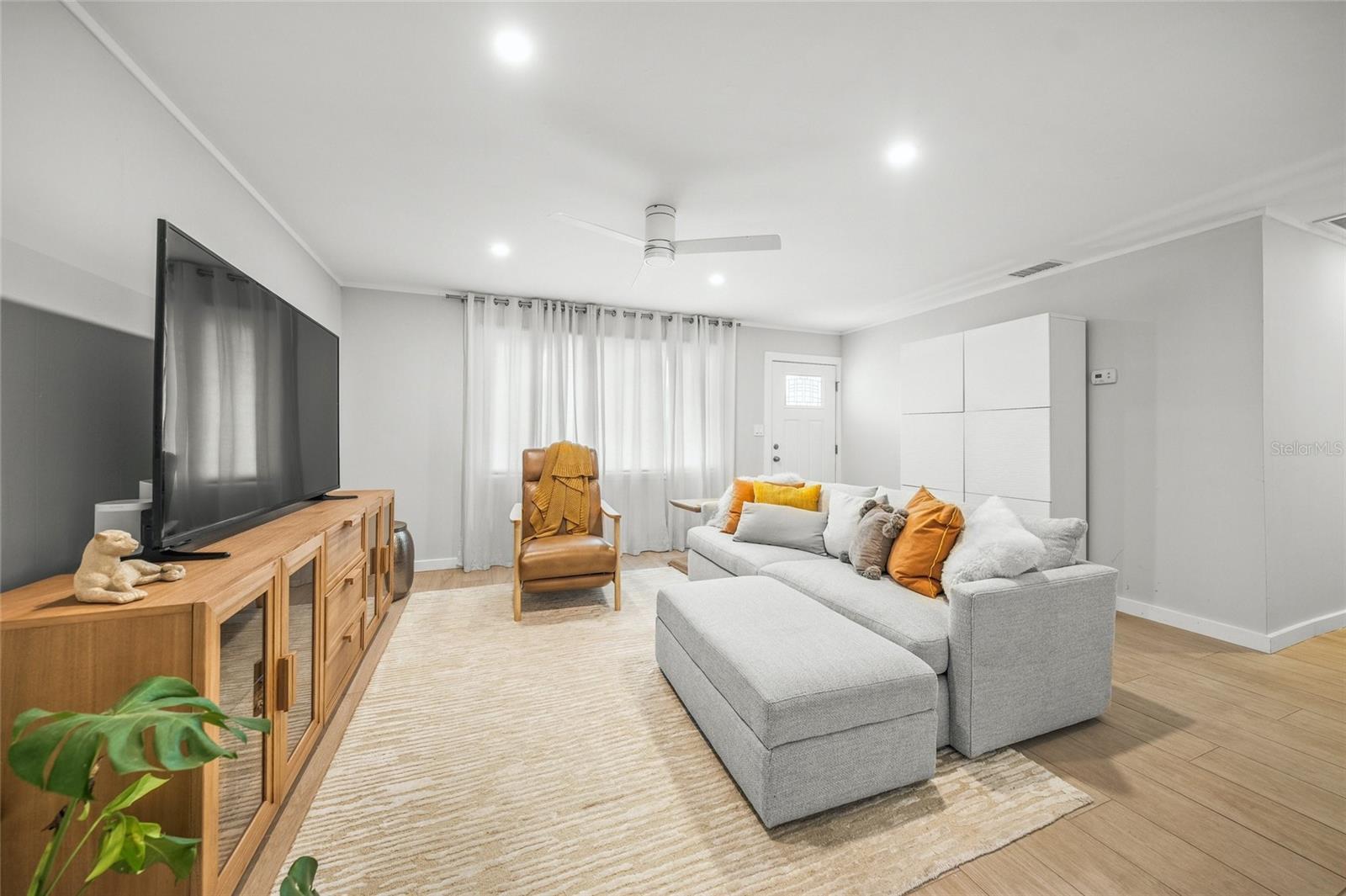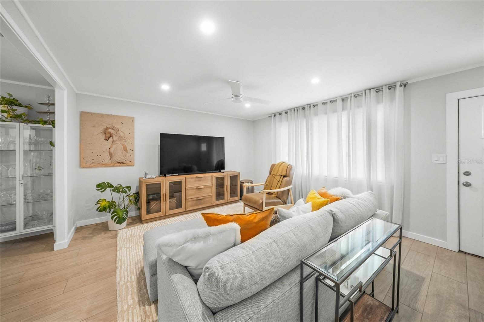 Welcome to your dream home, a fully renovated luxury oasis designed for modern living. This exquisite property showcases meticulous craftsmanship and top-tier upgrades throughout, offering the perfect blend of style and functionality. The spacious living room invites you to relax in comfort with a neutral palette, featuring plush furnishings and an abundance of natural light streaming through hurricane-grade windows. The newly designed kitchen is a chef's delight, boasting high-end stainless steel appliances, custom cabinetry, elegant countertops, and a new sink with updated plumbing. An added pantry provides ample storage for all your culinary needs. Experience tranquility in the master bedroom, complete with a walk-in closet and a lavish en-suite bathroom. The second bathroom has been artfully gutted and remodeled to provide a spa-like retreat, featuring premium fixtures and finishes. Both bathrooms exude sophistication with floor-to-ceiling tile work and modern amenities, ensuring a serene start and end to your day. Elegant porcelain plank floors run throughout the home, enhancing its contemporary aesthetic and providing easy maintenance. The sunroom is a versatile space equipped with a specialty outlet for a sauna, perfect for unwinding after a long day. The exterior, painted one year ago, exudes curb appeal with its fresh, weather-resistant finish. The property is framed by a beautifully maintained fence, complete with a wide gate designed for boat or large vehicle access. A magnificent Heritage Oak tree provides shade and character to the backyard, carefully trimmed and fertilized to ensure its health and longevity. The spacious backyard offers a serene setting with lush greenery and ample space for outdoor activities and gatherings, complete with a modern outdoor setup. Enjoy peace of mind with an ultraviolet purification system integrated into the A/C, new ductwork, and a relocated split A/C system to maximize indoor space and efficiency. With new drain lines, water lines, and electric updates, this home ensures reliable and efficient operation for years to come. This property represents a rare opportunity to own a meticulously updated home with every modern convenience. Schedule your private tour today and experience the epitome of luxury living.