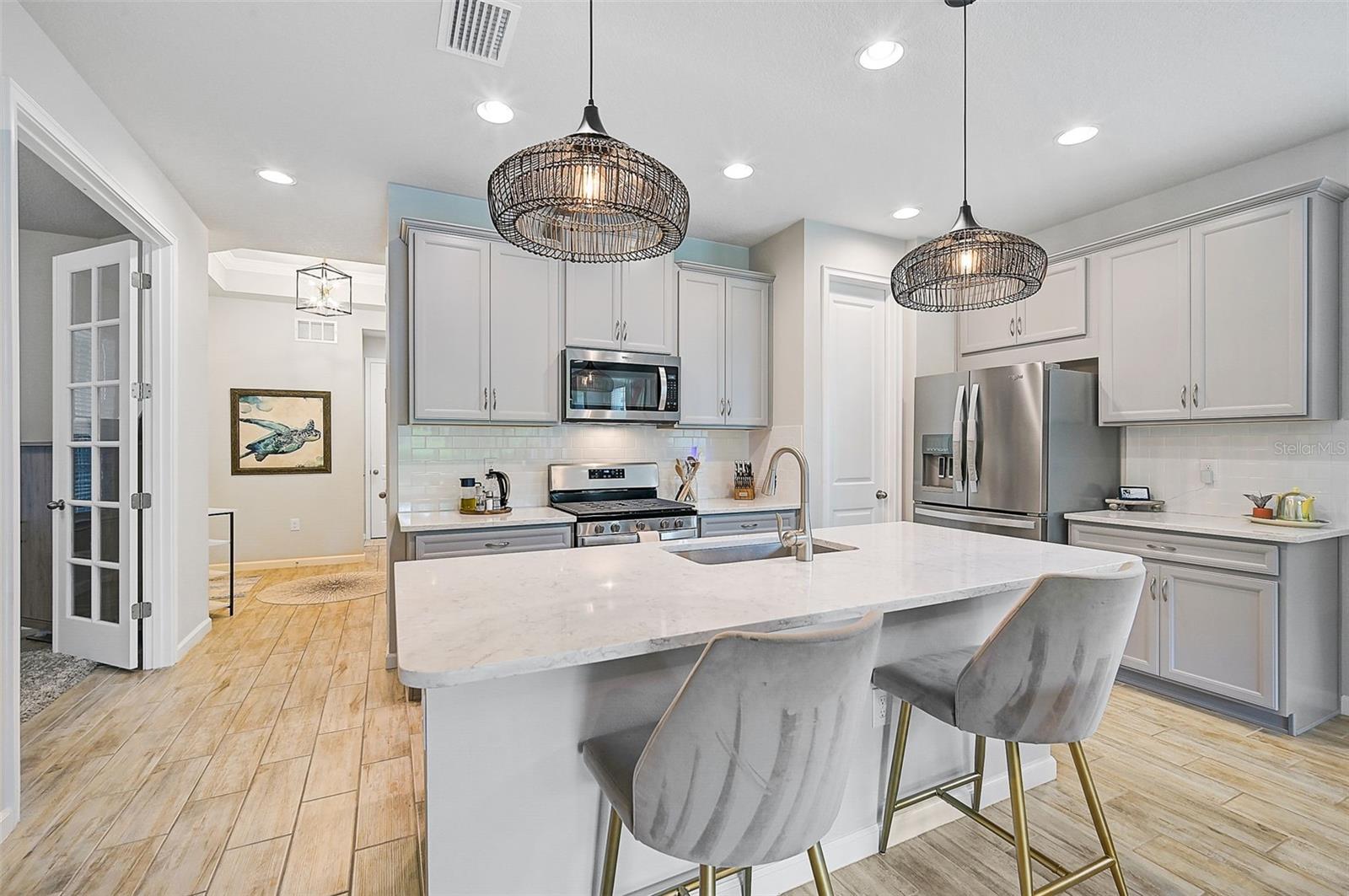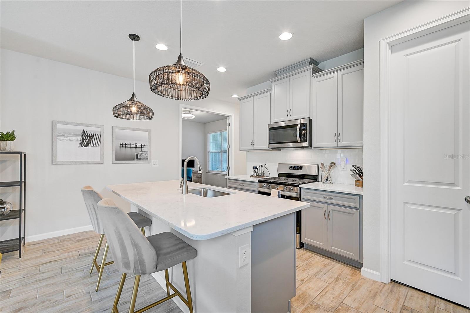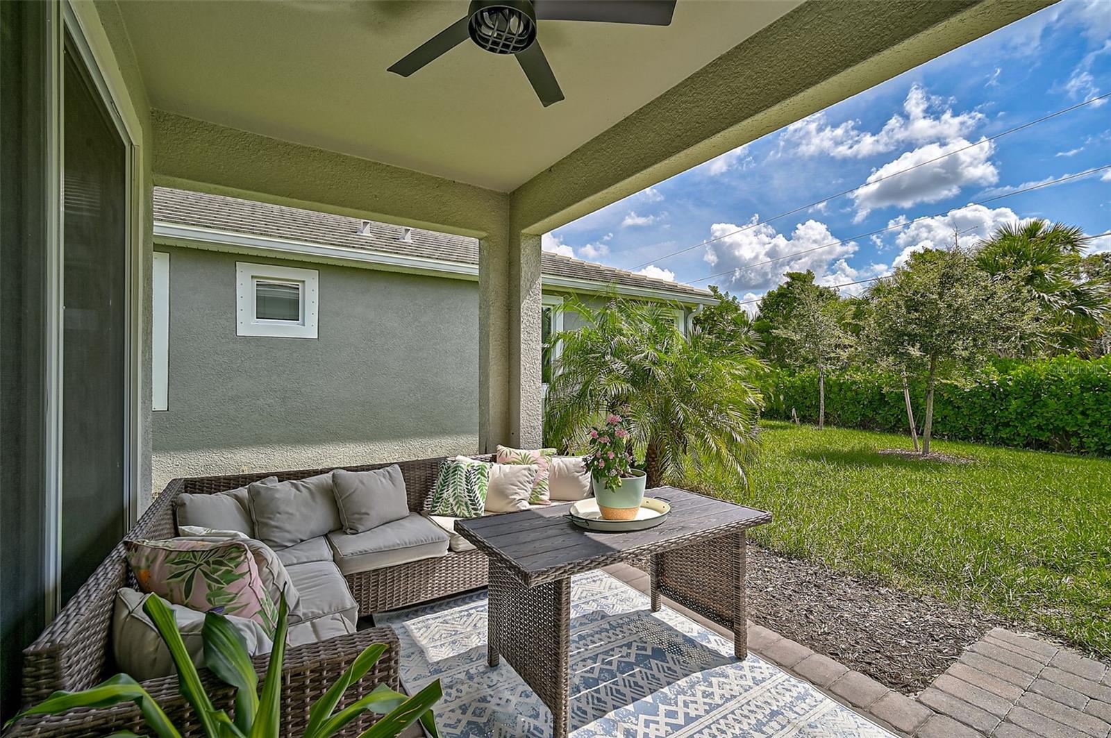 WELCOME TO YOUR NEW FLORIDA VILLA! Built in 2021 by Mattamy Homes, the popular Bayport model has 2 BEDROOMS, 2 BATHROOMS, +DEN and a 2 CAR GARAGE with an OPEN CONCEPT FLOOR PLAN! MOVE-IN READY NOW - NO NEED TO WAIT FOR NEW CONSTRUCTION! Sunrise Preserve, with NO CDD FEES, is an AMENITY RICH COMMUNITY with a beautiful clubhouse, heated community pool, hot tub, fitness center, tennis and pickleball courts, an ACTIVE SOCIAL CALENDAR, walking trails and more! PALMER RANCH IS ONE OF SARASOTA’S FAVORITE PLANNED COMMUNITIES with its proximity to the Gulf of Mexico, Siesta Key’s white sandy beaches, the Legacy Trail and easy access to “I-75”. Sunrise Preserve is in Ashton Elementary School, Sarasota Middle School, Riverview High School district with Pine View School just minutes away as well! Great curb appeal with a coastal vibe and lush landscaping is just what you’d hope to see in your Florida home! Entering the home is the foyer with a 10’ tray ceiling with crown molding and designer lighting. Your eyes will be immediately drawn to the OPEN CONCEPT living space and then beyond to the outdoor space and backyard. The flex room to the right has double 8’ French doors and could be used as an office, den, music or art room or even a third bedroom! Ceramic tile plank flooring throughout the main living areas of this home provides continuity. As you continue to the main living area – the OPEN CONCEPT DESIGN with a beautiful neutral color palette – includes the kitchen, living room and dining room space. The gourmet kitchen, with its timeless 42” shaker style cabinetry is a soft grey, light quartz countertops, clean white glass subway tile backsplash for the perfect subtle contrast, and an expansive island with seating for three and designer pendant lighting, is the heart of this home. Stainless appliances include your refrigerator with French doors, a refrigerated exterior drawer and a freezer drawer below, the dishwasher, sink, microwave oven and gas range. A walk-in pantry completes the kitchen. The living room with 9’ ceilings is open, spacious and has three 8’ sliding glass doors that open to the covered, paver lanai. Sellers have especially enjoyed the spaciousness and privacy of the lush, green backyard. Seclusion is offered in this split-bedroom layout. The ensuite primary bathroom has a dual sink vanity, a spacious walk-in shower with built-in bench seats, a linen closet and a very generous primary closet. The split floor plan offers you and your guests plenty of privacy with the 2nd bedroom and guest bathroom at the front of the home while the primary suite is at the back of the home. SOME FURNISHINGS AVAILABLE UNDER A SEPARATE BILL OF SALE. You’re going to love living in Sunrise Preserve, living the Florida Lifestyle and enjoying all that Sarasota & the Suncoast have to offer! DON’T WAIT – SCHEDULE A SHOWING & MAKE YOUR OFFER TODAY!