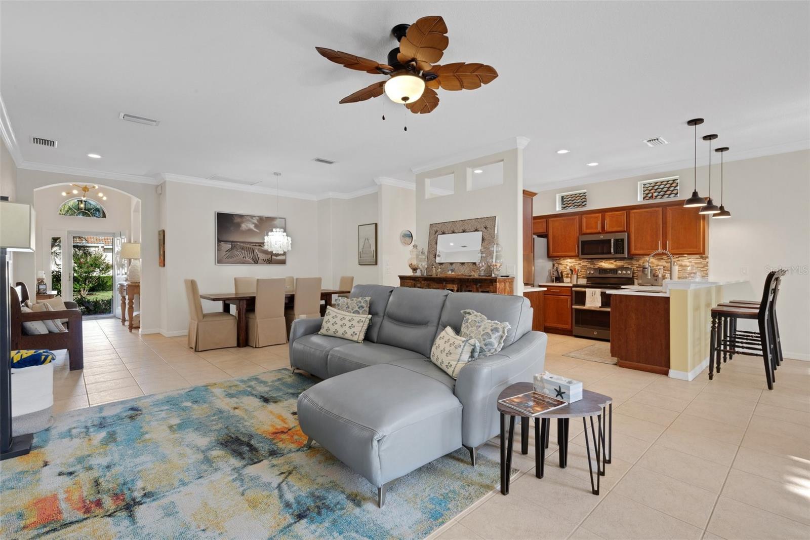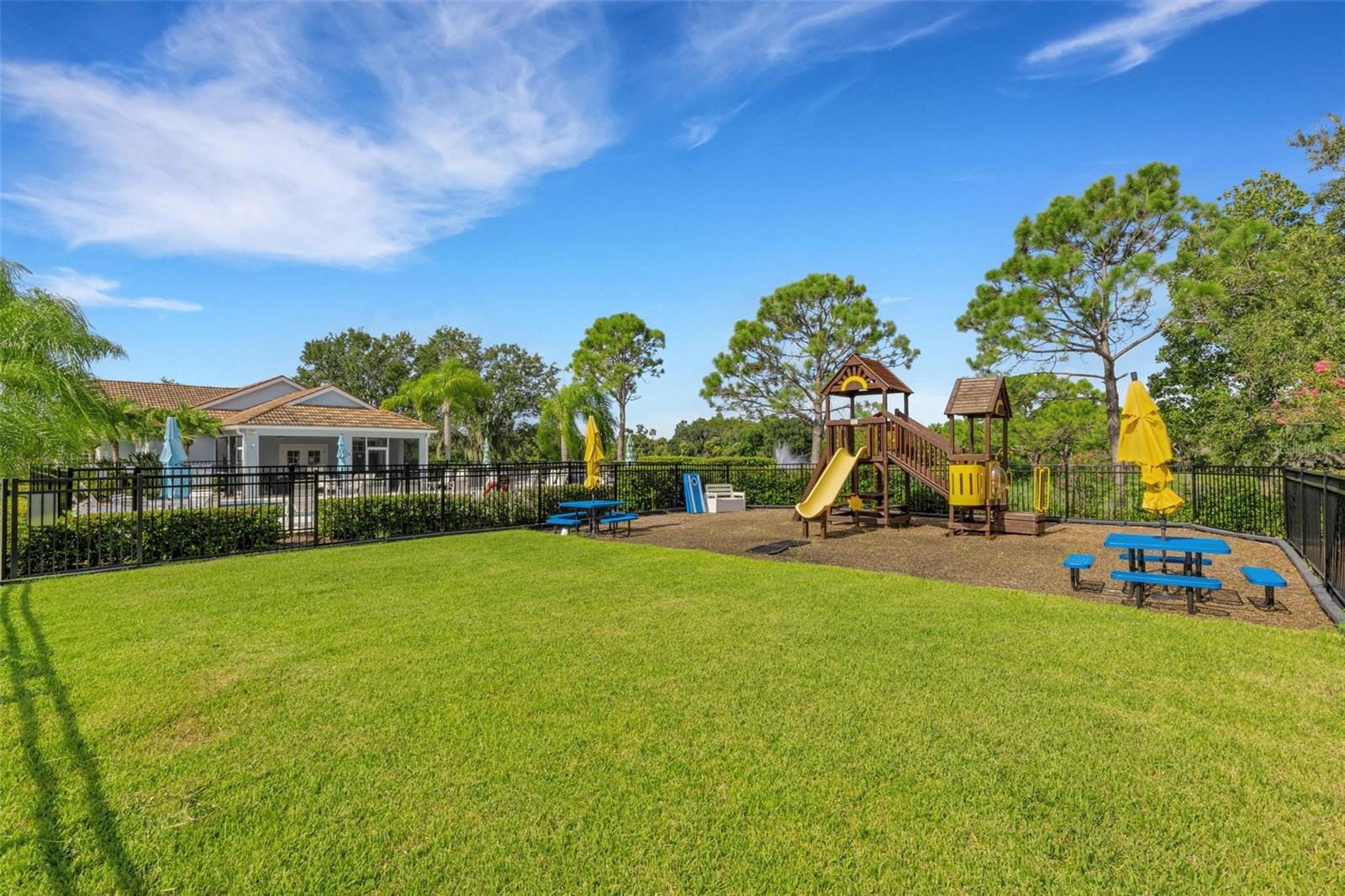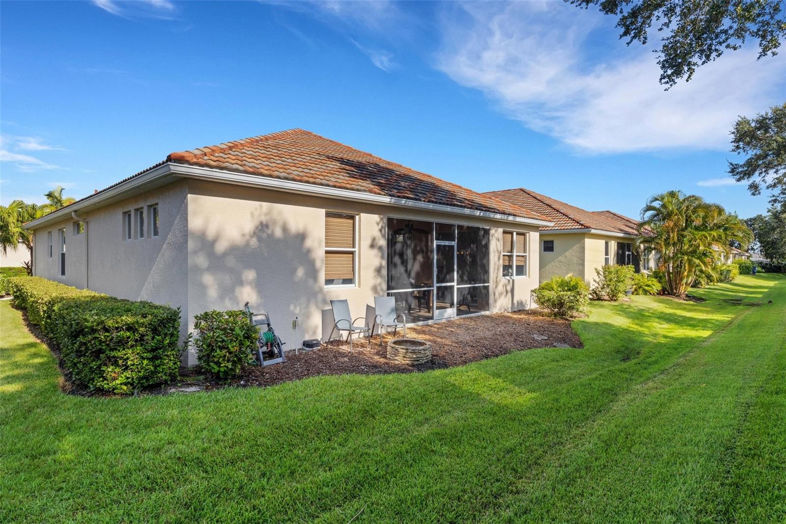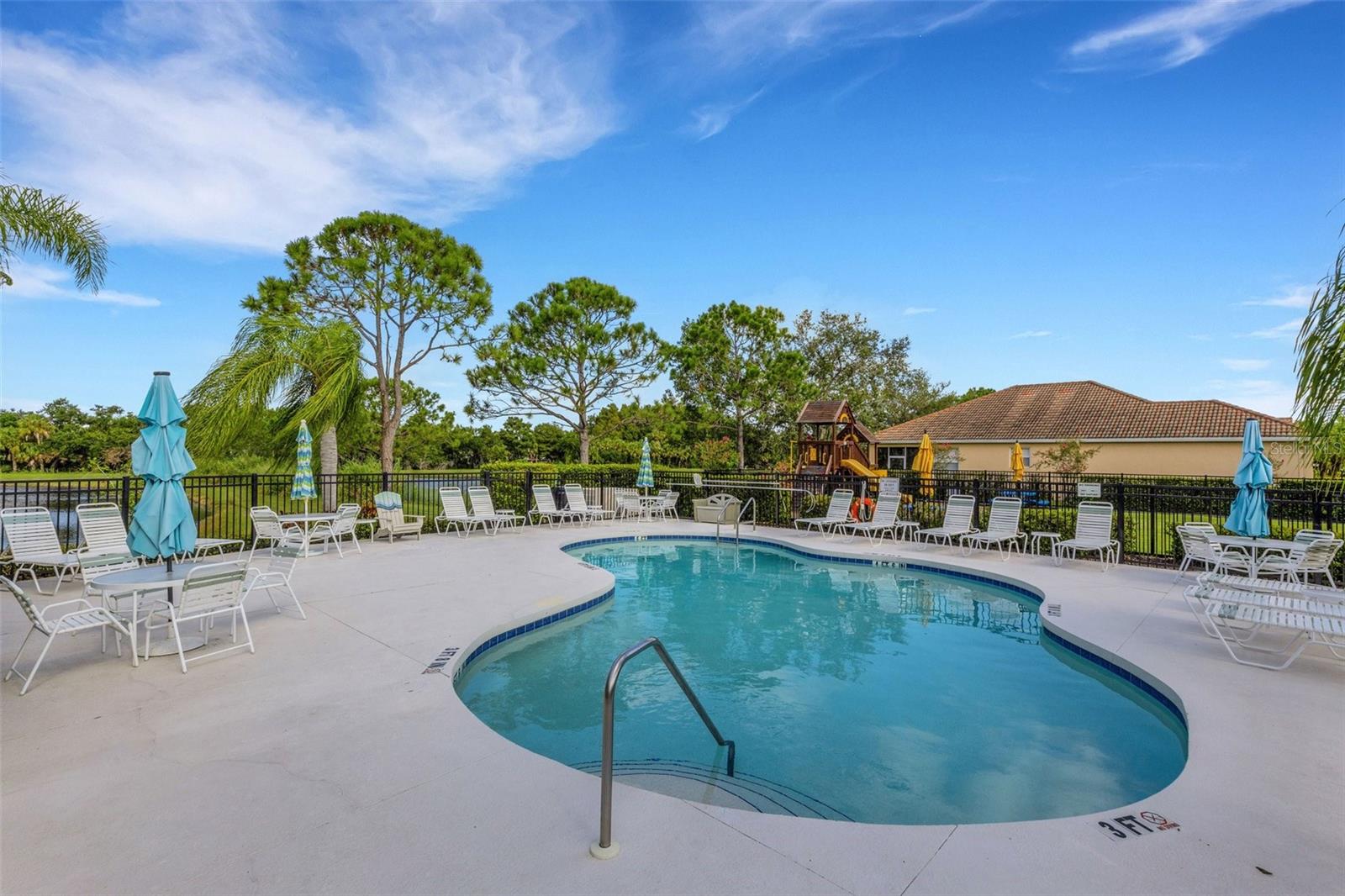 Nestled in a pet-friendly neighborhood, this charming residence offers a serene environment with sidewalks, a community pool, a clubhouse, and a playground. The interior boasts a split bedroom floor plan, welcoming foyer entry, and high ceilings. The open-concept great room flows into a separate dining area and a screened-covered porch, ideal for relaxing or entertaining near the fire pit. The home features tiled floors in the living areas and wood laminate in the bedrooms. The kitchen is a chef's delight with stainless steel appliances, a stainless steel sink, and quartz countertops, complemented by crown molding throughout the master suite and living spaces. The bathrooms are updated with all-new lighting and quartz countertops. Freshly painted both inside and out, this home also showcases a tile roof, brick paver driveway, and walkway, adding to its curb appeal. Whether you're seeking year-round comfort or a vacation retreat, this home is perfect for you. Enjoy low monthly maintenance fees and a welcoming community atmosphere. Ideally located, you're just minutes from downtown, top-rated schools, shopping, the airport, Sarasota, and Bradenton. Don’t miss out on this exceptional opportunity!