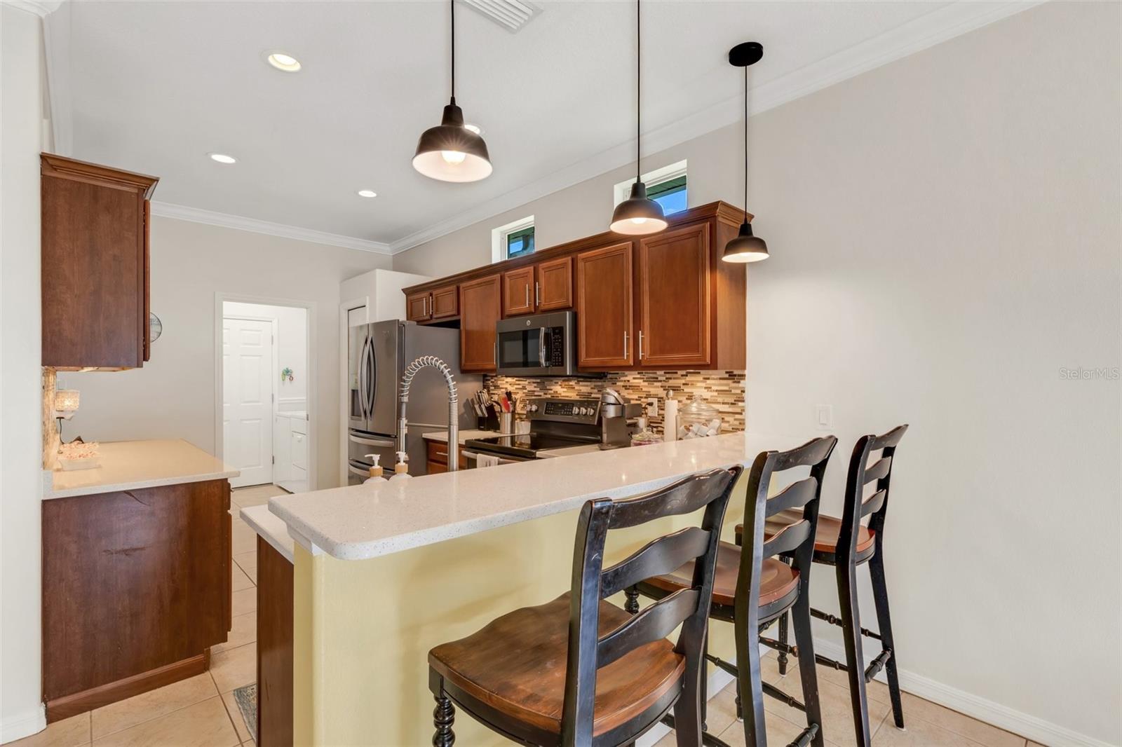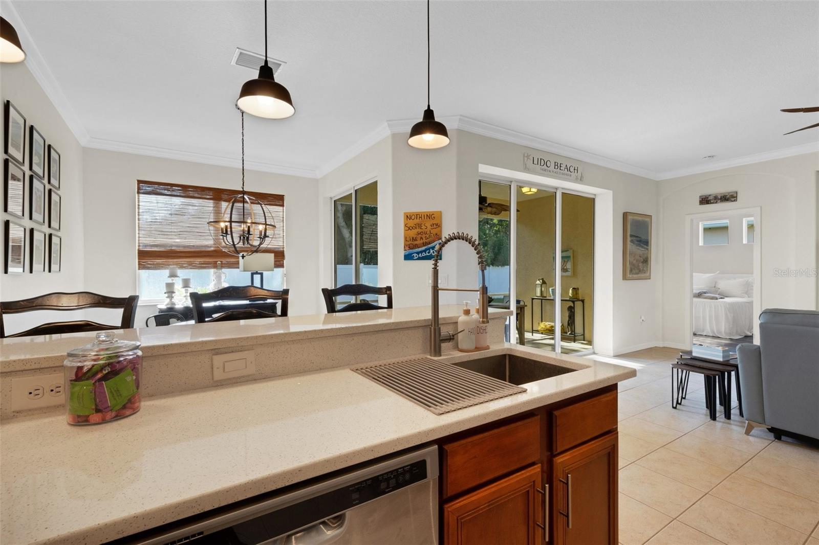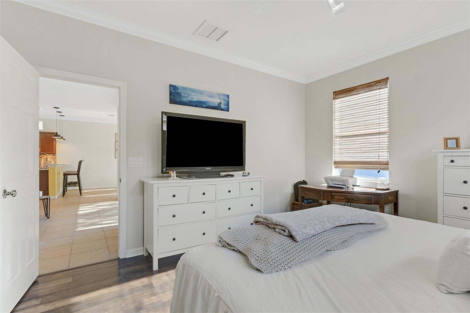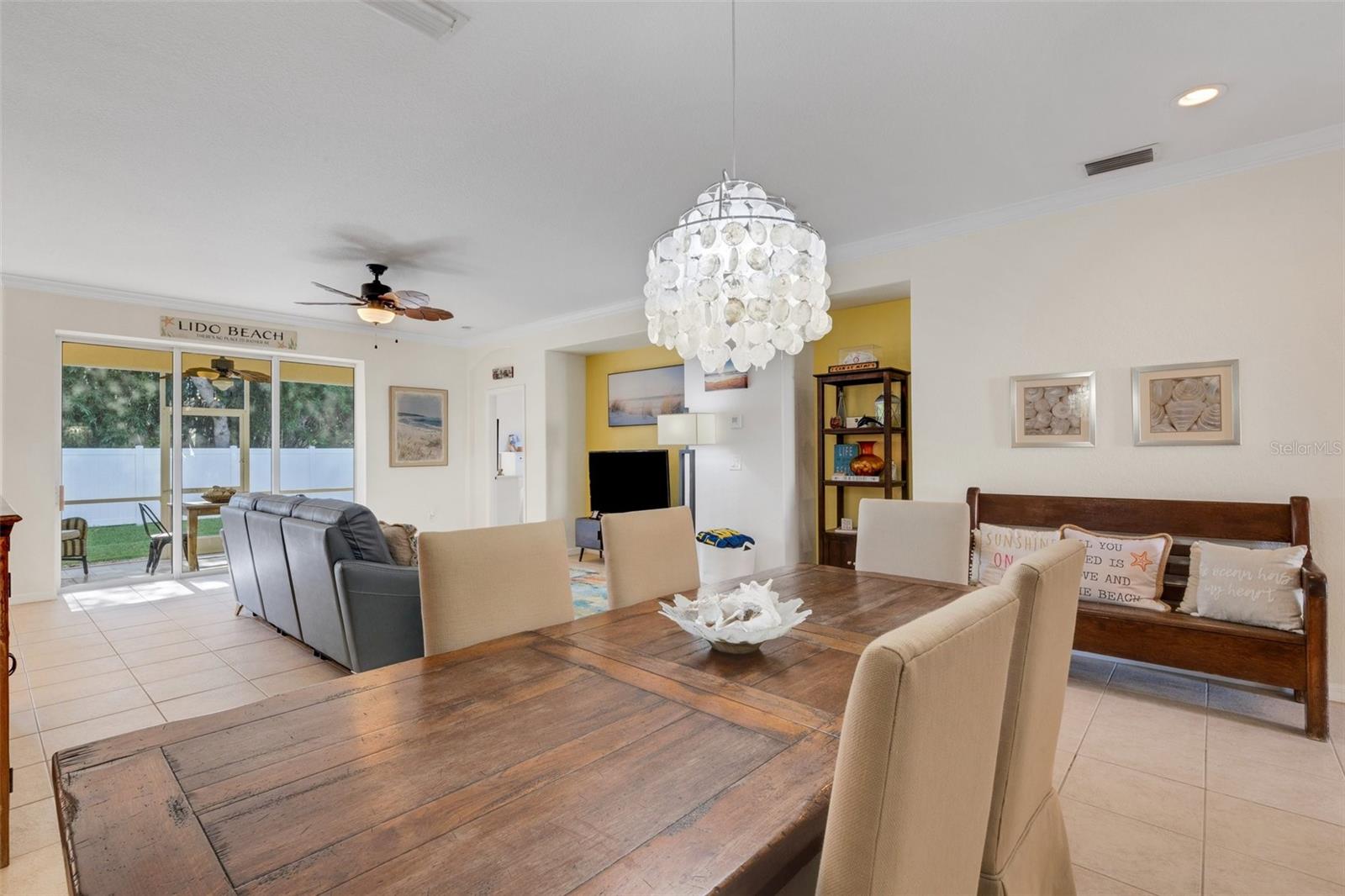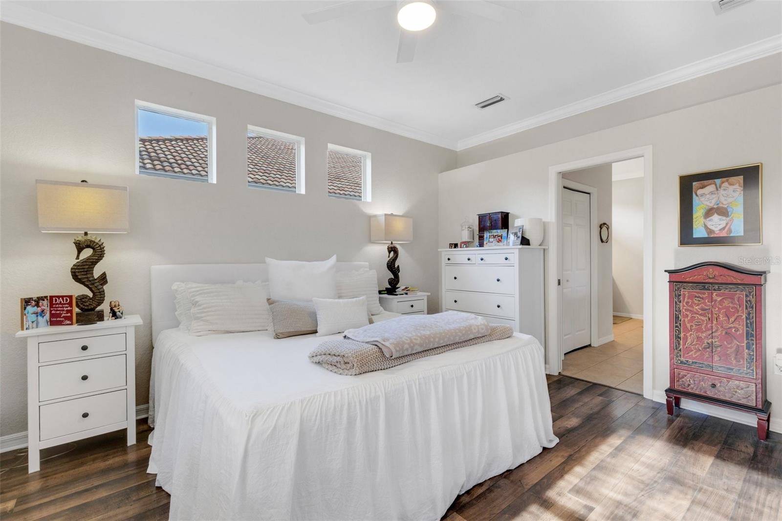 Nestled in a pet-friendly neighborhood, this charming residence offers a serene environment with sidewalks, a community pool, a clubhouse, and a playground. The interior boasts a split bedroom floor plan, welcoming foyer entry, and high ceilings. The open-concept great room flows into a separate dining area and a screened-covered porch, ideal for relaxing or entertaining near the fire pit. The home features tiled floors in the living areas and wood laminate in the bedrooms. The kitchen is a chef's delight with stainless steel appliances, a stainless steel sink, and quartz countertops, complemented by crown molding throughout the master suite and living spaces. The bathrooms are updated with all-new lighting and quartz countertops. Freshly painted both inside and out, this home also showcases a tile roof, brick paver driveway, and walkway, adding to its curb appeal. Whether you're seeking year-round comfort or a vacation retreat, this home is perfect for you. Enjoy low monthly maintenance fees and a welcoming community atmosphere. Ideally located, you're just minutes from downtown, top-rated schools, shopping, the airport, Sarasota, and Bradenton. Don’t miss out on this exceptional opportunity!