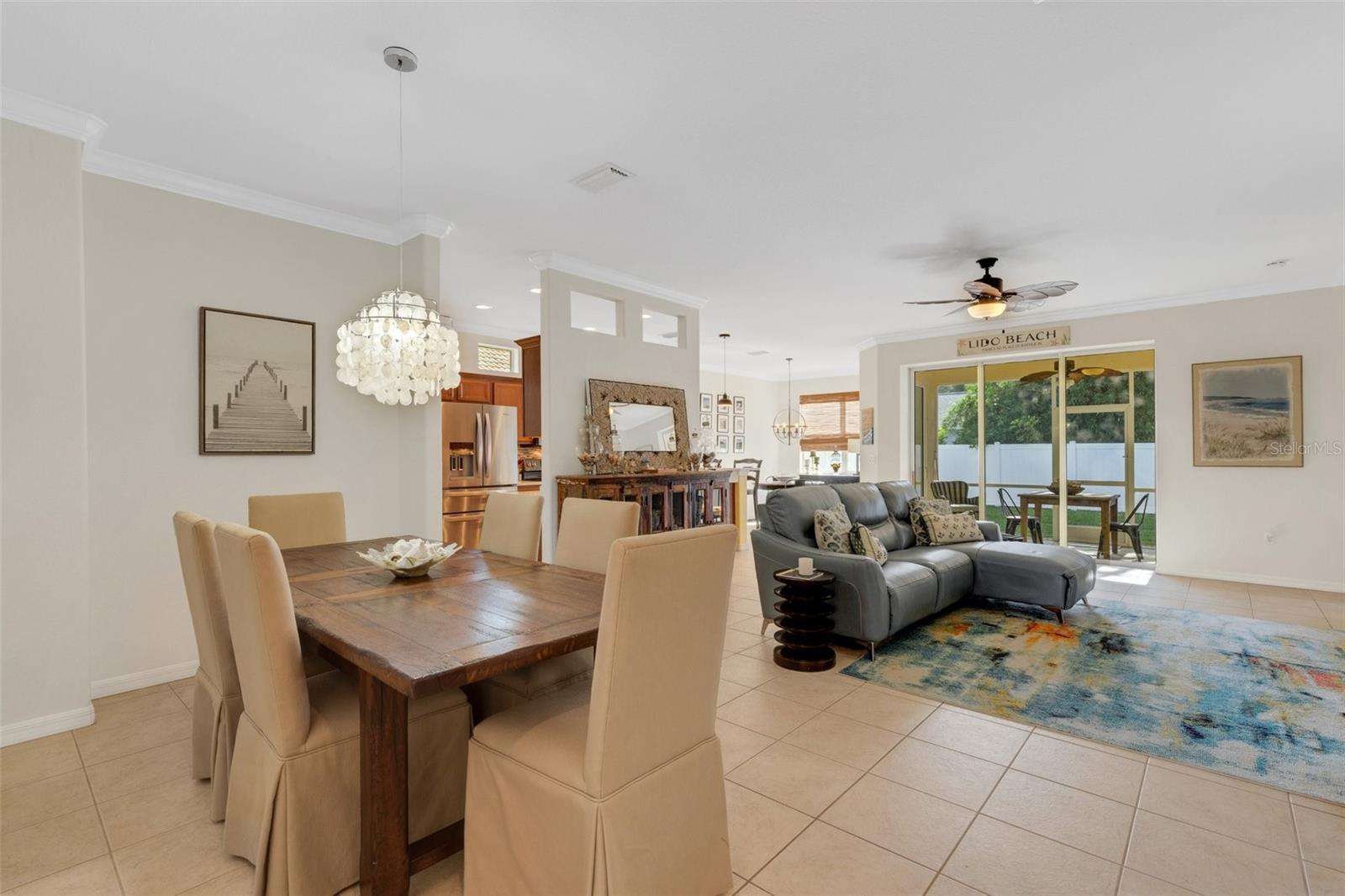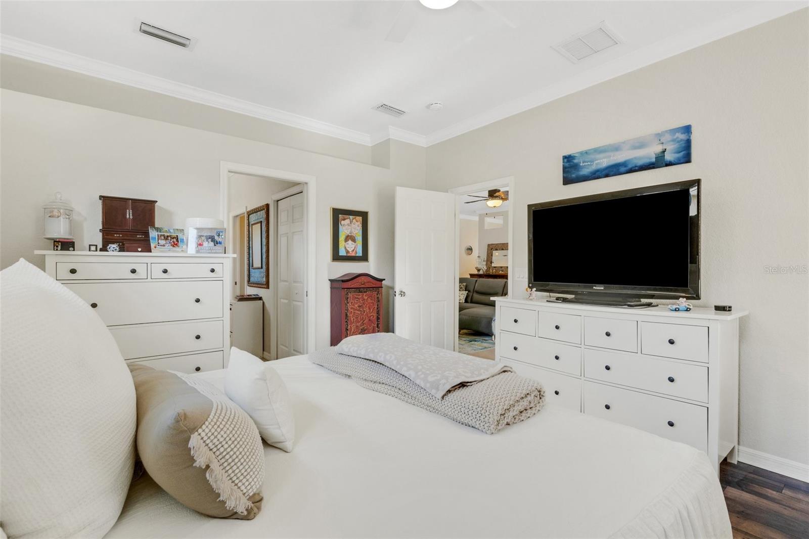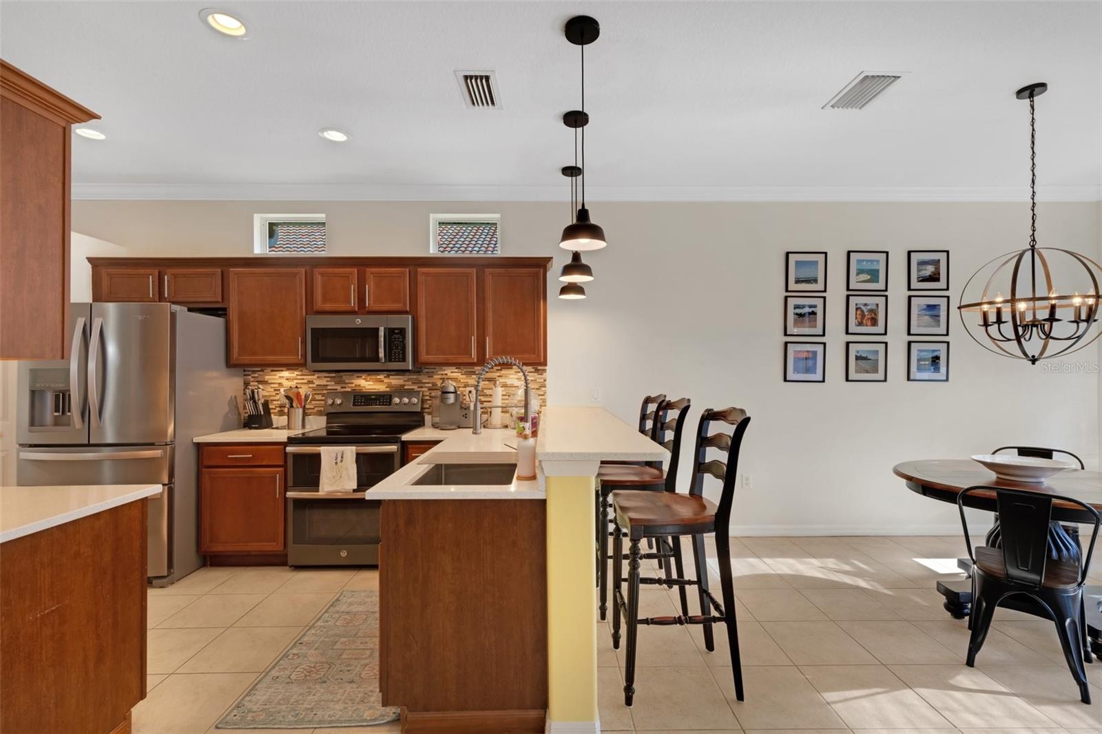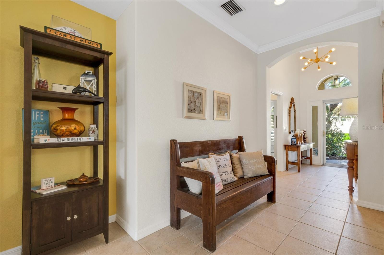Nestled in a pet-friendly neighborhood, this charming residence offers a serene environment with sidewalks, a community pool, a clubhouse, and a playground. The interior boasts a split bedroom floor plan, welcoming foyer entry, and high ceilings. The open-concept great room flows into a separate dining area and a screened-covered porch, ideal for relaxing or entertaining near the fire pit. The home features tiled floors in the living areas and wood laminate in the bedrooms. The kitchen is a chef's delight with stainless steel appliances, a stainless steel sink, and quartz countertops, complemented by crown molding throughout the master suite and living spaces. The bathrooms are updated with all-new lighting and quartz countertops. Freshly painted both inside and out, this home also showcases a tile roof, brick paver driveway, and walkway, adding to its curb appeal. Whether you're seeking year-round comfort or a vacation retreat, this home is perfect for you. Enjoy low monthly maintenance fees and a welcoming community atmosphere. Ideally located, you're just minutes from downtown, top-rated schools, shopping, the airport, Sarasota, and Bradenton. Don’t miss out on this exceptional opportunity!