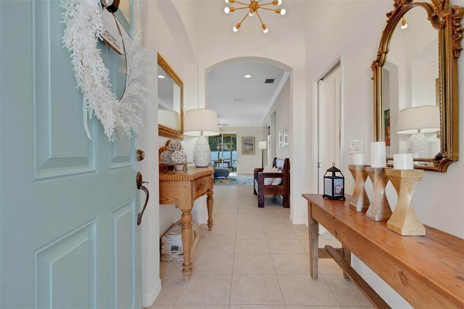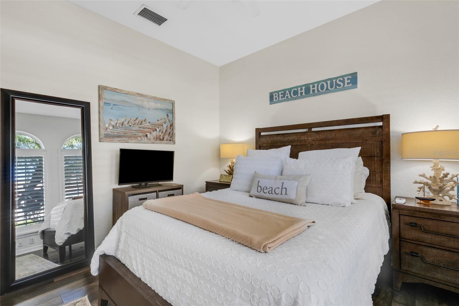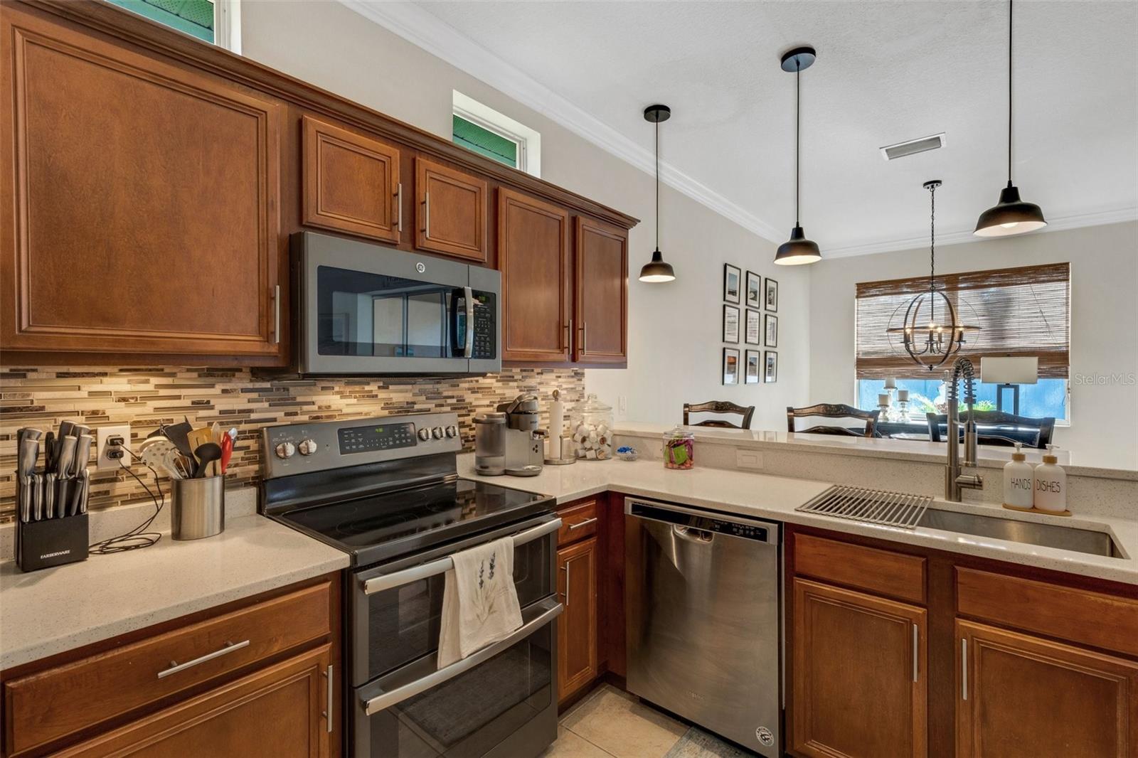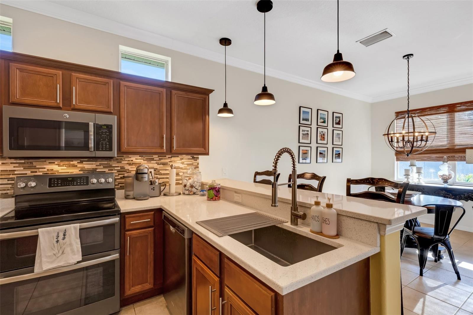 Nestled in a pet-friendly neighborhood, this charming residence offers a serene environment with sidewalks, a community pool, a clubhouse, and a playground. The interior boasts a split bedroom floor plan, welcoming foyer entry, and high ceilings. The open-concept great room flows into a separate dining area and a screened-covered porch, ideal for relaxing or entertaining near the fire pit. The home features tiled floors in the living areas and wood laminate in the bedrooms. The kitchen is a chef's delight with stainless steel appliances, a stainless steel sink, and quartz countertops, complemented by crown molding throughout the master suite and living spaces. The bathrooms are updated with all-new lighting and quartz countertops. Freshly painted both inside and out, this home also showcases a tile roof, brick paver driveway, and walkway, adding to its curb appeal. Whether you're seeking year-round comfort or a vacation retreat, this home is perfect for you. Enjoy low monthly maintenance fees and a welcoming community atmosphere. Ideally located, you're just minutes from downtown, top-rated schools, shopping, the airport, Sarasota, and Bradenton. Don’t miss out on this exceptional opportunity!