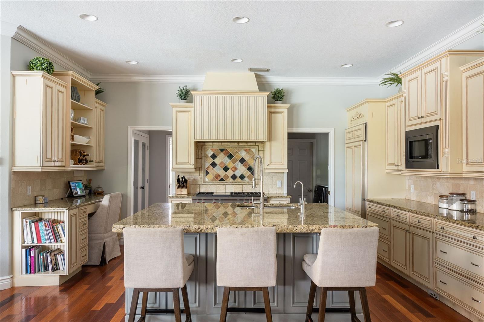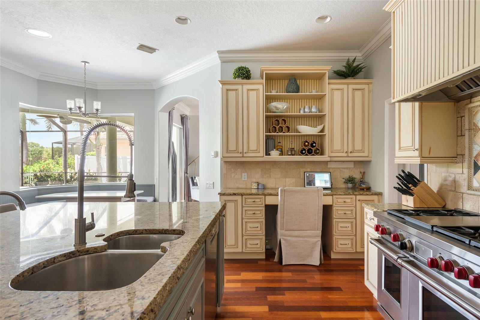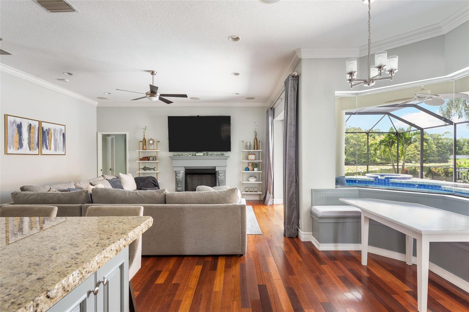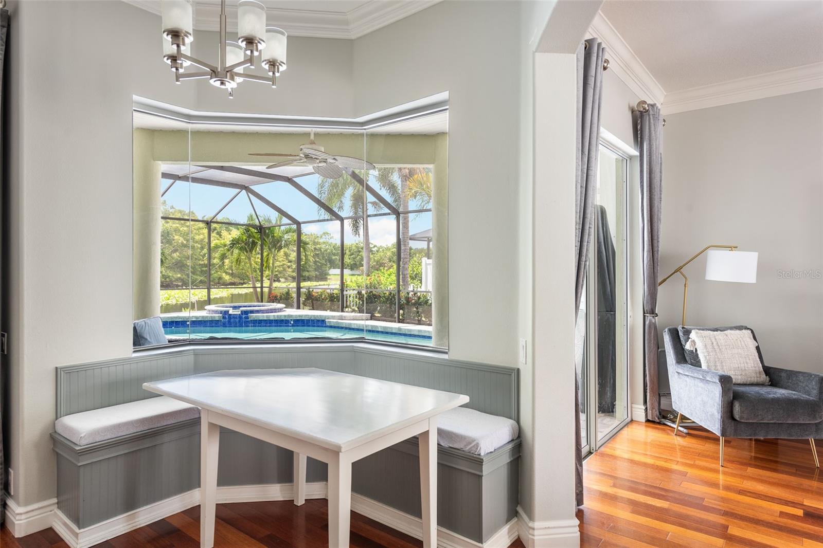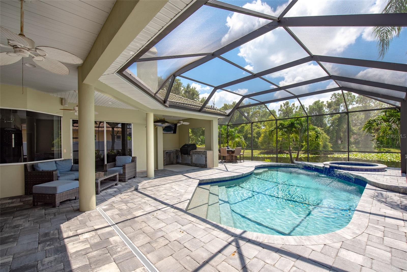 Your private paradise awaits in this stunning four-bedroom, three-bathroom Palmer Glen home, where luxury and comfort come together seamlessly. Step into this stunning residence and be greeted by an expansive open living space bathed in natural light. The elegant design features sweeping views of the sparkling pool, creating a serene and inviting atmosphere. The formal dining area is perfect for hosting memorable gatherings and special occasions, while the large bonus room offers endless possibilities, whether you envision it as a home office, playroom, or personal retreat. This home combines style, comfort, and functionality, providing a perfect backdrop for both relaxation and entertainment. The gourmet kitchen boasts a six burner Wolf Gas Range, Sub-Zero Refrigerator, a new Bosch dishwasher, custom cabinets, undermount cabinet lighting, an oversized island, built-in desk area, and charming breakfast nook with a built-in bench. Adjacent to the kitchen, a spacious butler's pantry provides additional storage and prep space, making entertaining a breeze. The inviting living room features a cozy fireplace, elegant crown molding, and beautiful cherry wood flooring. The home’s layout includes an exquisite primary suite, complete with his and her walk-in closets and an ensuite bathroom that offers the ultimate in luxury, providing ample space and privacy. Each additional bedroom offers comfort and easy access to the two full bathrooms, ensuring convenience for family and guests alike. Sliding glass doors lead to a screened lanai, complete with a heated pool and spa, perfect for relaxing while observing the wildlife in the serene pond behind the house. The sparkling pool, which is heated for year-round enjoyment, and the upgraded outdoor kitchen, are just a few of the many features that make this home exceptional. Recent enhancements include new pool pavers and drains, a new pool pump and a new electric pool heater. The property also boasts updated interior lighting, fresh paint, and a newly re-screened and painted pool cage. Located just across from the picturesque Celery Fields, this home offers the perfect blend of tranquil surroundings and convenient access to all of Sarasota's amenities. Enjoy serene, quiet living while being just minutes away from everything you desire!