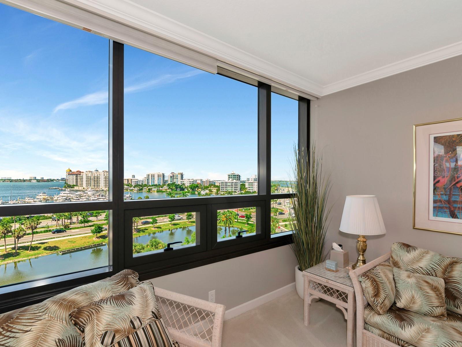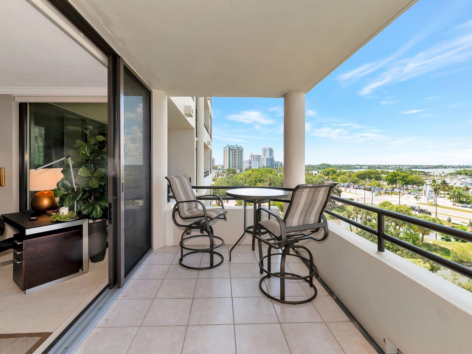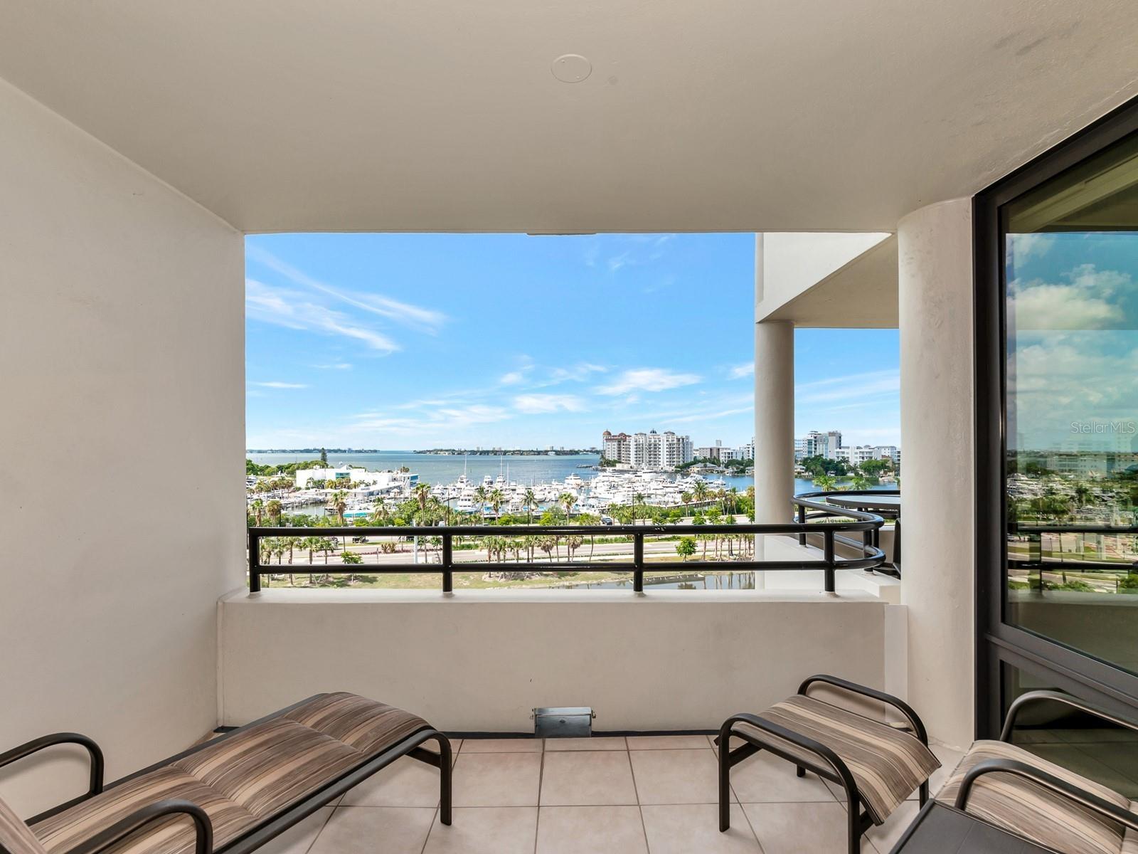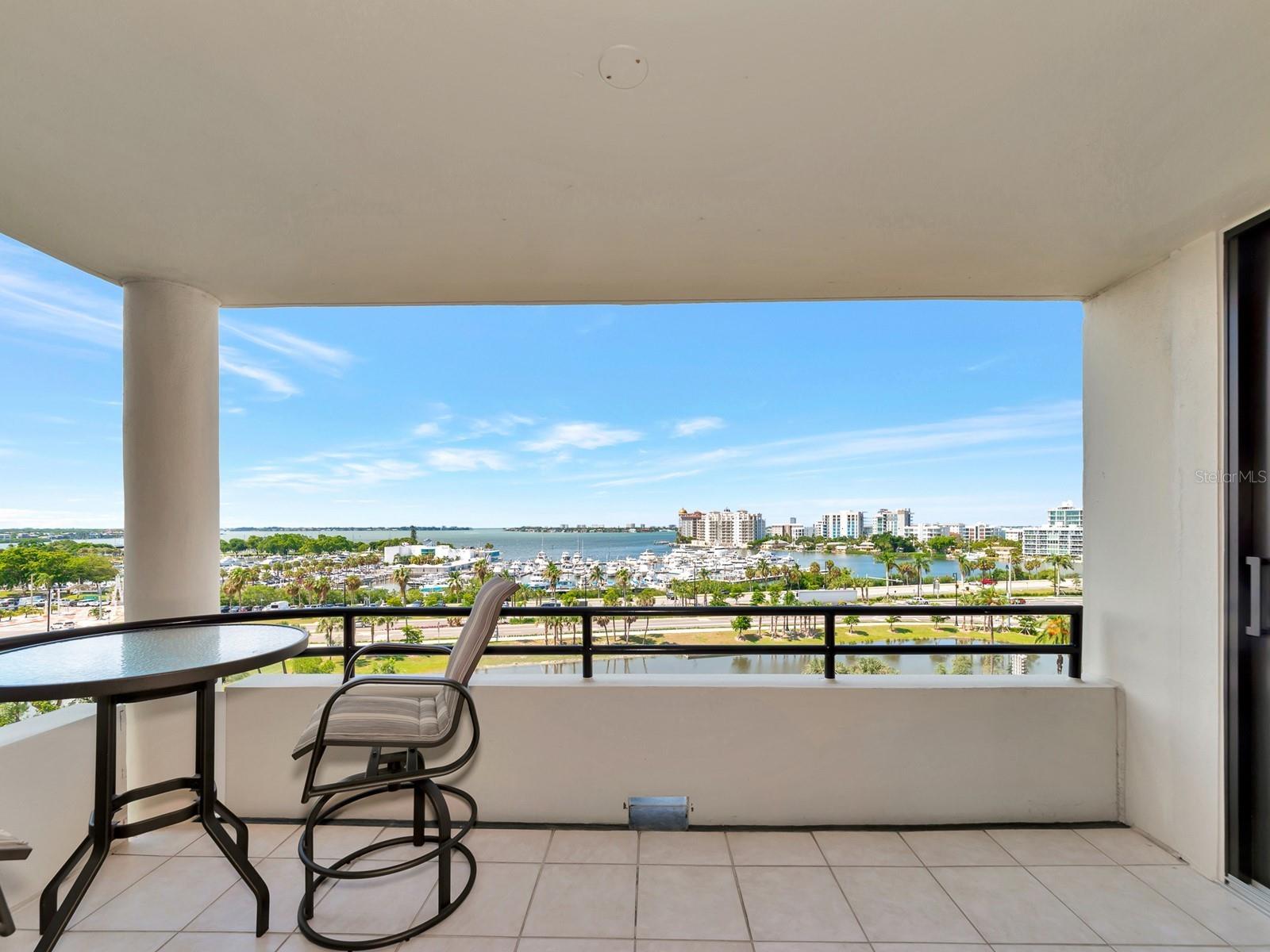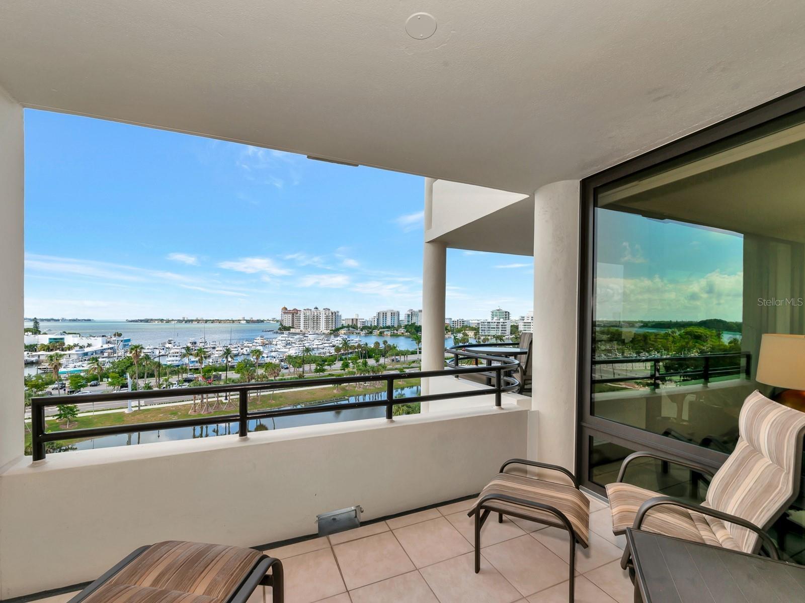 Upgrade complete! New hurricane-rated windows are installed throughout the entire building. This is a redesigned Bay Plaza residence with full bay views! A modern and bright renovation on the 7th floor has two primary suites, each including a personal bath. Both have access to one of two bayside balconies. The formal foyer has storage closets, mirrored French doors, and a clever invisibly hinged access closet. A gallery wall provides separation as terracotta flooring continues into the expanded kitchen. With approximately 500 square feet, it is a culinary connoisseur’s ideal space. Boasting granite, light maple cabinetry with a built-in pantry, custom etched glass uppers, recessed lighting, and a service entrance. Two individual buffets have serving space, wall cabinets, and planning centers—a large island seats four to six. The customary appliances remain, along with a beverage refrigerator. Matching etched glass French doors close for privacy from the main living area. The great room offers living and dining space with built-ins. Sliding glass doors overlook sensational views of Sarasota Bay and the Gulf of Mexico through Big Pass. One of the two en suite bedrooms incorporates a stacked full-sized washer and dryer and a convenient utility room with a sink. Its updated bathroom has granite, furniture-quality cabinets, and a walk-in shower with glass doors. The second bedroom or flex space has views and access to the primary balcony. The Owner’s Suite looks out over water vistas from its private balcony with sliding glass doors. A pocket door hides the walk-in closet with an incredible built-in function. The primary bath has dual sinks, granite, a soaking tub, and a separate glass-enclosed walk-in shower with subway tile. Additional architectural elements are crown moldings, recessed lighting, electronic window treatments, and large 2x2 tile floors. Bonus features include newly completed building windows and new sliding glass doors. In addition, assigned garage parking for two cars and plenty of extra spots. Known as one of the most esteemed, secure, and architecturally significant downtown buildings in Sarasota, you can enjoy 24-hour concierge, 24-hour valet services, EV charging stations, an elegant lobby, fitness center, hot tub, swimming pool, media room, outdoor grill, storage, hurricane impact glass, and more! Immerse yourself in the active social lifestyle of downtown Sarasota. Bay Plaza is ideally situated for personal viewing of the 4th of July fireworks at Marina Jacks from the comfort of your balcony. Whole Foods, the Theatre and Opera, and your choice of excellent restaurants are close by. This prime location is close to virtually every cultural event the city offers and only minutes to St. Armand’s Circle, Longboat Key, and your choice of any of Sarasota's attractive beaches.