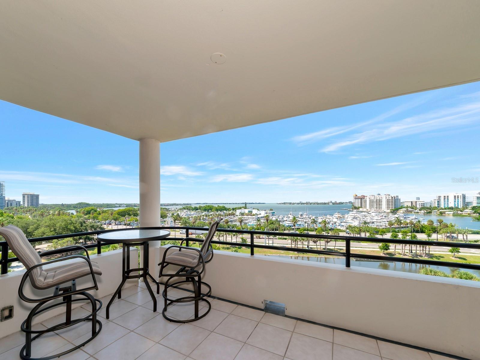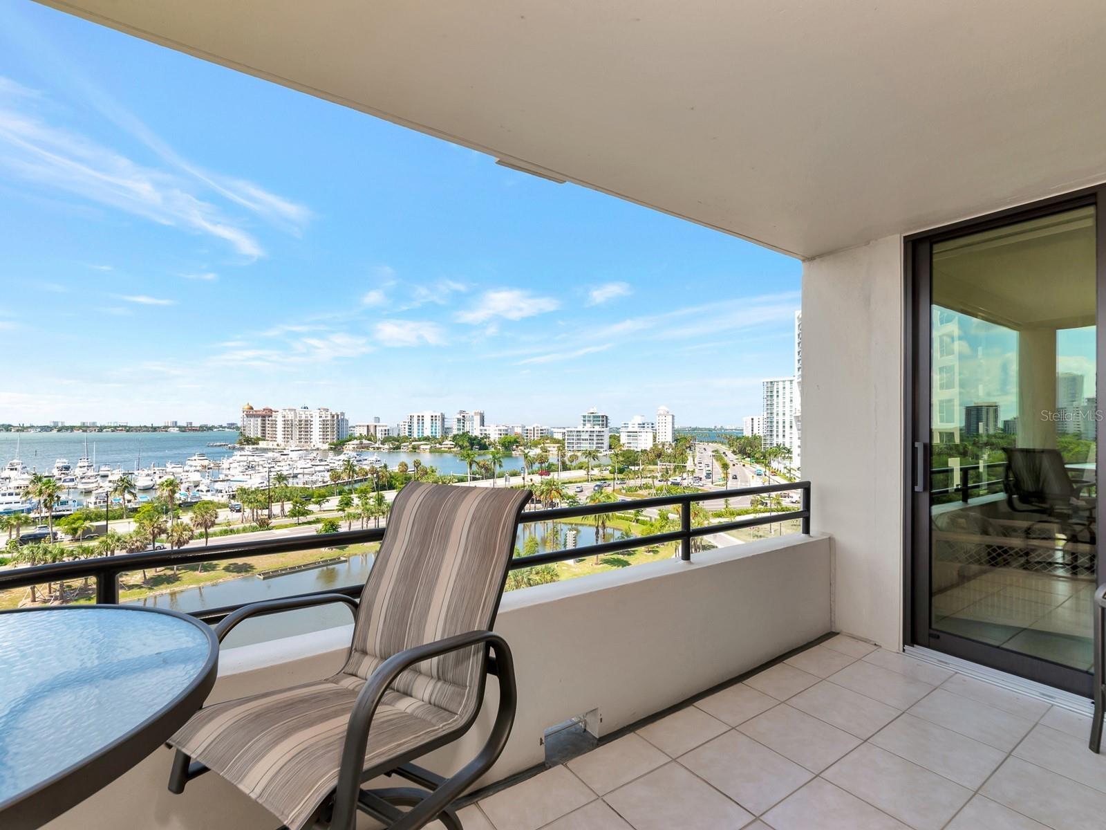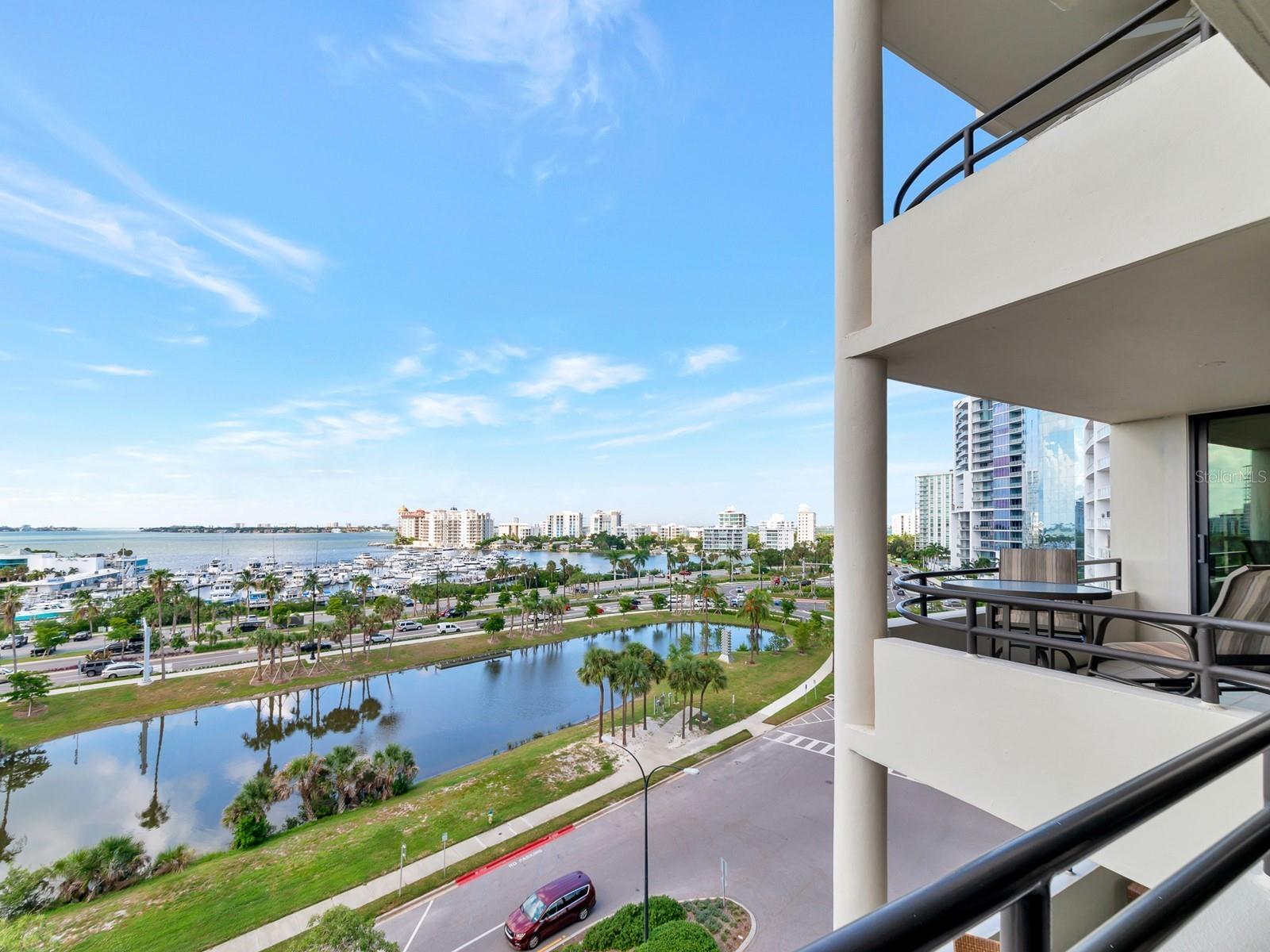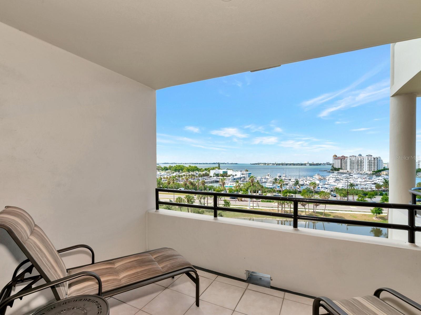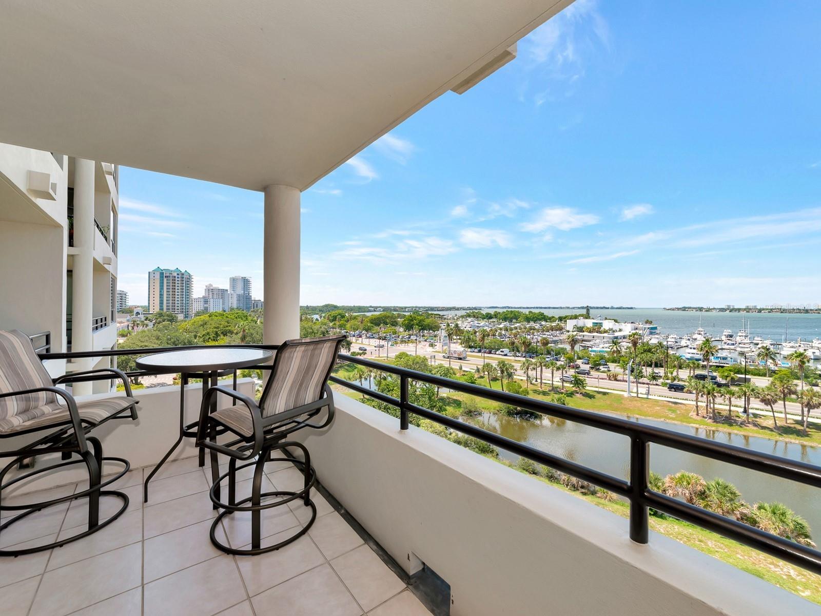 Upgrade complete! New hurricane-rated windows are installed throughout the entire building. This is a redesigned Bay Plaza residence with full bay views! A modern and bright renovation on the 7th floor has two primary suites, each including a personal bath. Both have access to one of two bayside balconies. The formal foyer has storage closets, mirrored French doors, and a clever invisibly hinged access closet. A gallery wall provides separation as terracotta flooring continues into the expanded kitchen. With approximately 500 square feet, it is a culinary connoisseur’s ideal space. Boasting granite, light maple cabinetry with a built-in pantry, custom etched glass uppers, recessed lighting, and a service entrance. Two individual buffets have serving space, wall cabinets, and planning centers—a large island seats four to six. The customary appliances remain, along with a beverage refrigerator. Matching etched glass French doors close for privacy from the main living area. The great room offers living and dining space with built-ins. Sliding glass doors overlook sensational views of Sarasota Bay and the Gulf of Mexico through Big Pass. One of the two en suite bedrooms incorporates a stacked full-sized washer and dryer and a convenient utility room with a sink. Its updated bathroom has granite, furniture-quality cabinets, and a walk-in shower with glass doors. The second bedroom or flex space has views and access to the primary balcony. The Owner’s Suite looks out over water vistas from its private balcony with sliding glass doors. A pocket door hides the walk-in closet with an incredible built-in function. The primary bath has dual sinks, granite, a soaking tub, and a separate glass-enclosed walk-in shower with subway tile. Additional architectural elements are crown moldings, recessed lighting, electronic window treatments, and large 2x2 tile floors. Bonus features include newly completed building windows and new sliding glass doors. In addition, assigned garage parking for two cars and plenty of extra spots. Known as one of the most esteemed, secure, and architecturally significant downtown buildings in Sarasota, you can enjoy 24-hour concierge, 24-hour valet services, EV charging stations, an elegant lobby, fitness center, hot tub, swimming pool, media room, outdoor grill, storage, hurricane impact glass, and more! Immerse yourself in the active social lifestyle of downtown Sarasota. Bay Plaza is ideally situated for personal viewing of the 4th of July fireworks at Marina Jacks from the comfort of your balcony. Whole Foods, the Theatre and Opera, and your choice of excellent restaurants are close by. This prime location is close to virtually every cultural event the city offers and only minutes to St. Armand’s Circle, Longboat Key, and your choice of any of Sarasota's attractive beaches.