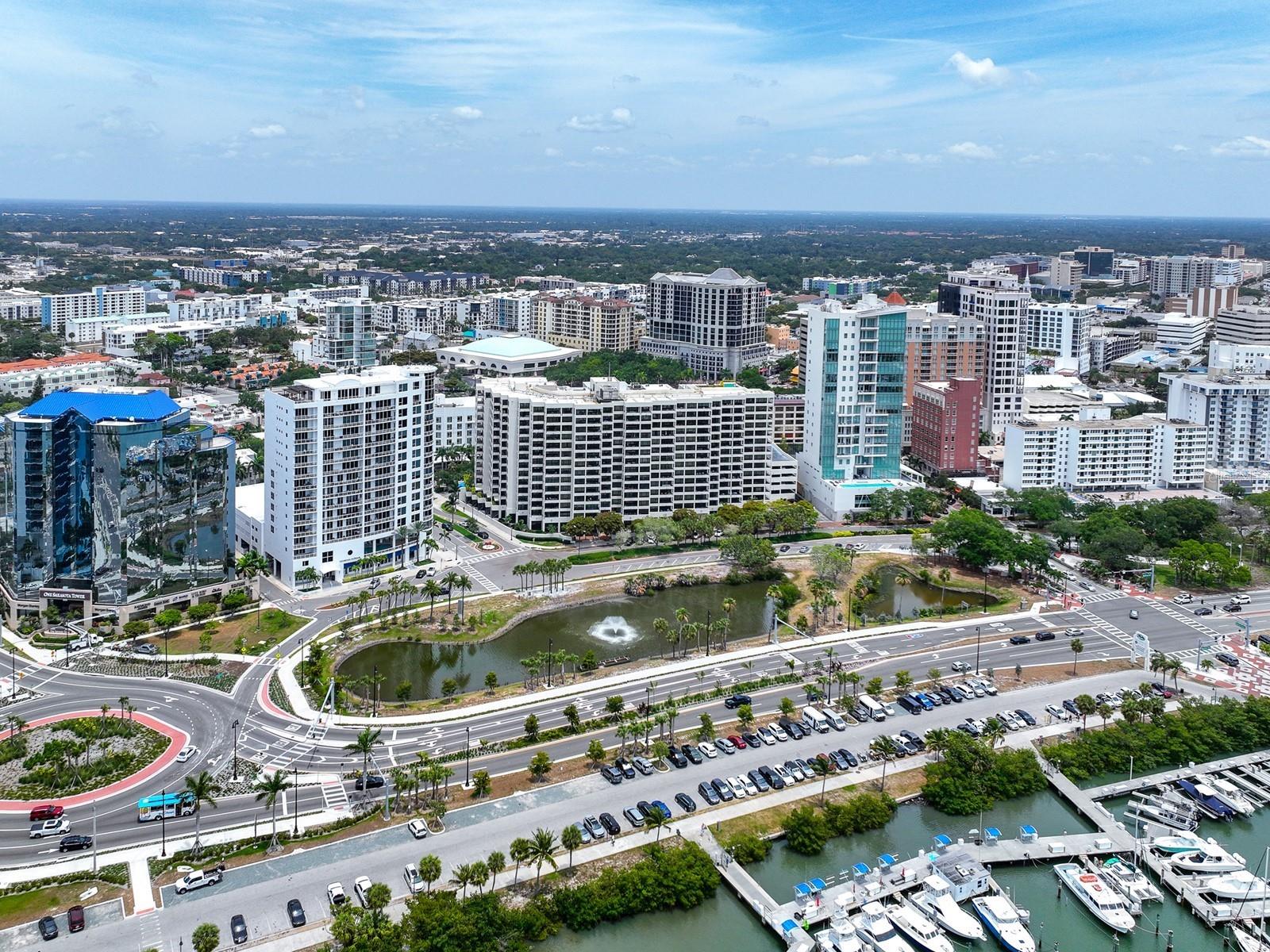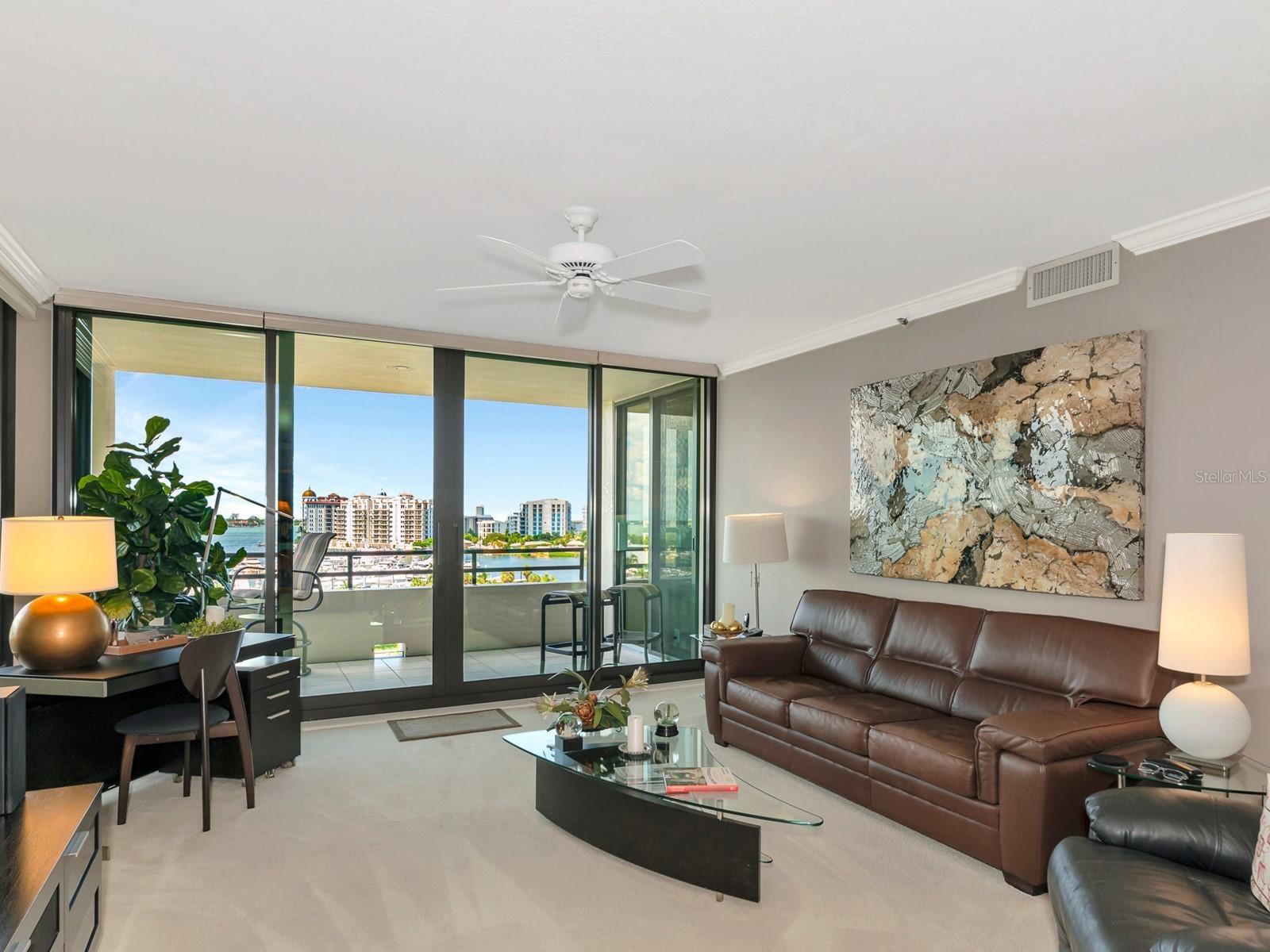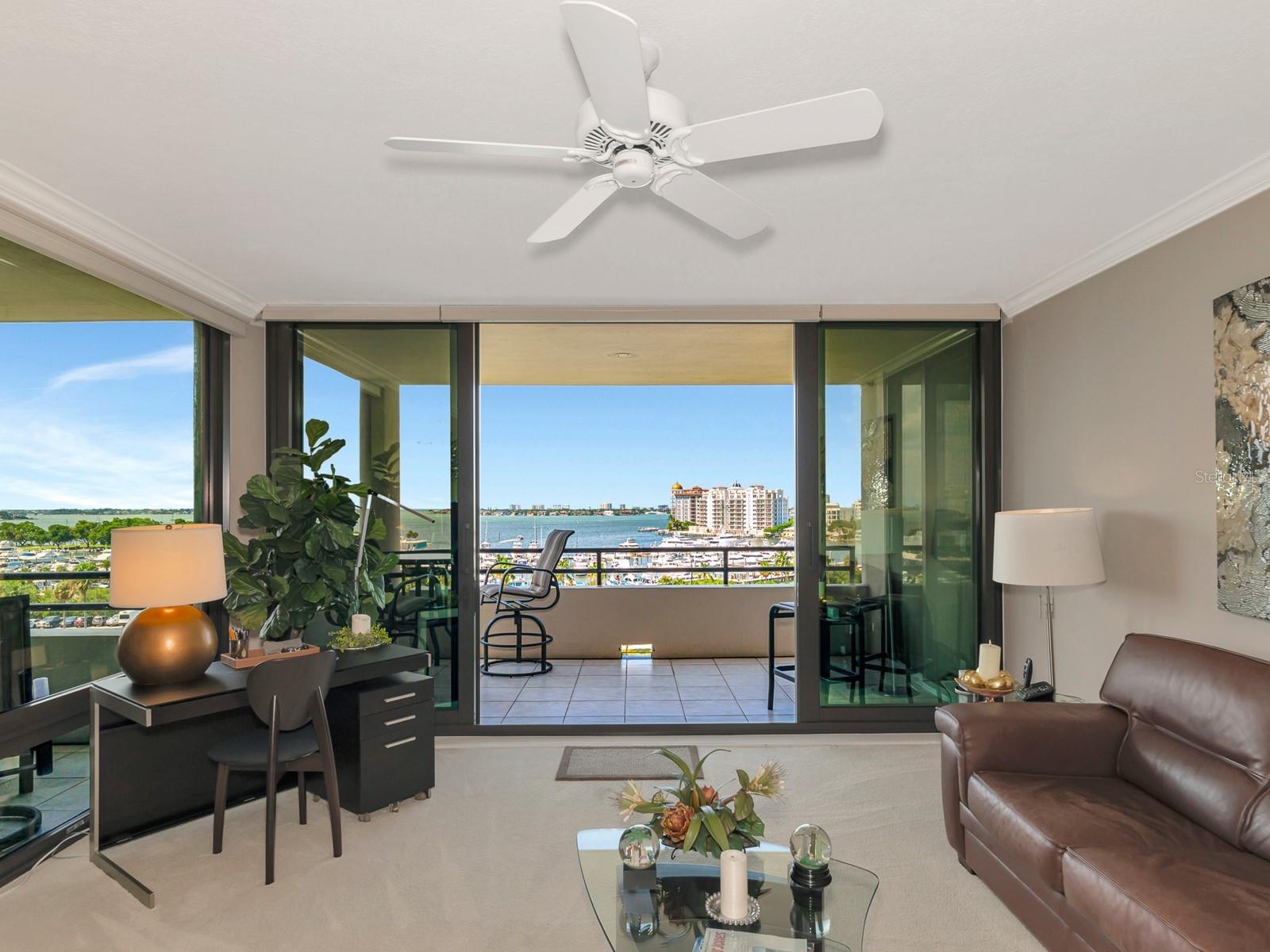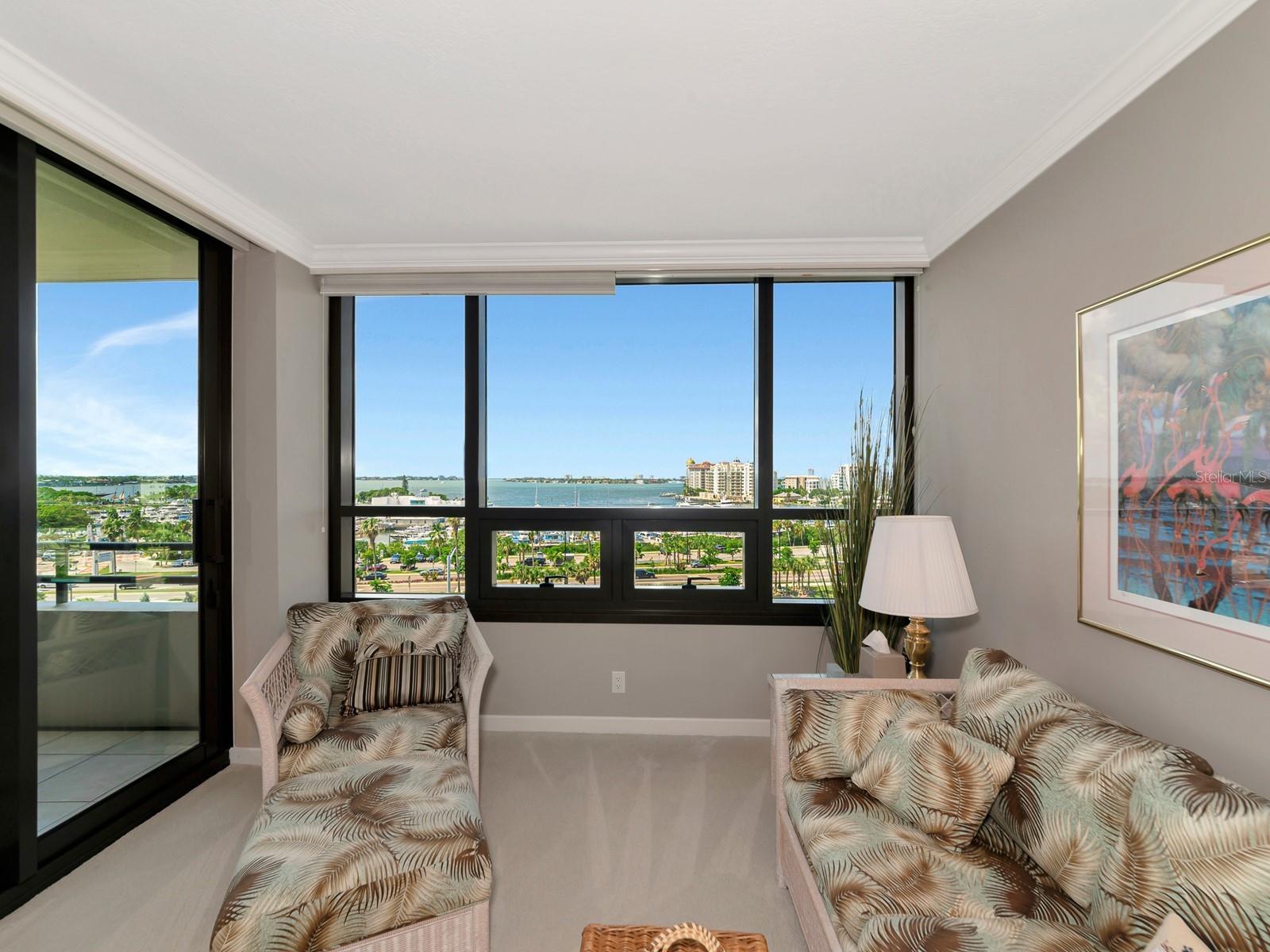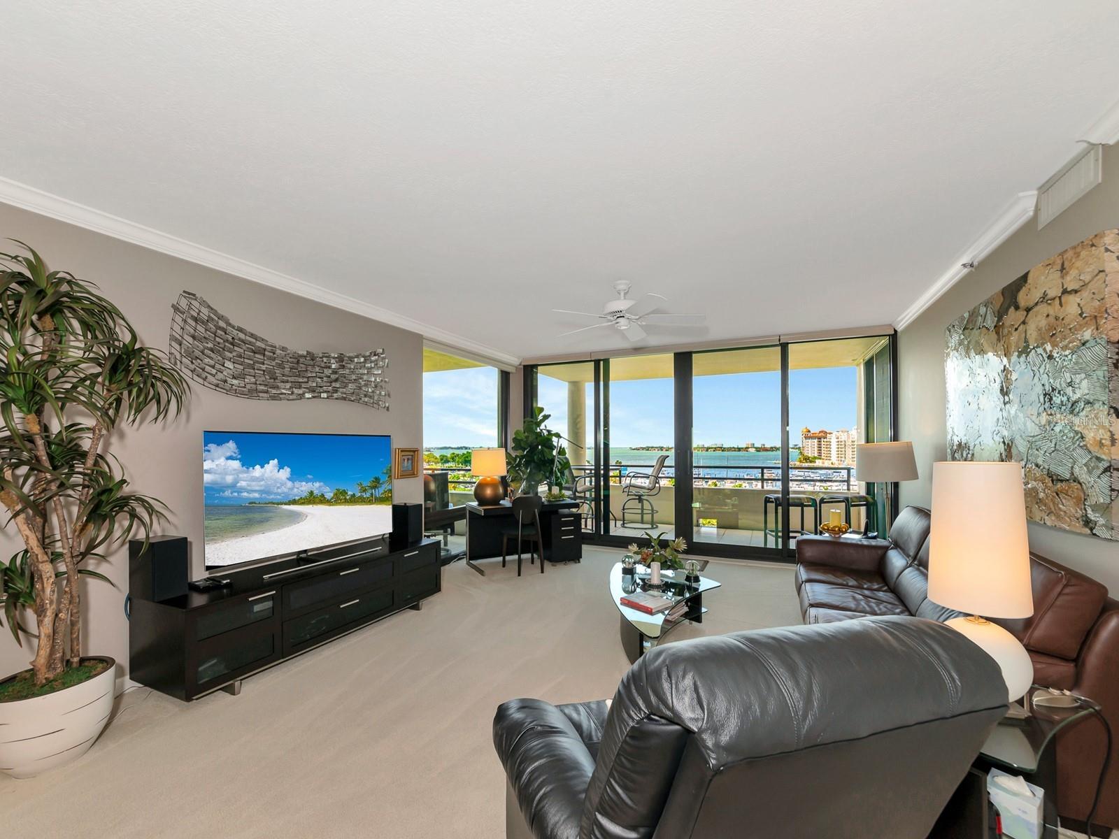 Upgrade complete! New hurricane-rated windows are installed throughout the entire building. This is a redesigned Bay Plaza residence with full bay views! A modern and bright renovation on the 7th floor has two primary suites, each including a personal bath. Both have access to one of two bayside balconies. The formal foyer has storage closets, mirrored French doors, and a clever invisibly hinged access closet. A gallery wall provides separation as terracotta flooring continues into the expanded kitchen. With approximately 500 square feet, it is a culinary connoisseur’s ideal space. Boasting granite, light maple cabinetry with a built-in pantry, custom etched glass uppers, recessed lighting, and a service entrance. Two individual buffets have serving space, wall cabinets, and planning centers—a large island seats four to six. The customary appliances remain, along with a beverage refrigerator. Matching etched glass French doors close for privacy from the main living area. The great room offers living and dining space with built-ins. Sliding glass doors overlook sensational views of Sarasota Bay and the Gulf of Mexico through Big Pass. One of the two en suite bedrooms incorporates a stacked full-sized washer and dryer and a convenient utility room with a sink. Its updated bathroom has granite, furniture-quality cabinets, and a walk-in shower with glass doors. The second bedroom or flex space has views and access to the primary balcony. The Owner’s Suite looks out over water vistas from its private balcony with sliding glass doors. A pocket door hides the walk-in closet with an incredible built-in function. The primary bath has dual sinks, granite, a soaking tub, and a separate glass-enclosed walk-in shower with subway tile. Additional architectural elements are crown moldings, recessed lighting, electronic window treatments, and large 2x2 tile floors. Bonus features include newly completed building windows and new sliding glass doors. In addition, assigned garage parking for two cars and plenty of extra spots. Known as one of the most esteemed, secure, and architecturally significant downtown buildings in Sarasota, you can enjoy 24-hour concierge, 24-hour valet services, EV charging stations, an elegant lobby, fitness center, hot tub, swimming pool, media room, outdoor grill, storage, hurricane impact glass, and more! Immerse yourself in the active social lifestyle of downtown Sarasota. Bay Plaza is ideally situated for personal viewing of the 4th of July fireworks at Marina Jacks from the comfort of your balcony. Whole Foods, the Theatre and Opera, and your choice of excellent restaurants are close by. This prime location is close to virtually every cultural event the city offers and only minutes to St. Armand’s Circle, Longboat Key, and your choice of any of Sarasota's attractive beaches.