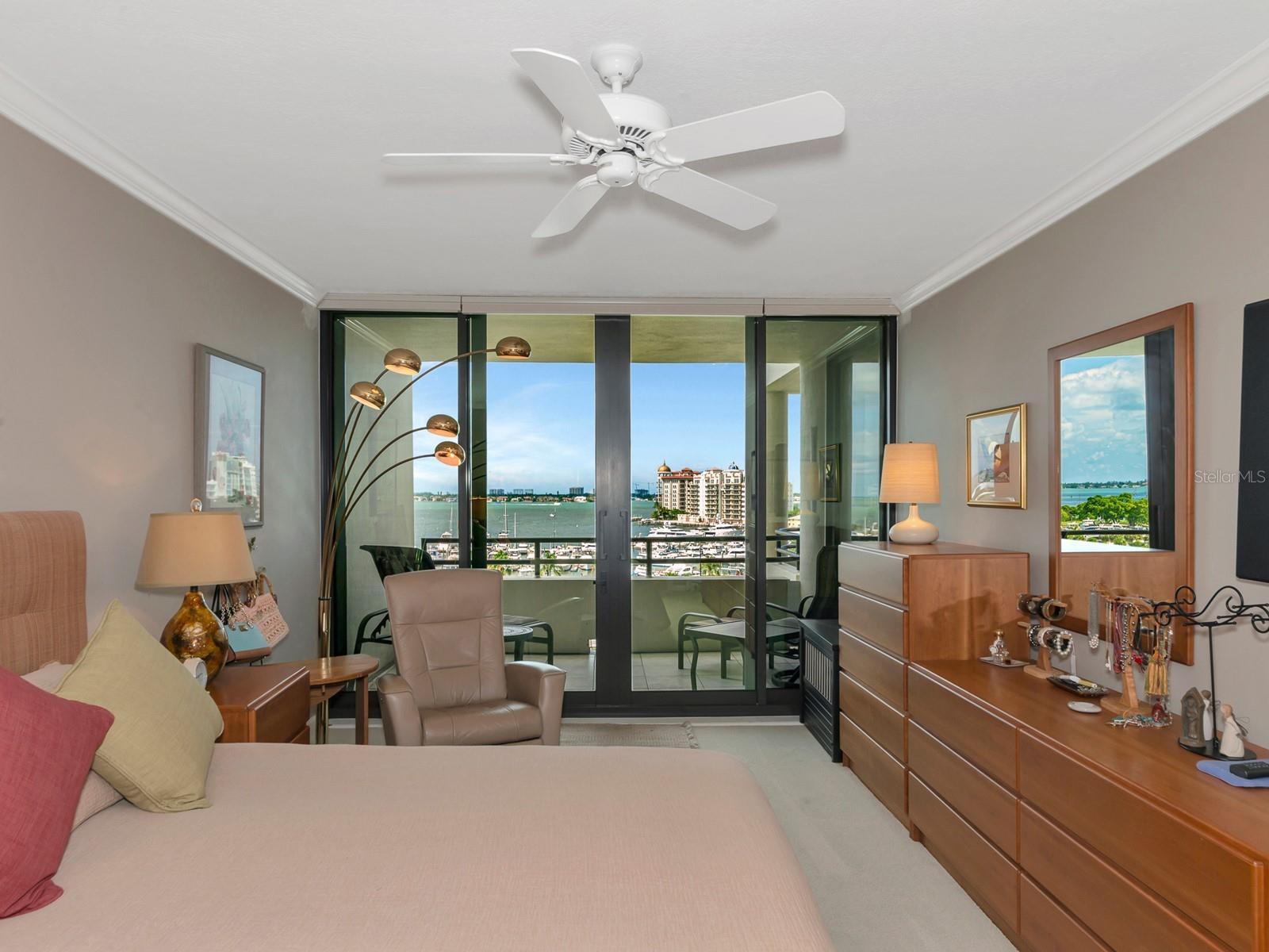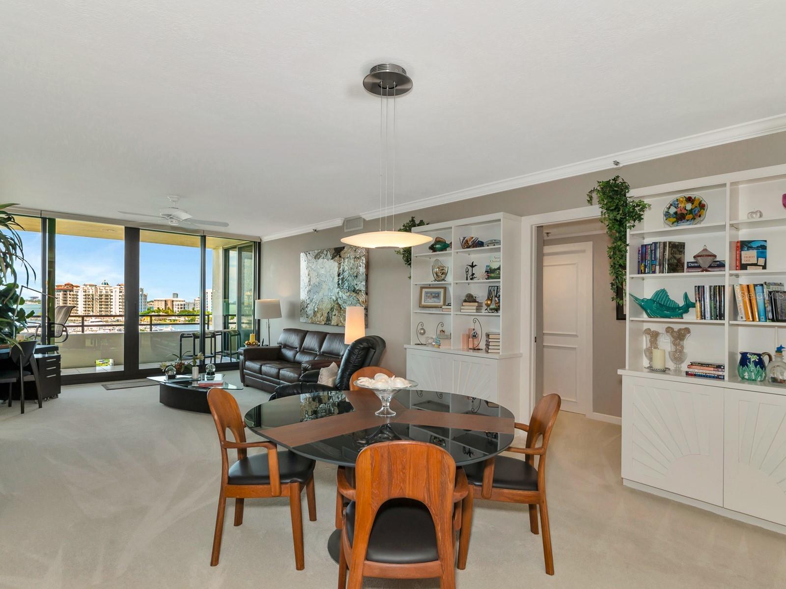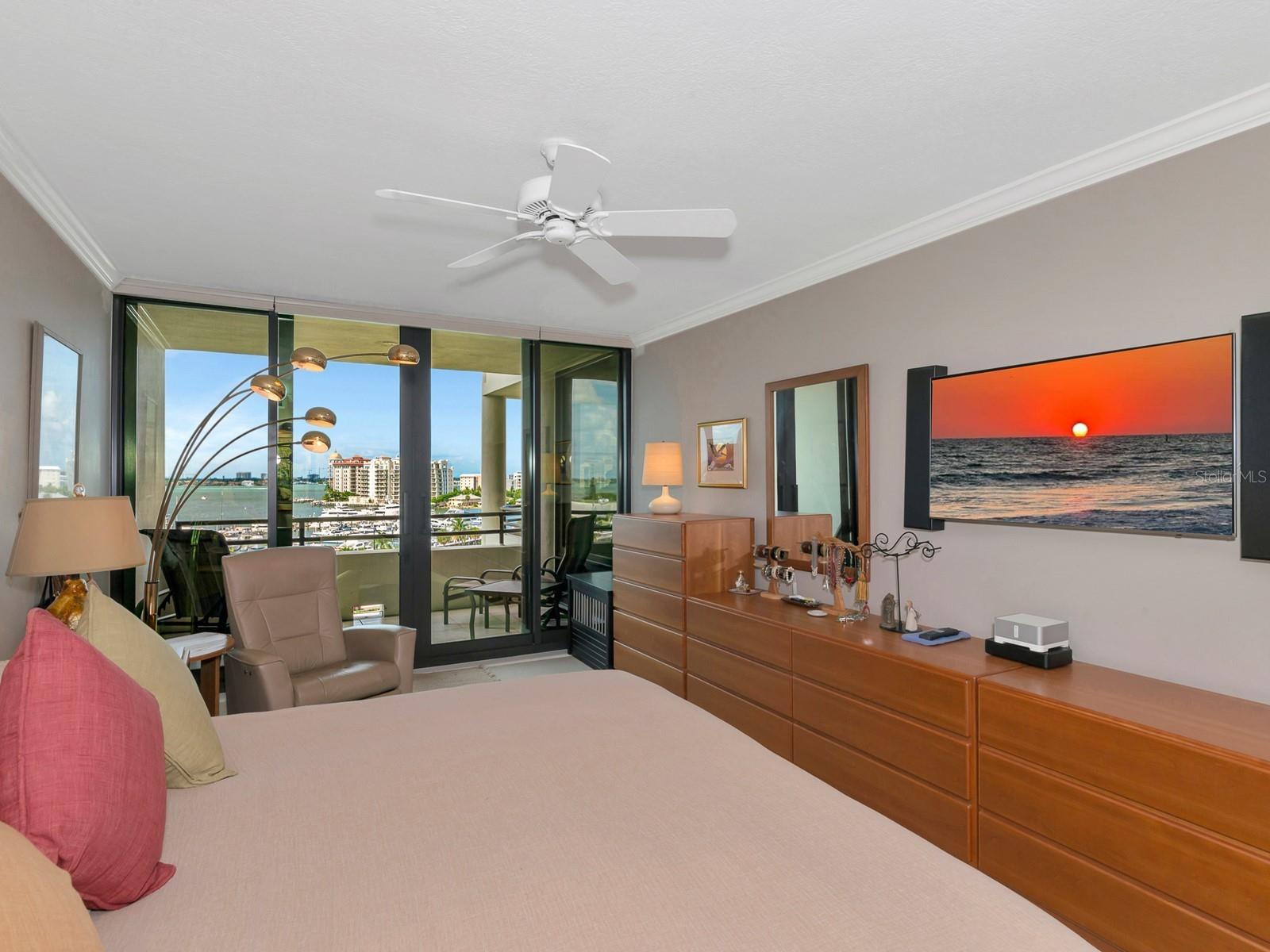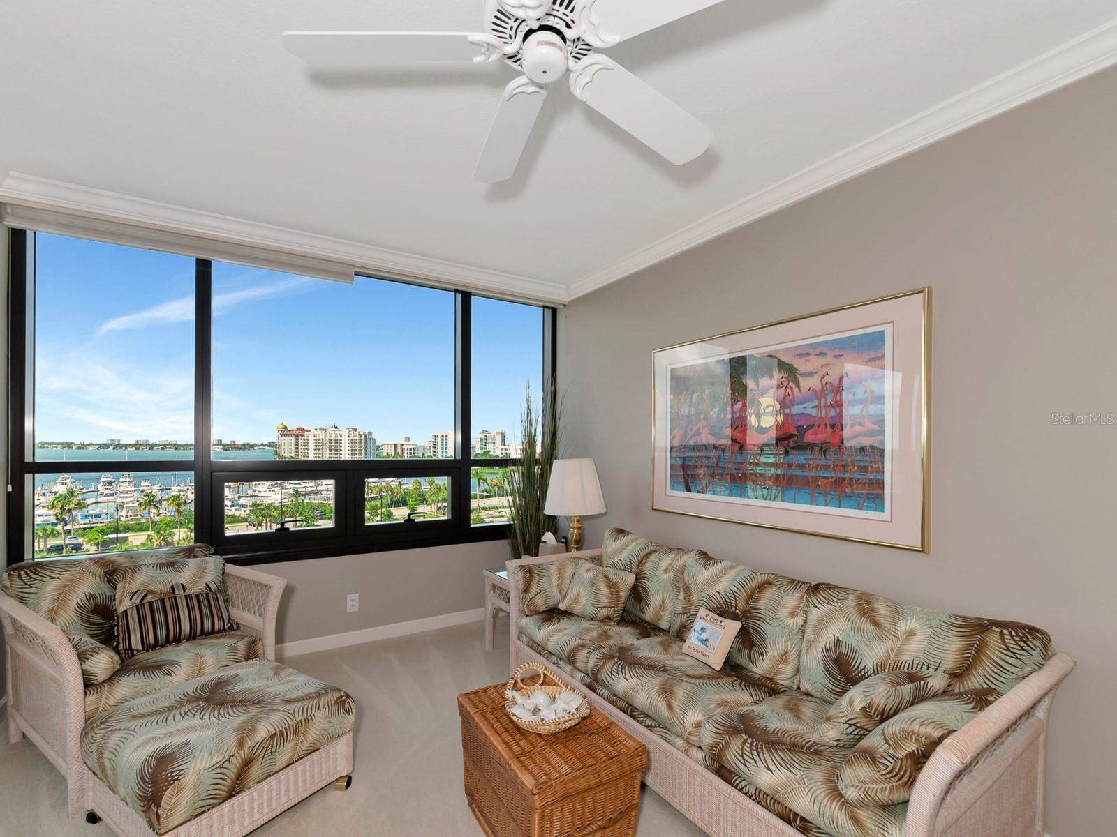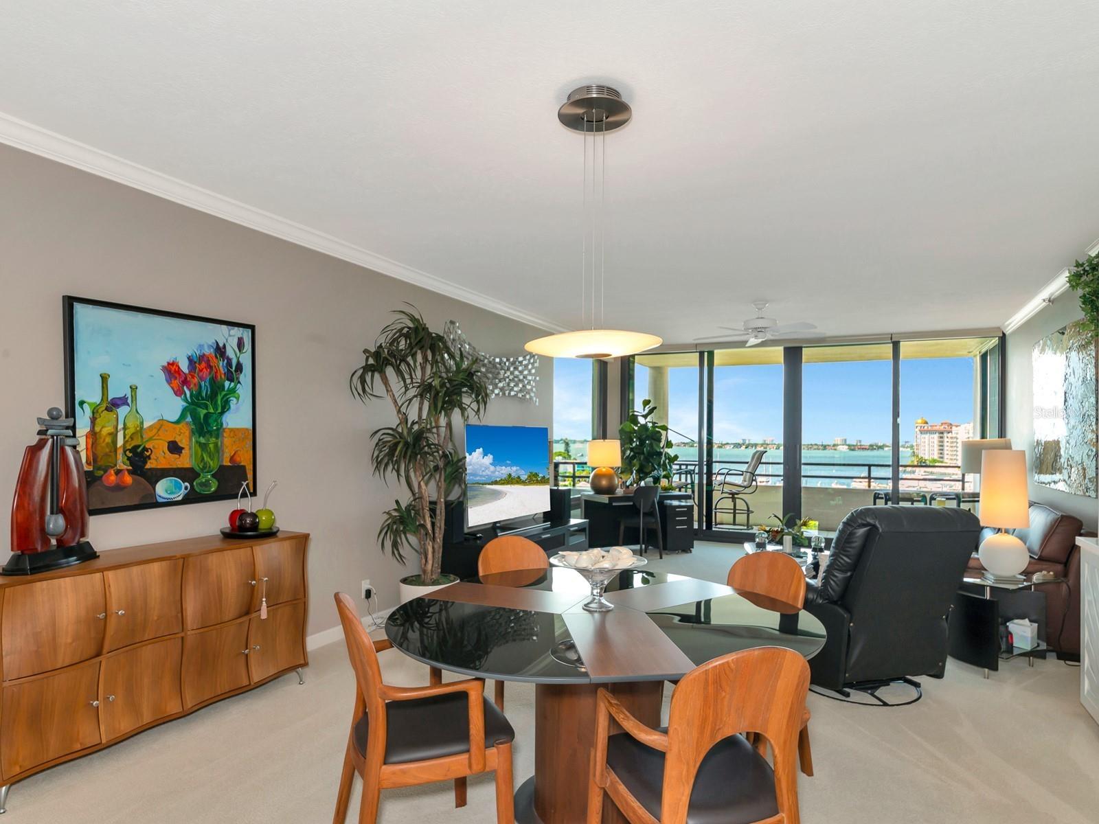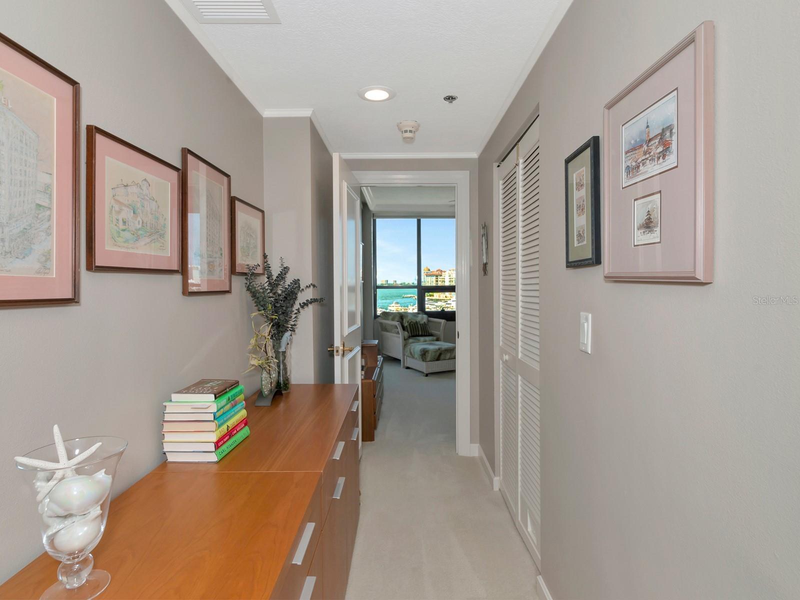 Upgrade complete! New hurricane-rated windows are installed throughout the entire building. This is a redesigned Bay Plaza residence with full bay views! A modern and bright renovation on the 7th floor has two primary suites, each including a personal bath. Both have access to one of two bayside balconies. The formal foyer has storage closets, mirrored French doors, and a clever invisibly hinged access closet. A gallery wall provides separation as terracotta flooring continues into the expanded kitchen. With approximately 500 square feet, it is a culinary connoisseur’s ideal space. Boasting granite, light maple cabinetry with a built-in pantry, custom etched glass uppers, recessed lighting, and a service entrance. Two individual buffets have serving space, wall cabinets, and planning centers—a large island seats four to six. The customary appliances remain, along with a beverage refrigerator. Matching etched glass French doors close for privacy from the main living area. The great room offers living and dining space with built-ins. Sliding glass doors overlook sensational views of Sarasota Bay and the Gulf of Mexico through Big Pass. One of the two en suite bedrooms incorporates a stacked full-sized washer and dryer and a convenient utility room with a sink. Its updated bathroom has granite, furniture-quality cabinets, and a walk-in shower with glass doors. The second bedroom or flex space has views and access to the primary balcony. The Owner’s Suite looks out over water vistas from its private balcony with sliding glass doors. A pocket door hides the walk-in closet with an incredible built-in function. The primary bath has dual sinks, granite, a soaking tub, and a separate glass-enclosed walk-in shower with subway tile. Additional architectural elements are crown moldings, recessed lighting, electronic window treatments, and large 2x2 tile floors. Bonus features include newly completed building windows and new sliding glass doors. In addition, assigned garage parking for two cars and plenty of extra spots. Known as one of the most esteemed, secure, and architecturally significant downtown buildings in Sarasota, you can enjoy 24-hour concierge, 24-hour valet services, EV charging stations, an elegant lobby, fitness center, hot tub, swimming pool, media room, outdoor grill, storage, hurricane impact glass, and more! Immerse yourself in the active social lifestyle of downtown Sarasota. Bay Plaza is ideally situated for personal viewing of the 4th of July fireworks at Marina Jacks from the comfort of your balcony. Whole Foods, the Theatre and Opera, and your choice of excellent restaurants are close by. This prime location is close to virtually every cultural event the city offers and only minutes to St. Armand’s Circle, Longboat Key, and your choice of any of Sarasota's attractive beaches.