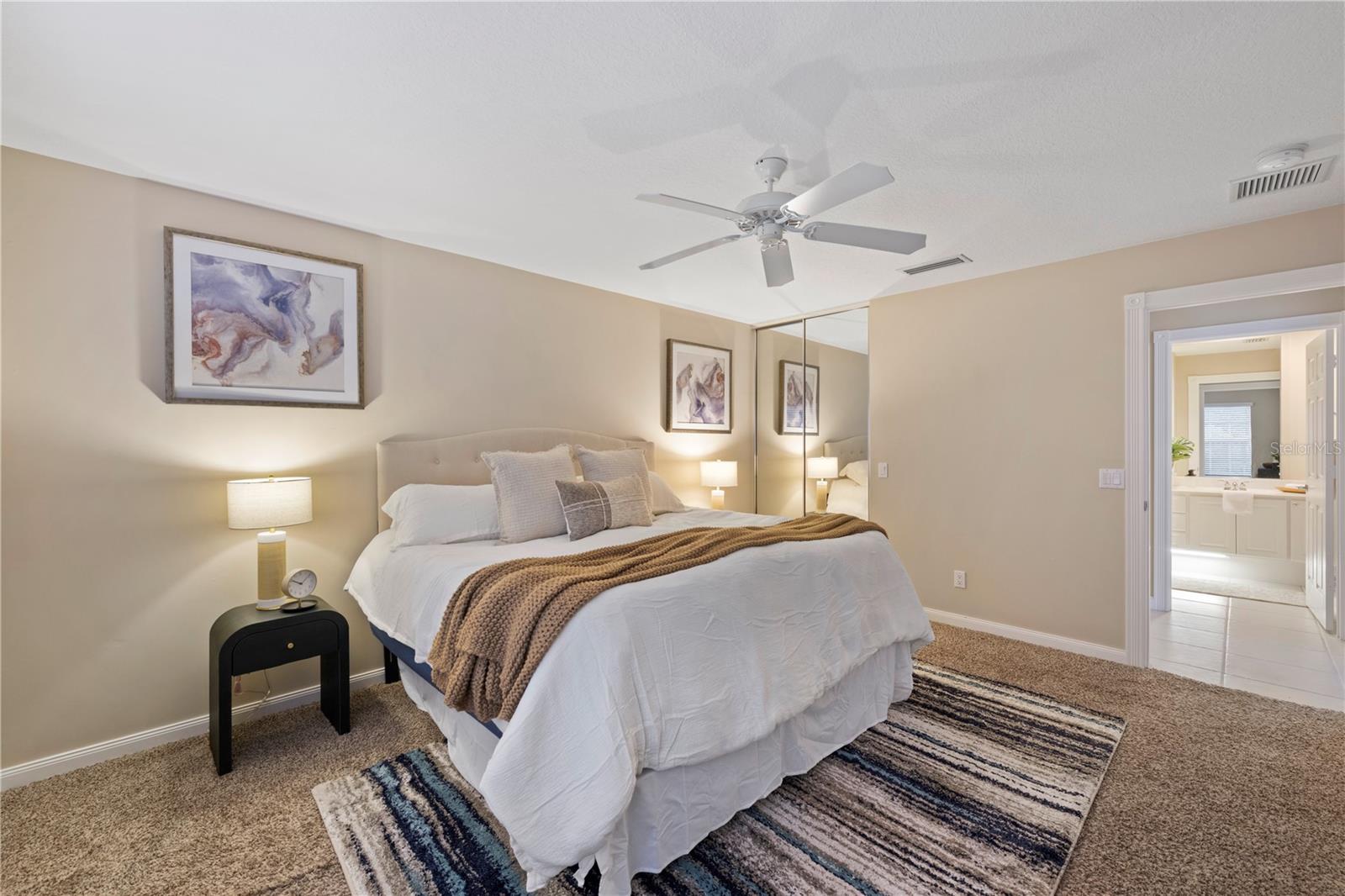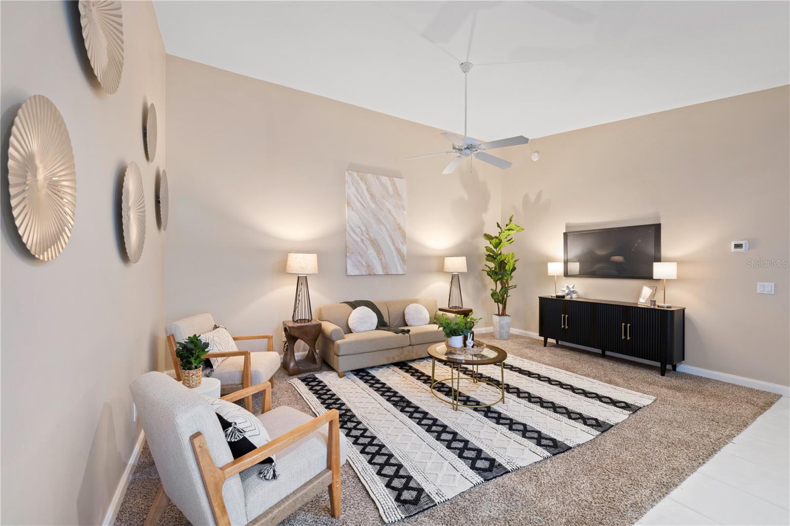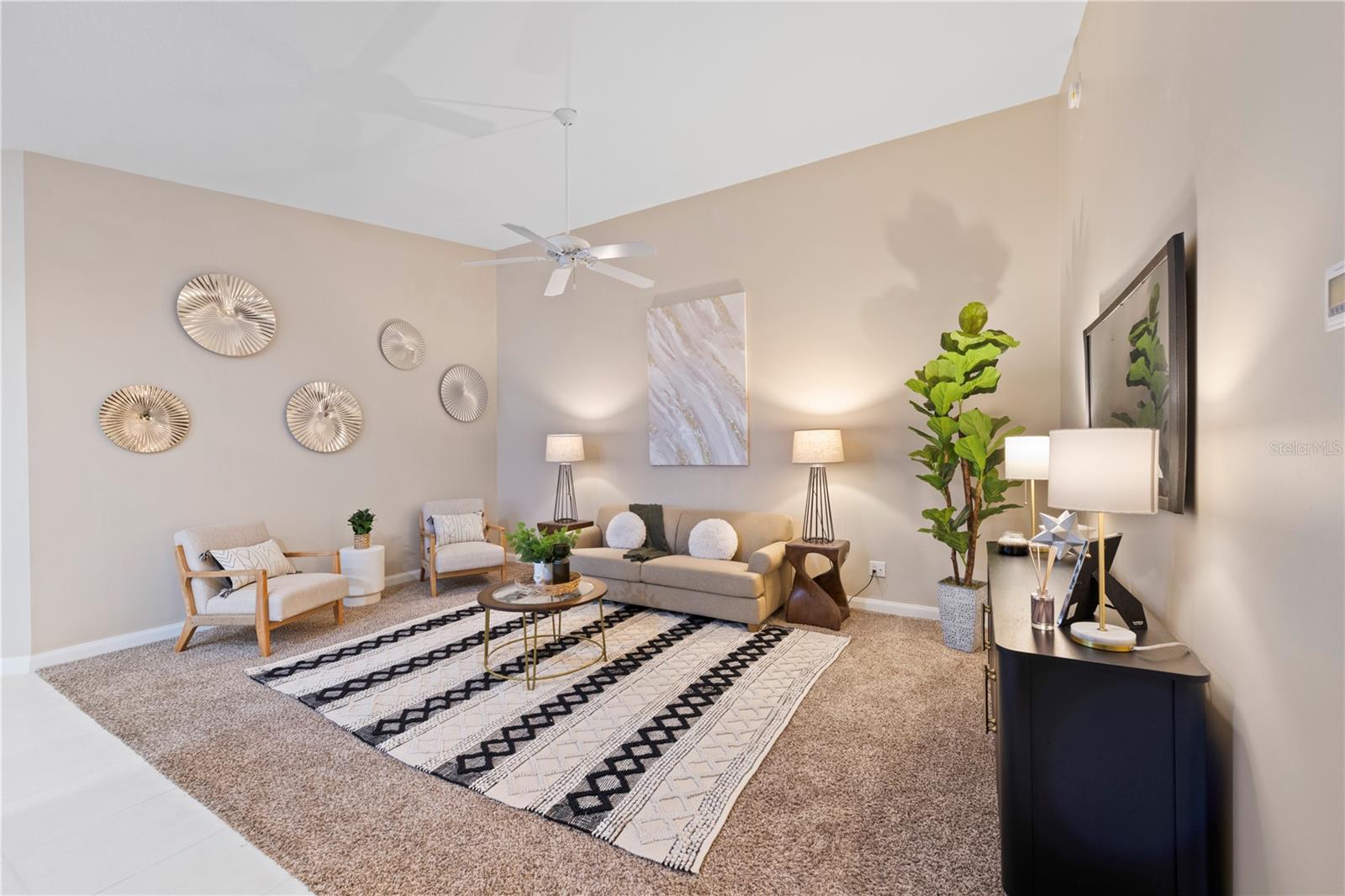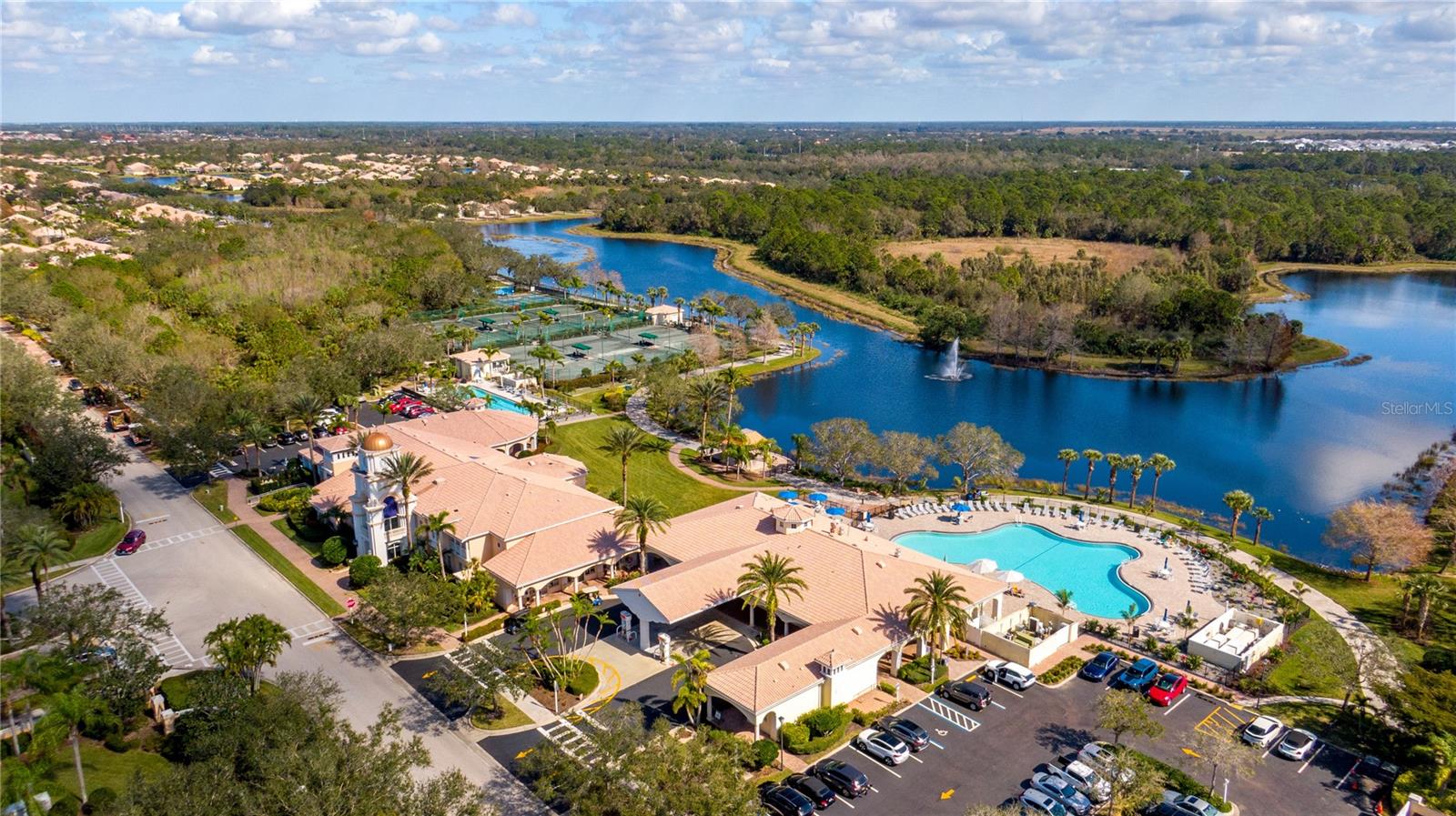 One or more photo(s) has been virtually staged. Start your next adventure here!! Impeccably maintained two bedroom, two bath villa perfectly set on a tropically landscaped lot. This well designed Capri III Villa has an open floor plan which includes a great room, dining area and open den. The great room has vaulted ceilings, carpet and neutral colors. The light and bright kitchen has plenty of cabinet space and a closet pantry. The primary bedroom has a walk in closet with built in organizers, bathroom with dual sink vanity and walk in shower. The guest bedroom has a walk in closet and full bathroom. The laundry room is well equipped with cabinets for storage and utility sink. Additional features include A/C 2020, a security system and hurricane shutters. Best of all is DiVosta's poured concrete reinforced construction for that "peace of mind". First class amenities including six har tru tennis courts, a geo thermal heated lagoon pool, a geo thermal heated lap pool, pickleball courts, and bocce ball. The clubhouse has a state of the art fitness center, event space and library. Enjoy the restaurant with bar and poolside Tiki Bar. The events calendar is full of fun activities. We have an onsite manager and event coordinator. Set on over five hundred acres of manicured grounds, great for walking and biking. A Rated School district. Close to Publix, Legacy bike trail, Costco, Siesta Key beach, doctors, dining and more.