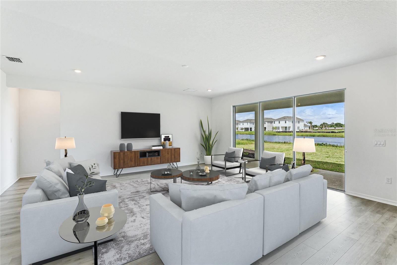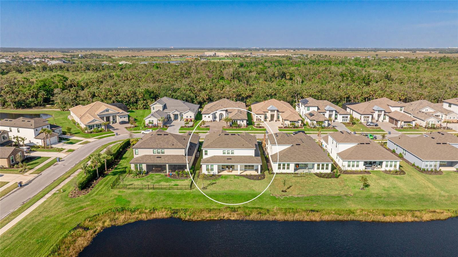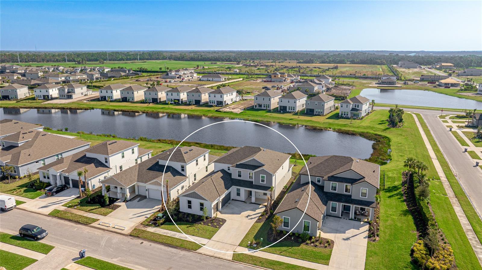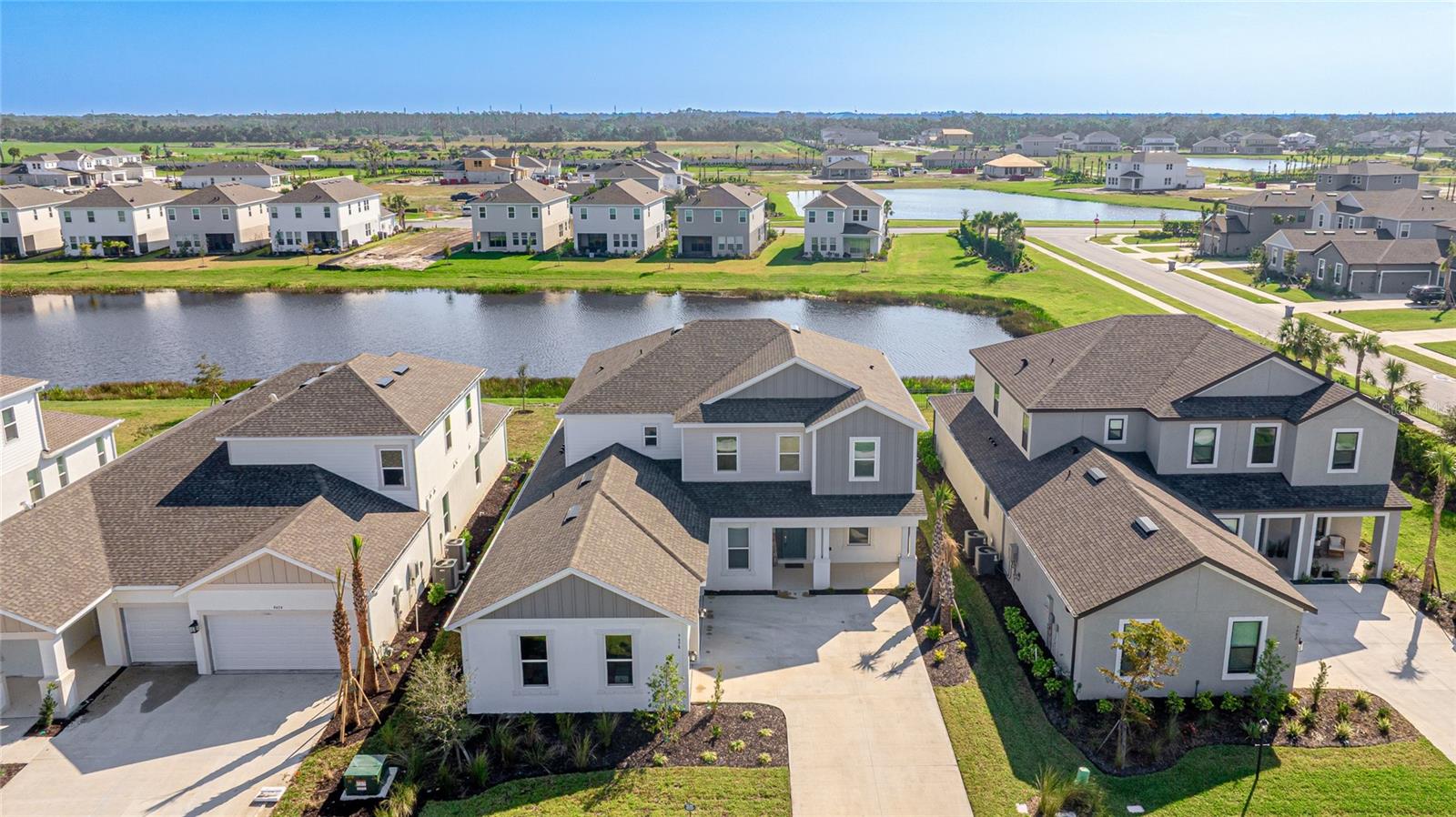 One or more photo(s) has been virtually staged. Welcome to the stunning, Sand Key model in the prestigious Skye Ranch community! Offering nearly 4,000 square feet of sophisticated lakefront living, this exceptional home features 5 bedrooms, 4.5 baths, a private office, a versatile bonus room, and a spacious 3-car side-entry garage. Why wait to build when you can enjoy this masterpiece today? From the moment you step inside, you’ll be captivated by the breathtaking grand staircase and soaring two-story foyer—an impressive introduction to the luxury that awaits. The sunlit private office, enclosed by elegant French doors, offers the perfect retreat for remote work or quiet reflection. The expansive foyer flows seamlessly into the formal dining area, with glimpses of serene lake views that set a tranquil tone throughout. Every detail has been thoughtfully curated—from the upgraded Gourmet Kitchen with GE Café appliances to the wide-plank flooring and designer tile selections. The chef’s kitchen is a true showpiece, featuring a striking center island, apron-front sink, quartz countertops, and a stylish full-height backsplash. The open-concept design effortlessly connects the kitchen to the living area and extended covered lanai—ideal for alfresco dining or relaxed gatherings with friends and family. The primary suite, conveniently located on the main floor, features private lanai access through glass sliders, inviting natural light and lake breezes. Its spa-inspired bath offers a frameless glass rain shower, Carrara tile floors, and a peaceful, modern aesthetic—a true owner’s sanctuary. A guest powder bath and a spacious laundry room with added storage complete the first level. Upstairs, nearly 1,600 additional square feet provide flexible living options, including four generously sized bedrooms—two with ensuite baths and expansive walk-in closets—and a 21’ x 19.5’ game room perfect for entertainment or relaxation. With ample space for a future pool, this home offers endless opportunities to elevate your lifestyle. Located in Skye Ranch, one of Sarasota’s premier gated communities, residents enjoy top-rated schools, scenic nature trails, and resort-style amenities including a magnificent clubhouse, multiple pools, splash pad, tennis courts, fitness center, basketball court, rock climbing wall, café, parks, and a new K–12 Skye Ranch School. Don’t miss this rare opportunity—schedule your private tour today and experience luxurious, lakefront living at its finest! Be sure to explore the 3D Matterport Interactive Tour for a full virtual experience.