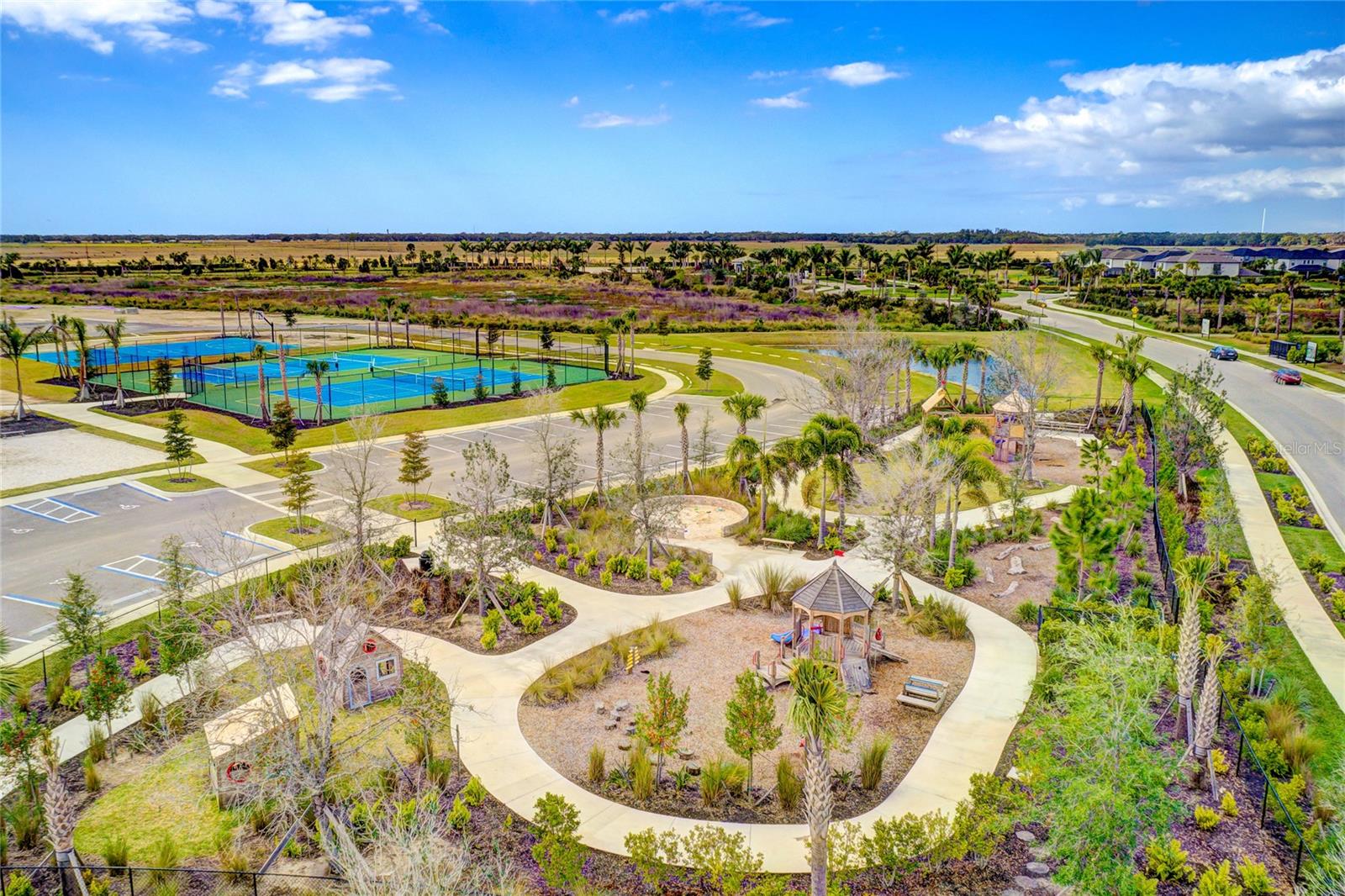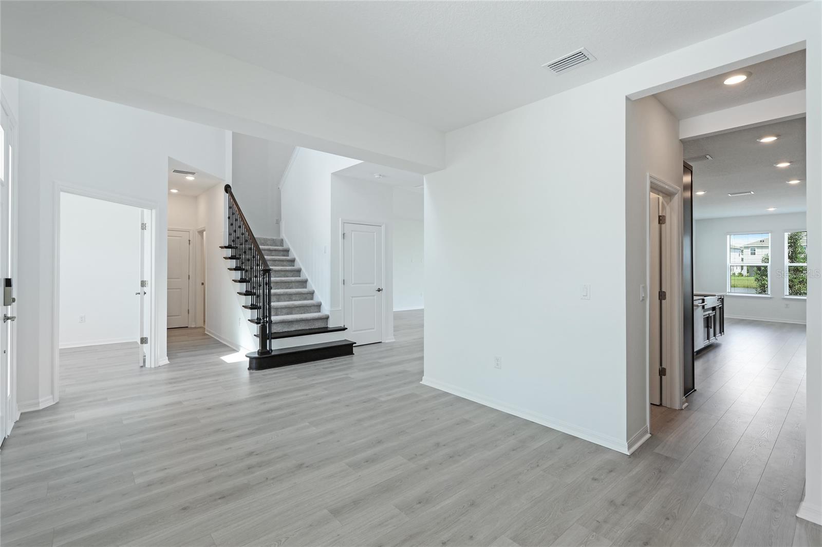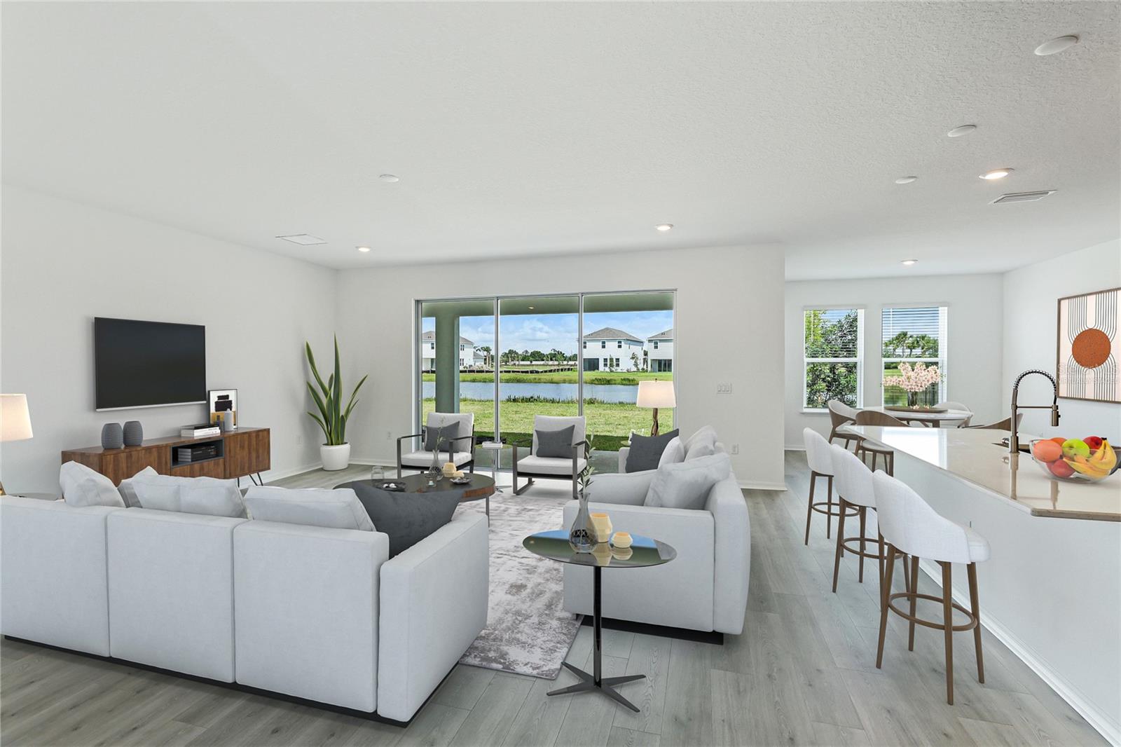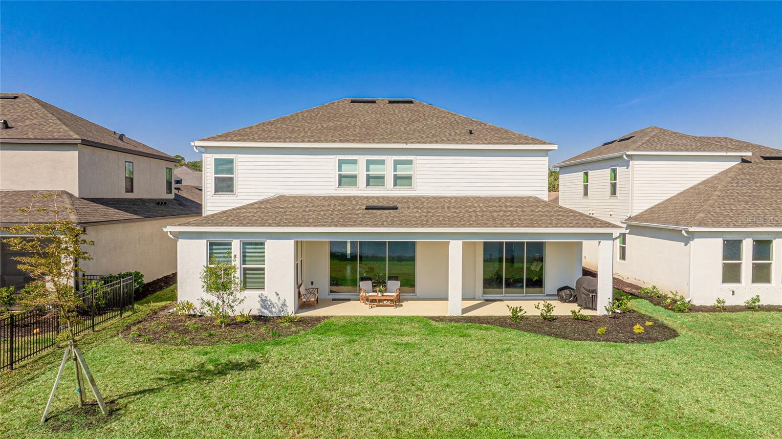 One or more photo(s) has been virtually staged. Welcome to the stunning, Sand Key model in the prestigious Skye Ranch community! Offering nearly 4,000 square feet of sophisticated lakefront living, this exceptional home features 5 bedrooms, 4.5 baths, a private office, a versatile bonus room, and a spacious 3-car side-entry garage. Why wait to build when you can enjoy this masterpiece today? From the moment you step inside, you’ll be captivated by the breathtaking grand staircase and soaring two-story foyer—an impressive introduction to the luxury that awaits. The sunlit private office, enclosed by elegant French doors, offers the perfect retreat for remote work or quiet reflection. The expansive foyer flows seamlessly into the formal dining area, with glimpses of serene lake views that set a tranquil tone throughout. Every detail has been thoughtfully curated—from the upgraded Gourmet Kitchen with GE Café appliances to the wide-plank flooring and designer tile selections. The chef’s kitchen is a true showpiece, featuring a striking center island, apron-front sink, quartz countertops, and a stylish full-height backsplash. The open-concept design effortlessly connects the kitchen to the living area and extended covered lanai—ideal for alfresco dining or relaxed gatherings with friends and family. The primary suite, conveniently located on the main floor, features private lanai access through glass sliders, inviting natural light and lake breezes. Its spa-inspired bath offers a frameless glass rain shower, Carrara tile floors, and a peaceful, modern aesthetic—a true owner’s sanctuary. A guest powder bath and a spacious laundry room with added storage complete the first level. Upstairs, nearly 1,600 additional square feet provide flexible living options, including four generously sized bedrooms—two with ensuite baths and expansive walk-in closets—and a 21’ x 19.5’ game room perfect for entertainment or relaxation. With ample space for a future pool, this home offers endless opportunities to elevate your lifestyle. Located in Skye Ranch, one of Sarasota’s premier gated communities, residents enjoy top-rated schools, scenic nature trails, and resort-style amenities including a magnificent clubhouse, multiple pools, splash pad, tennis courts, fitness center, basketball court, rock climbing wall, café, parks, and a new K–12 Skye Ranch School. Don’t miss this rare opportunity—schedule your private tour today and experience luxurious, lakefront living at its finest! Be sure to explore the 3D Matterport Interactive Tour for a full virtual experience.