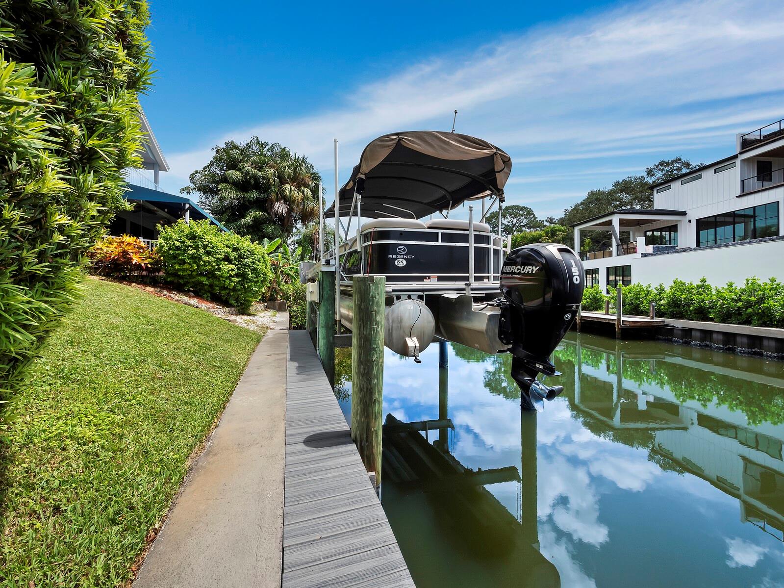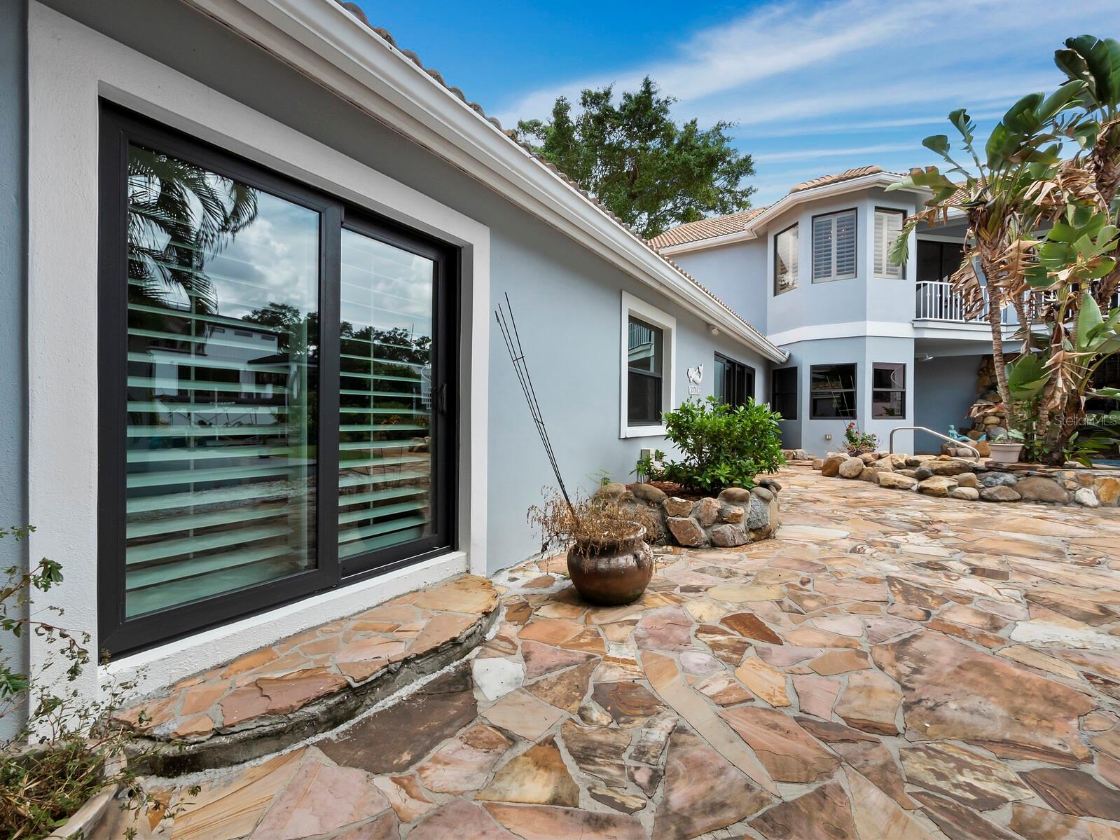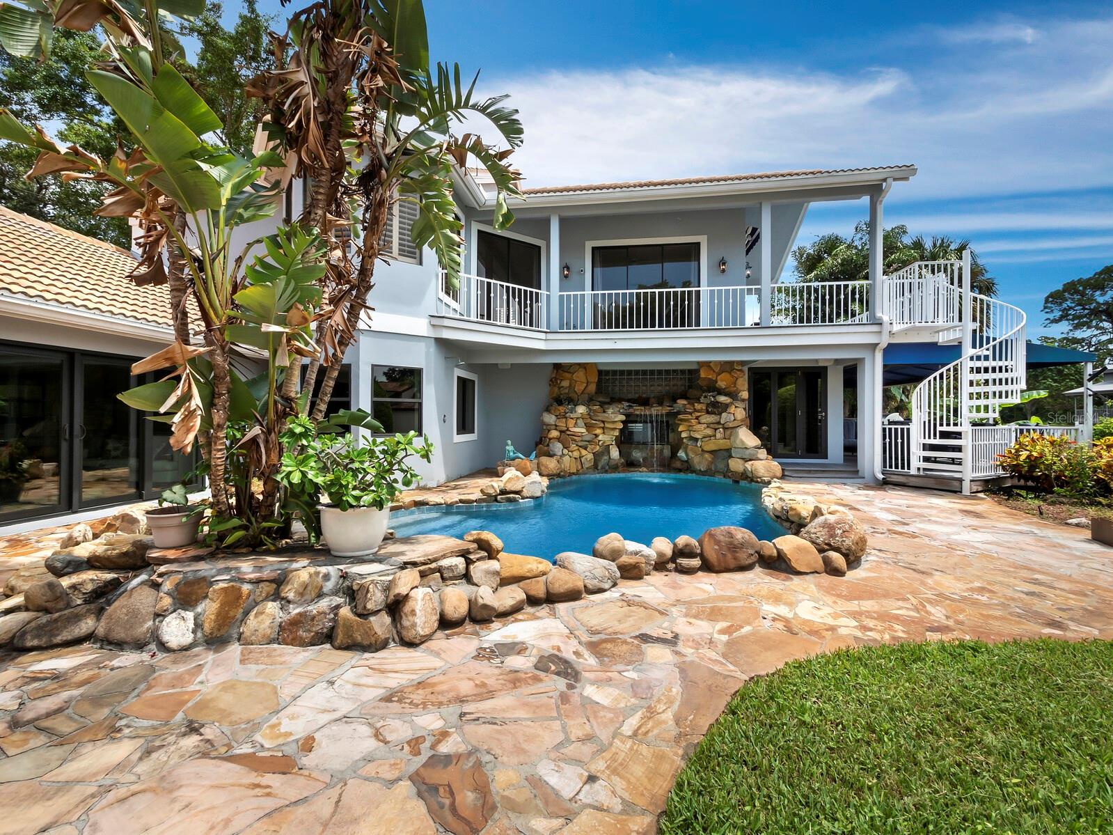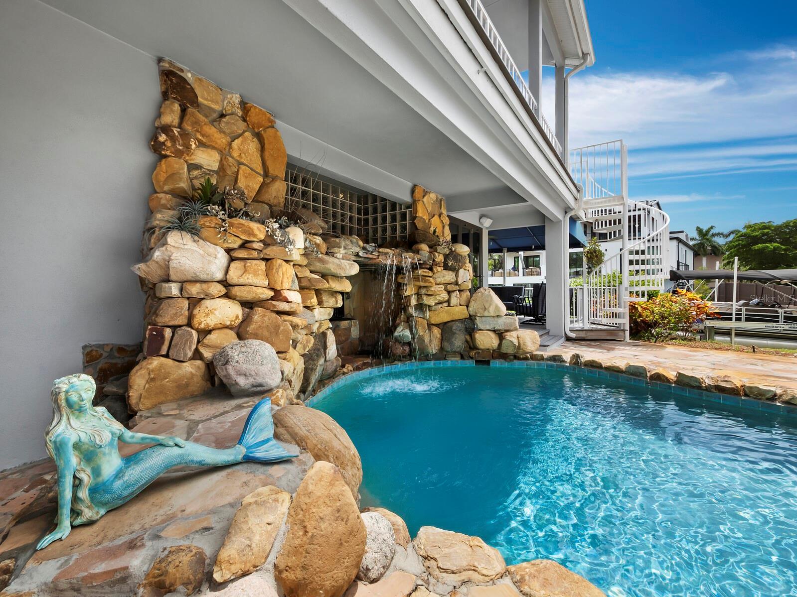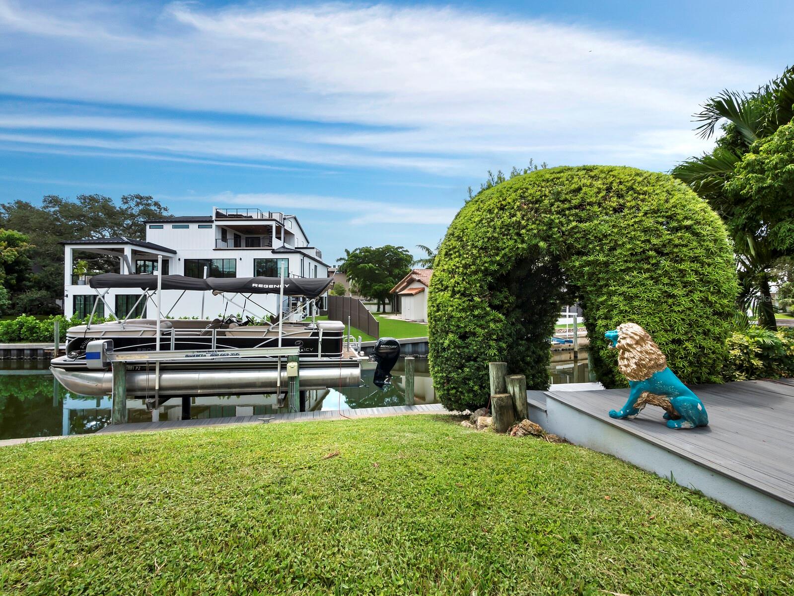 Discover unparalleled luxury in this exceptional waterfront estate, ideally located West of the Trail, offering direct bay access with no bridges. This stunning home features four spacious bedrooms and four beautifully appointed bathrooms, along with a private cabana that includes a bedroom and half bath, providing the perfect guest retreat. Designed for seamless entertaining, the home boasts a grand living area with a coffered ceiling, wet bar, wine cooler, and newly installed impact doors. The chef’s kitchen is a masterpiece, complete with vaulted ceilings, a large center island, custom wood cabinetry, an AGA induction range, and a butler’s pantry. Elegant, polished terrazzo floors flow throughout the kitchen and dining areas, adding a touch of sophistication. The expansive master suite, located on the second floor, offers a private sanctuary with a wraparound deck, sun awning, cozy fireplace, vaulted ceilings, walk-in closet, and a luxurious bath featuring a soaking tub and walk-in shower. Outdoors, the resort-style pool area is enhanced by a heated pool and spa, a rock waterfall, tropical landscaping, and a two-sided gas fireplace, perfect for relaxation and entertaining. The fully renovated dock includes water, electricity, and a 10,000-pound vertical lift, ideal for boating enthusiasts. Rest easy knowing this home was completely unaffected by the 2024 hurricane season—remaining high and dry with zero damage, ensuring peace of mind. Conveniently located near the Field Club, Red Rock Park, Publix, and premier dining, this residence combines waterfront elegance with unmatched convenience, offering the ultimate in luxury living.