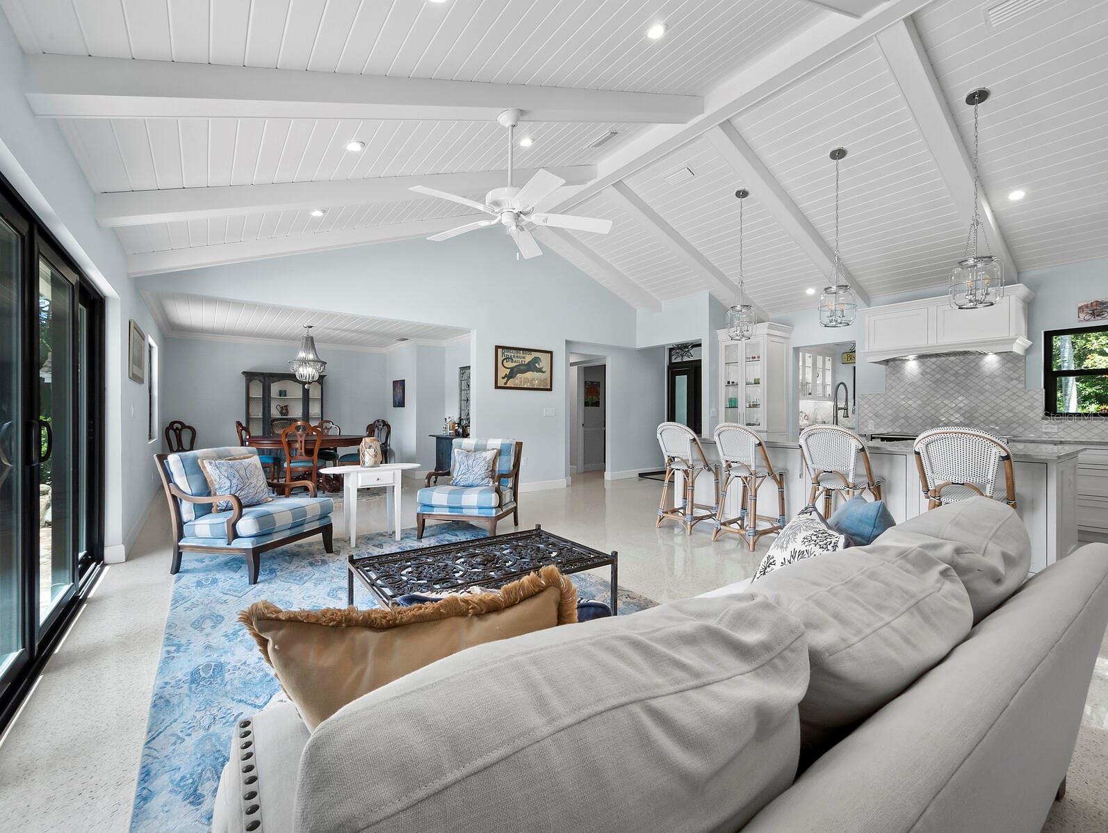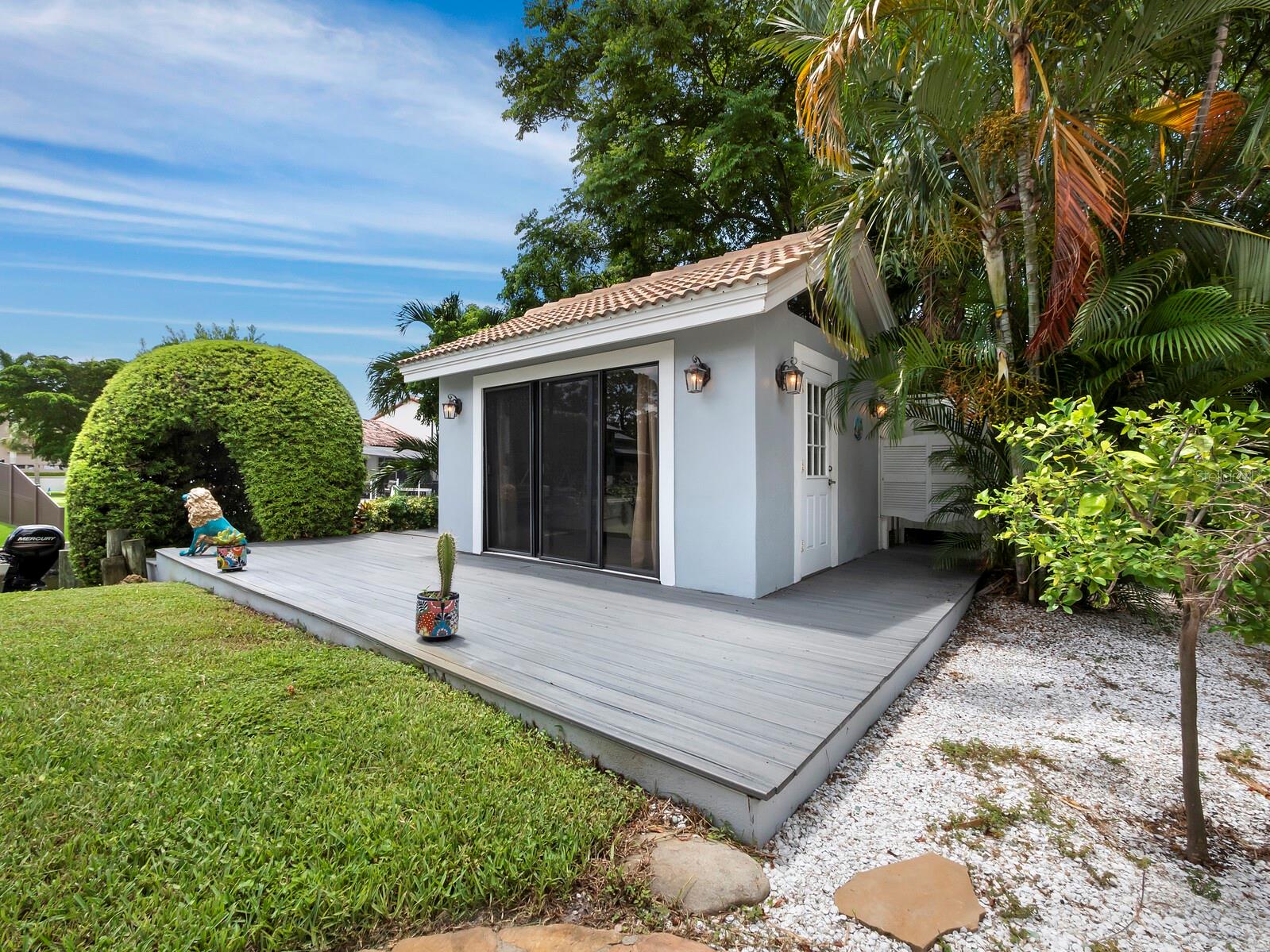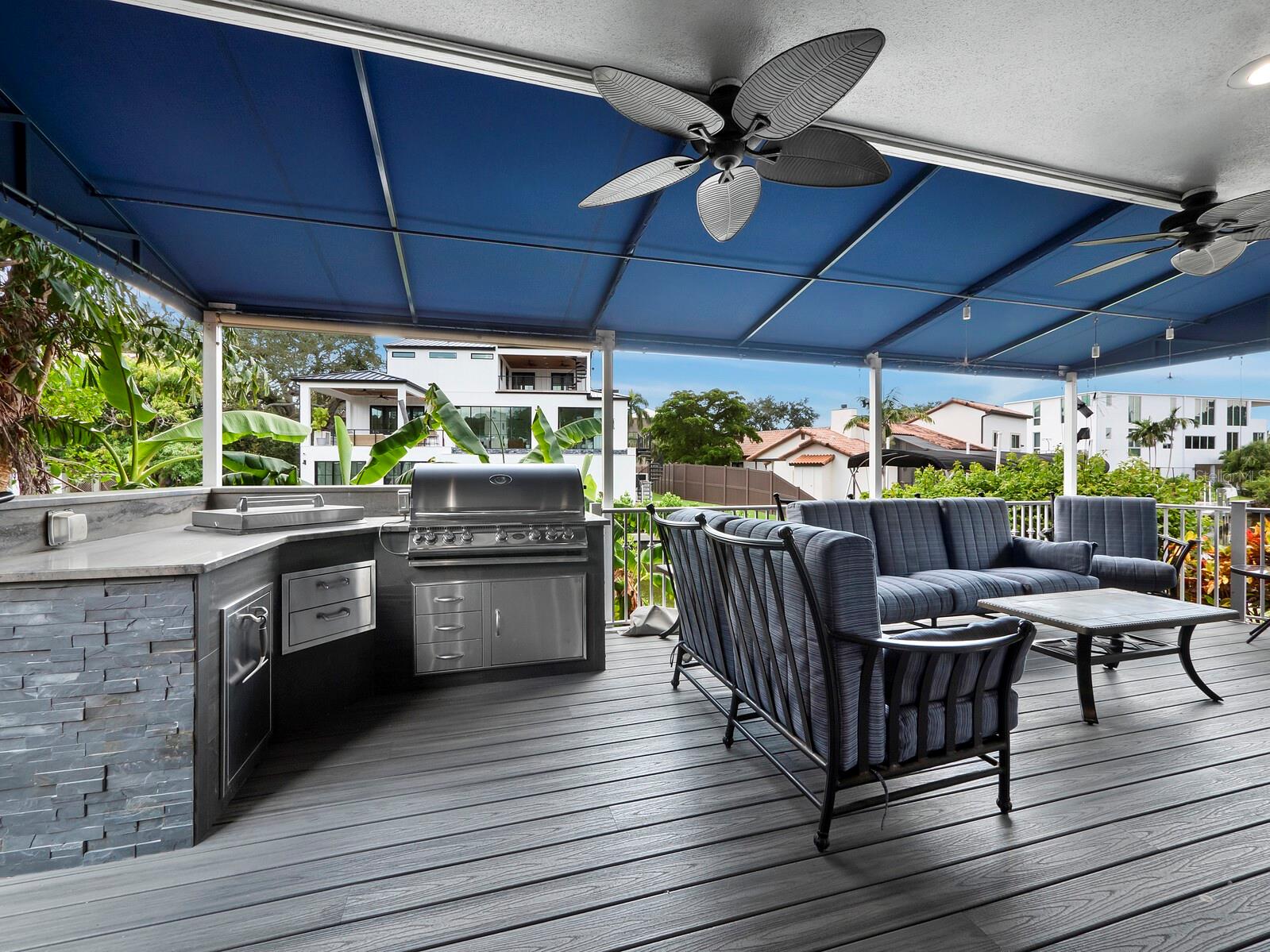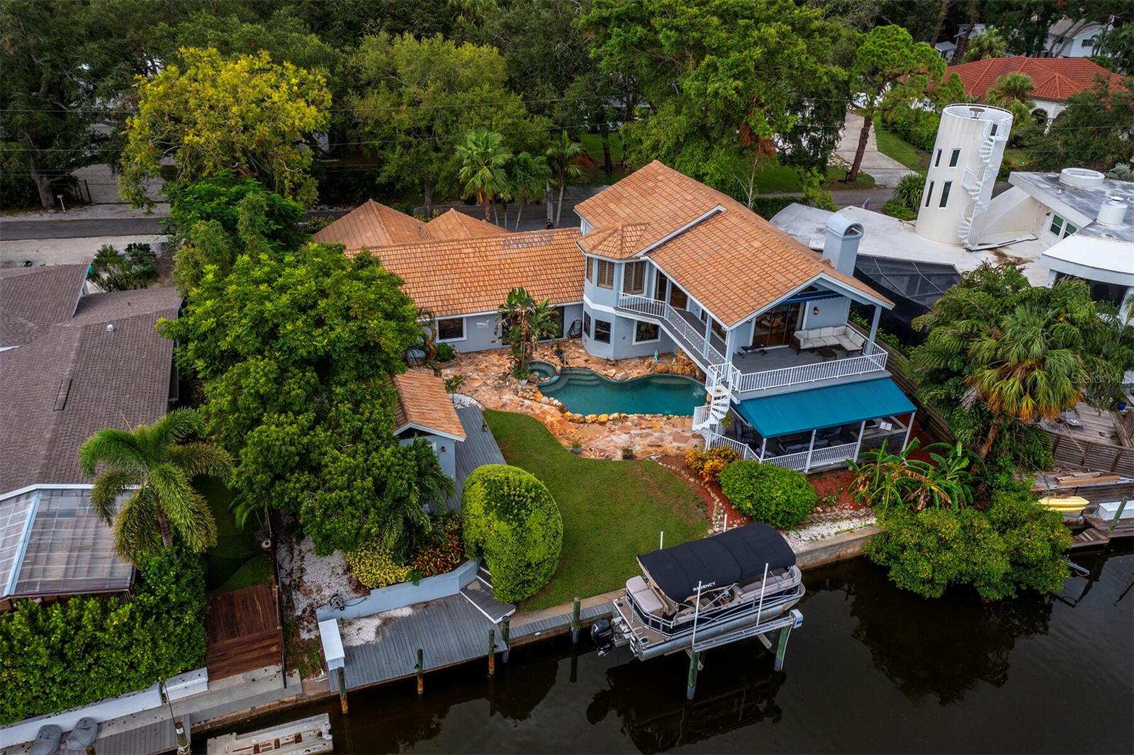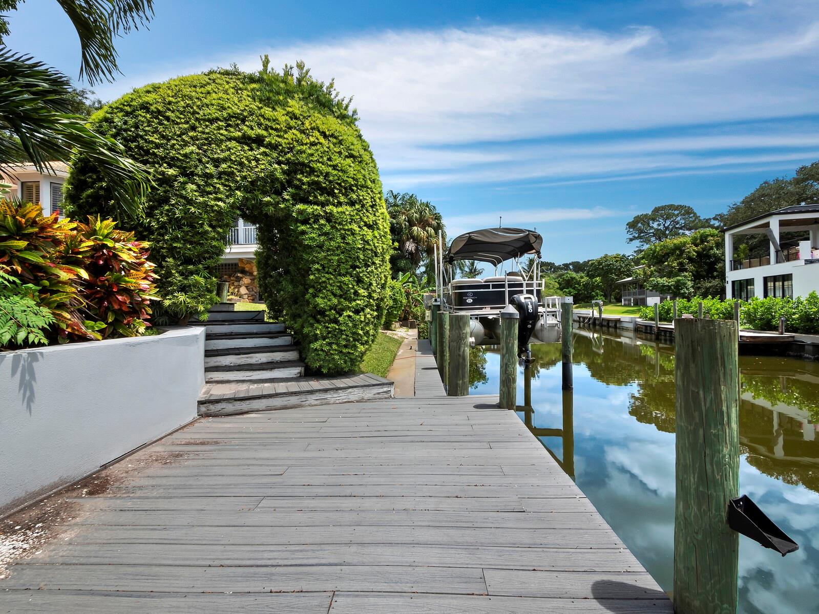 Discover unparalleled luxury in this exceptional waterfront estate, ideally located West of the Trail, offering direct bay access with no bridges. This stunning home features four spacious bedrooms and four beautifully appointed bathrooms, along with a private cabana that includes a bedroom and half bath, providing the perfect guest retreat. Designed for seamless entertaining, the home boasts a grand living area with a coffered ceiling, wet bar, wine cooler, and newly installed impact doors. The chef’s kitchen is a masterpiece, complete with vaulted ceilings, a large center island, custom wood cabinetry, an AGA induction range, and a butler’s pantry. Elegant, polished terrazzo floors flow throughout the kitchen and dining areas, adding a touch of sophistication. The expansive master suite, located on the second floor, offers a private sanctuary with a wraparound deck, sun awning, cozy fireplace, vaulted ceilings, walk-in closet, and a luxurious bath featuring a soaking tub and walk-in shower. Outdoors, the resort-style pool area is enhanced by a heated pool and spa, a rock waterfall, tropical landscaping, and a two-sided gas fireplace, perfect for relaxation and entertaining. The fully renovated dock includes water, electricity, and a 10,000-pound vertical lift, ideal for boating enthusiasts. Rest easy knowing this home was completely unaffected by the 2024 hurricane season—remaining high and dry with zero damage, ensuring peace of mind. Conveniently located near the Field Club, Red Rock Park, Publix, and premier dining, this residence combines waterfront elegance with unmatched convenience, offering the ultimate in luxury living.