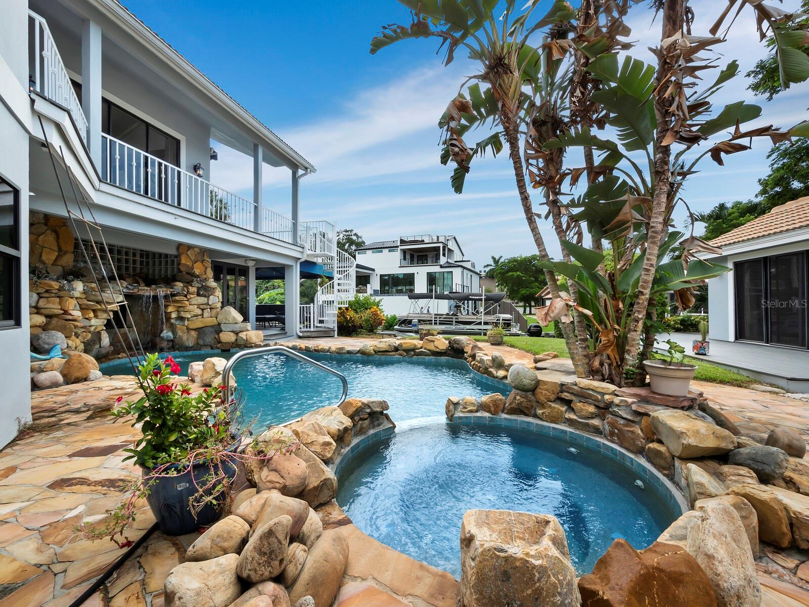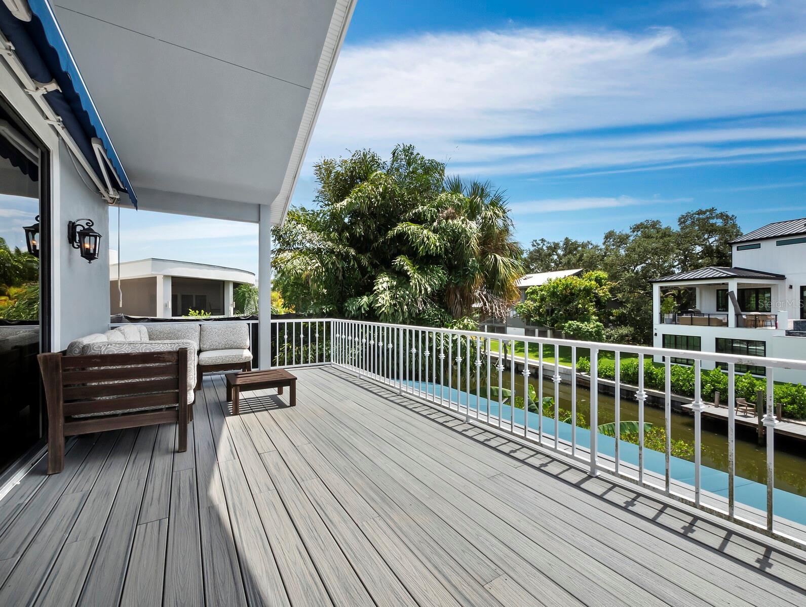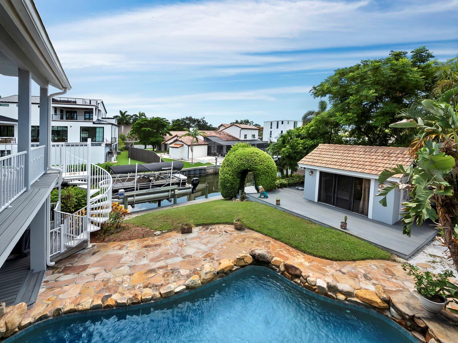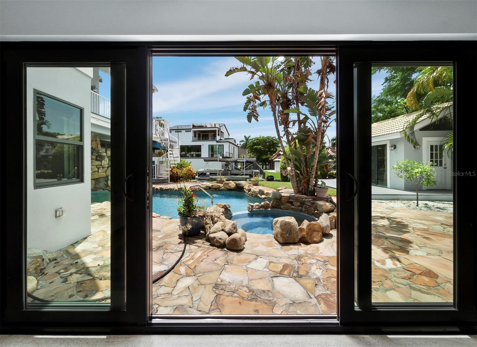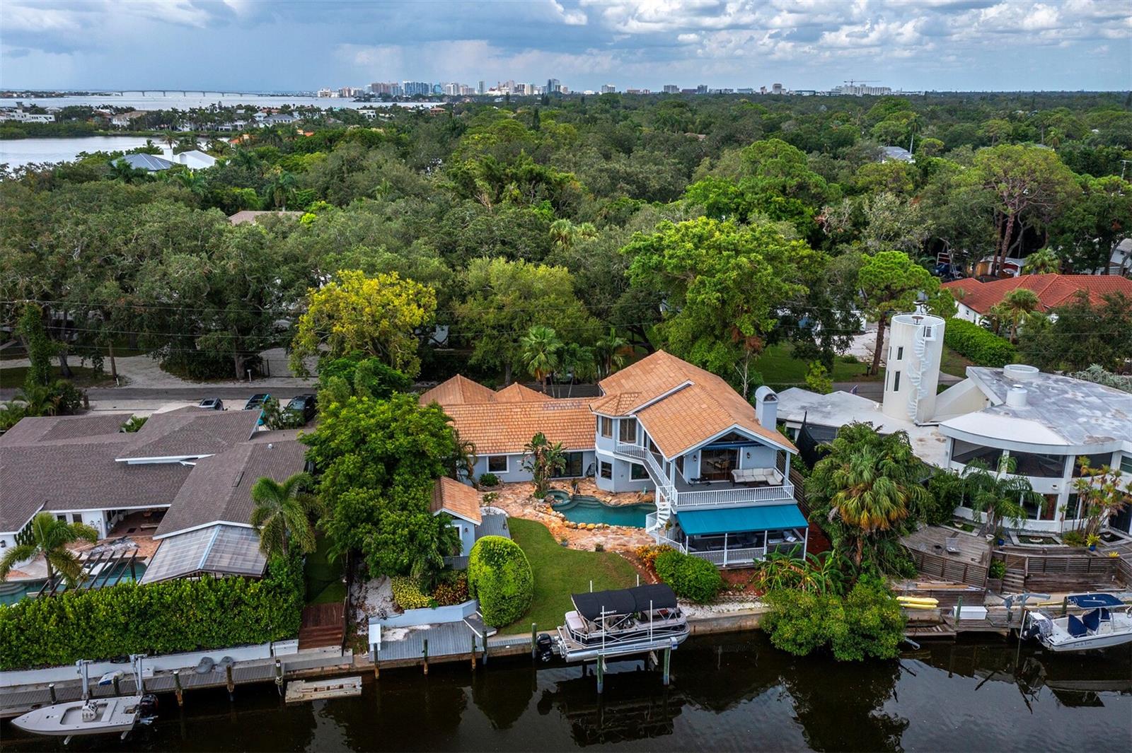 Discover unparalleled luxury in this exceptional waterfront estate, ideally located West of the Trail, offering direct bay access with no bridges. This stunning home features four spacious bedrooms and four beautifully appointed bathrooms, along with a private cabana that includes a bedroom and half bath, providing the perfect guest retreat. Designed for seamless entertaining, the home boasts a grand living area with a coffered ceiling, wet bar, wine cooler, and newly installed impact doors. The chef’s kitchen is a masterpiece, complete with vaulted ceilings, a large center island, custom wood cabinetry, an AGA induction range, and a butler’s pantry. Elegant, polished terrazzo floors flow throughout the kitchen and dining areas, adding a touch of sophistication. The expansive master suite, located on the second floor, offers a private sanctuary with a wraparound deck, sun awning, cozy fireplace, vaulted ceilings, walk-in closet, and a luxurious bath featuring a soaking tub and walk-in shower. Outdoors, the resort-style pool area is enhanced by a heated pool and spa, a rock waterfall, tropical landscaping, and a two-sided gas fireplace, perfect for relaxation and entertaining. The fully renovated dock includes water, electricity, and a 10,000-pound vertical lift, ideal for boating enthusiasts. Rest easy knowing this home was completely unaffected by the 2024 hurricane season—remaining high and dry with zero damage, ensuring peace of mind. Conveniently located near the Field Club, Red Rock Park, Publix, and premier dining, this residence combines waterfront elegance with unmatched convenience, offering the ultimate in luxury living.