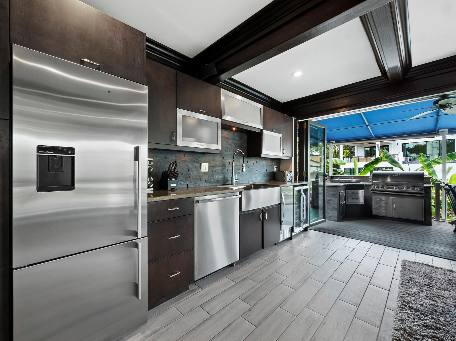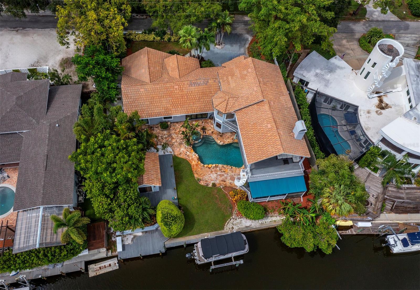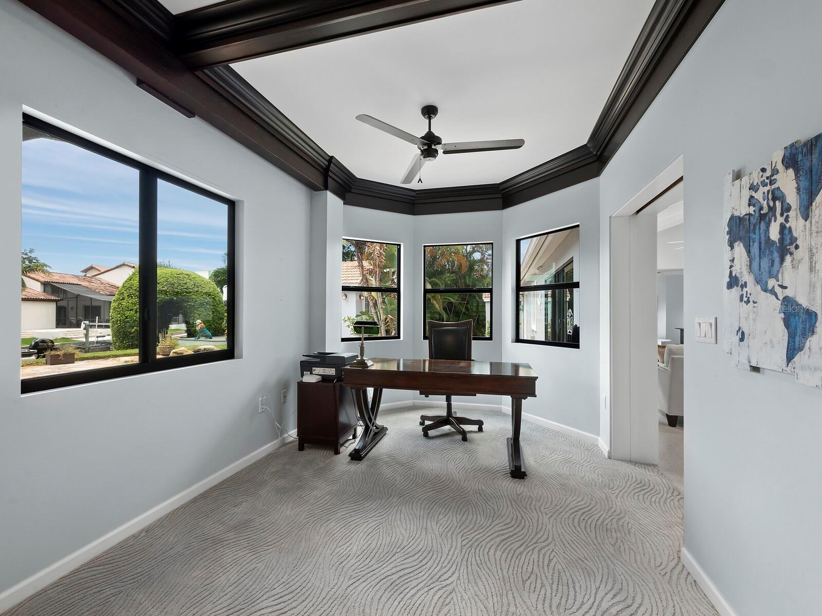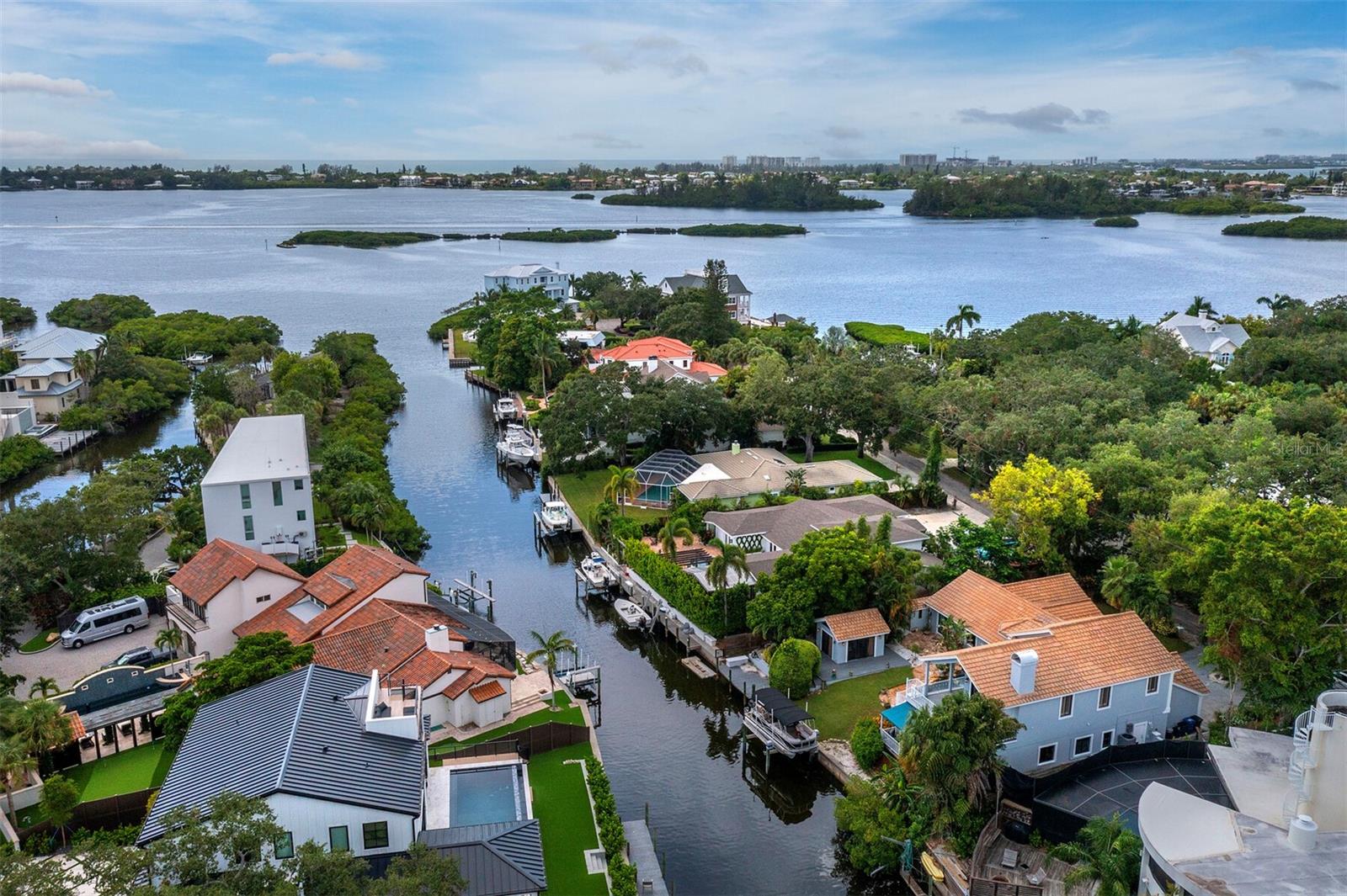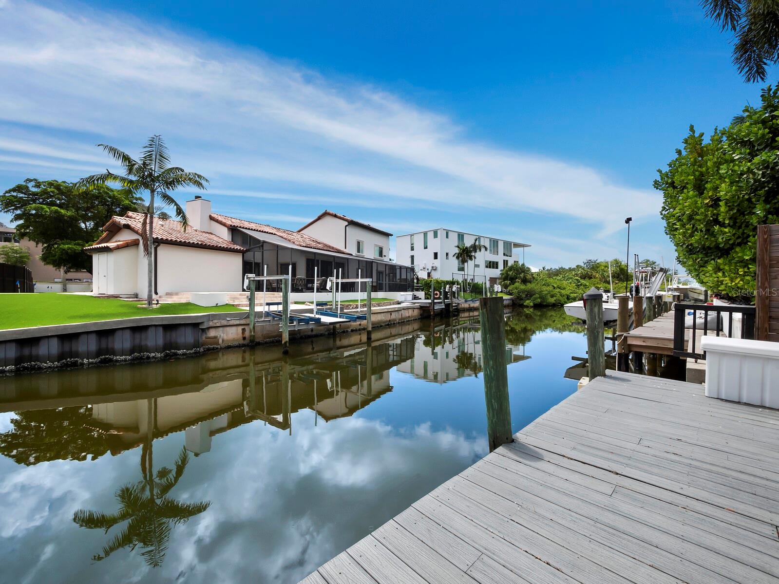 Discover unparalleled luxury in this exceptional waterfront estate, ideally located West of the Trail, offering direct bay access with no bridges. This stunning home features four spacious bedrooms and four beautifully appointed bathrooms, along with a private cabana that includes a bedroom and half bath, providing the perfect guest retreat. Designed for seamless entertaining, the home boasts a grand living area with a coffered ceiling, wet bar, wine cooler, and newly installed impact doors. The chef’s kitchen is a masterpiece, complete with vaulted ceilings, a large center island, custom wood cabinetry, an AGA induction range, and a butler’s pantry. Elegant, polished terrazzo floors flow throughout the kitchen and dining areas, adding a touch of sophistication. The expansive master suite, located on the second floor, offers a private sanctuary with a wraparound deck, sun awning, cozy fireplace, vaulted ceilings, walk-in closet, and a luxurious bath featuring a soaking tub and walk-in shower. Outdoors, the resort-style pool area is enhanced by a heated pool and spa, a rock waterfall, tropical landscaping, and a two-sided gas fireplace, perfect for relaxation and entertaining. The fully renovated dock includes water, electricity, and a 10,000-pound vertical lift, ideal for boating enthusiasts. Rest easy knowing this home was completely unaffected by the 2024 hurricane season—remaining high and dry with zero damage, ensuring peace of mind. Conveniently located near the Field Club, Red Rock Park, Publix, and premier dining, this residence combines waterfront elegance with unmatched convenience, offering the ultimate in luxury living.