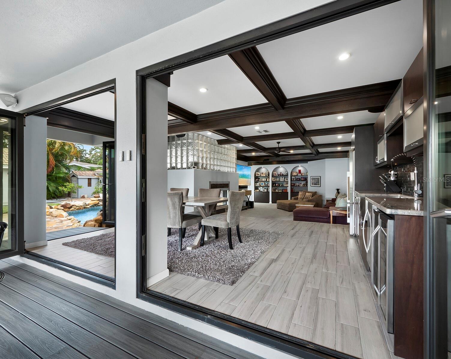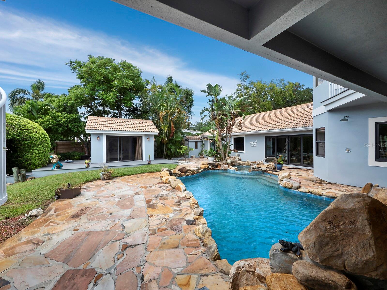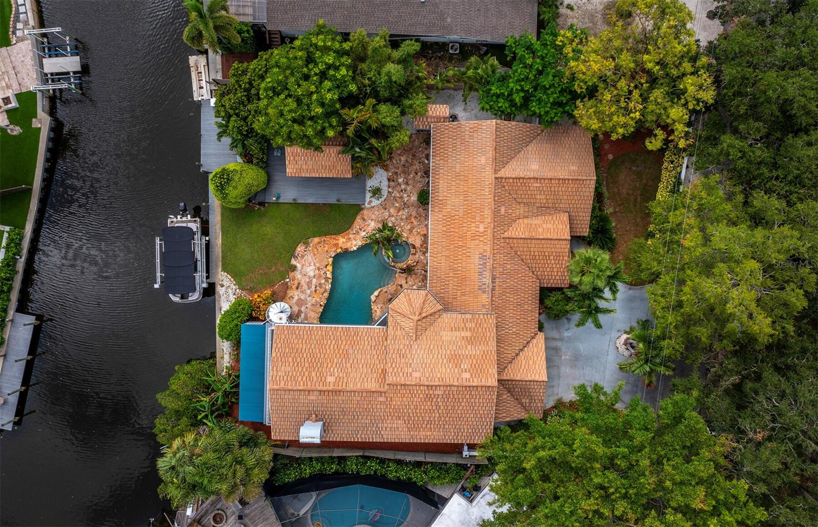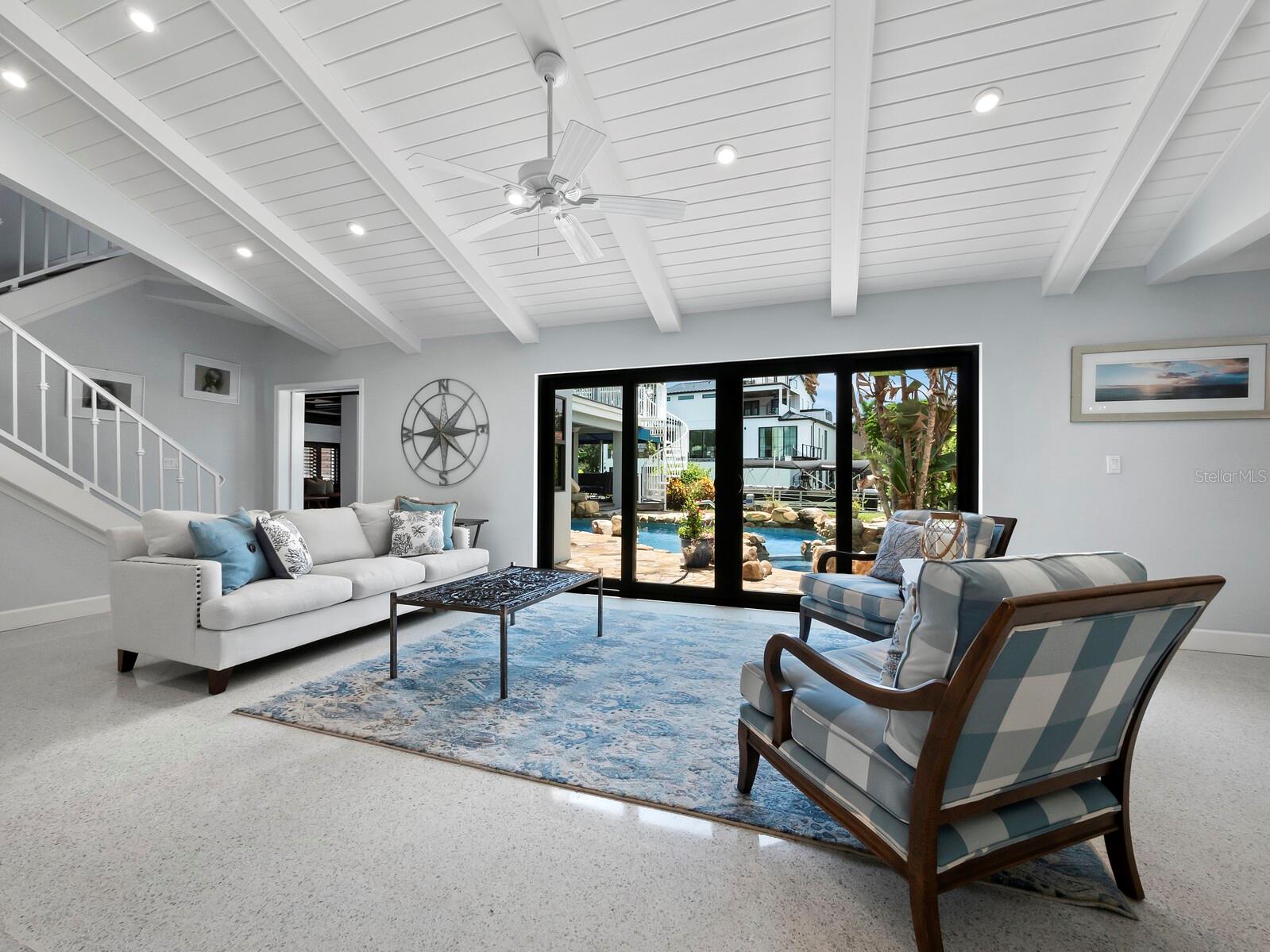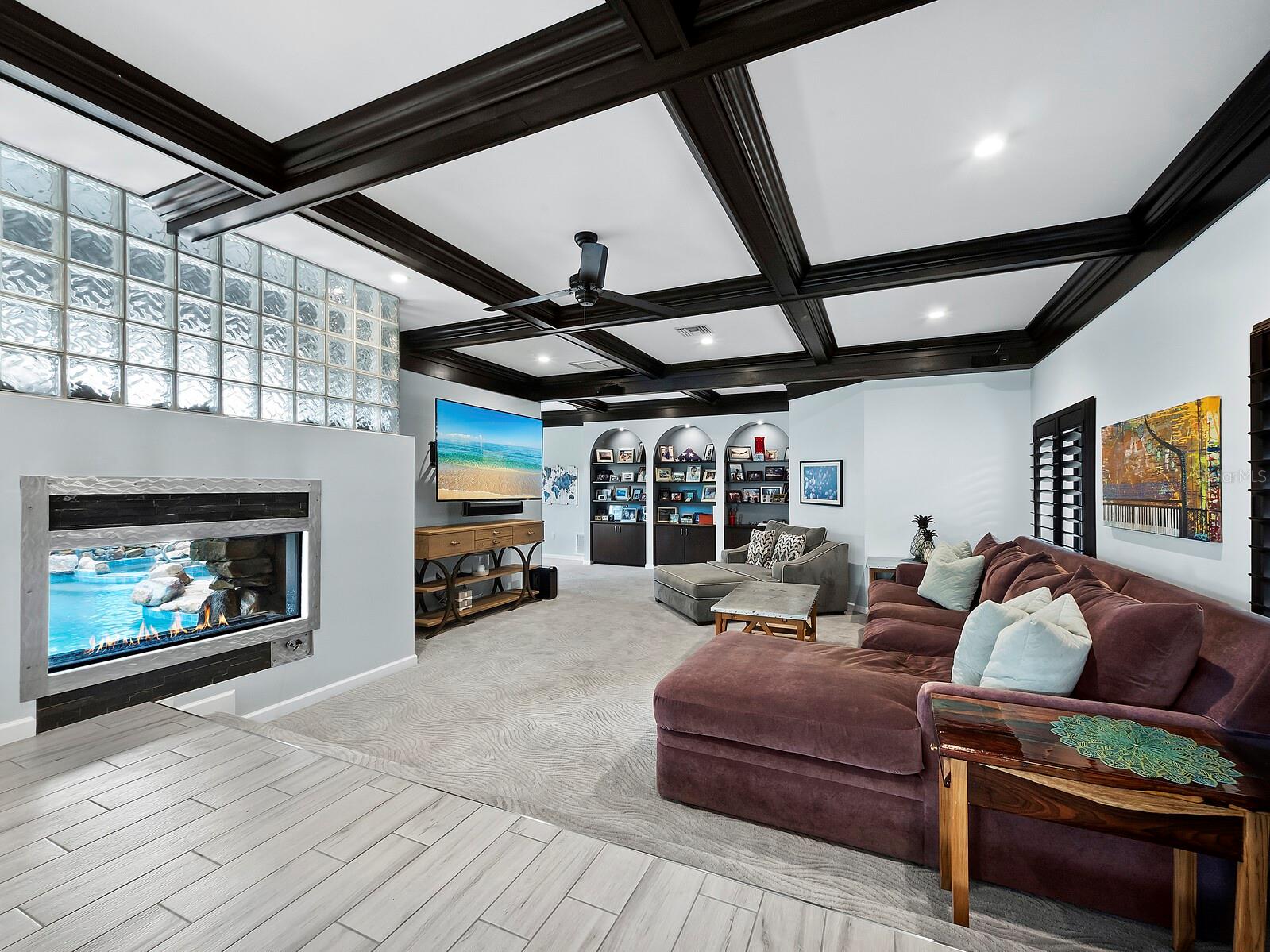 Discover unparalleled luxury in this exceptional waterfront estate, ideally located West of the Trail, offering direct bay access with no bridges. This stunning home features four spacious bedrooms and four beautifully appointed bathrooms, along with a private cabana that includes a bedroom and half bath, providing the perfect guest retreat. Designed for seamless entertaining, the home boasts a grand living area with a coffered ceiling, wet bar, wine cooler, and newly installed impact doors. The chef’s kitchen is a masterpiece, complete with vaulted ceilings, a large center island, custom wood cabinetry, an AGA induction range, and a butler’s pantry. Elegant, polished terrazzo floors flow throughout the kitchen and dining areas, adding a touch of sophistication. The expansive master suite, located on the second floor, offers a private sanctuary with a wraparound deck, sun awning, cozy fireplace, vaulted ceilings, walk-in closet, and a luxurious bath featuring a soaking tub and walk-in shower. Outdoors, the resort-style pool area is enhanced by a heated pool and spa, a rock waterfall, tropical landscaping, and a two-sided gas fireplace, perfect for relaxation and entertaining. The fully renovated dock includes water, electricity, and a 10,000-pound vertical lift, ideal for boating enthusiasts. Rest easy knowing this home was completely unaffected by the 2024 hurricane season—remaining high and dry with zero damage, ensuring peace of mind. Conveniently located near the Field Club, Red Rock Park, Publix, and premier dining, this residence combines waterfront elegance with unmatched convenience, offering the ultimate in luxury living.