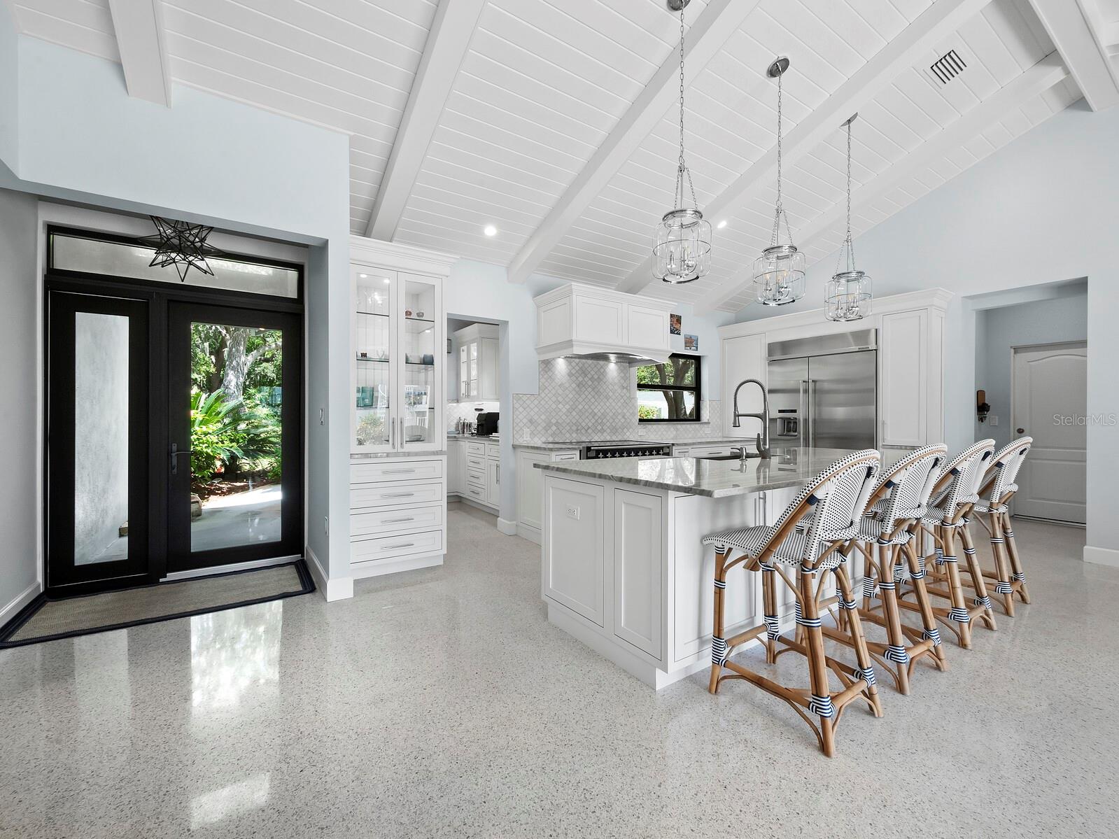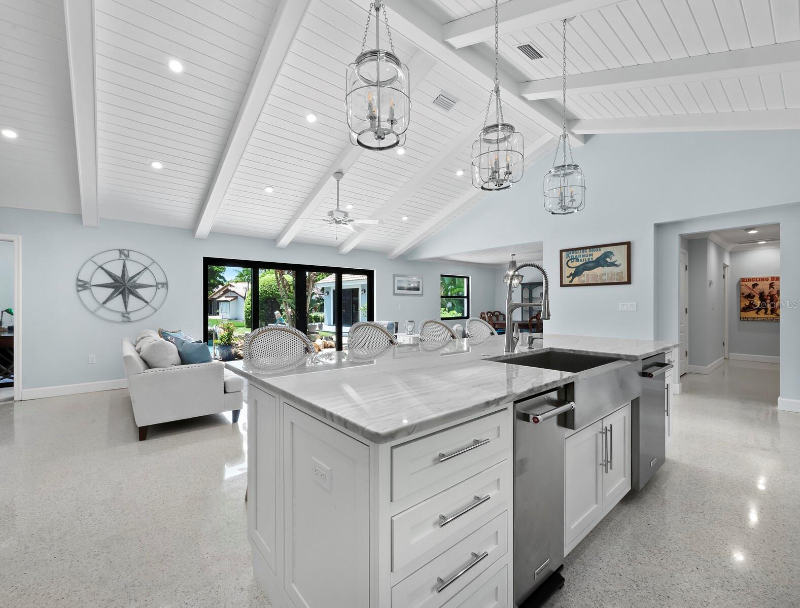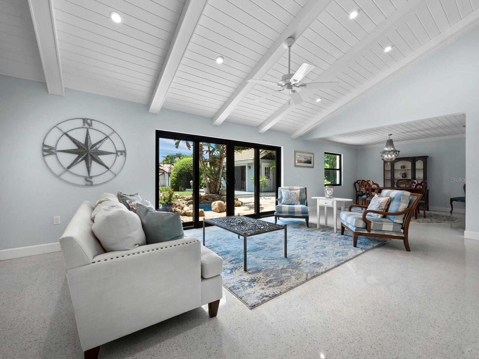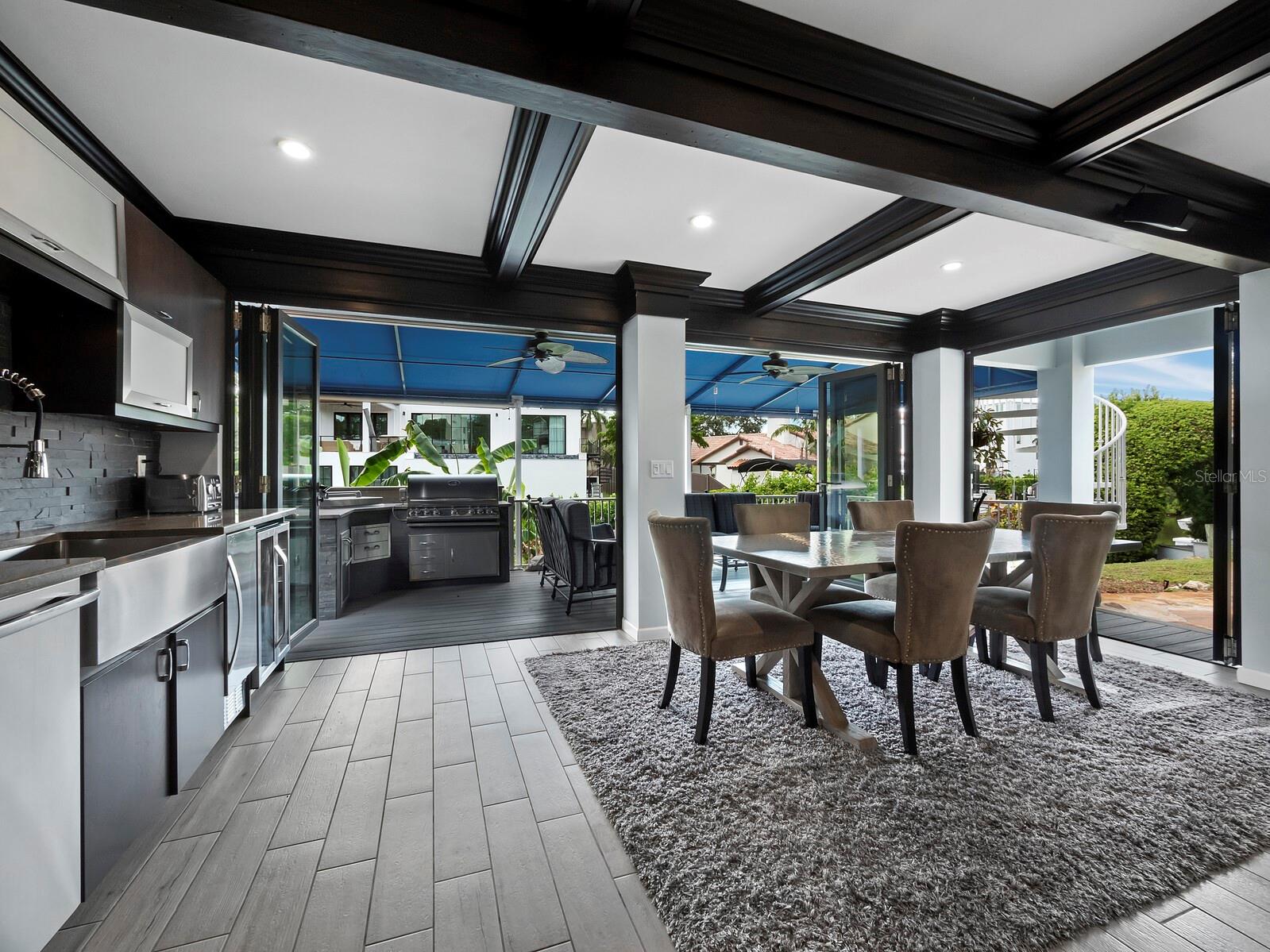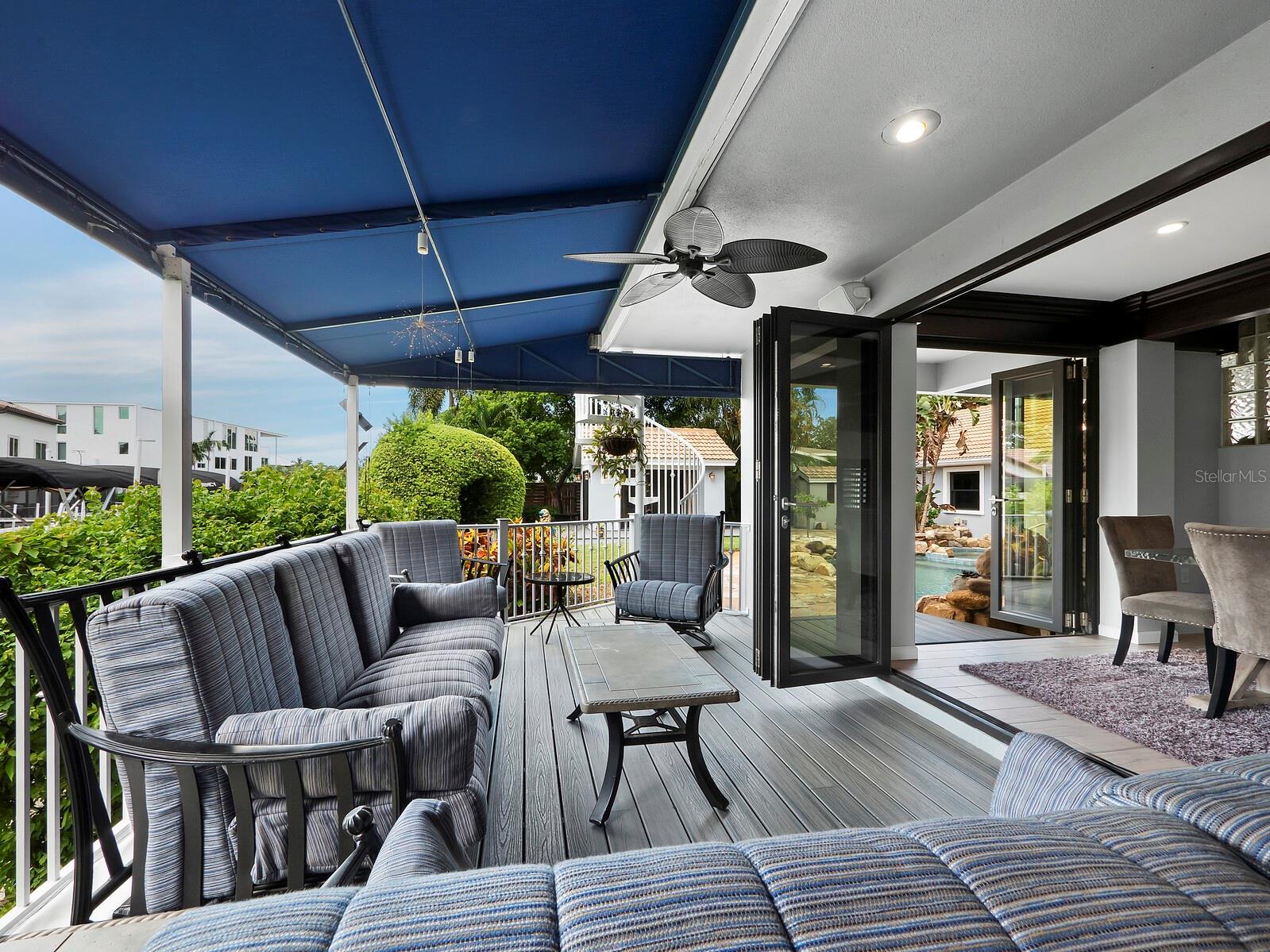Discover unparalleled luxury in this exceptional waterfront estate, ideally located West of the Trail, offering direct bay access with no bridges. This stunning home features four spacious bedrooms and four beautifully appointed bathrooms, along with a private cabana that includes a bedroom and half bath, providing the perfect guest retreat. Designed for seamless entertaining, the home boasts a grand living area with a coffered ceiling, wet bar, wine cooler, and newly installed impact doors. The chef’s kitchen is a masterpiece, complete with vaulted ceilings, a large center island, custom wood cabinetry, an AGA induction range, and a butler’s pantry. Elegant, polished terrazzo floors flow throughout the kitchen and dining areas, adding a touch of sophistication. The expansive master suite, located on the second floor, offers a private sanctuary with a wraparound deck, sun awning, cozy fireplace, vaulted ceilings, walk-in closet, and a luxurious bath featuring a soaking tub and walk-in shower. Outdoors, the resort-style pool area is enhanced by a heated pool and spa, a rock waterfall, tropical landscaping, and a two-sided gas fireplace, perfect for relaxation and entertaining. The fully renovated dock includes water, electricity, and a 10,000-pound vertical lift, ideal for boating enthusiasts. Rest easy knowing this home was completely unaffected by the 2024 hurricane season—remaining high and dry with zero damage, ensuring peace of mind. Conveniently located near the Field Club, Red Rock Park, Publix, and premier dining, this residence combines waterfront elegance with unmatched convenience, offering the ultimate in luxury living.