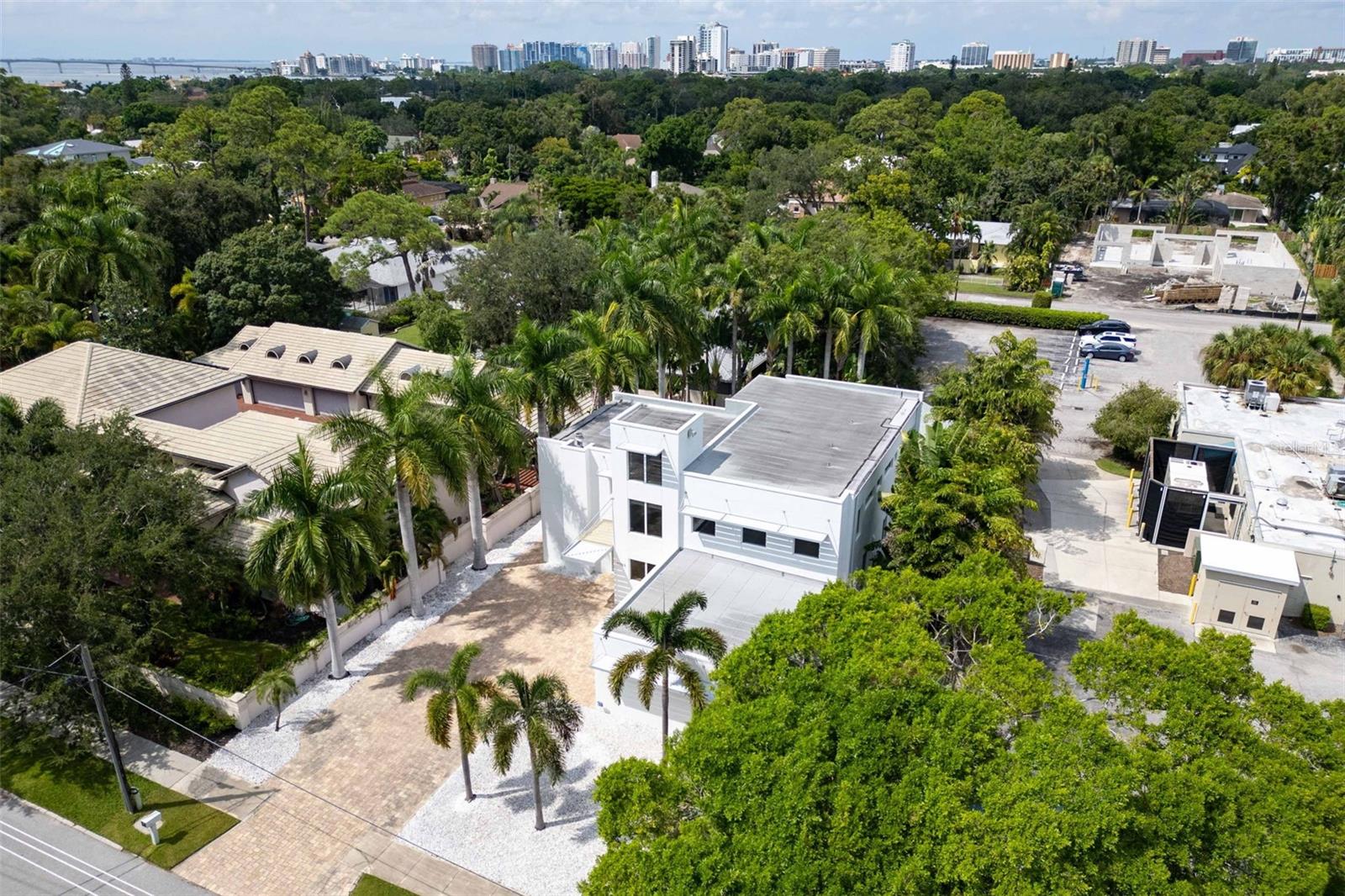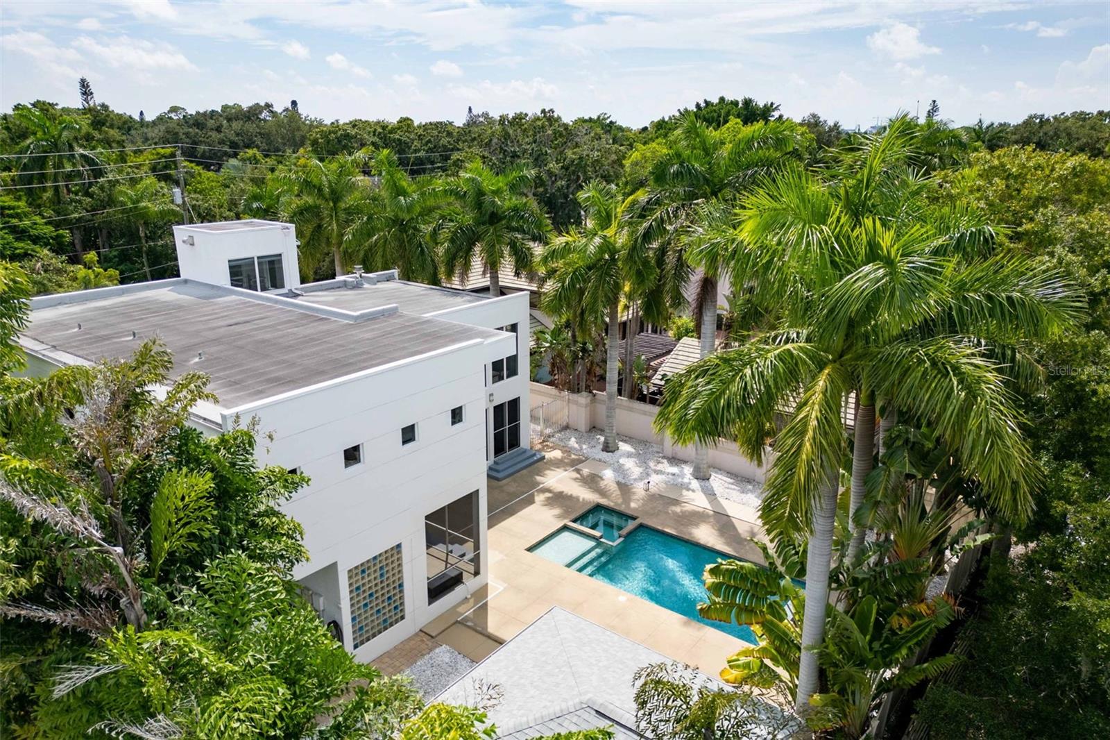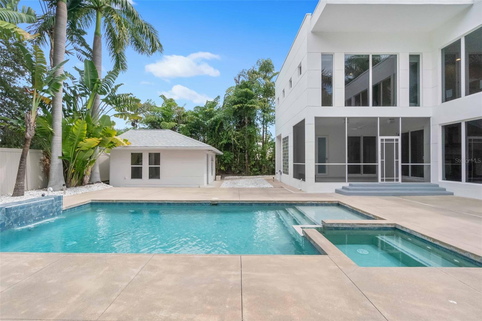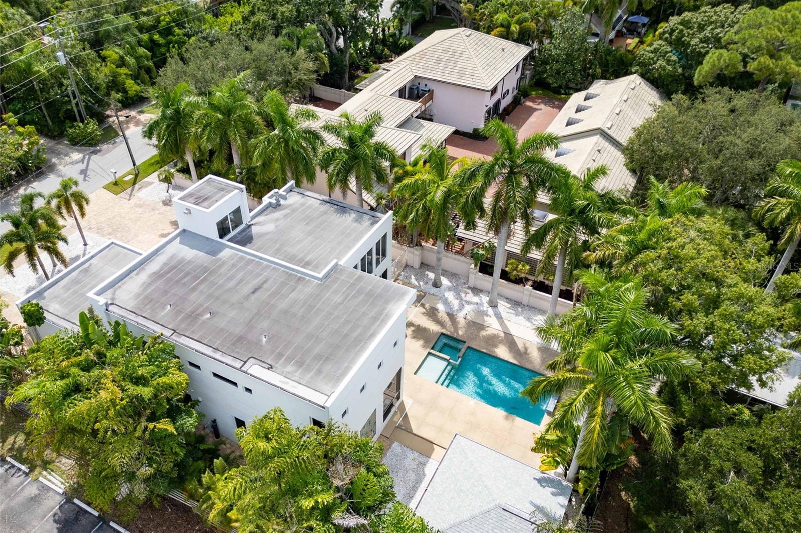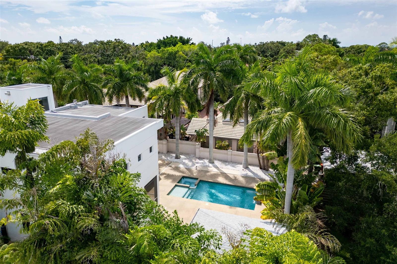 Discover an unparalleled blend of modern luxury and prime location with this stunning West of Trail home, built in 2006. Offering nearly 3,900 square feet of meticulously designed living space, this residence is just one block from Southside Village, where you’ll find top-tier dining, shopping, and the renowned Morton’s Market right at your doorstep. Step inside to find a spacious 3,435 sq. ft. main residence featuring 3 bedrooms, 3.5 bathrooms, and a breathtaking two-story great room bathed in soft northern light, with expansive windows overlooking the pool. The contemporary gourmet kitchen is a chef’s dream, complete with sleek Lube cabinets from Italy, a 48" Jenn-Air gas range with double ovens, and a wet bar, making it perfect for entertaining. Step outside to your private oasis, where a covered, screened lanai with a cozy gas fireplace opens up to the resort-style pool and expansive deck. A separate 400 sq. ft. guest room with a full bath provides an ideal retreat for visitors or can be used as your personal sanctuary or home office. Built with durability in mind, this home features concrete block construction all the way to the top and impact-resistant windows and doors throughout. Located in one of Sarasota’s most desirable neighborhoods, this home offers the perfect balance of luxurious living and unbeatable city convenience. Don’t miss this rare opportunity!