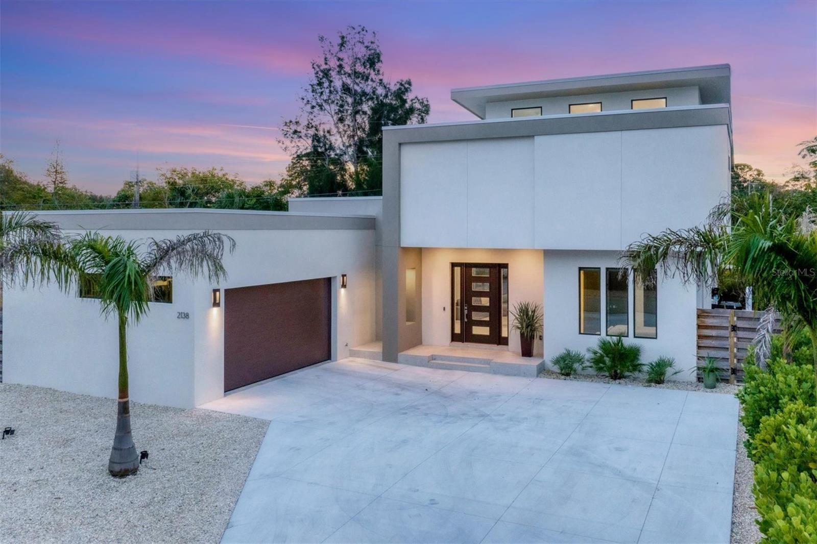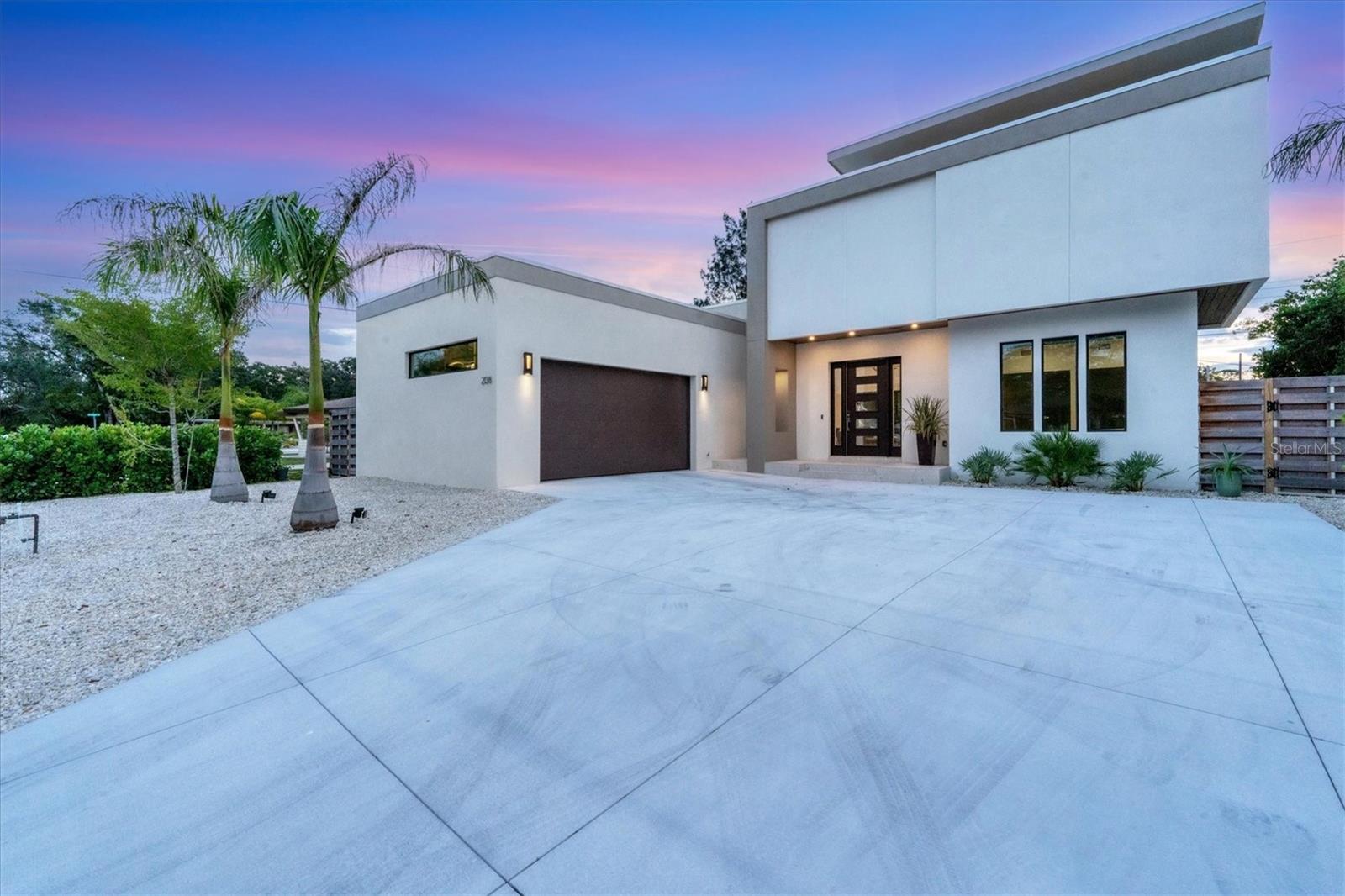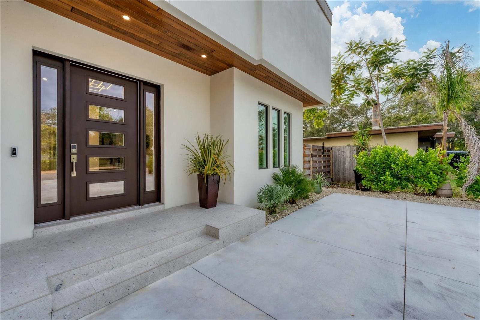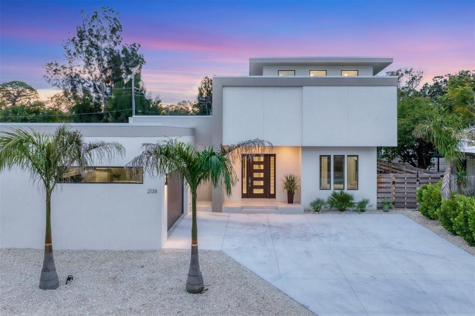 Welcome to your contemporary masterpiece in Sarasota's coveted Arlington Park! Crafted by renowned builder Russ Beckwith, this luxury home showcases modern living at its finest. Inside, an open-plan design seamlessly blends style and functionality, with volume ceilings and a faux fireplace exuding warmth and elegance. The indoor-outdoor flow ensures you enjoy ample covered space for year-round relaxation and entertainment. This isn't just a house, it's a lifestyle. With two bedrooms on the main level, an owner’s retreat, and a possible fourth bedroom upstairs, which is being used as a home gym and office, it offers versatile living. The kitchen boasts a three-centimeter Cambria Skara Brae quartz island, and top-tier appliances including a 36-inch six-burner Fulgor gas range. Italian 24-by-48-inch Cemento Cassero Bianco tiles grace the downstairs floors. As you arrive, a spacious driveway accommodates up to seven cars, making entertaining friends and family a breeze. Eco-conscious xeriscape landscaping reduces water usage, with every tree and shrub linked to an advanced irrigation system. Step into your private oasis with a horizontal shadow box Cypress fence for added privacy. The outdoor shower and pool bath complement the cocktail pool and sun decks, inviting you to bask in Florida's sunshine and luxury. Minutes from downtown Sarasota, Southside Village and Sarasota Memorial Hospital, this prime location offers unrivaled convenience. Siesta Key Beach, renowned for its white sands and crystal-clear waters, is just five miles away. Explore upscale shopping and dining at St. Armands Circle or unwind at Lido Beach, all within four miles. With its modern design, unbeatable location and thoughtful amenities, this home epitomizes the best of Sarasota living. Don't miss your chance to claim this contemporary masterpiece as your paradise.