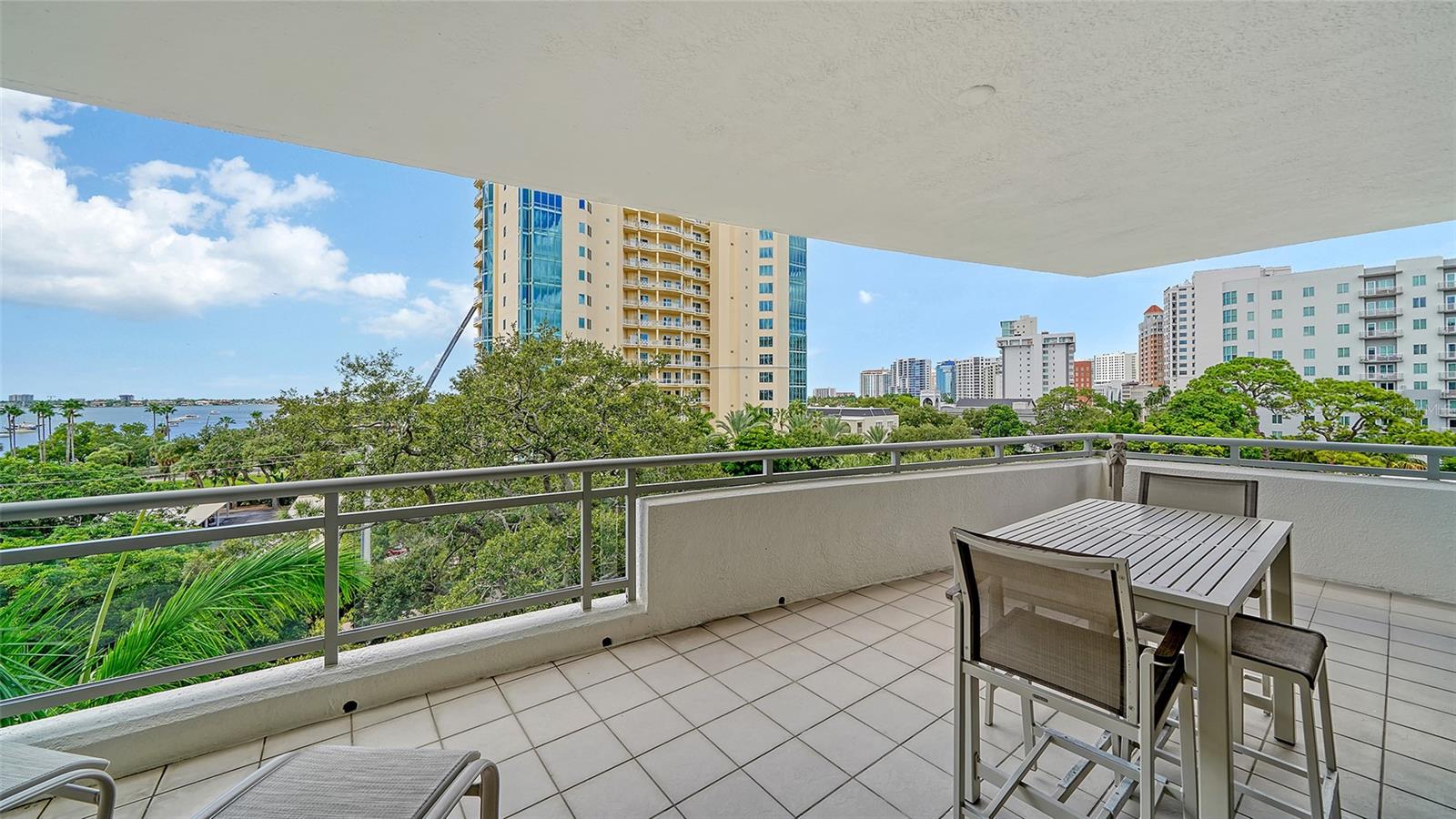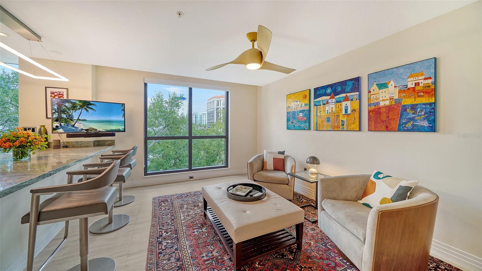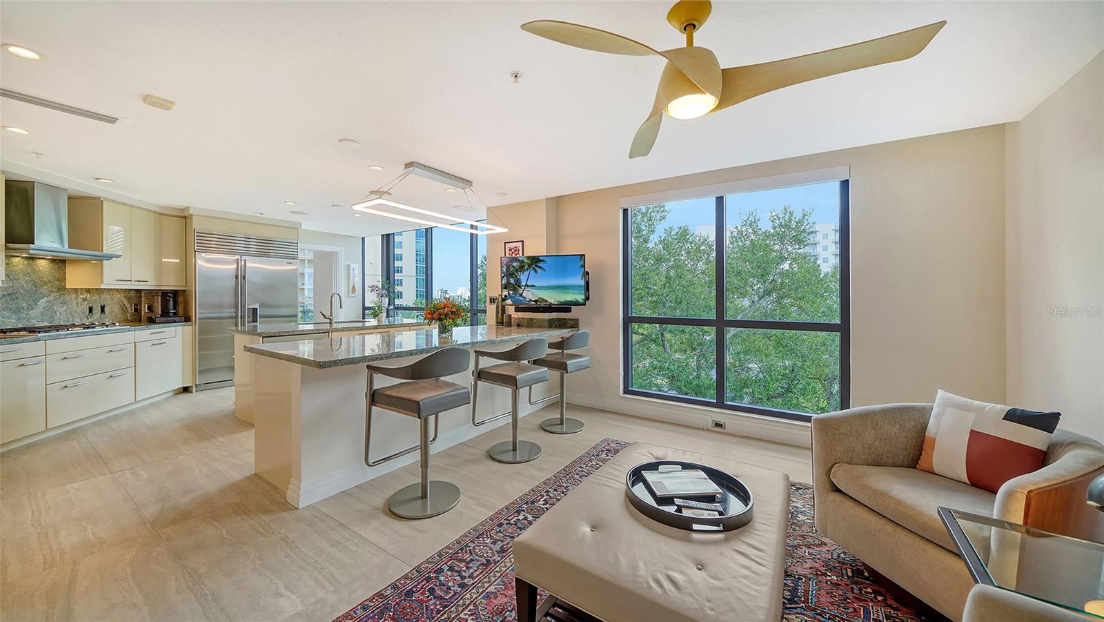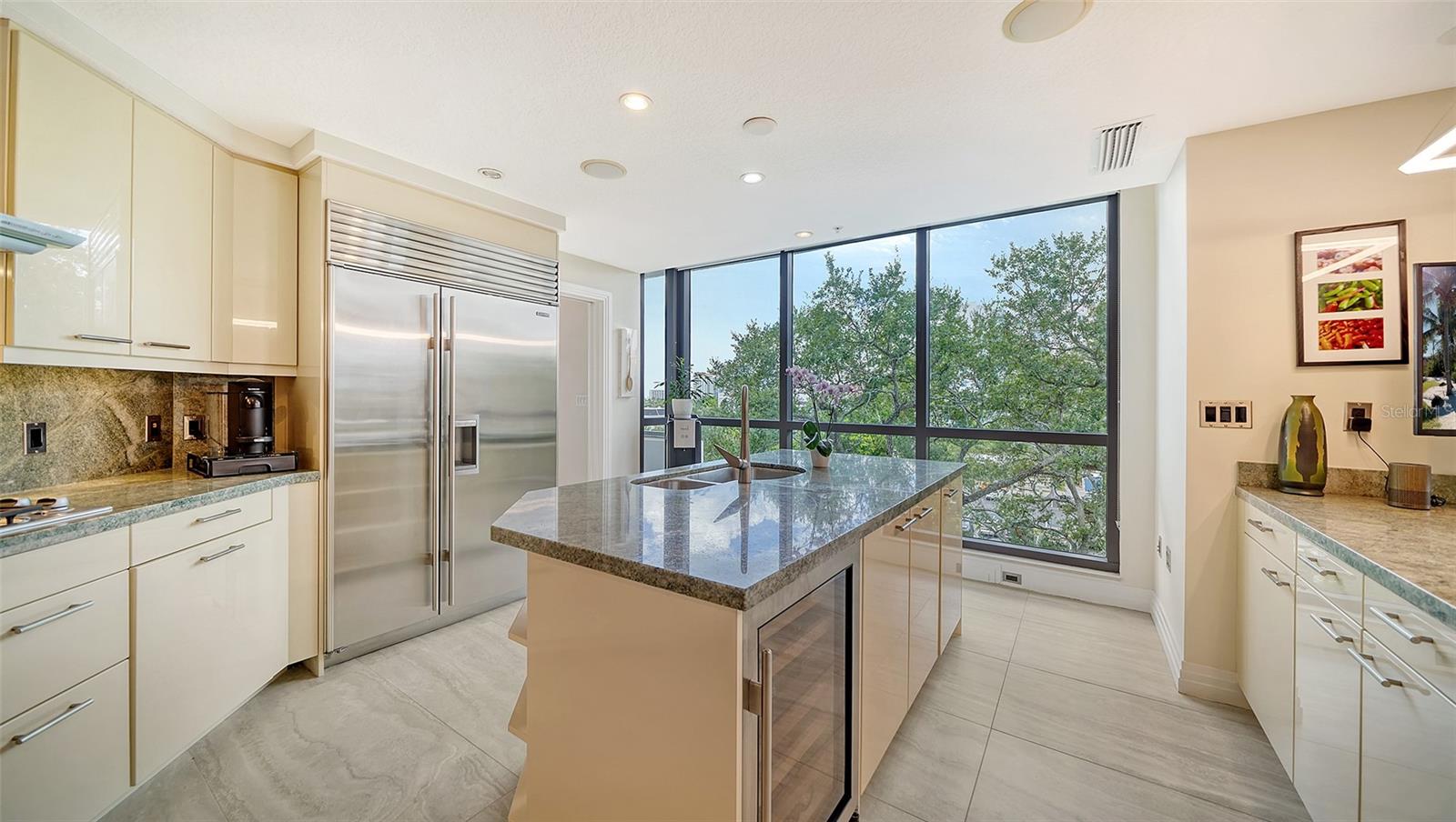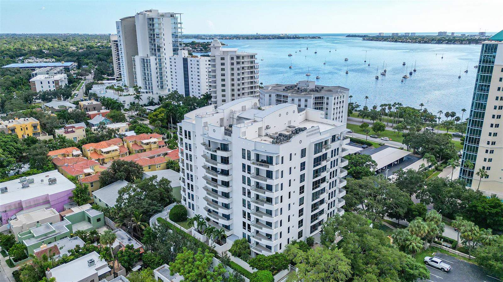 Enjoy gorgeous views of Sarasota Bay from this three-exposure end unit at the coveted Savoy on Palm, an intimate building with only twenty-four units. The historic downtown skyline is framed by old growth oaks through the many floor-to-ceiling windows. Relax with views of Laurel Park’s greenery from your balcony. Stroll South Palm Avenue’s tranquil tree-lined neighborhood on your way to restaurants, theatre, opera, shopping, and cinema. In less than two short blocks, you’ll watch the sunset, drink in hand, at the Bay Front Park and marina. Tall windows provide abundant light in 3,172 sq ft of understated elegance. Pass through sophisticated glass doors onto modern porcelain floors with granite and marble-topped cabinetry in kitchen and baths. Top-of-the-line appliances include Sub-Zero, Wolf, and Cove plus an on-trend steam/convection oven. Close the door on your private two-car garage steps from your personal storage room. A pet-friendly building with a fully fenced side yard, the Savoy’s owner amenities include concierge service, building manager, two-room guest suite, community social room with a catering kitchen, and a library for more intimate gatherings. Invite your personal trainer to the comprehensive fitness room then unwind from your workout in the private massage room. The exceptional outdoor living space includes a heated spa and pool with luxury seating, twin Wolf gas grills, outdoor kitchen, dining tables, and bar ready for you to enjoy social events with your friends, family, and fellow owners.