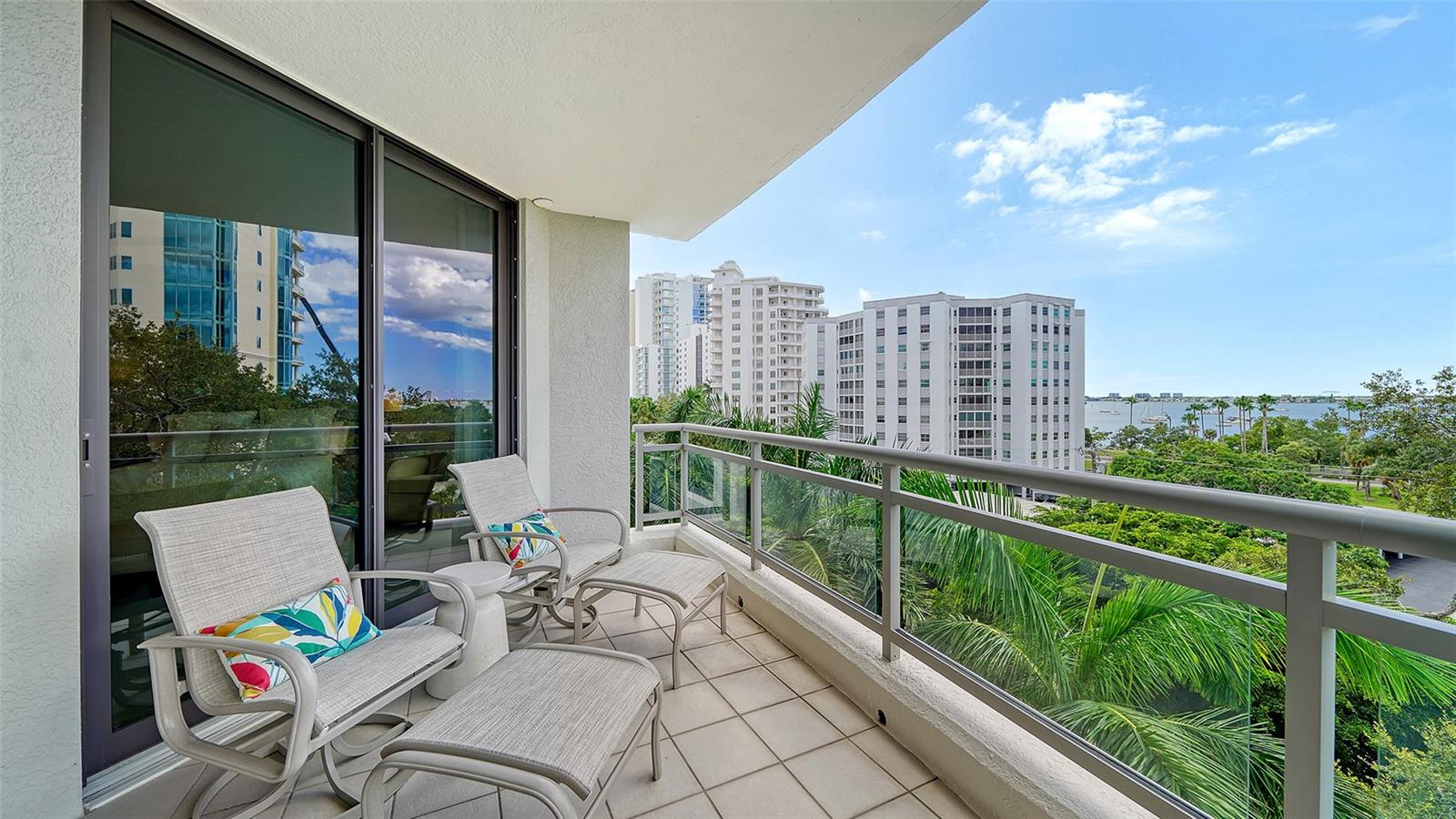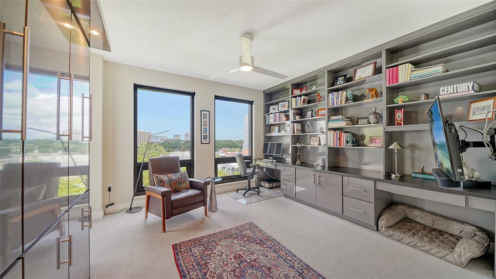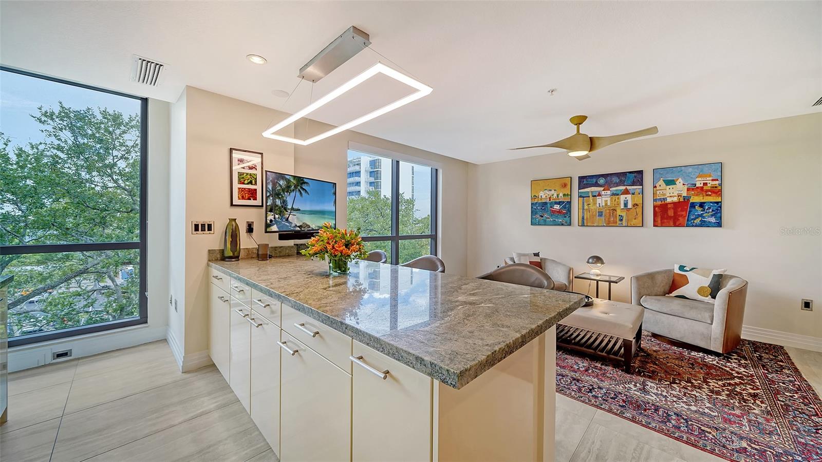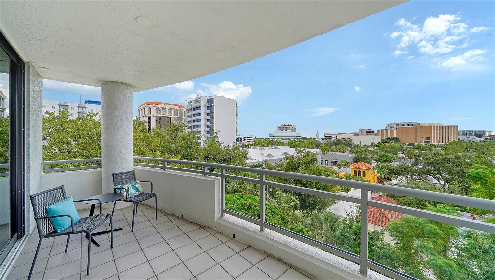 Enjoy gorgeous views of Sarasota Bay from this three-exposure end unit at the coveted Savoy on Palm, an intimate building with only twenty-four units. The historic downtown skyline is framed by old growth oaks through the many floor-to-ceiling windows. Relax with views of Laurel Park’s greenery from your balcony. Stroll South Palm Avenue’s tranquil tree-lined neighborhood on your way to restaurants, theatre, opera, shopping, and cinema. In less than two short blocks, you’ll watch the sunset, drink in hand, at the Bay Front Park and marina. Tall windows provide abundant light in 3,172 sq ft of understated elegance. Pass through sophisticated glass doors onto modern porcelain floors with granite and marble-topped cabinetry in kitchen and baths. Top-of-the-line appliances include Sub-Zero, Wolf, and Cove plus an on-trend steam/convection oven. Close the door on your private two-car garage steps from your personal storage room. A pet-friendly building with a fully fenced side yard, the Savoy’s owner amenities include concierge service, building manager, two-room guest suite, community social room with a catering kitchen, and a library for more intimate gatherings. Invite your personal trainer to the comprehensive fitness room then unwind from your workout in the private massage room. The exceptional outdoor living space includes a heated spa and pool with luxury seating, twin Wolf gas grills, outdoor kitchen, dining tables, and bar ready for you to enjoy social events with your friends, family, and fellow owners.