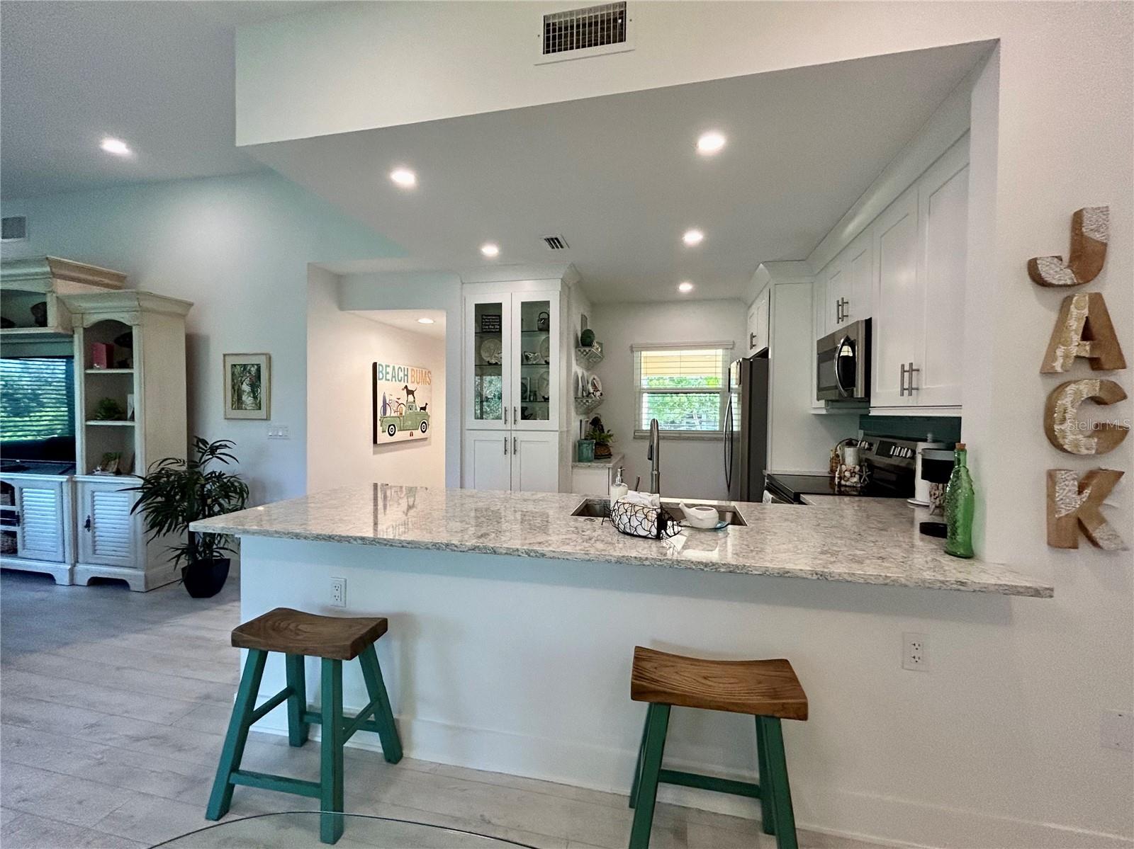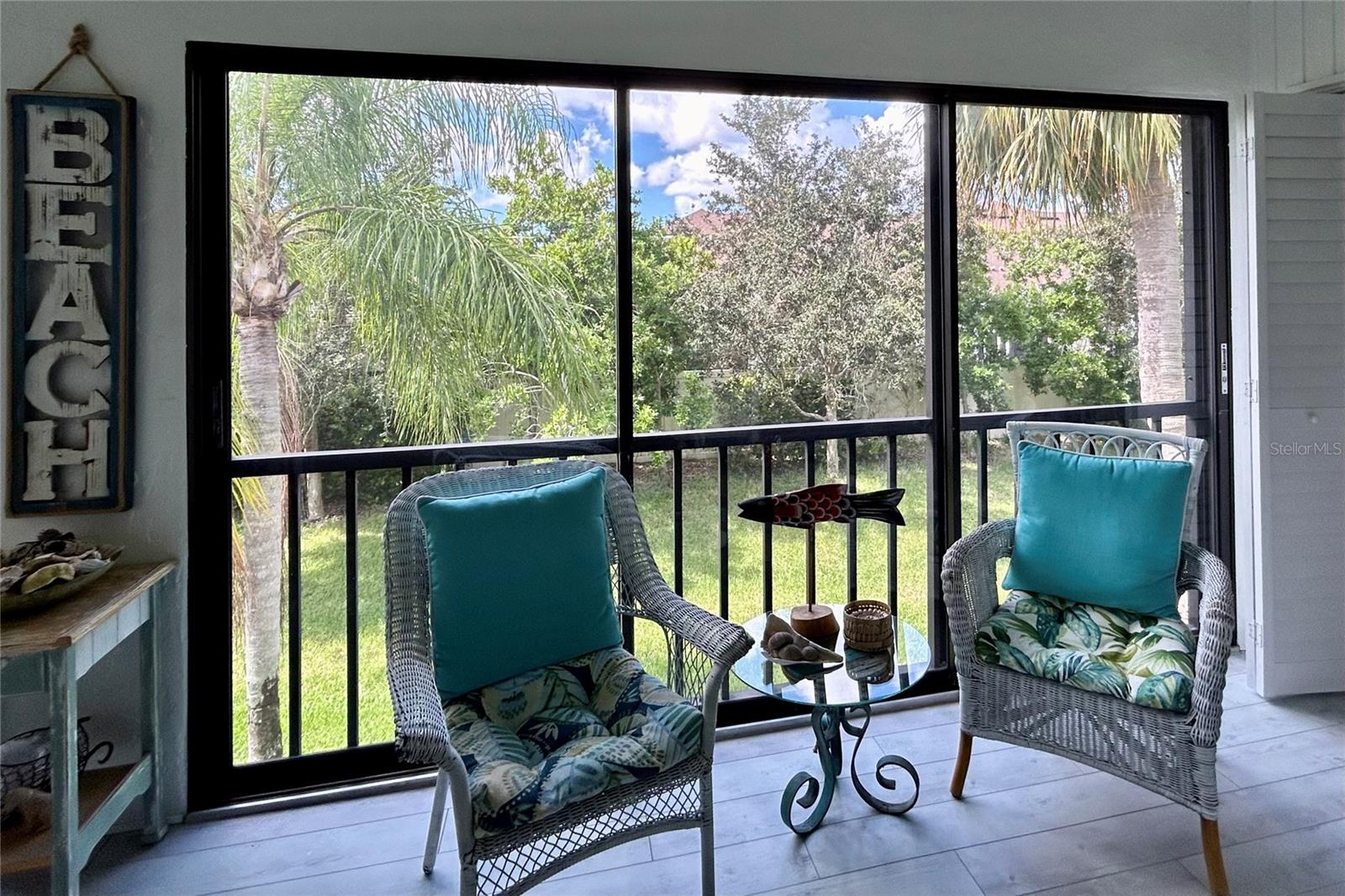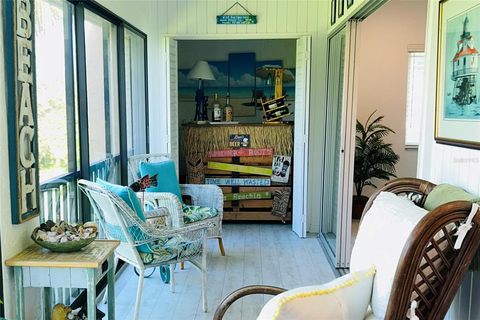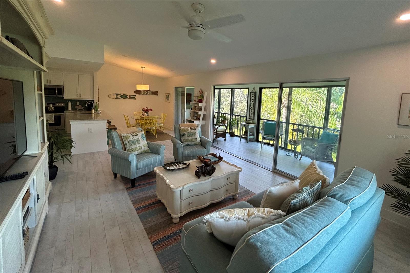 Just bring your toothbrush and move right in! Turnkey furnished! Live the Florida lifestyle from this wonderful unit in Forest Lakes Village, a popular, active, over55+ community. Open floor plan perfect for entertaining, or as a comfy retreat. Totally updated unit. Luxury vinyl wood-grain floors in every room. Designer touches with a beach-cottage look to enjoy the beach life without actually living on the beach. Everything new since 2020! Kitchen with custom solid-wood white cabinetry, designer quartz counters, stainless appliances, built-ins, and breakfast/entertainment bar. Large all-season lanai with peaceful, greenbelt views, A/C, hurricane windows and sliders, office space for your desk, and a Margaritaville-style tiki bar for your pleasure and your guests. Spacious great room with vaulted ceiling. New washer/dryer, new hurricane windows, new hurricane front door with sidelight. Ceiling fans and recessed lighting throughout. New electric panel and adjustable dimmer switches. Primary bedroom with updated ensuite bath, walk-in shower,, and walk-in closet with stairs to standable attic storage area. 1 carport, plus one unassigned parking space. Landscaped grounds with new outdoor gas grills (propane provided), shuffleboard courts, plenty of shade. Gorgeous, geothermal heated pool was recently resurfaced and added new paver pool deck. Recently remodeled clubhouse has two large community social rooms, fitness room, sauna, full kitchen, library, etc. Desirable central Sarasota location with easy access to downtown, beaches, museums, markets, public transportation, 1-75, and places beyond. Approximately five miles inland from Siesta Key Beach, condo is not in a flood zone, and is far from Gulf water surges. Walk to restaurants, shops, bakeries, grocery, pizzerias, salons, and even a pet store and clinic. Golf course around corner. Popular Legacy Bike/Walking Trail close by to link Sarasota and Venice. Great place to live and enjoy beautiful Sarasota and its beaches!