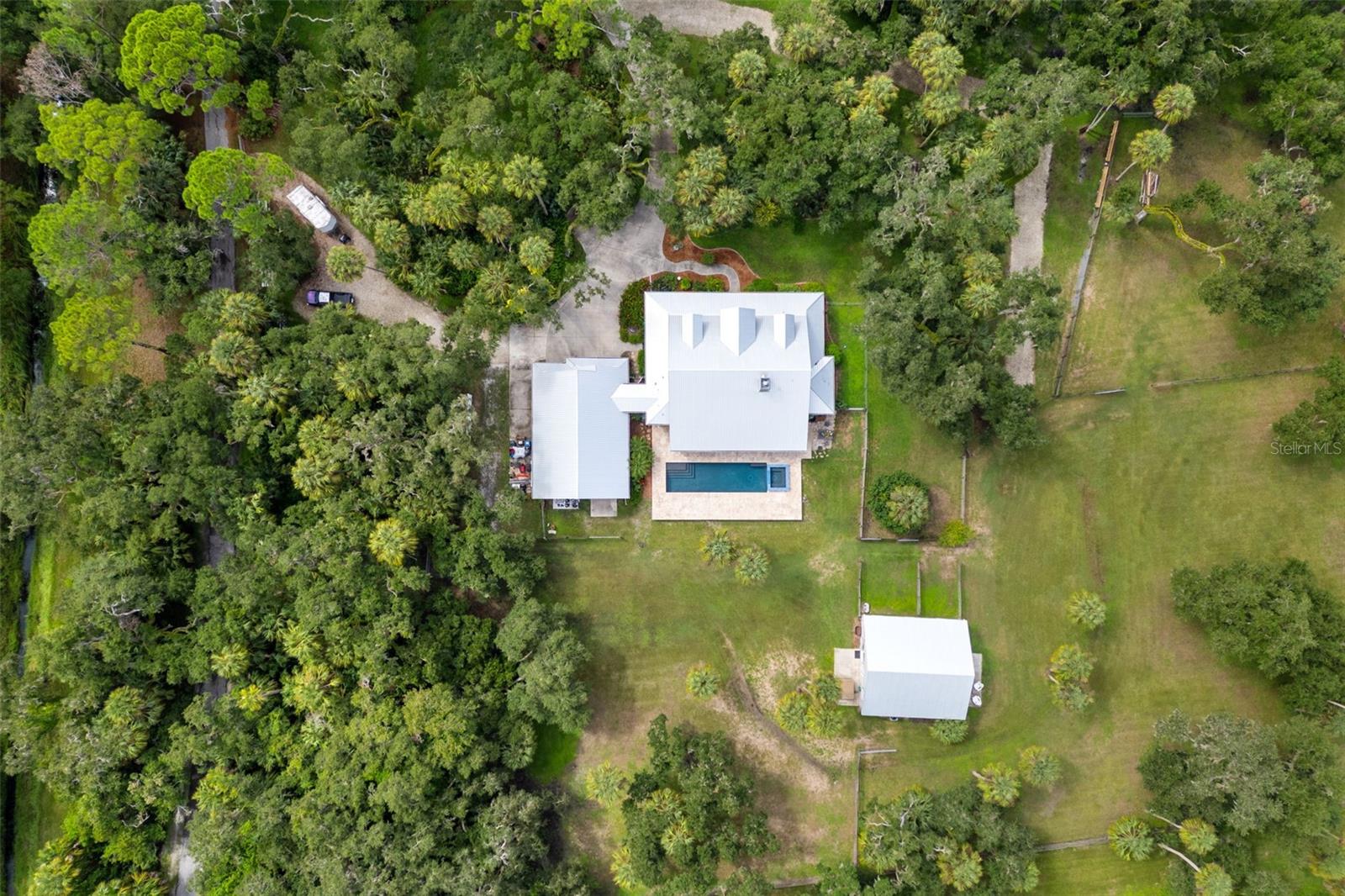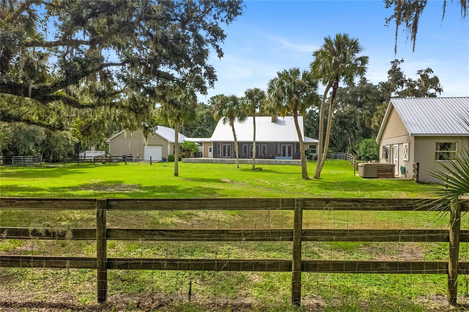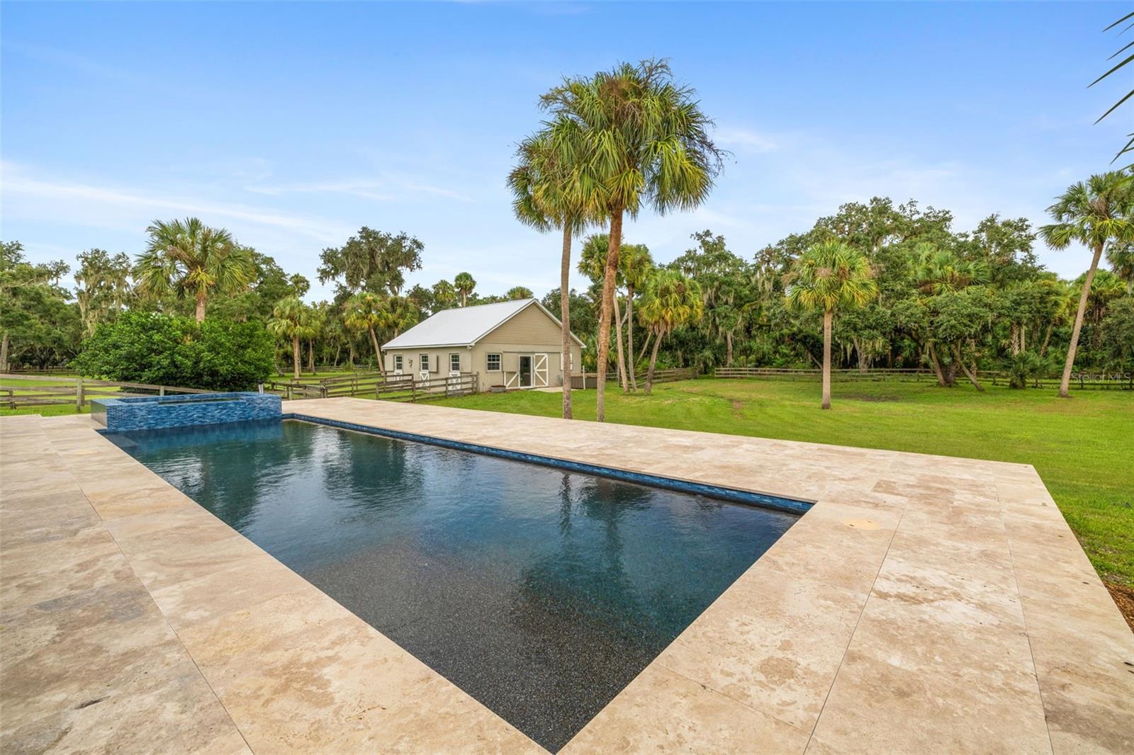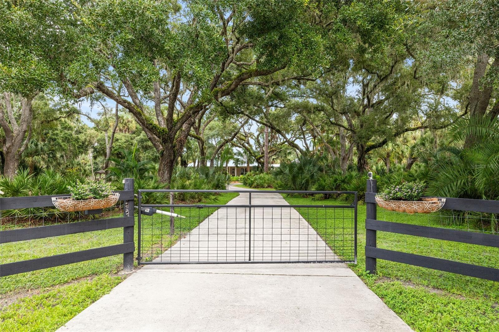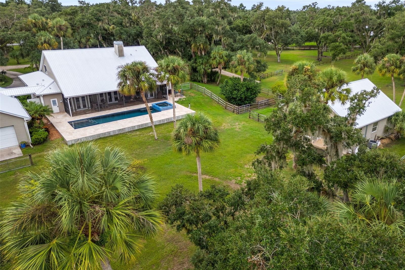 Welcome to 7091 Saddle Creek Lane — a breathtaking 7-acre estate tucked away in the stately, gated equestrian community of Saddle Creek in Sarasota, FL. This private, park-like retreat blends rustic elegance with refined modern updates, offering a true sanctuary for nature lovers, equestrian enthusiasts, and those seeking peaceful luxury. From the moment you enter the private gate and follow the oak-canopied driveway, you’re immersed in a natural hammock of live oaks, native cabbage palms, saw palmettos, bromeliads, orchids, and ferns — creating a setting that feels like a serene cross between Selby Gardens and Myakka State Park. It’s the perfect environment to coexist with nature, offering open grazing pastures with lush grass for livestock, or simply a front-row seat to Florida’s native wildlife, including deer, wild turkey, red-tailed hawks, barred owls, herons, hummingbirds, butterflies, and honey bees. This thoughtfully designed 3-bedroom, 3-bathroom home spans 3,041 sq. ft. of warm, inviting living space. Inside, enjoy vaulted ceilings, a stacked stone fireplace, new quartzite countertops in the kitchen, guest bath, and laundry room, and newer hardwood floors in the guest bedrooms, loft, and master suite. Step outside to your own private resort: • A custom 40-foot saltwater lap pool in PebbleTec Midnight Blue • An oversized raised spa with tranquil spillover, finished in custom glass tile • 24x24 natural stone travertine pavers surrounding the pool deck • A brand-new, clear view screen enclosure for unobstructed outdoor enjoyment • OmniLogic and ColorLogic automation, along with pool heater and chiller for year-round comfort Beyond the main residence, a climate-controlled multi-use structure offers a full kitchen, bathroom, and hurricane-rated modern glass garage doors, perfect as a guest house, barn, art studio, or collector’s garage. All structures feature durable metal roofs, and several newer AC units ensure year-round efficiency. The expansive 5-car garage includes RV and EV hookups, air-conditioned workspace, and additional outdoor parking. The estate also features a whole-home backup generator, ensuring you're always prepared. Surrounded by total privacy on three sides, and located on a quiet cul-de-sac, the property directly backs up to 30 miles of private horse trails. With four gated pastures, there’s room for your horses—or build a chicken coop, start a vegetable or herb garden, or even add another structure to suit your vision. Located within an A-rated school district, this estate is more than a home — it’s a lifestyle. Experience the perfect blend of luxury, tranquility, and nature, all just minutes from Sarasota’s vibrant city life.