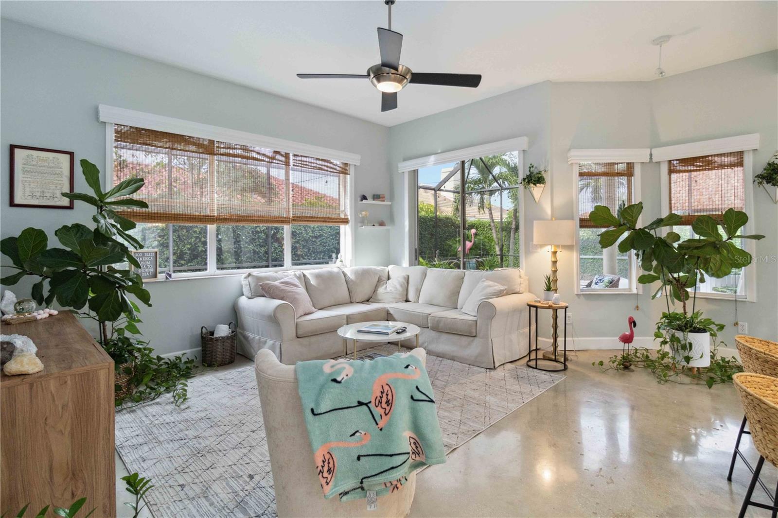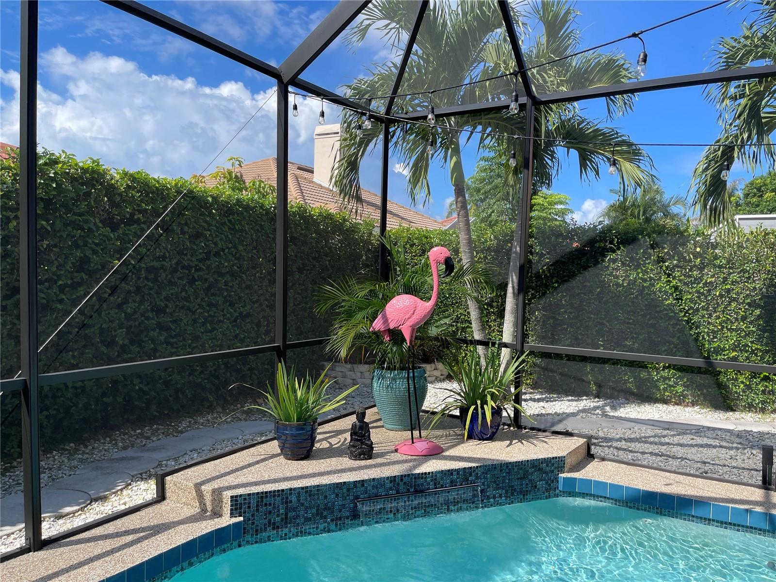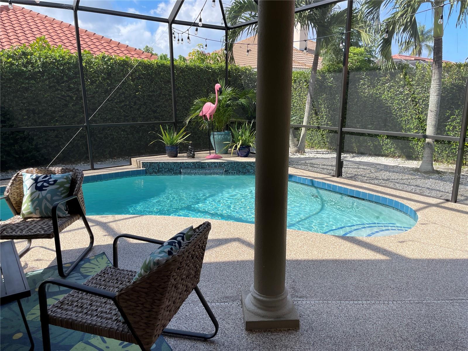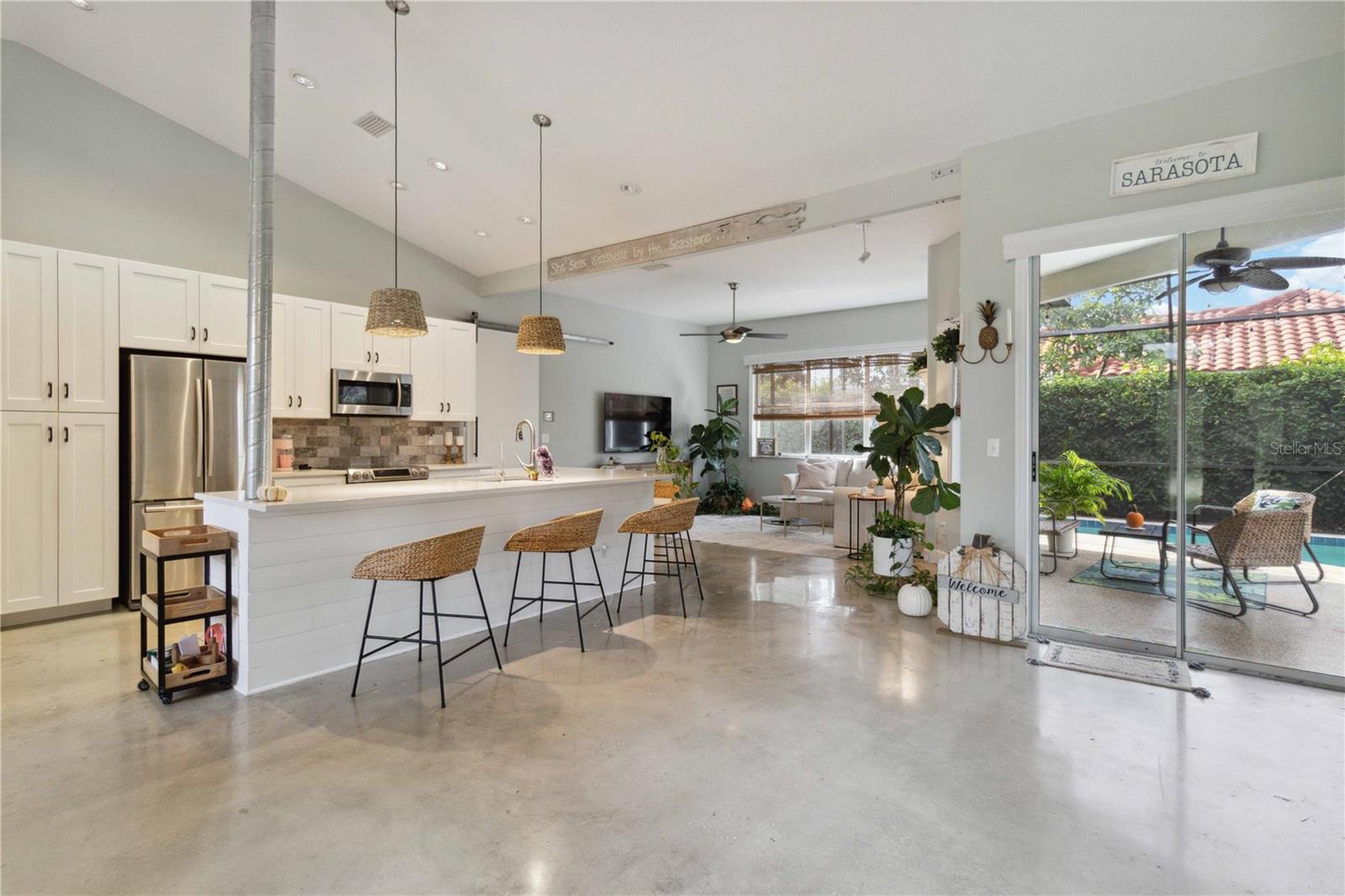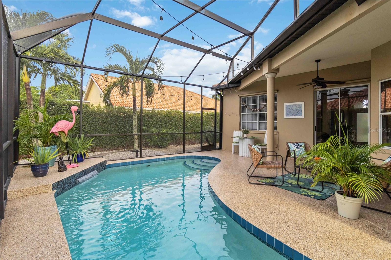 Welcome to the delightful and sought after community of The Trails with LOW HOA and NO CDD. New roof installed 1/2025! This FURNISHED pool home with open floor-plan features three bedrooms and two bathrooms. Manicured and tropical setting with colorful flower beds invites you into this elegant Sarasota home. Enter through the double entry doors to the open living space with vaulted ceiling. All new light fixtures. The kitchen boasts stainless appliances, Quartz countertops and Tumbled marble tiles backsplash. For casual dining sit around the kitchen island. Easy to maintain concrete flooring throughout. For your convenience the laundry room is off the kitchen and through the laundry room exit into the two car garage which boasts a utility sink and storage cabinets for you to organize all your sports gear or crafts. There is also a door from the garage to the side of the yard. As you continue to explore this pristine home, you will find the comfortable and light plus bright living room with a ceiling fan and sliding glassed doors. When you walk out to the pool area you will be pleasantly surprised to find the epoxy resurfaced flooring, the redone screen pool cage, the tranquil waterfall and the fenced backyard. The pool area has ample space for entertaining with a ceiling fan, and even in the evenings the pool lights will set the ambiance. Beautiful shades and wood valances adorn the windows. Enter into your main bedroom through the barn door. This is your oasis after a long day at work or on the near by golf course. The main bathroom boasts a walk-in glassed shower with subway tiles backsplash. There is a window for more light to penetrate the bathroom. For your convenience there are two walk-in closets. The two guest bedroom are behind the kitchen and another barn door separates their hallway from the living room. The guest bathroom features an elegant light fixture, garden tub and a window. The guest bedrooms boast a ceiling fan and a built-in closets. Ample closets for storage throughout. A/C was replaced in 2018. Take advantage of The Trails amenities such as swimming pool, tennis court and clubhouse. The HOA also maintains the common areas. Walk or ride your bicycle and view the lakes of this community. You may encounter the Florida birds. Drive to UTC Mall for dinner or shopping, under 6 miles from The Trails. Palm Aire golf course is about 7 minutes drive. Spend the day in the dreamy sugary beaches of Sarasota or Manatee counties. Take pleasure in all of Sarasota and Bradenton's cultural and culinary venues. Furnishings are available with a separate bill of sale. Take a tour at The Trails home and you will find it surprisingly refreshing and ready for you.