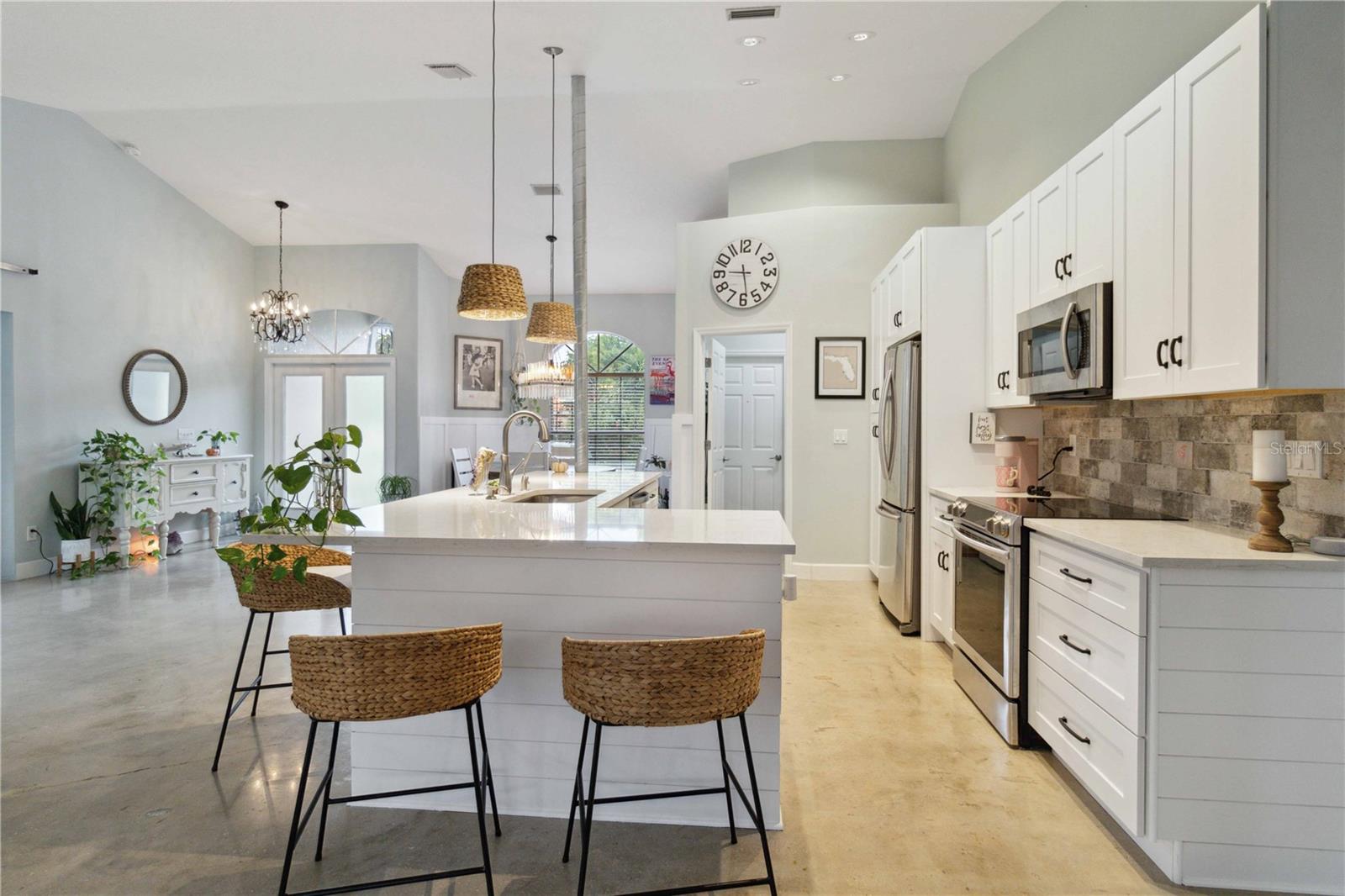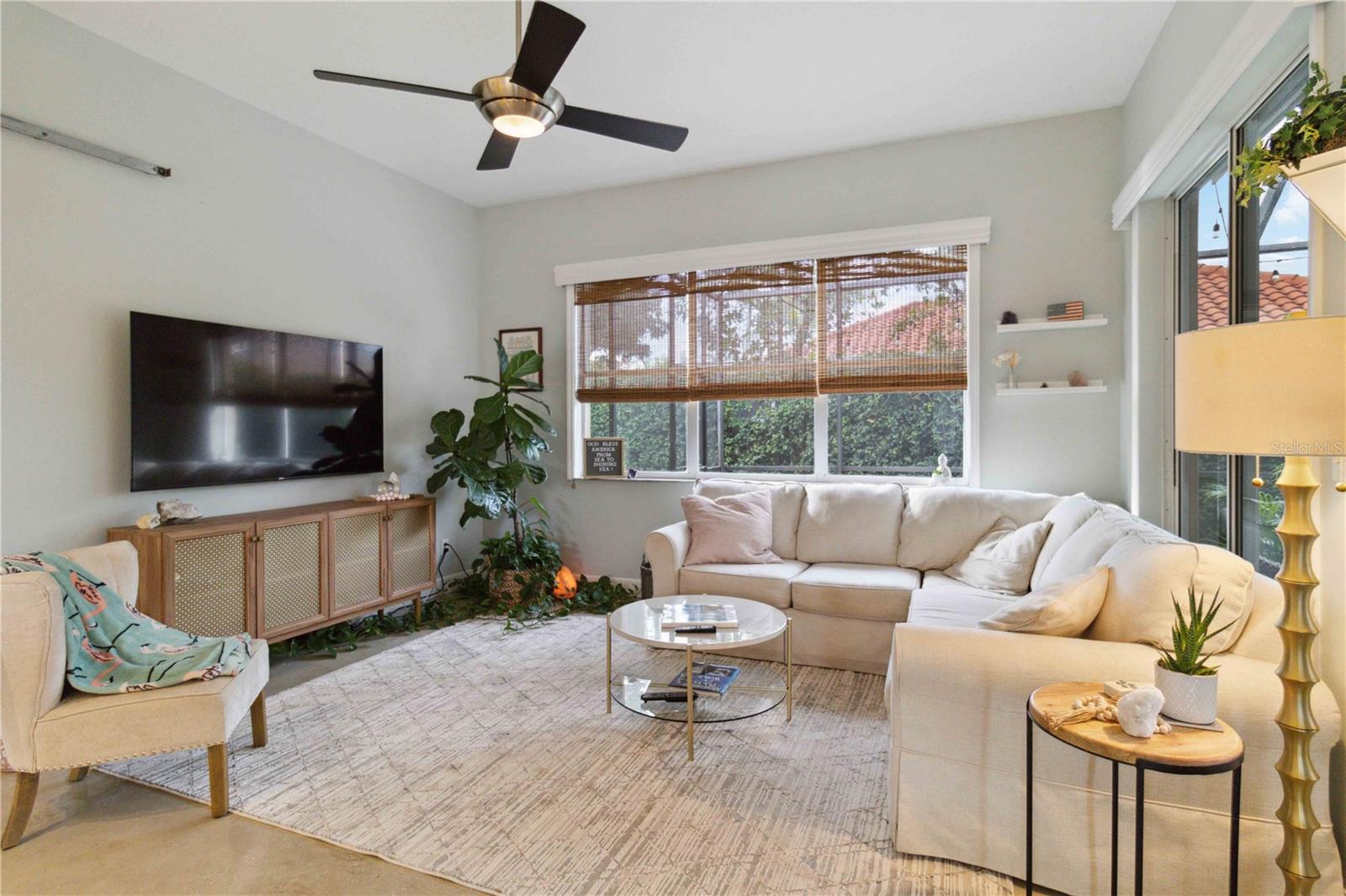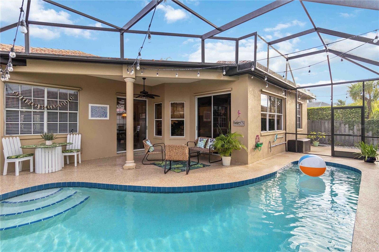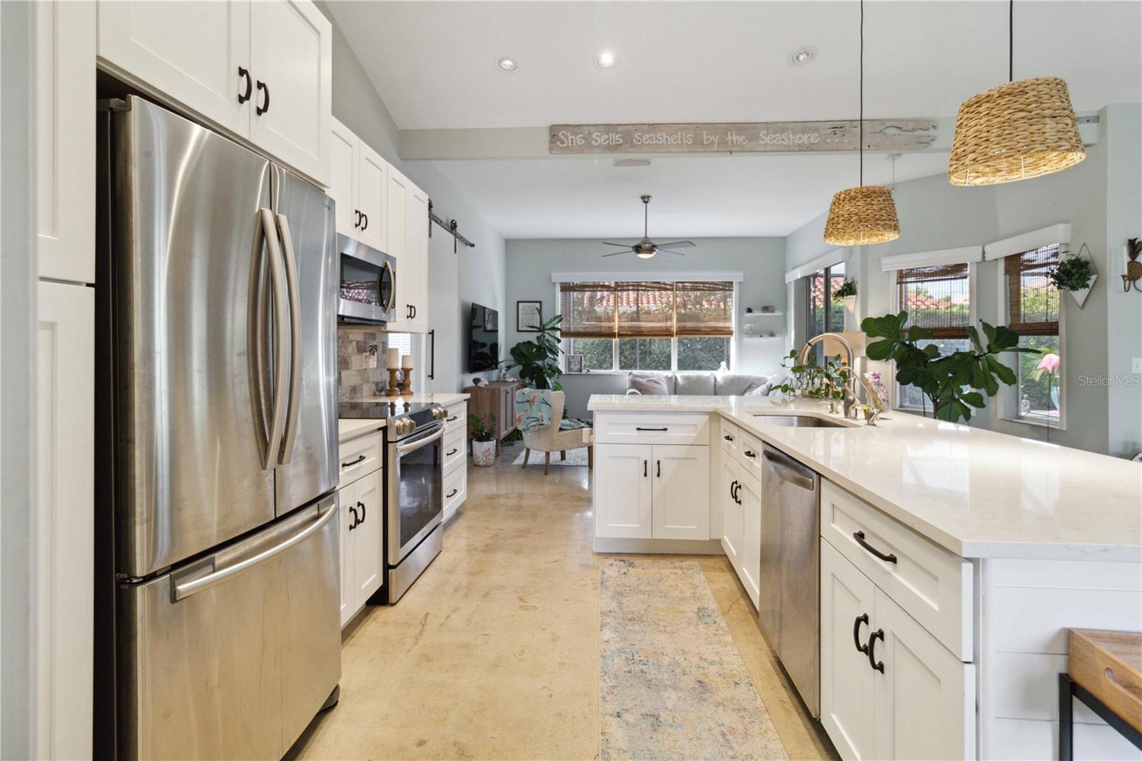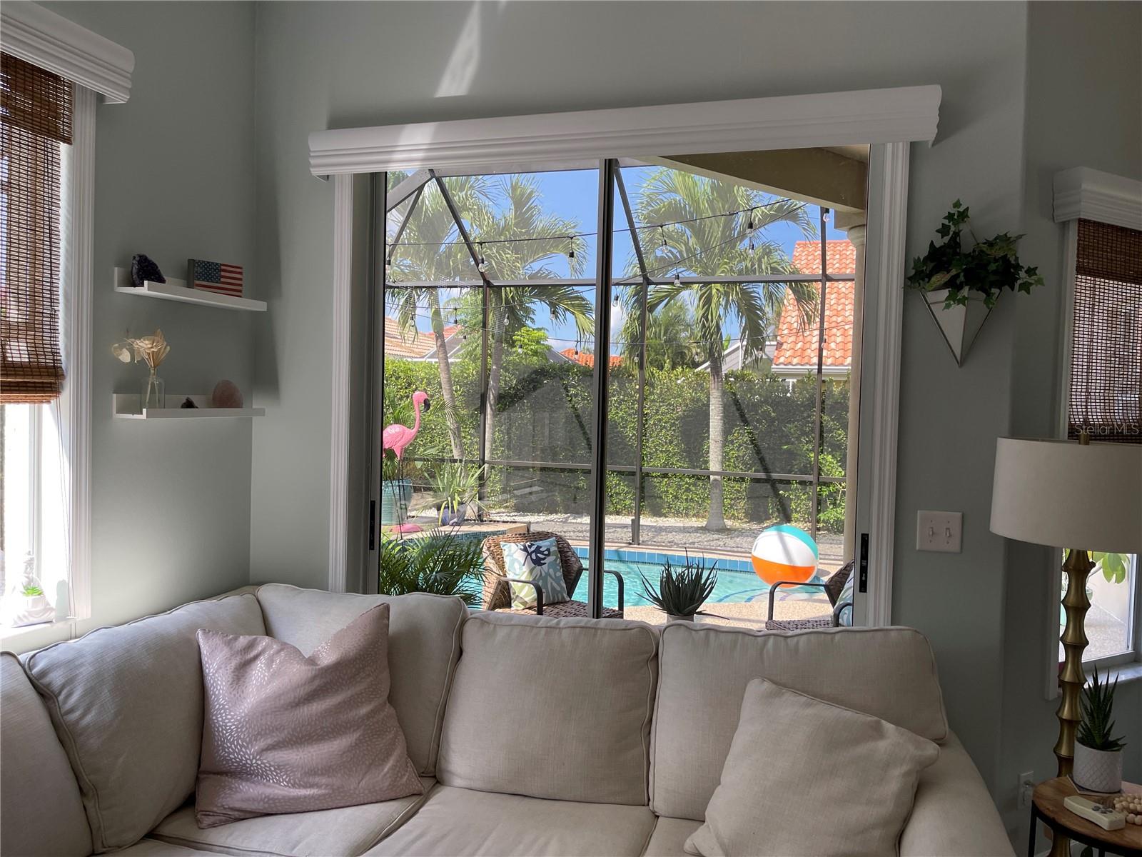 Welcome to the delightful and sought after community of The Trails with LOW HOA and NO CDD. New roof installed 1/2025! This FURNISHED pool home with open floor-plan features three bedrooms and two bathrooms. Manicured and tropical setting with colorful flower beds invites you into this elegant Sarasota home. Enter through the double entry doors to the open living space with vaulted ceiling. All new light fixtures. The kitchen boasts stainless appliances, Quartz countertops and Tumbled marble tiles backsplash. For casual dining sit around the kitchen island. Easy to maintain concrete flooring throughout. For your convenience the laundry room is off the kitchen and through the laundry room exit into the two car garage which boasts a utility sink and storage cabinets for you to organize all your sports gear or crafts. There is also a door from the garage to the side of the yard. As you continue to explore this pristine home, you will find the comfortable and light plus bright living room with a ceiling fan and sliding glassed doors. When you walk out to the pool area you will be pleasantly surprised to find the epoxy resurfaced flooring, the redone screen pool cage, the tranquil waterfall and the fenced backyard. The pool area has ample space for entertaining with a ceiling fan, and even in the evenings the pool lights will set the ambiance. Beautiful shades and wood valances adorn the windows. Enter into your main bedroom through the barn door. This is your oasis after a long day at work or on the near by golf course. The main bathroom boasts a walk-in glassed shower with subway tiles backsplash. There is a window for more light to penetrate the bathroom. For your convenience there are two walk-in closets. The two guest bedroom are behind the kitchen and another barn door separates their hallway from the living room. The guest bathroom features an elegant light fixture, garden tub and a window. The guest bedrooms boast a ceiling fan and a built-in closets. Ample closets for storage throughout. A/C was replaced in 2018. Take advantage of The Trails amenities such as swimming pool, tennis court and clubhouse. The HOA also maintains the common areas. Walk or ride your bicycle and view the lakes of this community. You may encounter the Florida birds. Drive to UTC Mall for dinner or shopping, under 6 miles from The Trails. Palm Aire golf course is about 7 minutes drive. Spend the day in the dreamy sugary beaches of Sarasota or Manatee counties. Take pleasure in all of Sarasota and Bradenton's cultural and culinary venues. Furnishings are available with a separate bill of sale. Take a tour at The Trails home and you will find it surprisingly refreshing and ready for you.