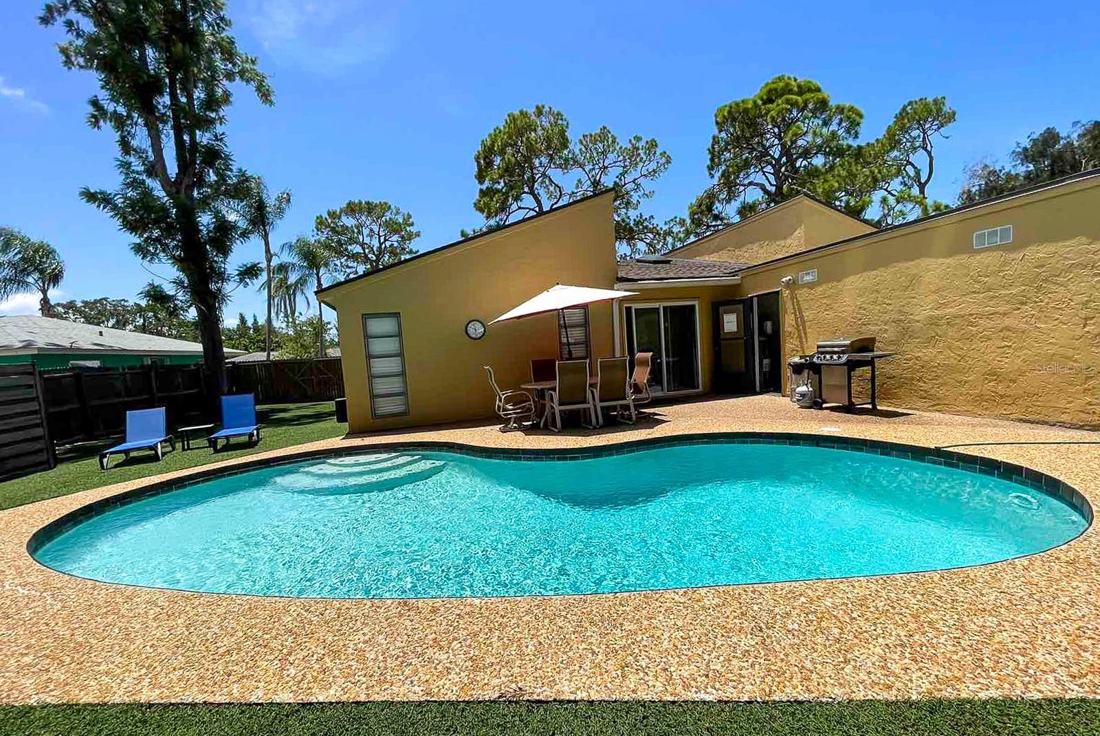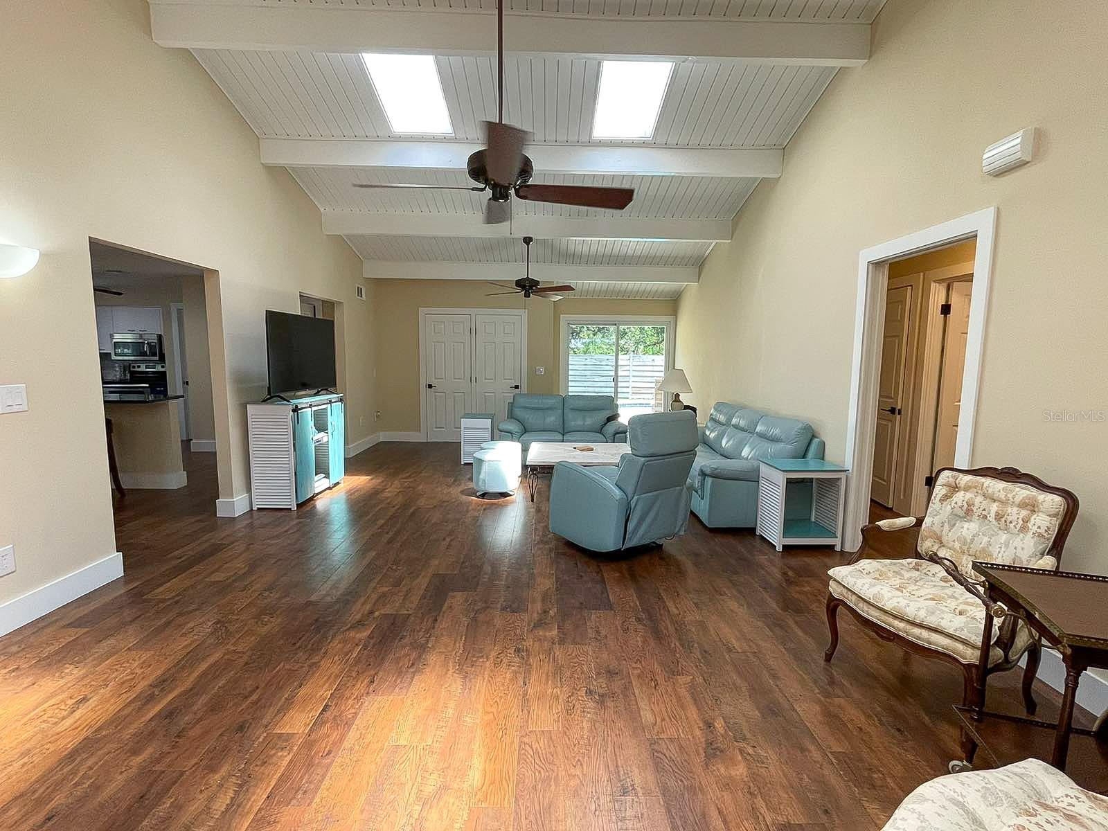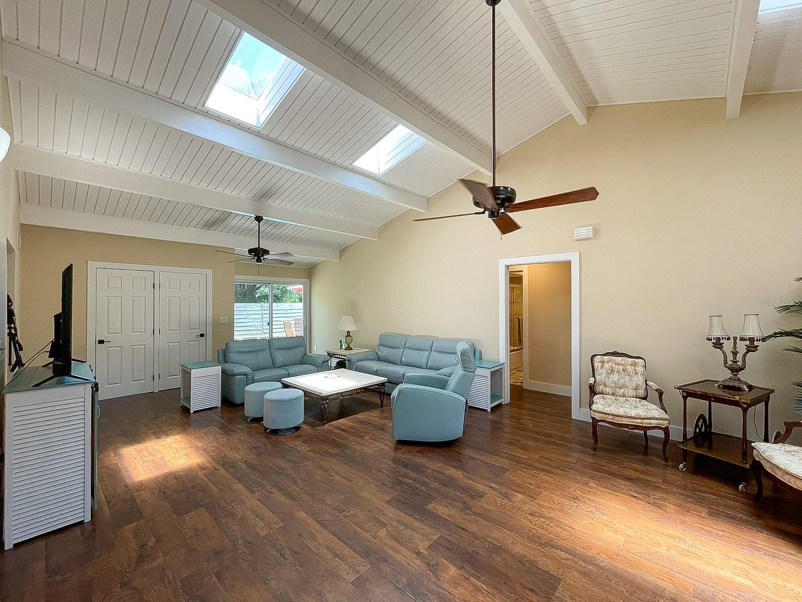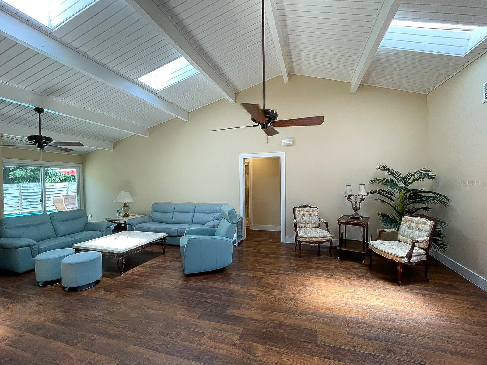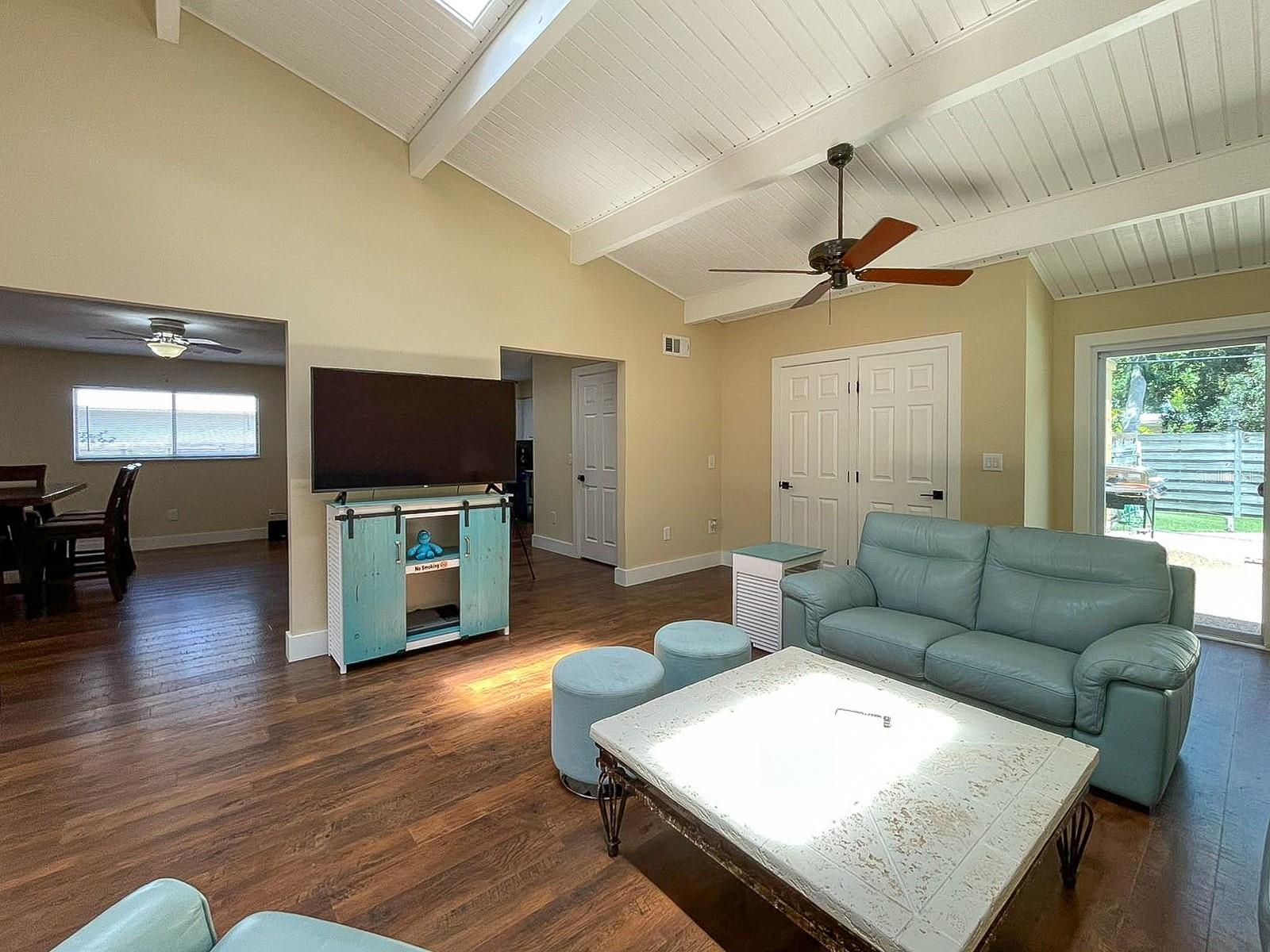Discover this stunning 4-bedroom, 2-bath home nestled in a peaceful cul-de-sac with no HOA or CDD fees, ideally situated near Sarasota’s best beaches, shopping, dining, and downtown hotspots. Never flooded! Step inside to find a beautifully updated home with a bright, beachy vibe and impeccable attention to detail. The vaulted wood plank ceilings with skylights fill the home with natural light, creating an inviting and airy ambiance. Solid wood floors add warmth and elegance throughout the space. The chef’s kitchen is a showstopper, featuring custom blue cabinetry, stainless steel appliances, granite countertops, and a spacious pantry—perfect for meal prep and entertaining. Enjoy seamless indoor-outdoor living as the large living room flows effortlessly through sliding doors to the heated pebble-deck pool and entertaining area. The backyard is maintenance-free, allowing you to relax and enjoy year-round Florida living. Additional highlights include an oversized 2-car garage with ample space for parking, guests, and even your RV or recreational toys. This prime location offers walking distance to top-rated A schools and is less than 3.5 miles from stunning beaches, parks, fine dining, shopping, and your favorite Starbucks. This property is a rare find in Sarasota’s sought-after coastal community. Schedule your showing today to experience this gem firsthand!