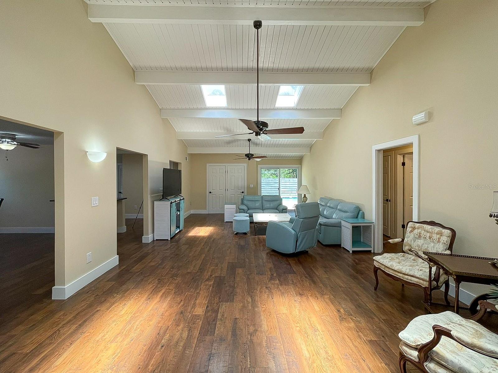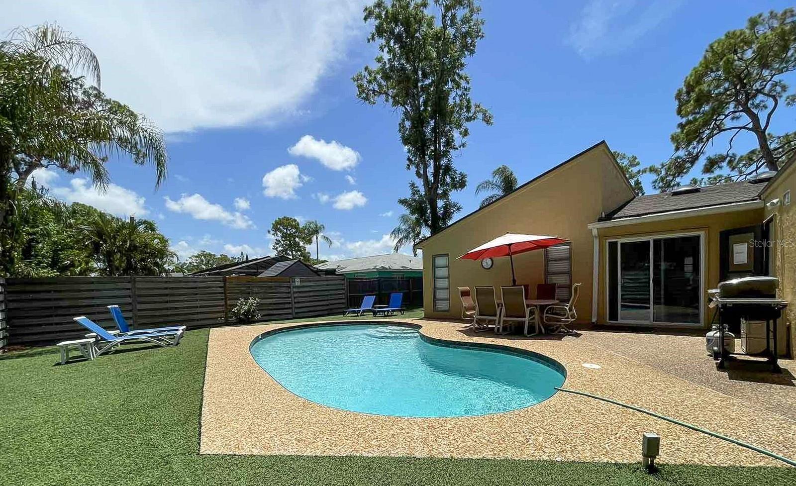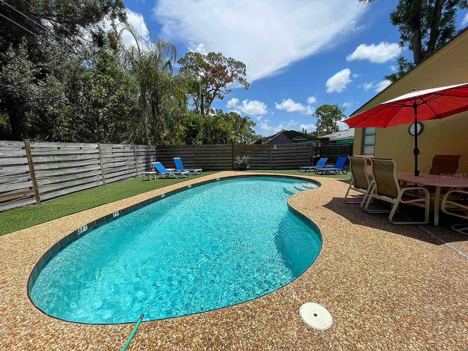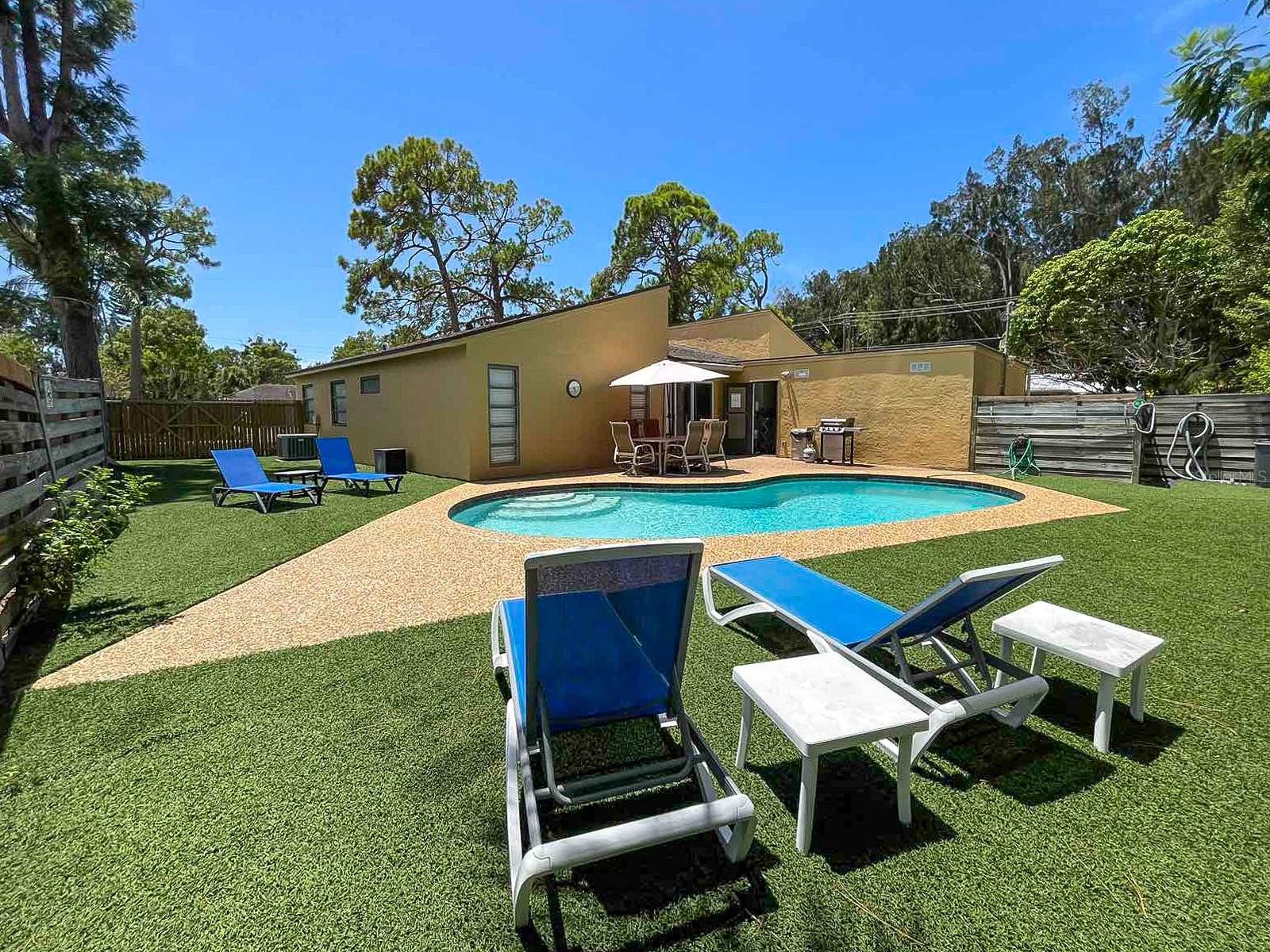 Discover this stunning 4-bedroom, 2-bath home nestled in a peaceful cul-de-sac with no HOA or CDD fees, ideally situated near Sarasota’s best beaches, shopping, dining, and downtown hotspots. Never flooded! Step inside to find a beautifully updated home with a bright, beachy vibe and impeccable attention to detail. The vaulted wood plank ceilings with skylights fill the home with natural light, creating an inviting and airy ambiance. Solid wood floors add warmth and elegance throughout the space. The chef’s kitchen is a showstopper, featuring custom blue cabinetry, stainless steel appliances, granite countertops, and a spacious pantry—perfect for meal prep and entertaining. Enjoy seamless indoor-outdoor living as the large living room flows effortlessly through sliding doors to the heated pebble-deck pool and entertaining area. The backyard is maintenance-free, allowing you to relax and enjoy year-round Florida living. Additional highlights include an oversized 2-car garage with ample space for parking, guests, and even your RV or recreational toys. This prime location offers walking distance to top-rated A schools and is less than 3.5 miles from stunning beaches, parks, fine dining, shopping, and your favorite Starbucks. This property is a rare find in Sarasota’s sought-after coastal community. Schedule your showing today to experience this gem firsthand!