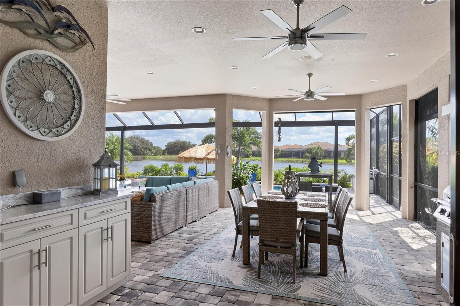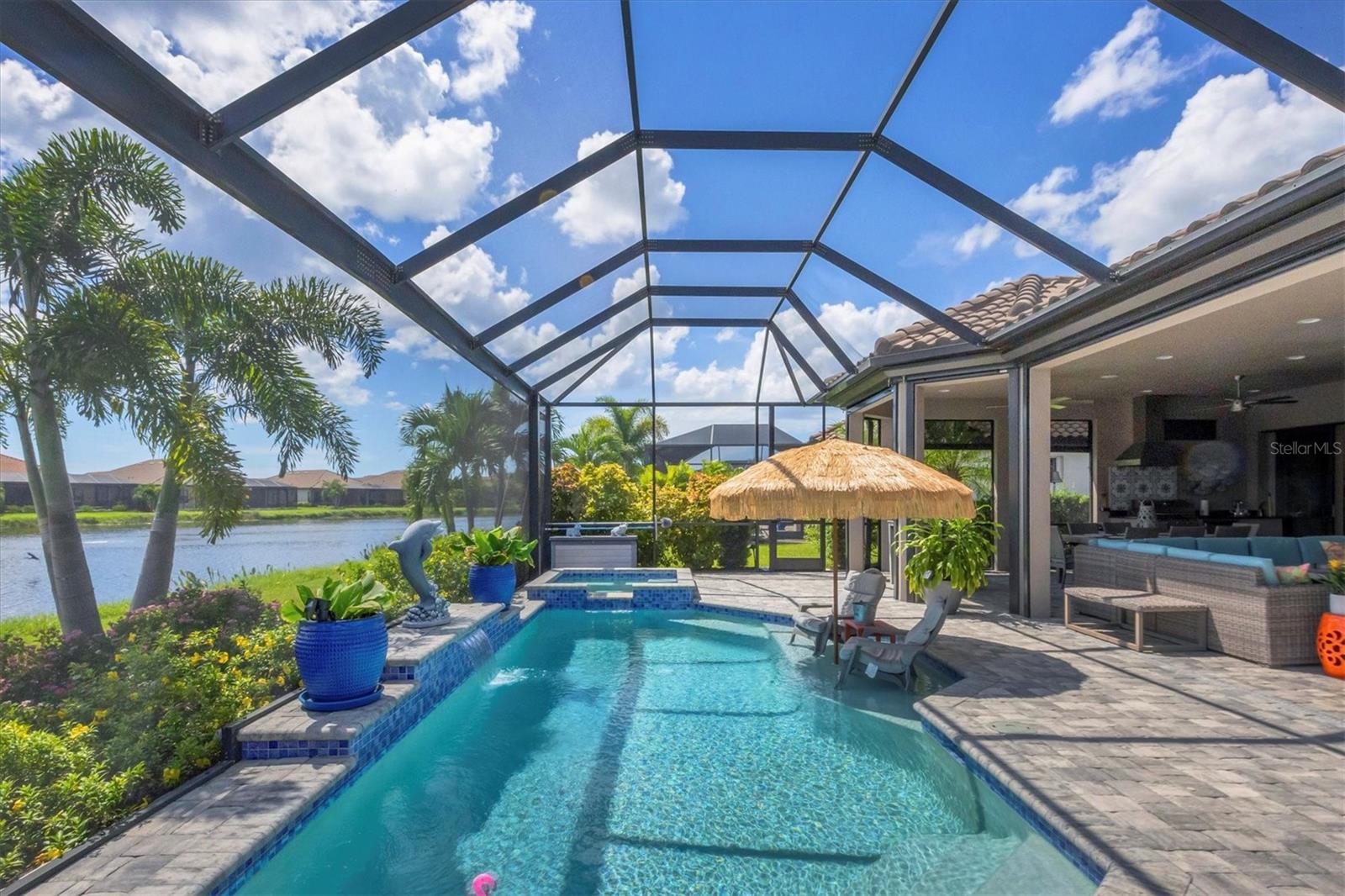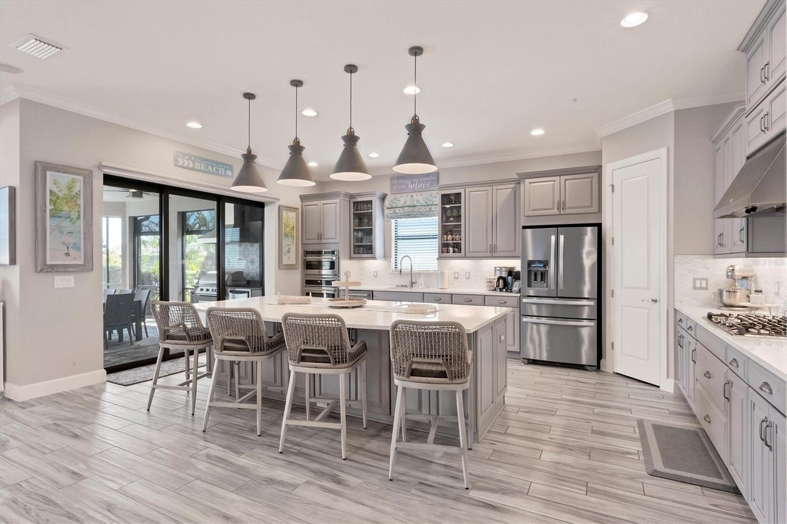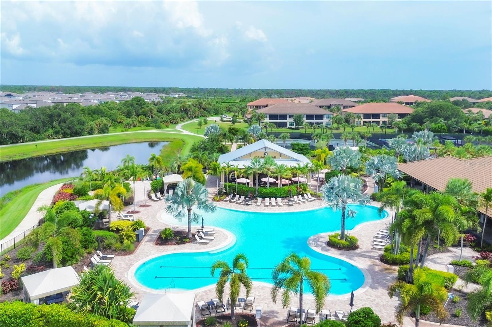 Welcome to your dream home! Nestled in the beautiful gated community of Esplanade on Palmer Ranch, this exquisite residence offers both luxury and comfort. Featuring 3 bedrooms, 3 bathrooms, and a versatile flex room, all with impeccable attention to detail. The open and airy layout showcases stylish, easy-to-maintain flooring throughout, eliminating carpet for a sleek look. The gourmet kitchen is a chef's paradise, with top-of-the-line appliances and a spacious island that includes convenient storage cabinets underneath, as well as premium quartz countertops and a stylish backsplash. Step outside to your private oasis, complete with a stunning saltwater pool and spa overlooking a serene lake, framed by a panoramic picture screen that offers breathtaking views. The outdoor space has been thoughtfully enhanced with an expansive patio, a built-in grill, and a covered lounge area, perfect for alfresco dining and entertaining. Enhanced with over $100K in upgrades. including smart home technology, smart screens hurricane shutters in the lanai, plank tile flooring, crown molding, plantation shutters, and hurricane-impact windows and doors. Esplanade is a resort-style community with top-notch amenities just steps from your door. Enjoy the nearby beach, on-site restaurant, fitness center, tennis and pickleball courts, and a dog park. This reputable community is celebrated for its exceptional lifestyle and resort-like atmosphere, ensuring that every day feels like a vacation. This home isn't just a place to live; it's a lifestyle statement!