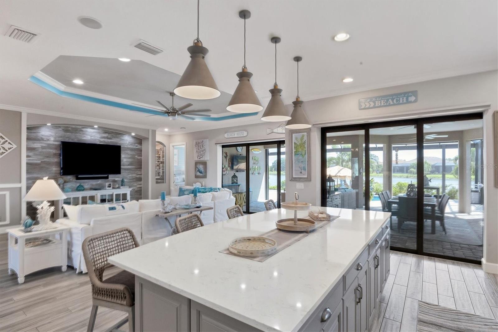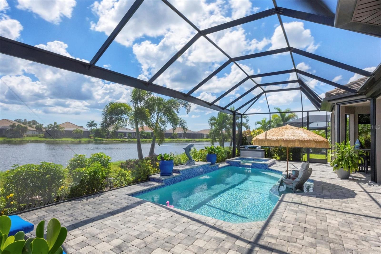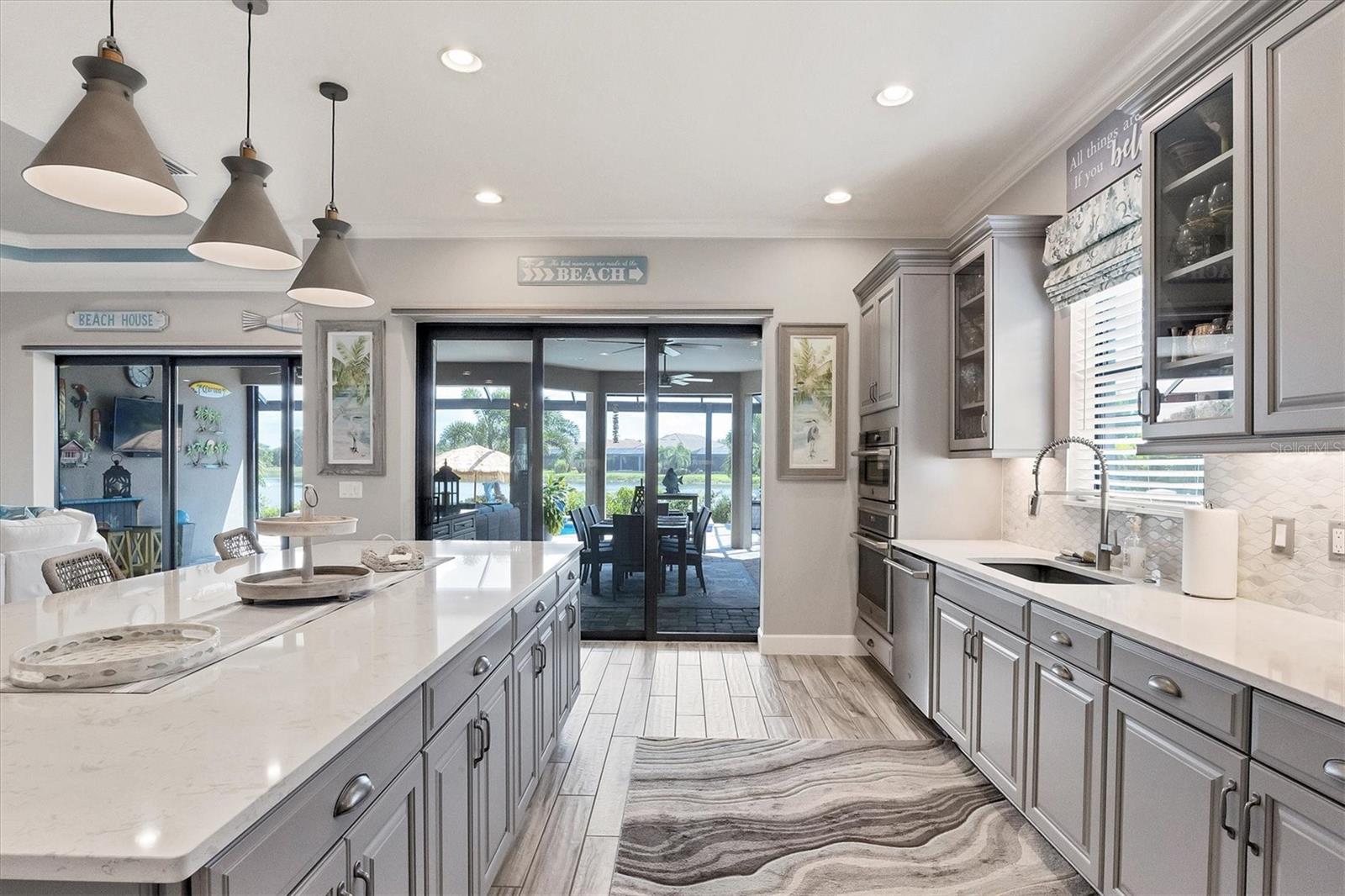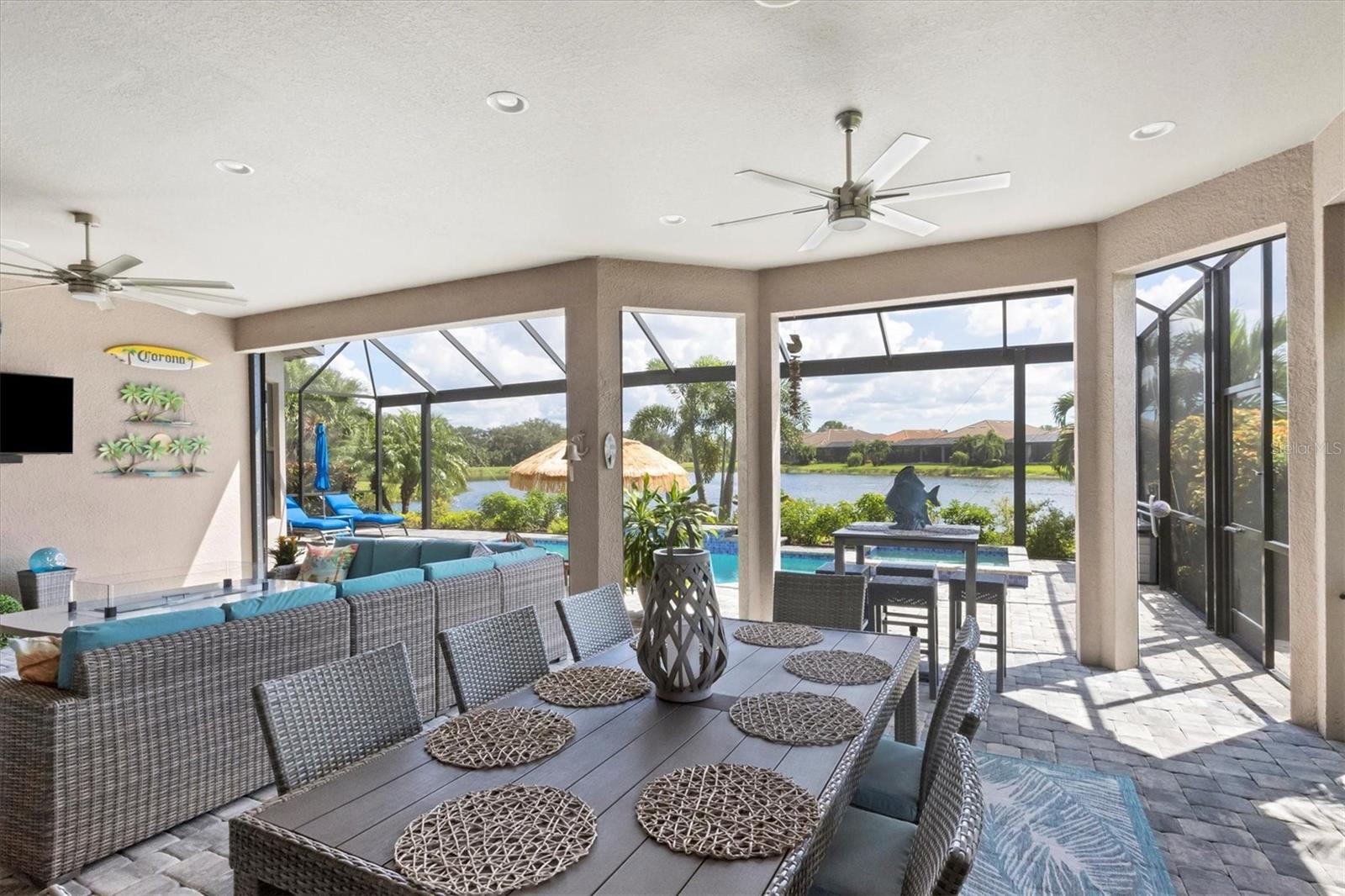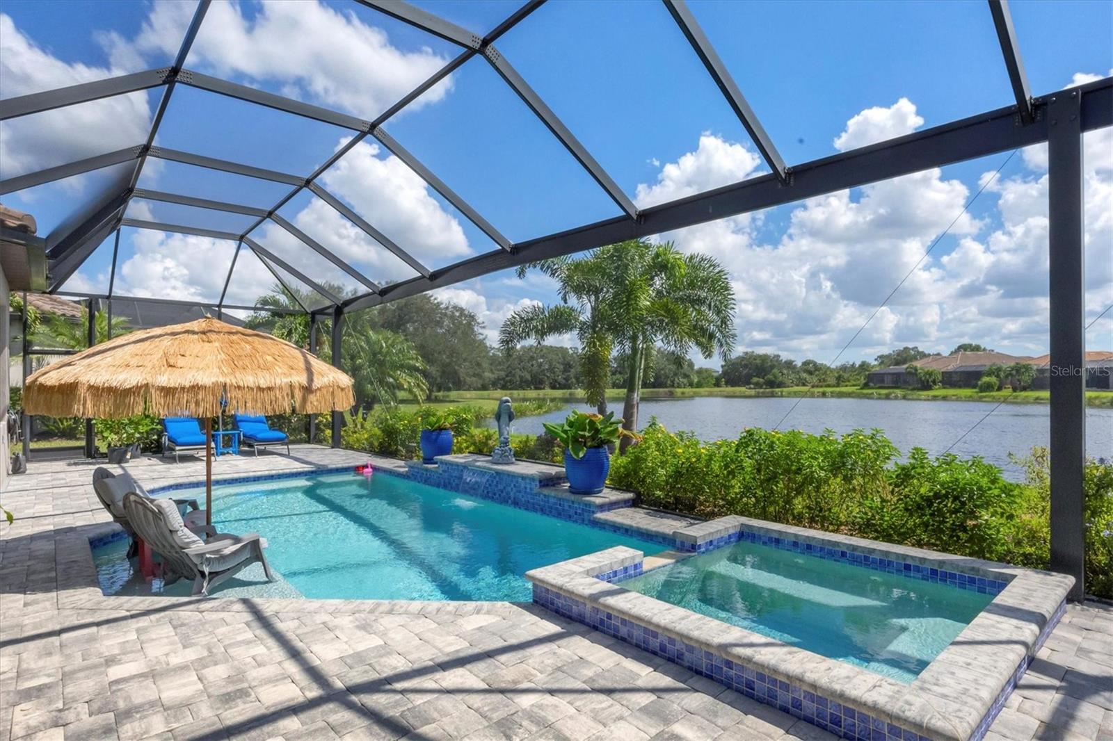 Welcome to your dream home! Nestled in the beautiful gated community of Esplanade on Palmer Ranch, this exquisite residence offers both luxury and comfort. Featuring 3 bedrooms, 3 bathrooms, and a versatile flex room, all with impeccable attention to detail. The open and airy layout showcases stylish, easy-to-maintain flooring throughout, eliminating carpet for a sleek look. The gourmet kitchen is a chef's paradise, with top-of-the-line appliances and a spacious island that includes convenient storage cabinets underneath, as well as premium quartz countertops and a stylish backsplash. Step outside to your private oasis, complete with a stunning saltwater pool and spa overlooking a serene lake, framed by a panoramic picture screen that offers breathtaking views. The outdoor space has been thoughtfully enhanced with an expansive patio, a built-in grill, and a covered lounge area, perfect for alfresco dining and entertaining. Enhanced with over $100K in upgrades. including smart home technology, smart screens hurricane shutters in the lanai, plank tile flooring, crown molding, plantation shutters, and hurricane-impact windows and doors. Esplanade is a resort-style community with top-notch amenities just steps from your door. Enjoy the nearby beach, on-site restaurant, fitness center, tennis and pickleball courts, and a dog park. This reputable community is celebrated for its exceptional lifestyle and resort-like atmosphere, ensuring that every day feels like a vacation. This home isn't just a place to live; it's a lifestyle statement!