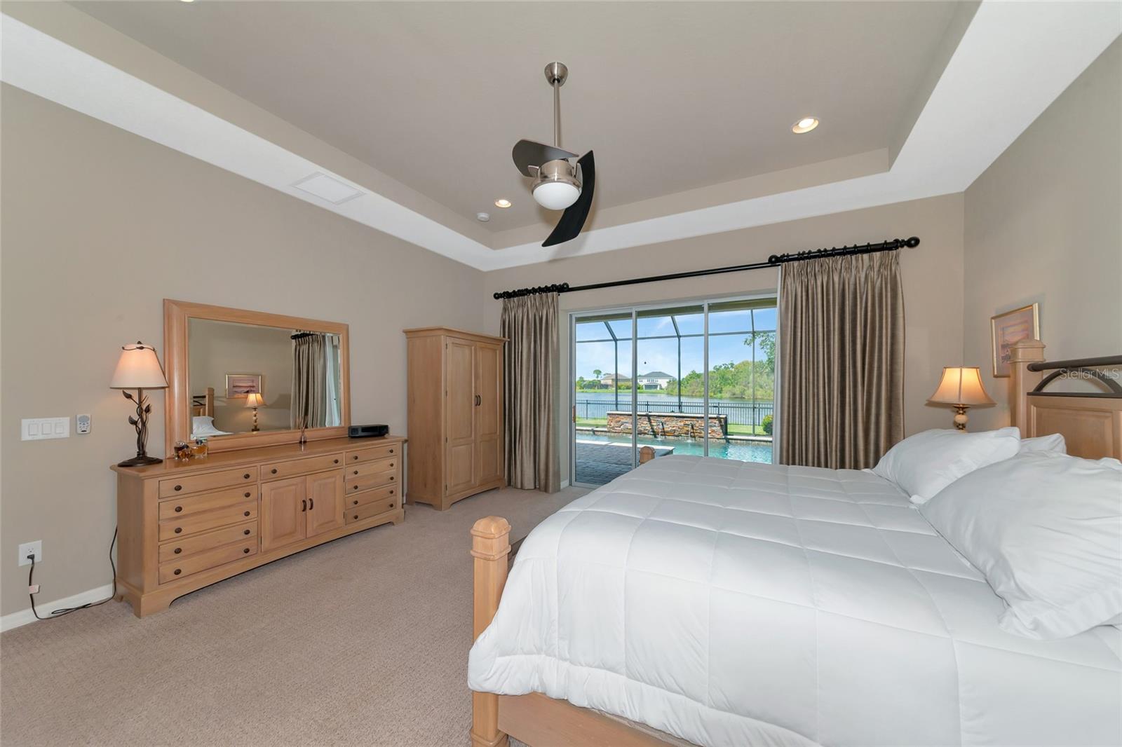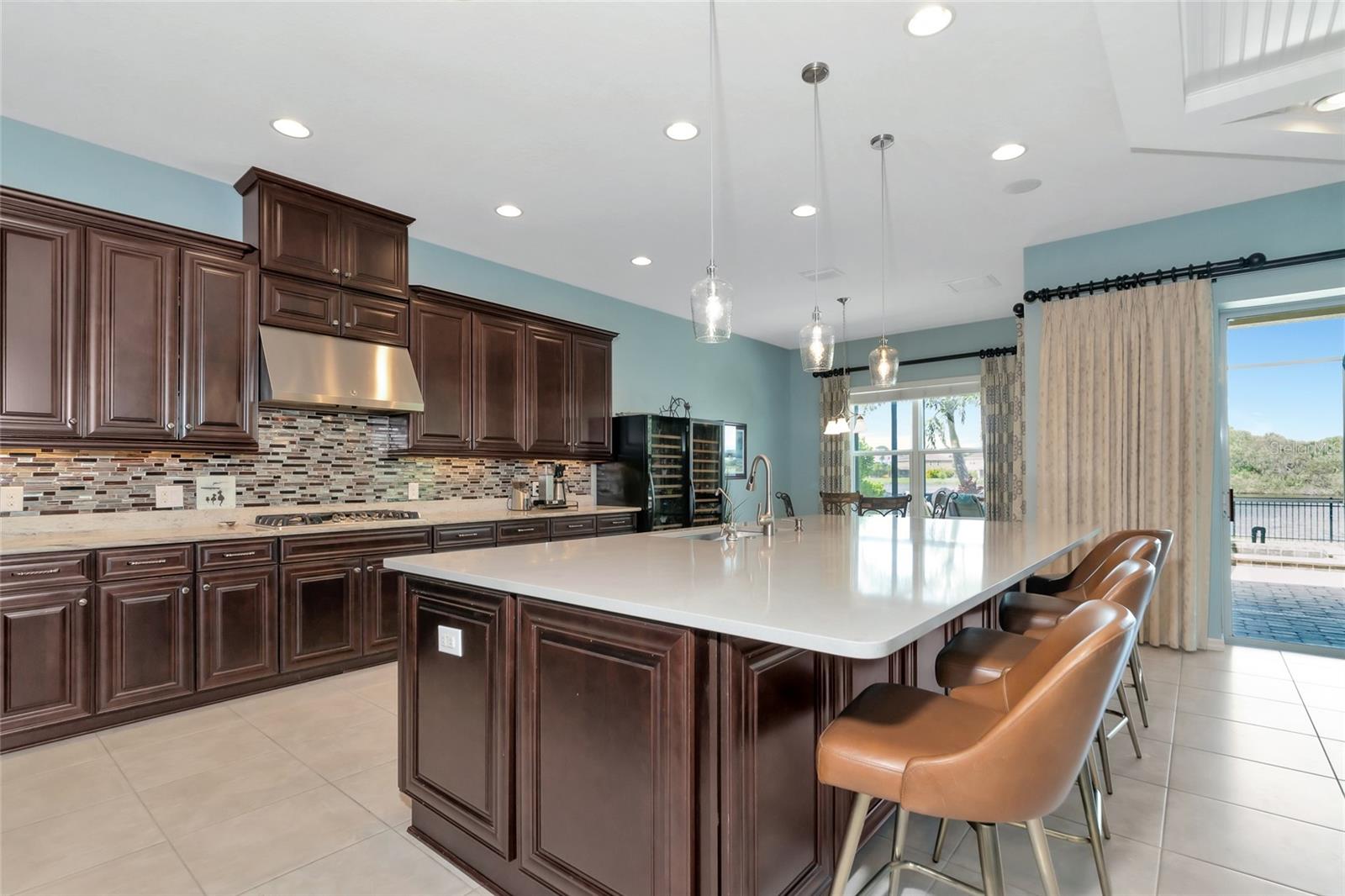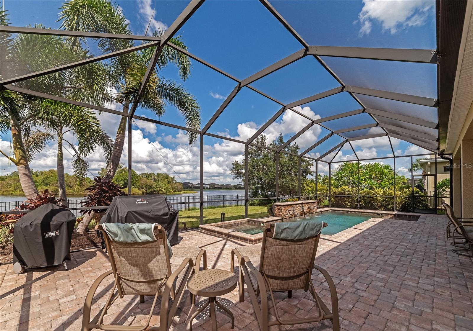Come discover Arbor Lakes at Palmer Ranch, a life-style community. Just minutes to Siesta Key Beach, downtown Sarasota, top rated schools, shopping, restaurants, public parks, Legacy Bike Trail, and easy access to I-75. One owner home of 4087 sqft, meticulously maintained, designer features and finishes throughout. Your tranquil homesite has panoramic lake views both front and back. Private blue water heated pool, jetted spa, cascading waterfall, large lanai, and fenced yard. First floor primary suite w/ front den and separate dining room. A gourmet show kitchen and great room design w/ a butler’s, walk-in pantry, and half-bath. Designer floor tile in all active living areas of the first floor. Second floor bedrooms 2, 3, and 4 w/ ample closet space; grand loft measuring 21’ x 19’ served by wet bar w/ sub-Zero beverage refrigerator; and a media room of 17’ x 15’. A coffered high ceiling great room that measures 19’ x 20’ overlooks large lanai and heated pool w/ waterfall, spa, and a grand lake view. Open show kitchen w/ large island of 3cm quartz measuring 125” x 69” and large deep stainless-steel island sink and reverse osmosis filter system. Stainless steel premium GE Cafe series appliances and 2024 LG refrigerator, two wall convention ovens, separate convection microwave, five burner 36” natural gas cooktop w/ professional hood vent to the outside. Wood kitchen raised panel cabinets, 42” upper cabinets, topped w/crown molding, under cabinet lighting w/ light valance, soft close design cabinets, granite 3cm countertops, mosaic glass and stone backsplash. Kitchen café measures 12’ x 11.5’ overlooking lanai pool and lake view. Primary suite 20’ x 17’ w/ stepped ceiling, spa-like bath, twin sinks, amble cabinets and drawers, walk-in shower, and deep walk-in closet. Hurricane shutters, front first floor windows are impact glass and impact designed front door. Three-car garage, natural gas hot water, two a/c units zoned first and second floors. Reclaimed irrigation water for homesite that is professionally landscaped.