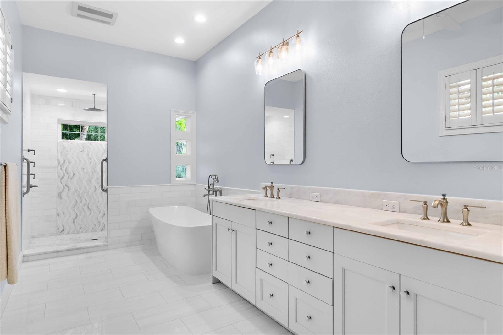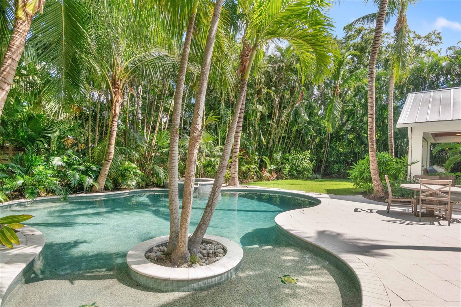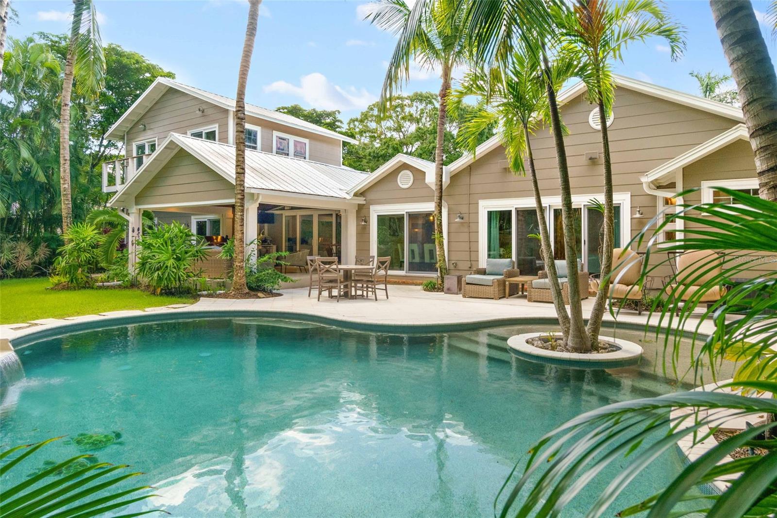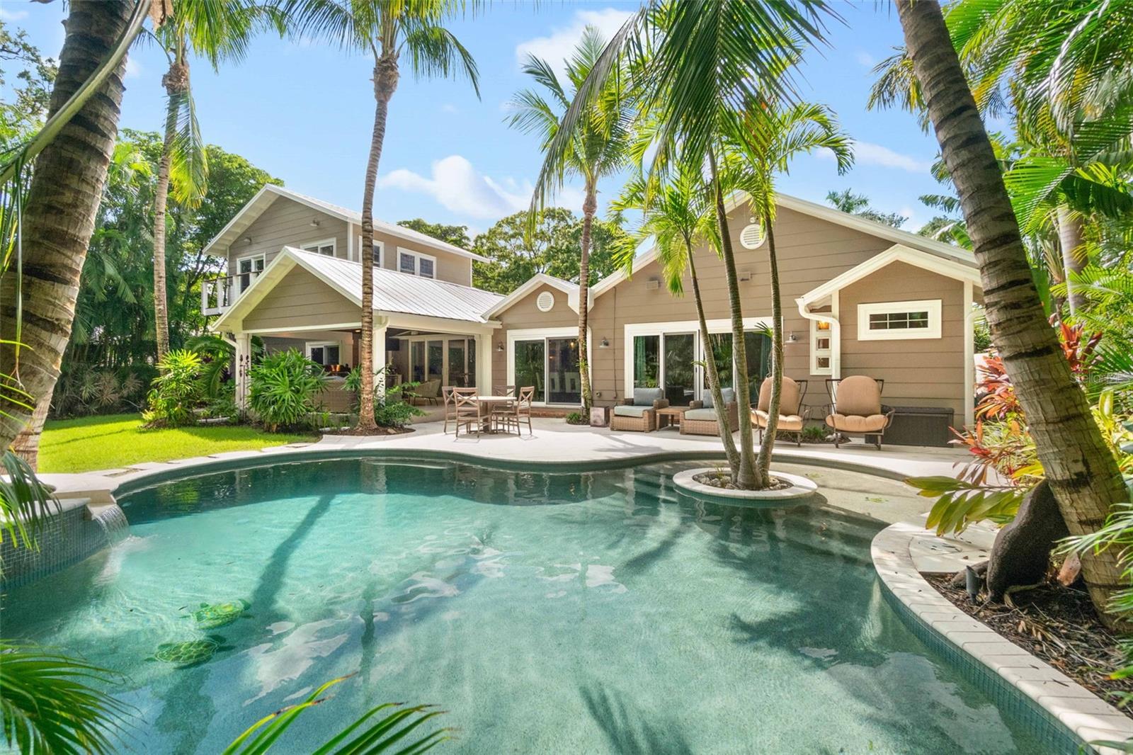 This beautifully remodeled classic home is tucked away in one of Sarasota’s most coveted neighborhoods, offering a perfect blend of elegance and warmth. Picture yourself just steps from the charming Southside Village, Morton’s Market, the top-rated Southside School, and minutes from downtown Sarasota’s vibrant arts scene and world-renowned beaches. As you approach under a canopy of trees, sunlight dances through, casting a soft glow on the lush tropical landscape that frames this stunning residence. Boasting 5 bedrooms and 5 ½ baths across two spacious levels, this home offers a generous 4,956 square feet of living space. Beyond the five bedrooms, you'll find a bonus room, an office, and a flexible space that can serve as a gym or an additional bedroom. The welcoming front porch invites you to sit and stay awhile, while the soothing coastal palette and natural light greet you as you step inside, offering serene views that extend out to the backyard oasis and custom pool. The timeless charm of Old Florida is woven throughout this home, from the pecky cypress ceilings and crown molding to the plantation shutters and built-in features. Wood and tile floors complement the gourmet kitchen, which flows seamlessly into the great room, creating a bright and airy space perfect for gatherings. The chef’s kitchen, designed for culinary delight, includes an expansive breakfast bar, chic tile backsplash, granite countertops, stainless steel appliances, a gas range, a large walk-in pantry, and a wine cooler. For more formal occasions, the large dining room, with its gorgeous wood-planked ceiling, serves as a perfect bridge between the front living room and the impressive great room, where sliding doors open to extend the living space outdoors. Upstairs, the flexible bonus room features a wet bar, mini refrigerator, and a balcony overlooking the lush backyard, perfect for entertaining or relaxing. The guest suite, complete with an en-suite bath, offers privacy and comfort. The spacious owner’s retreat is a sanctuary of its own, with a spa-like en-suite bathroom, floor-to-ceiling windows, and direct access to the pool. The open floorplan also includes a mother-in-law suite with a morning kitchen, as well as a junior suite with two additional bedrooms and a shared bath. A built-in desk and cabinetry make the home office both functional and stylish. Outside, the covered living area, complete with an outdoor kitchen, invites relaxation. The saltwater pool and heated spa are surrounded by lush tropical landscaping and privacy fencing, offering a peaceful retreat where you can fully embrace Sarasota’s year-round sunshine. Additional features include a gas fireplace, tankless water heater, a new outdoor grill, a newer pool pump, and a two-car garage. Come experience the best of Sarasota living in this exquisite home, where timeless beauty and modern amenities meet in perfect harmony.